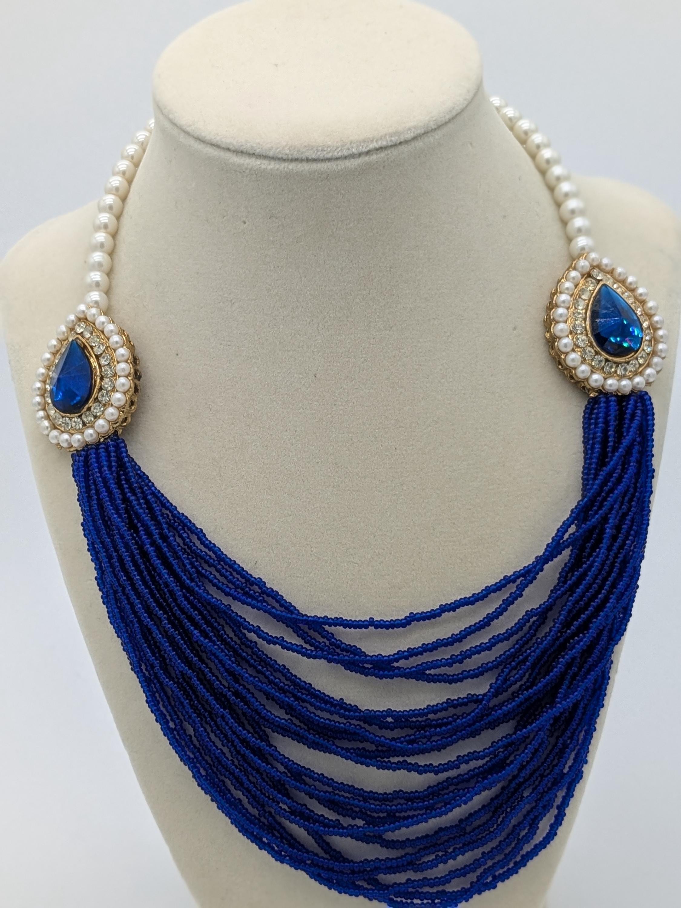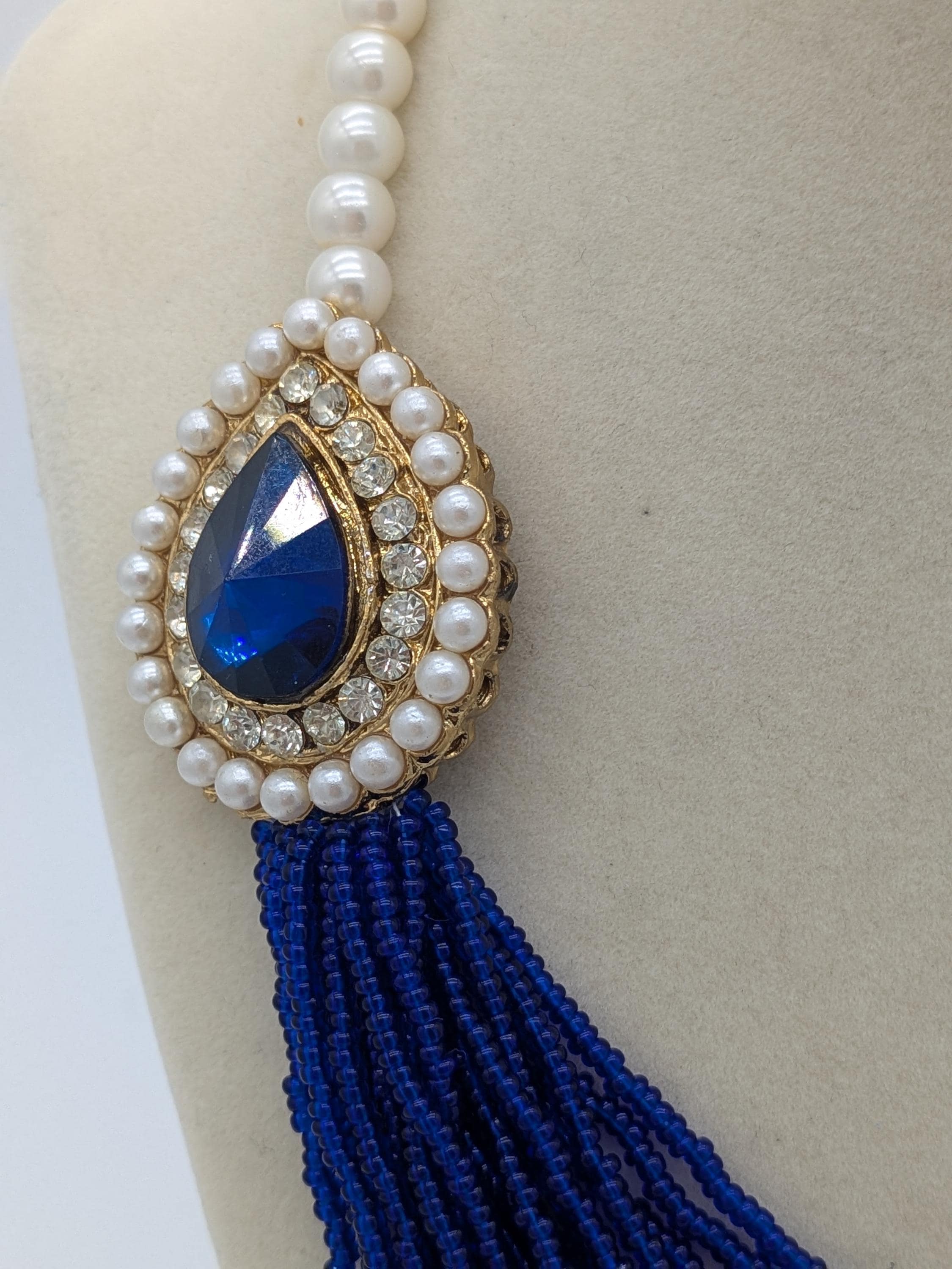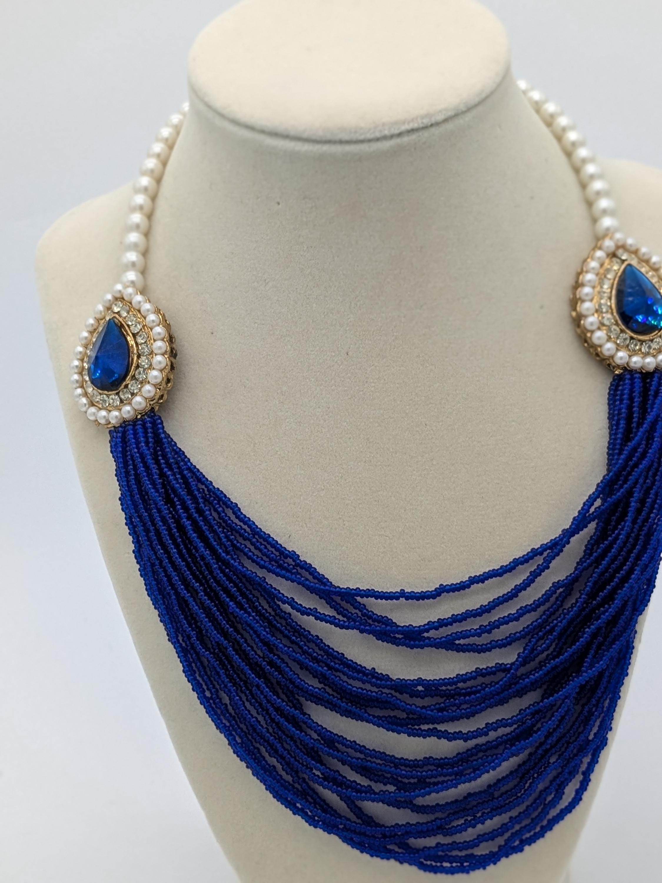 This elegant statement necklace combines classic white pearls with cascading royal blue seed beads for a bold and luxurious look. The teardrop accent centerpiece adds a regal touch, making it perfect for special occasions, weddings, or elevating everyday style with vibrant color and sophistication.