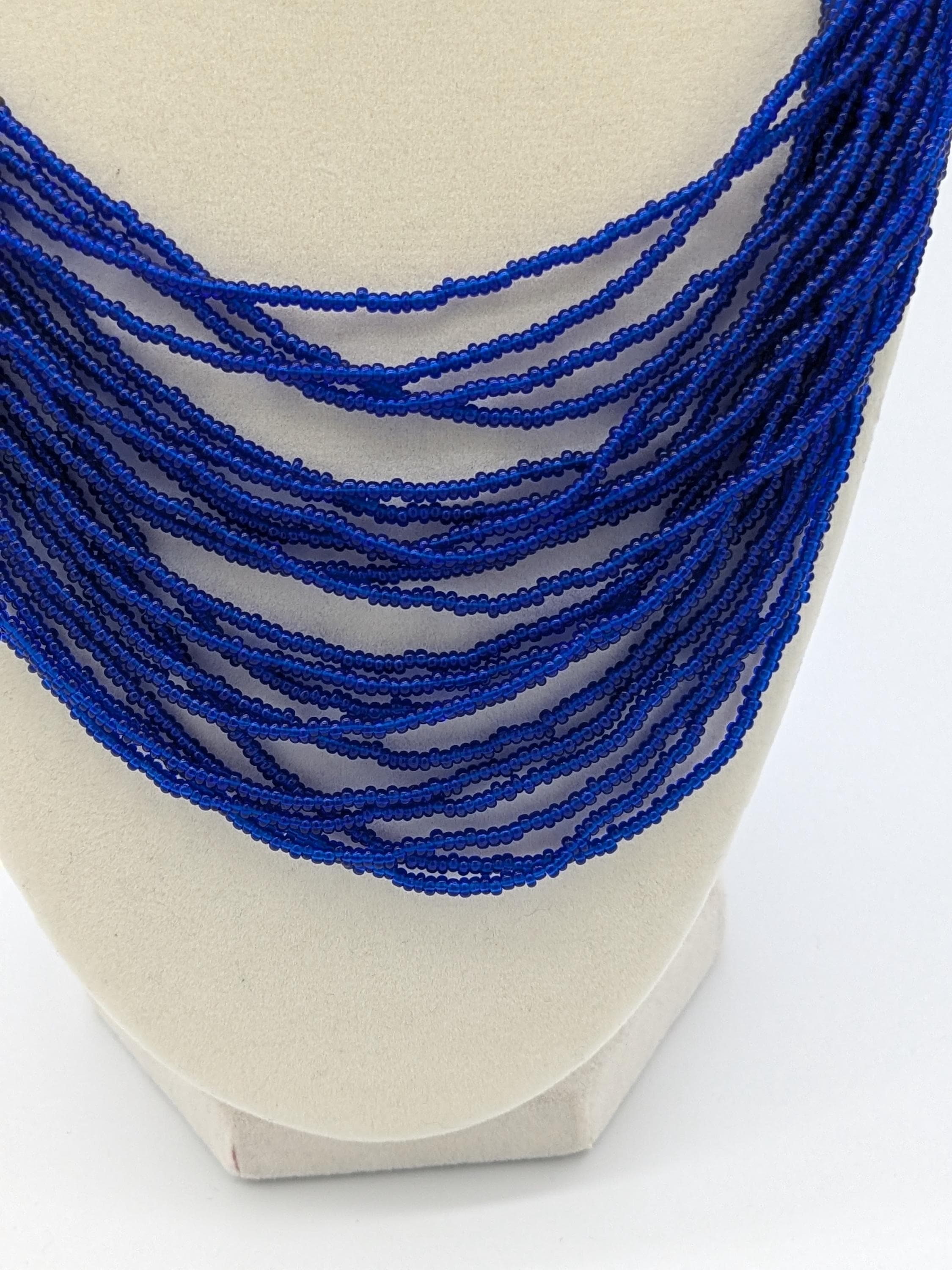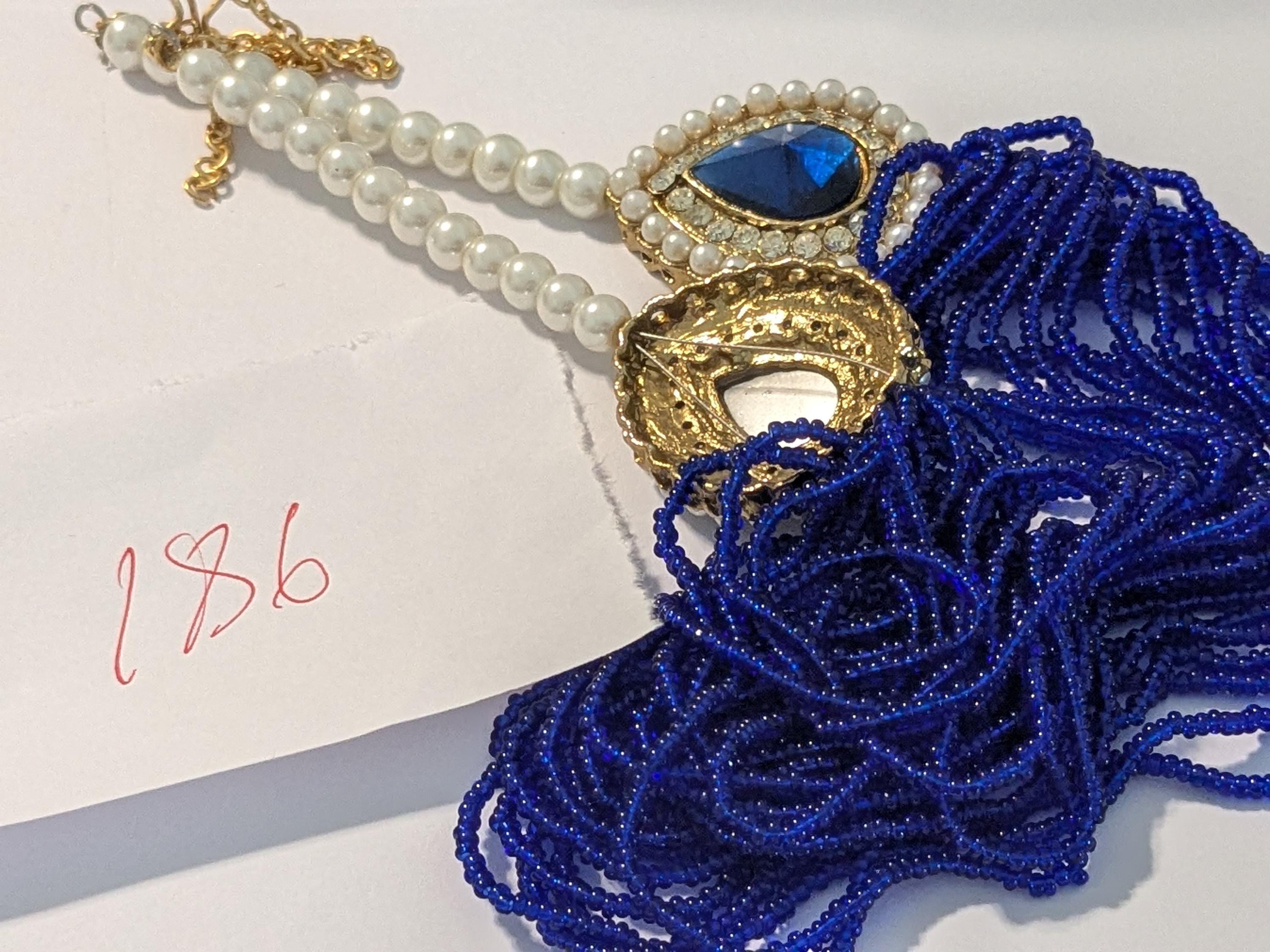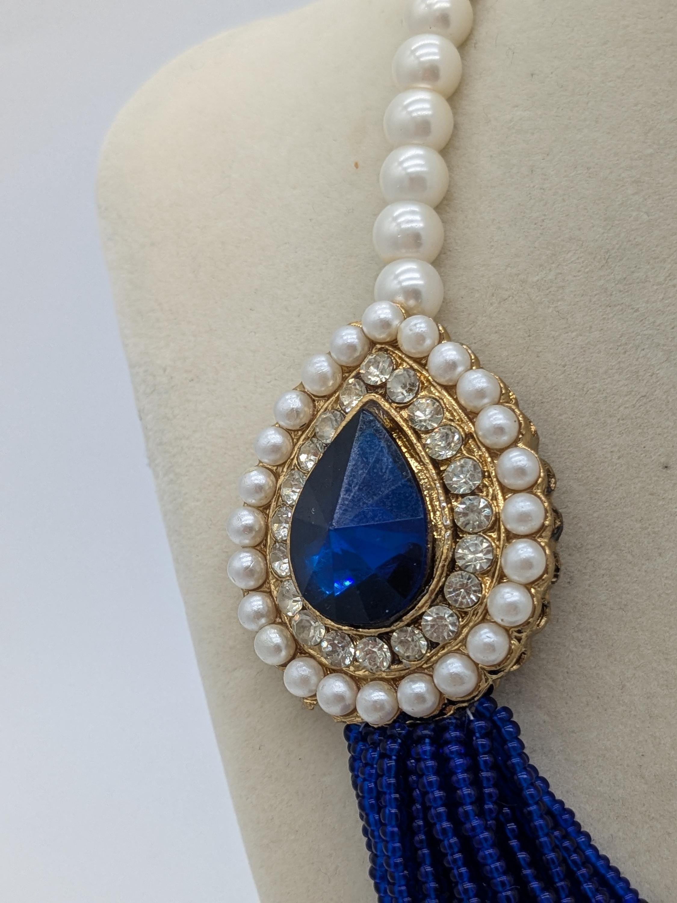 This elegant statement necklace combines classic white pearls with cascading royal blue seed beads for a bold and luxurious look. The teardrop accent centerpiece adds a regal touch, making it perfect for special occasions, weddings, or elevating everyday style with vibrant color and sophistication.