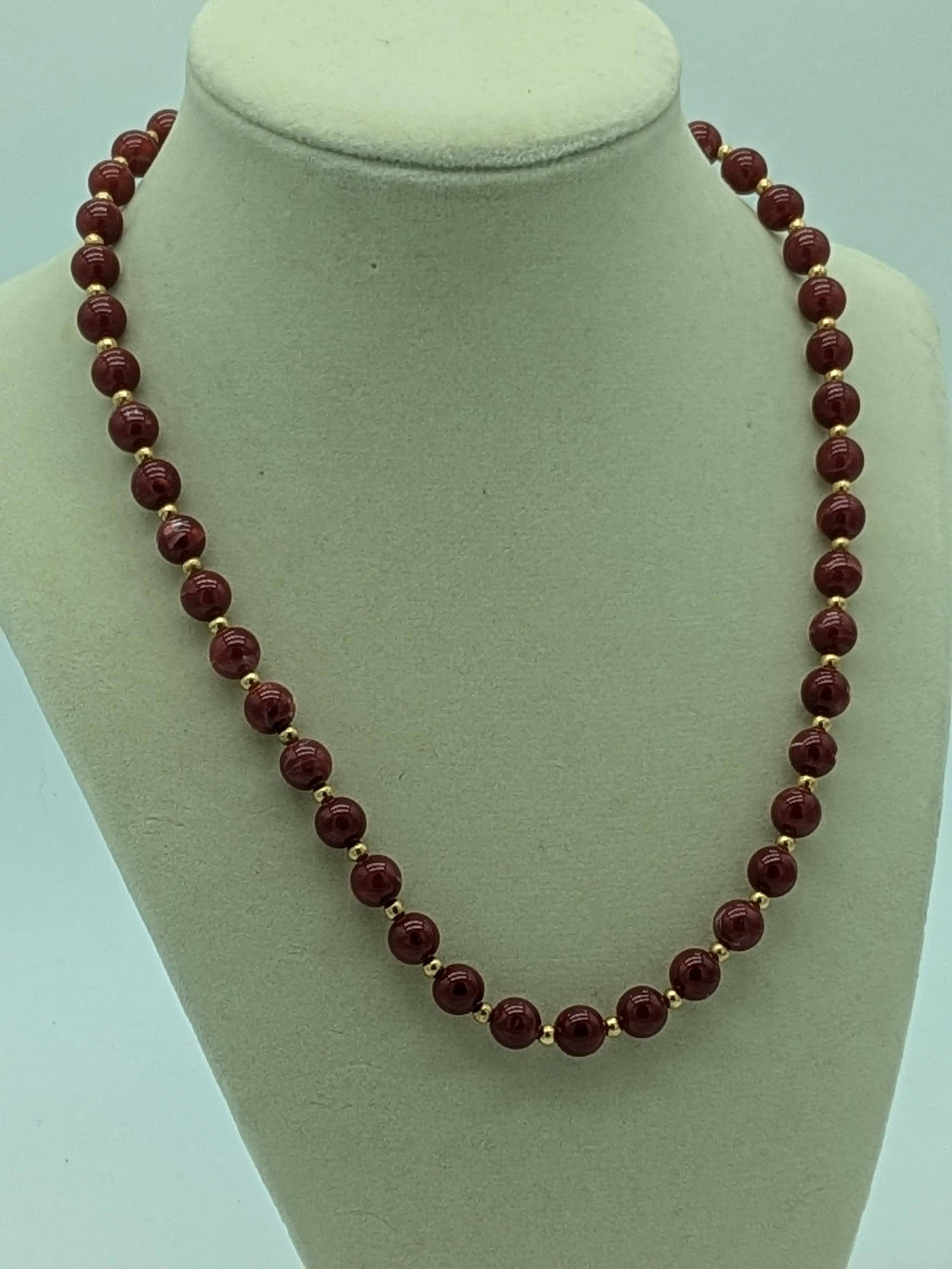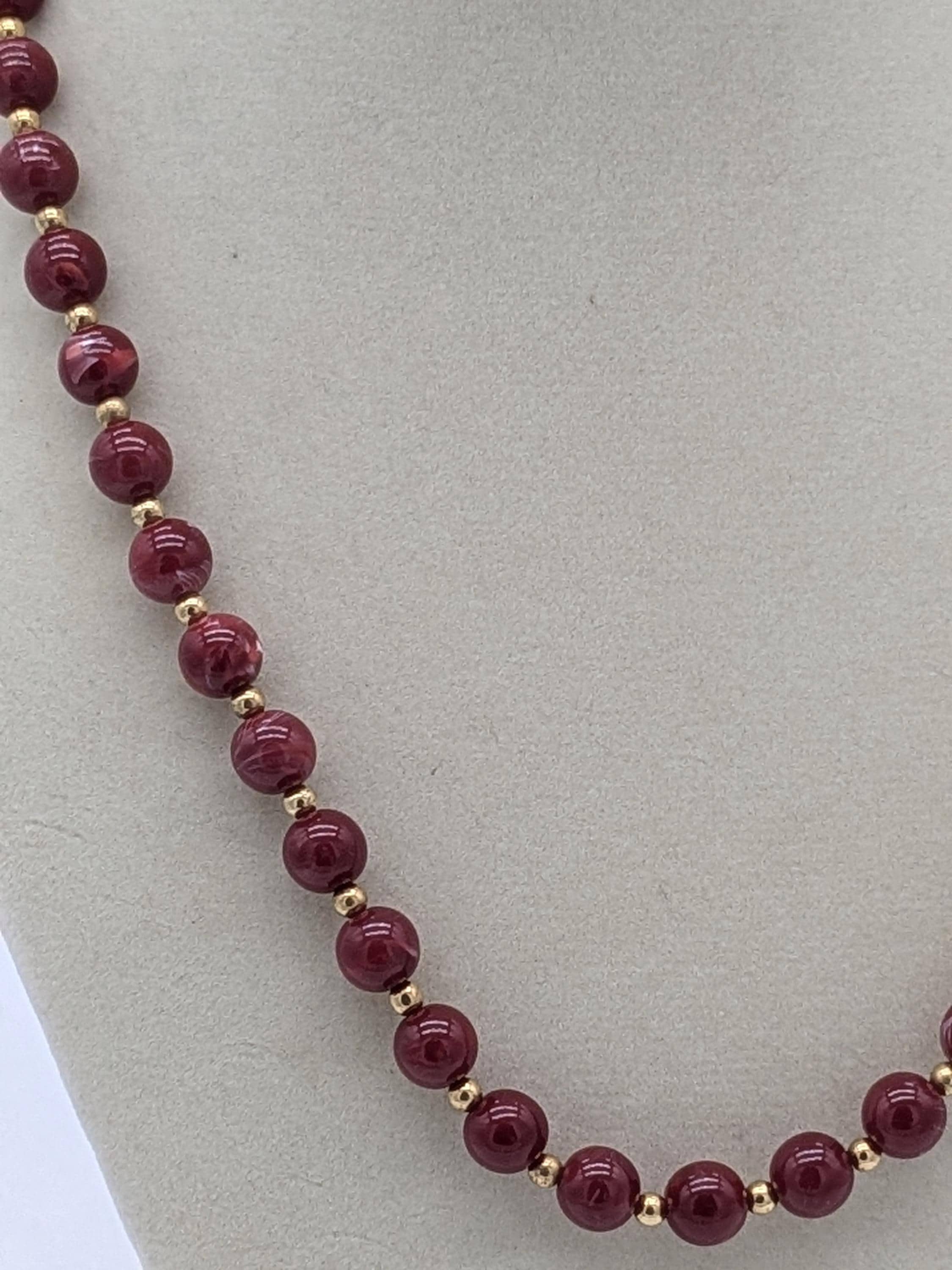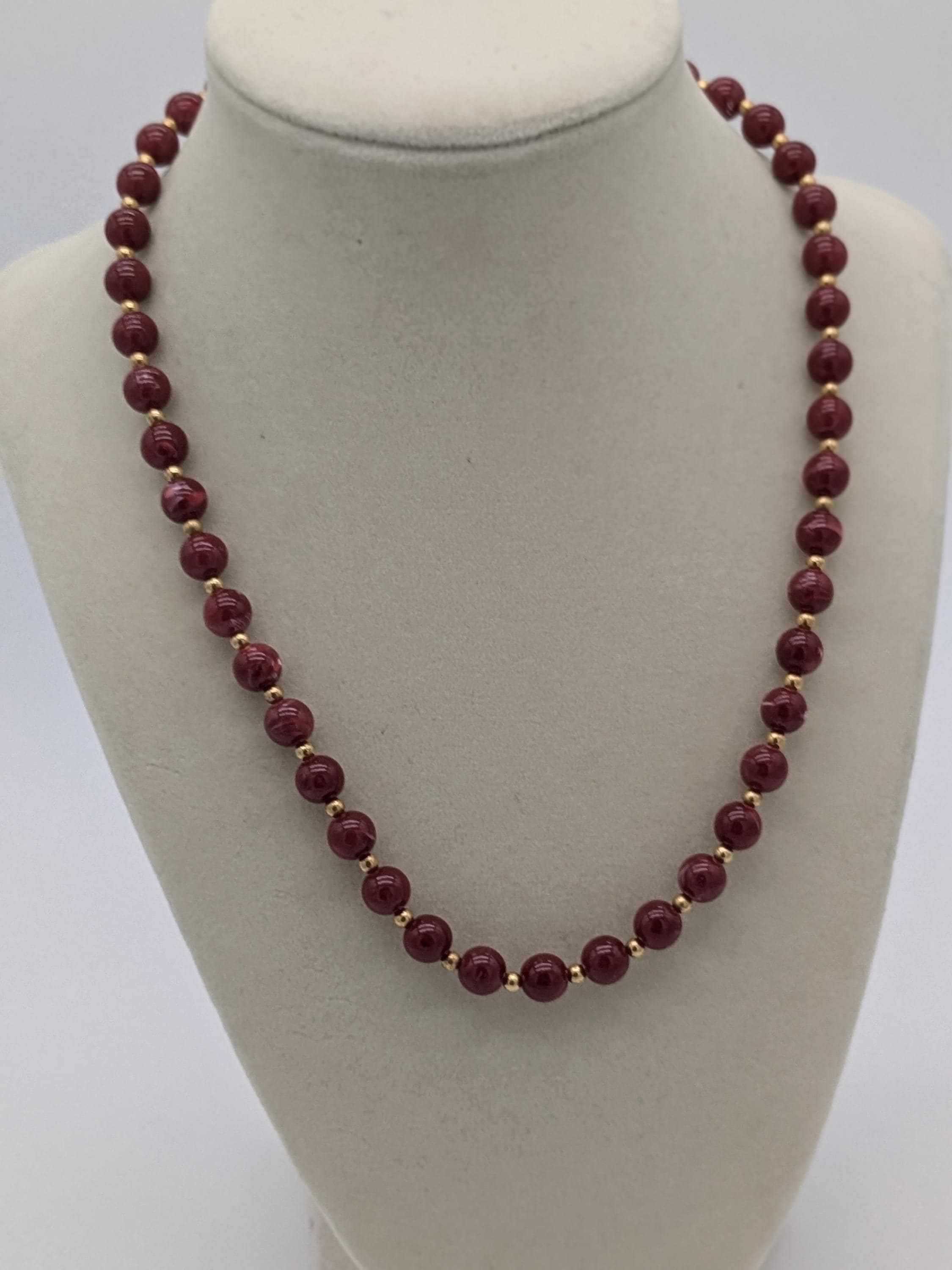 This timeless maroon bead necklace features smooth, glossy round beads accented with tiny metallic spacers for a refined touch. Simple yet sophisticated, it’s perfect for everyday elegance, office wear, or layering with other favorites. Lightweight and comfortable for all-day style.