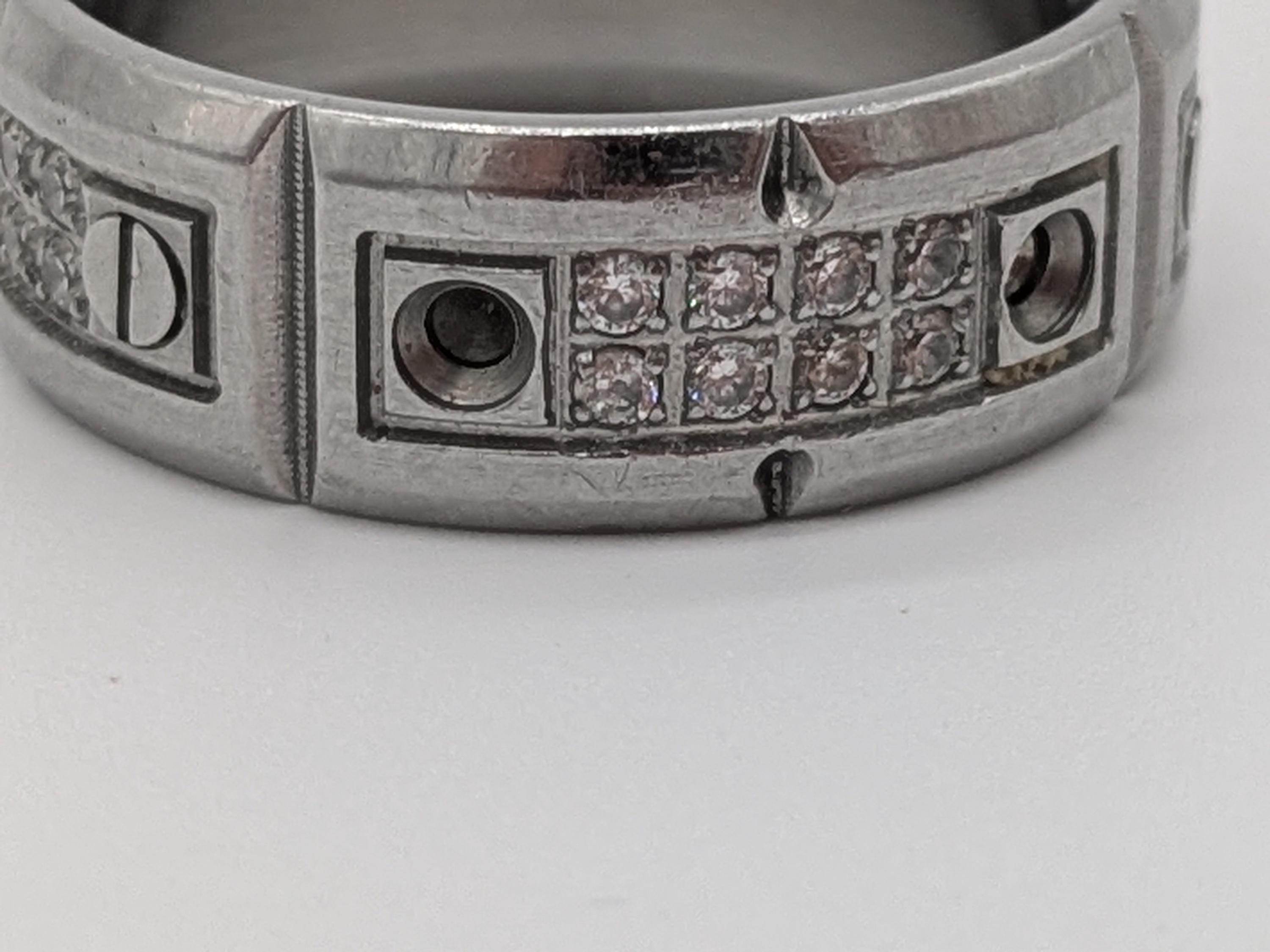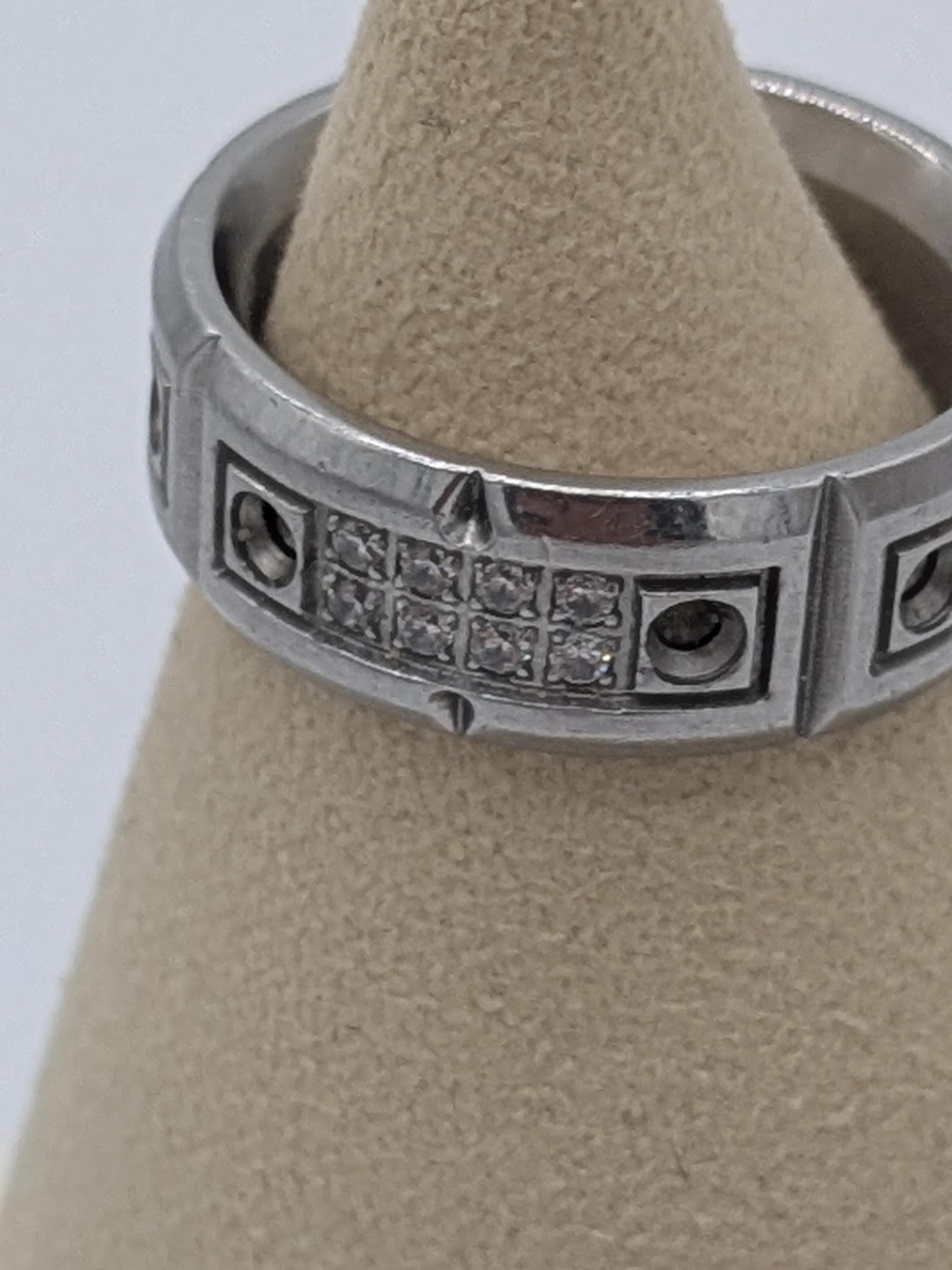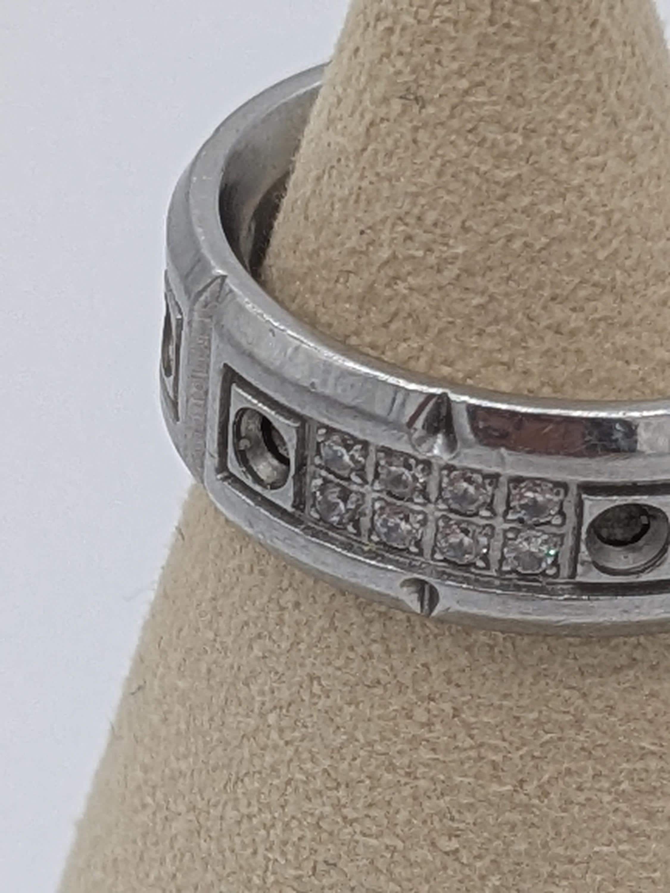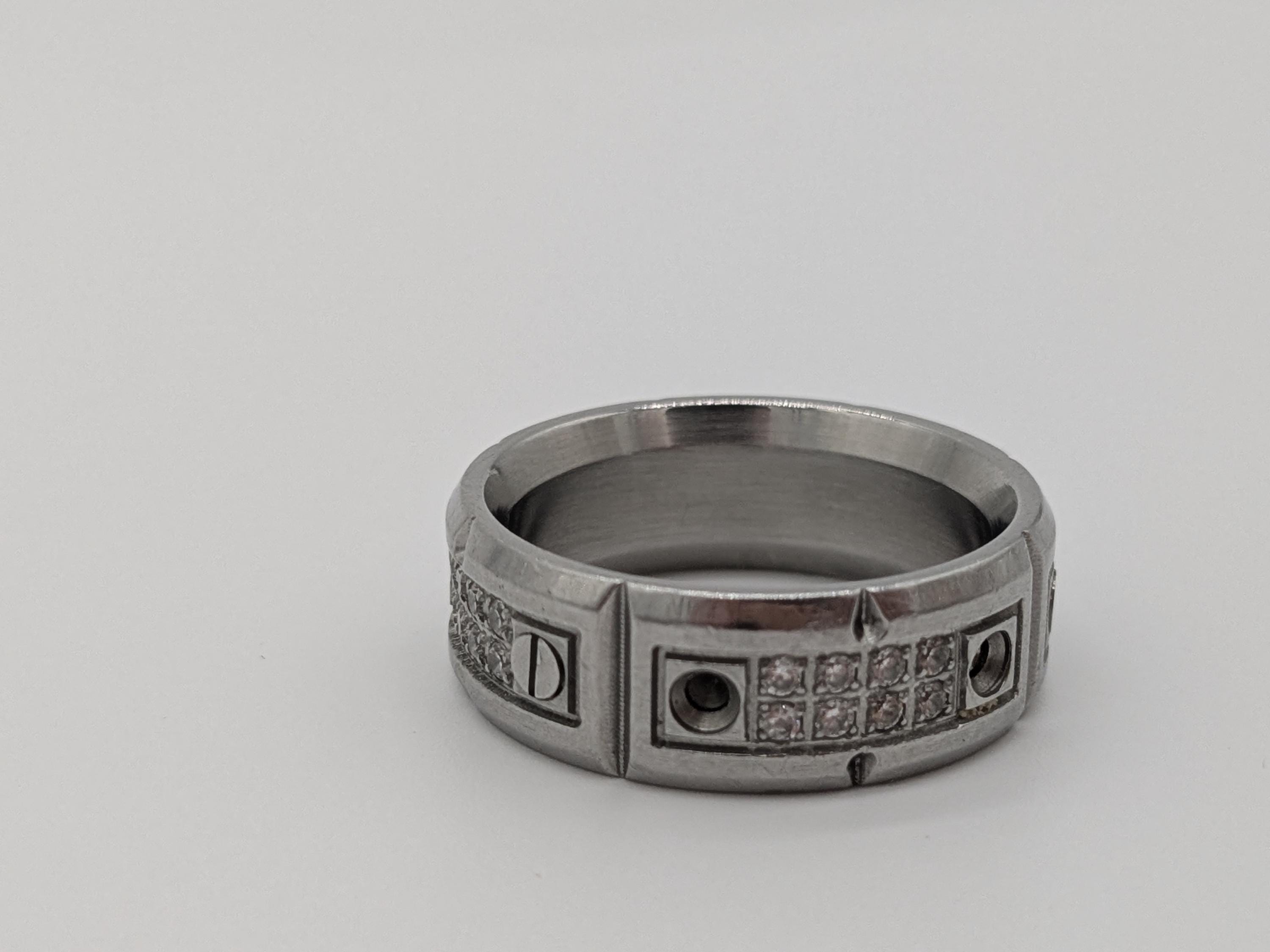 This bold industrial-style band ring features a brushed steel finish with intricate geometric textures and rivet-inspired details. Its durable and modern design makes it perfect for everyday wear, offering a strong and stylish statement piece for both men and women.