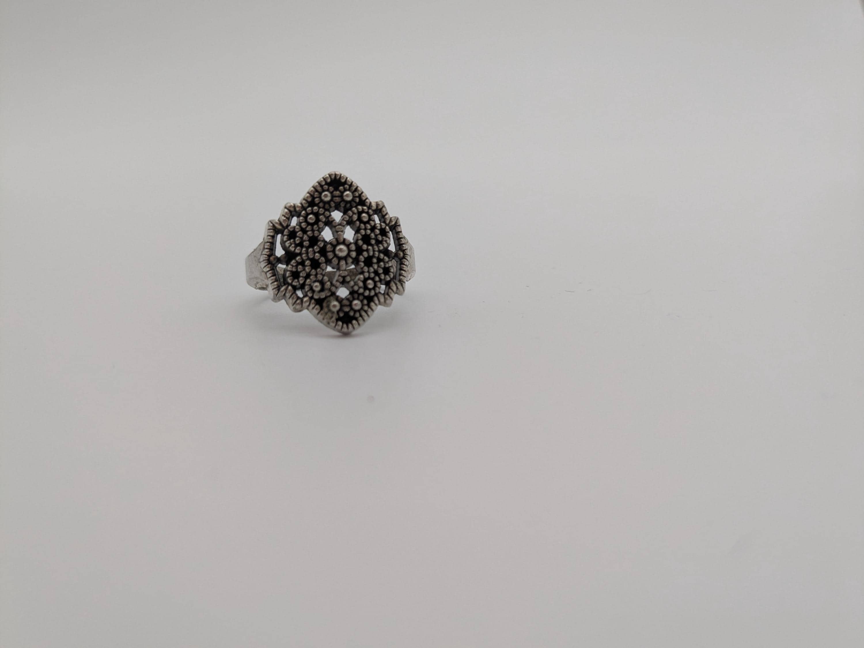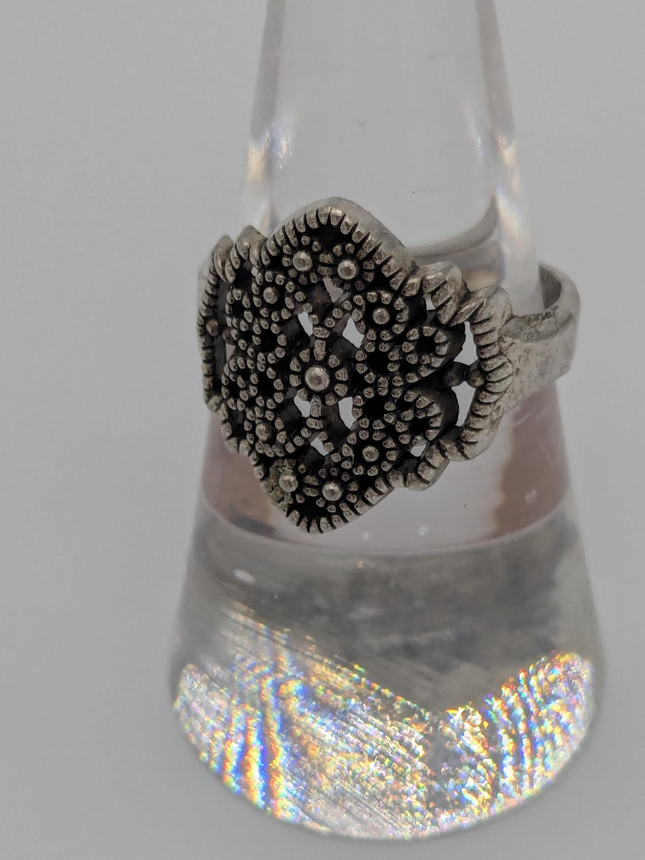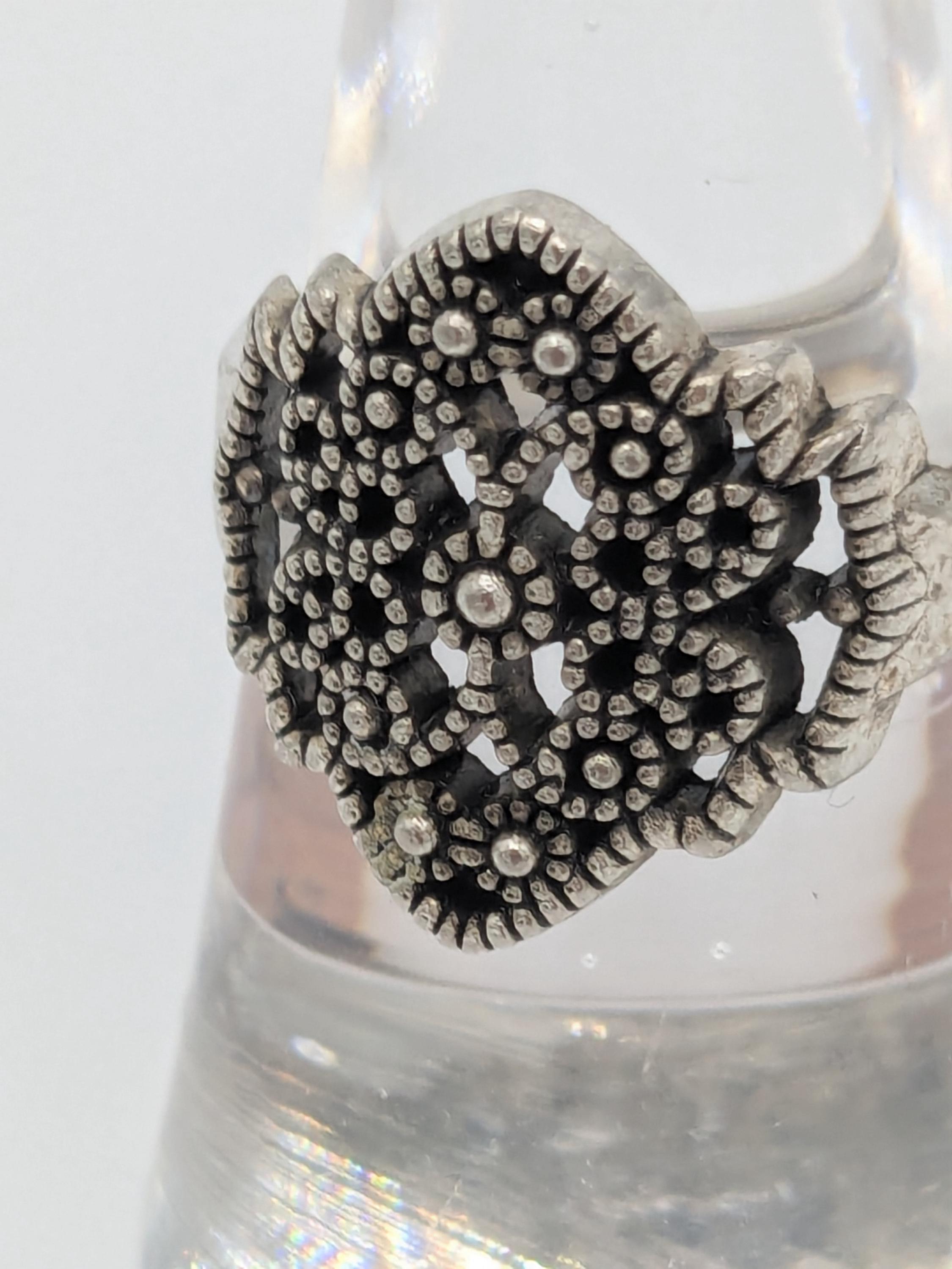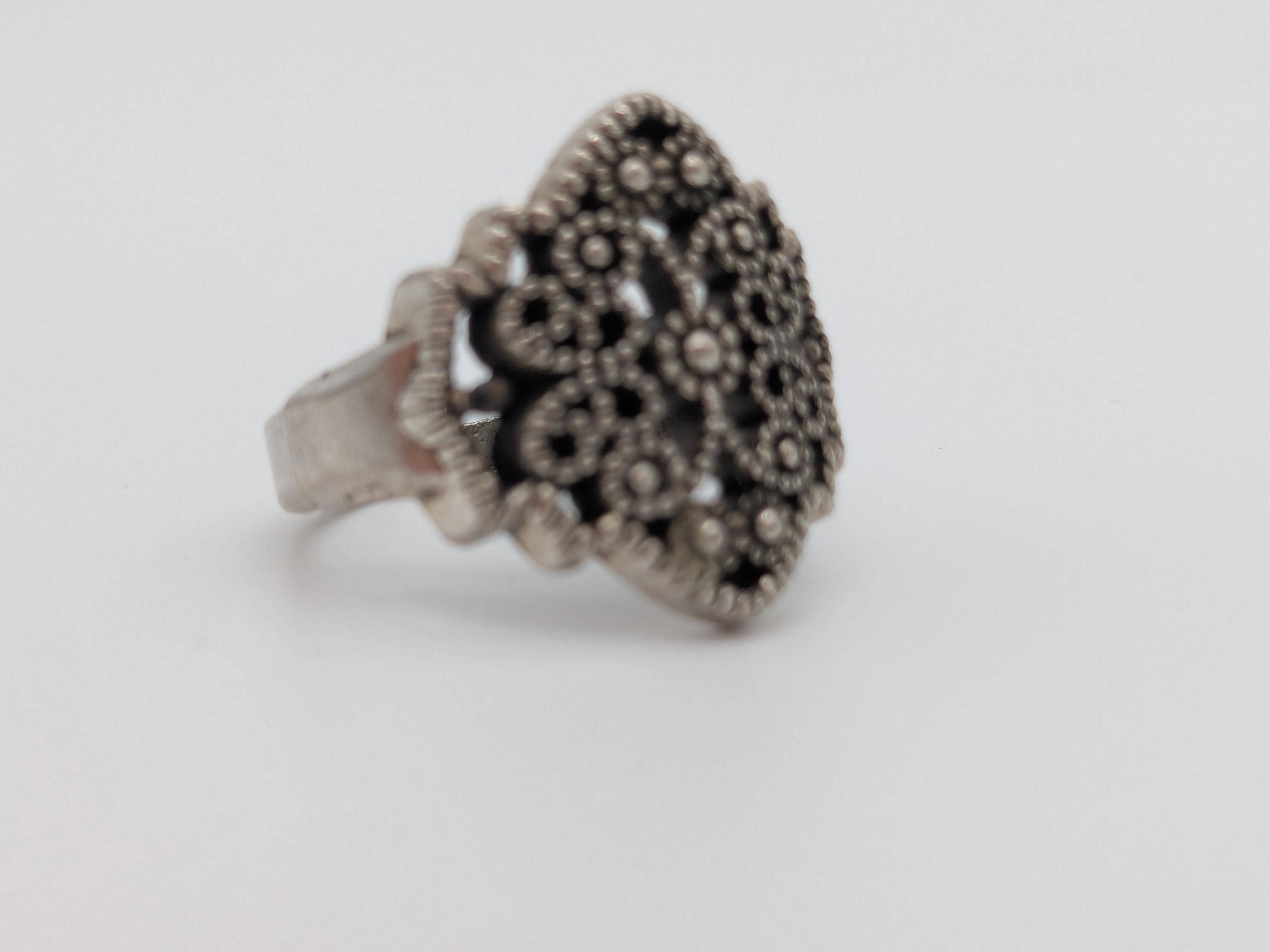 This elegant filigree ring features intricate floral detailing with a vintage-inspired blackened finish. Lightweight and adjustable, it’s perfect for adding timeless charm to both casual and dressy looks. A beautiful choice for boho, gothic, or classic jewelry lovers.