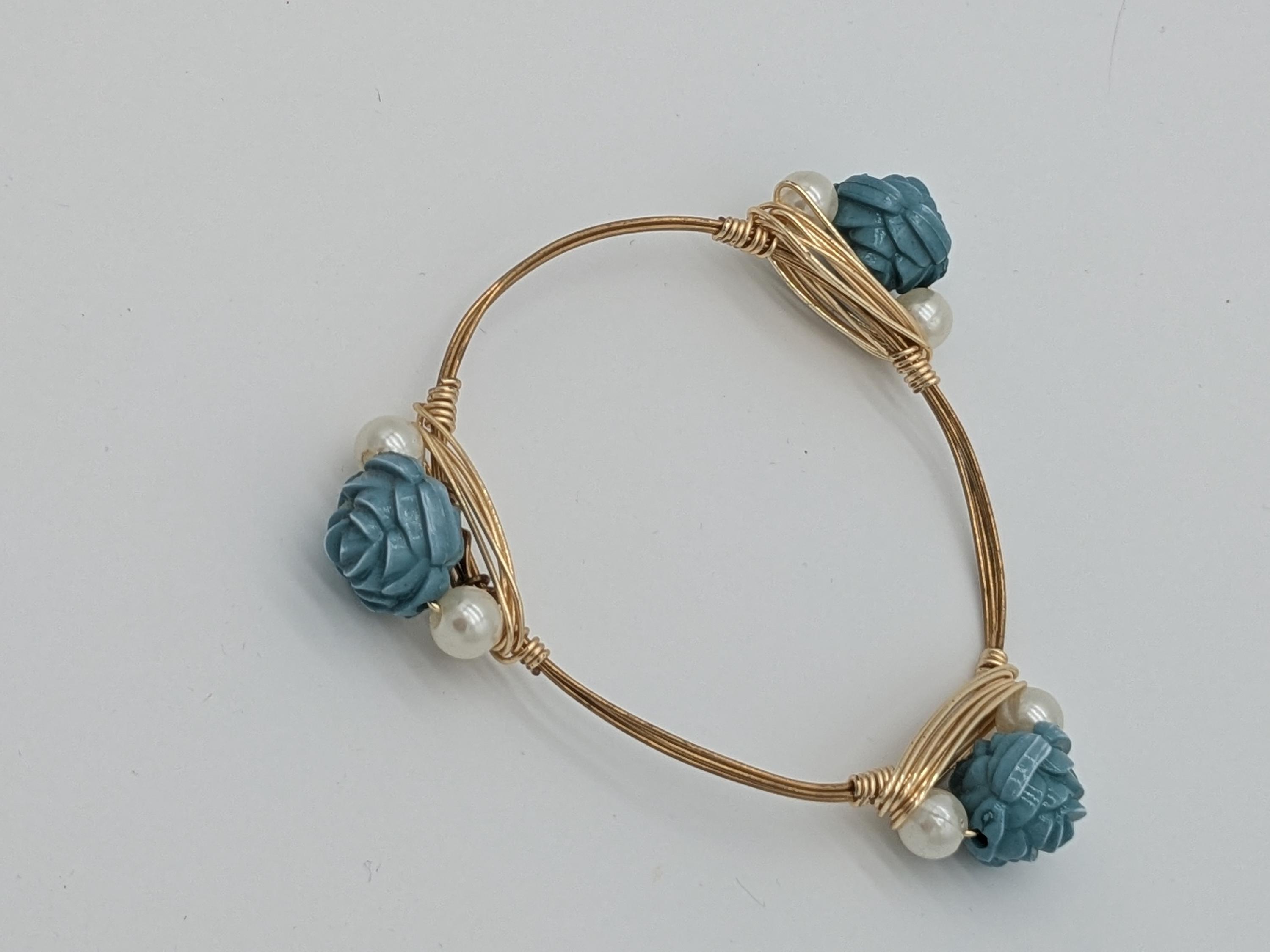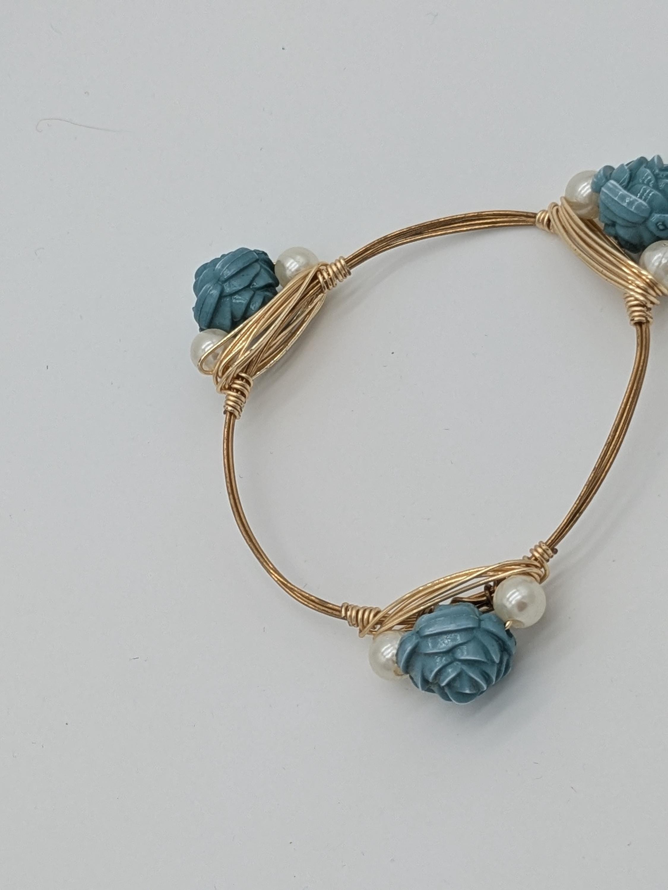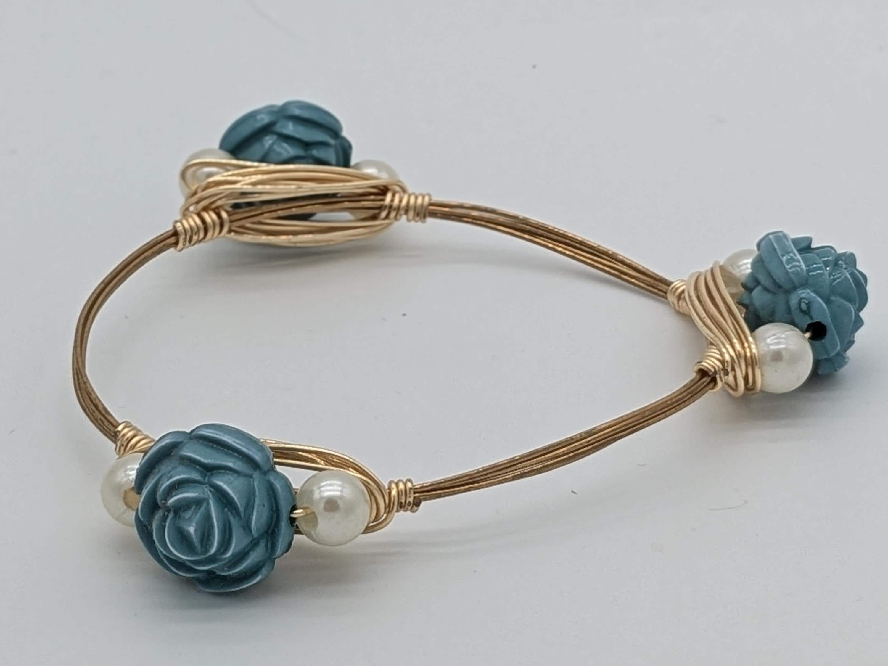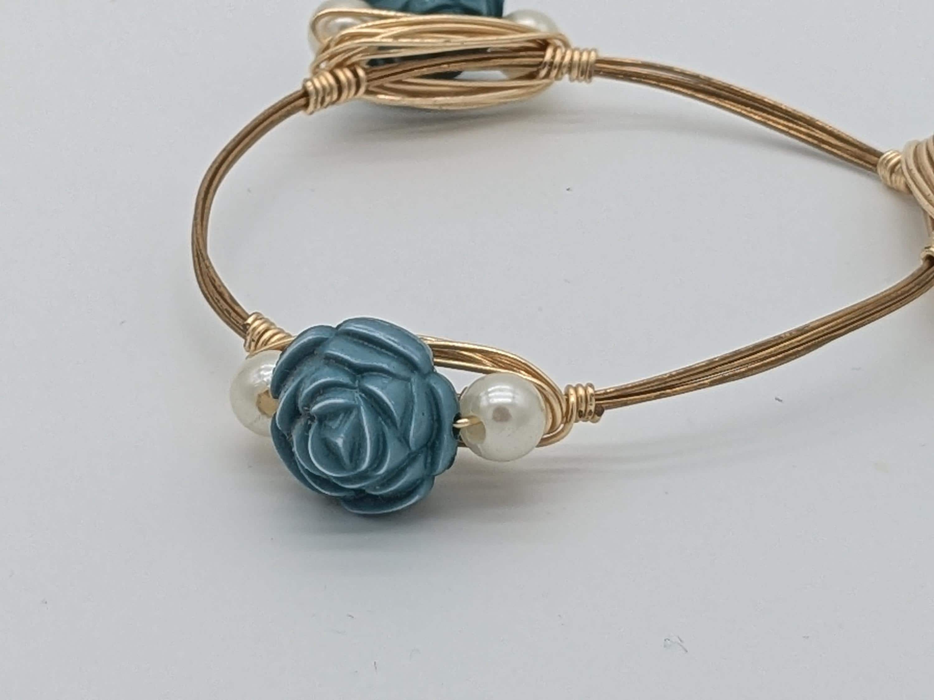 This delicate handmade bracelet features a blue rose centerpiece paired with soft white faux pearls, beautifully wire wrapped for an elegant, romantic touch. Lightweight and unique, it’s the perfect boho-inspired accessory for everyday wear or gifting.