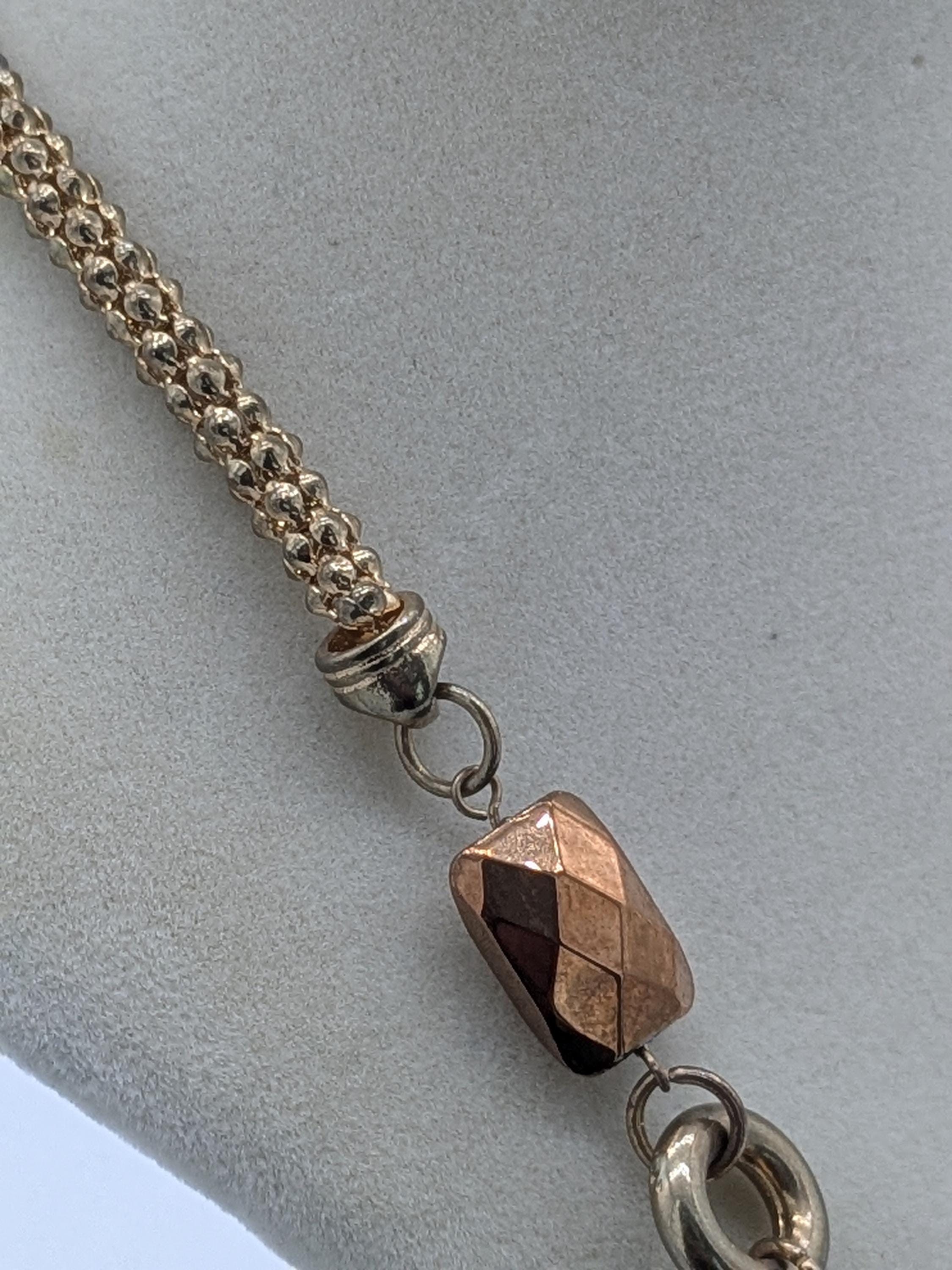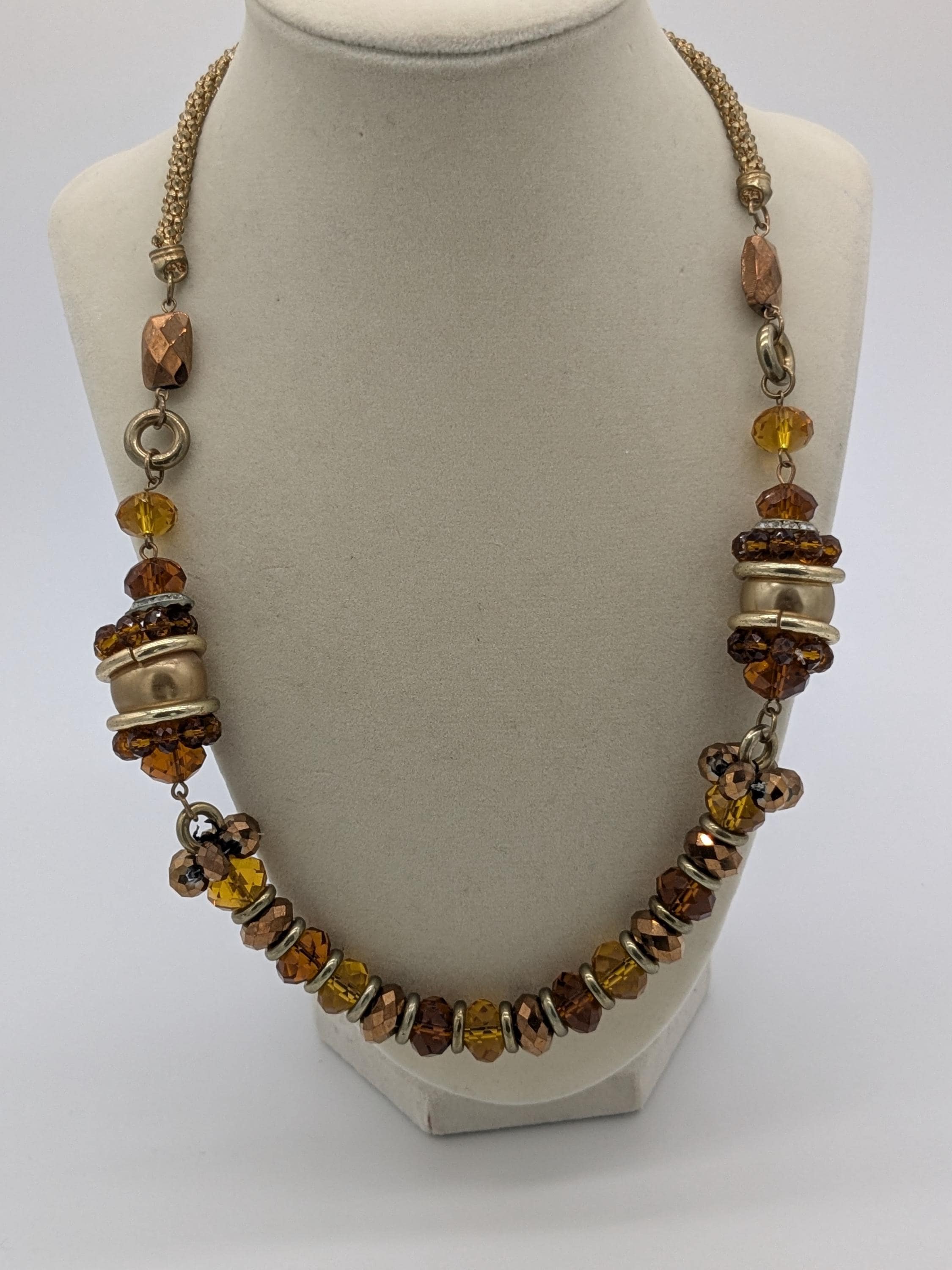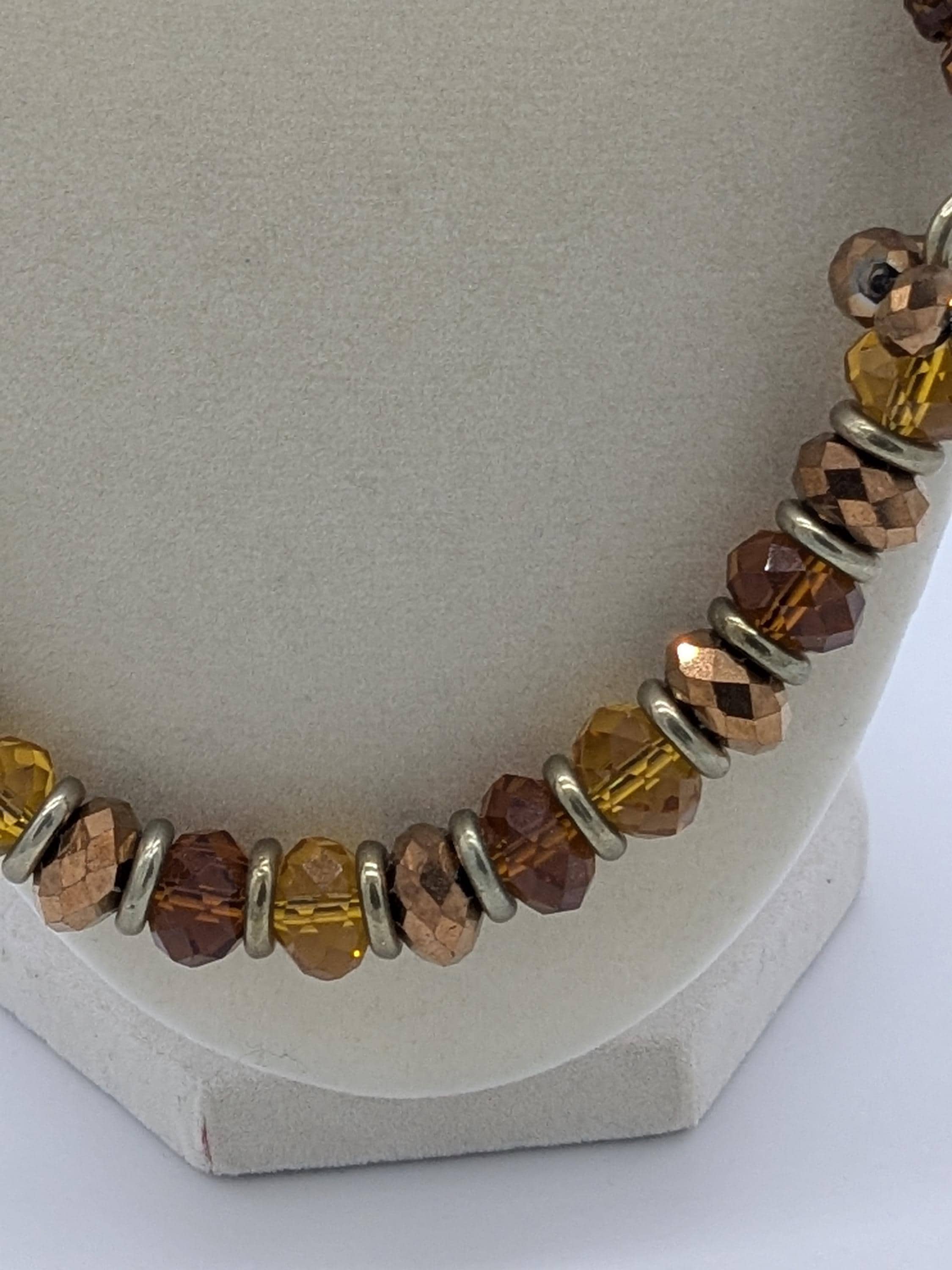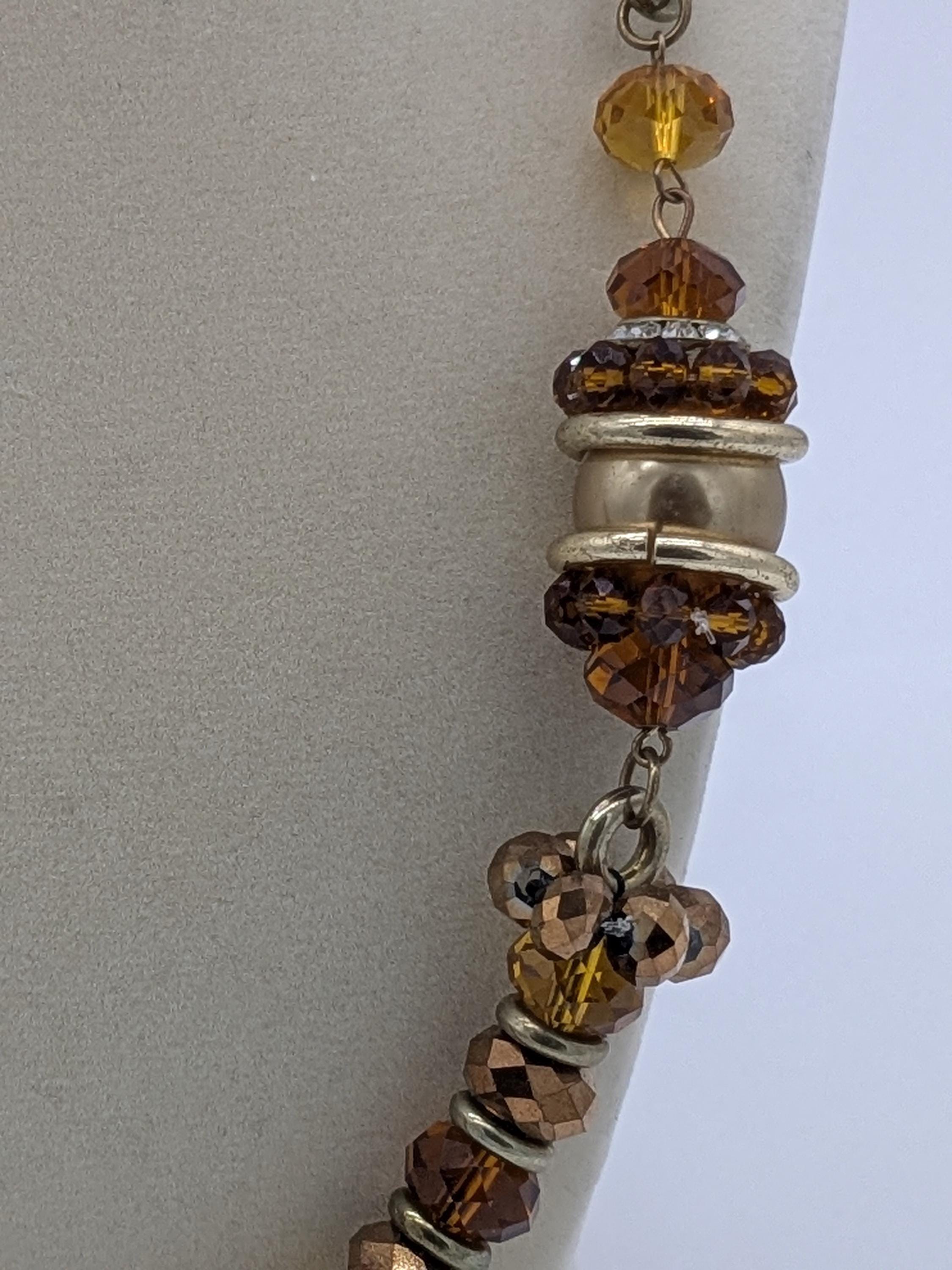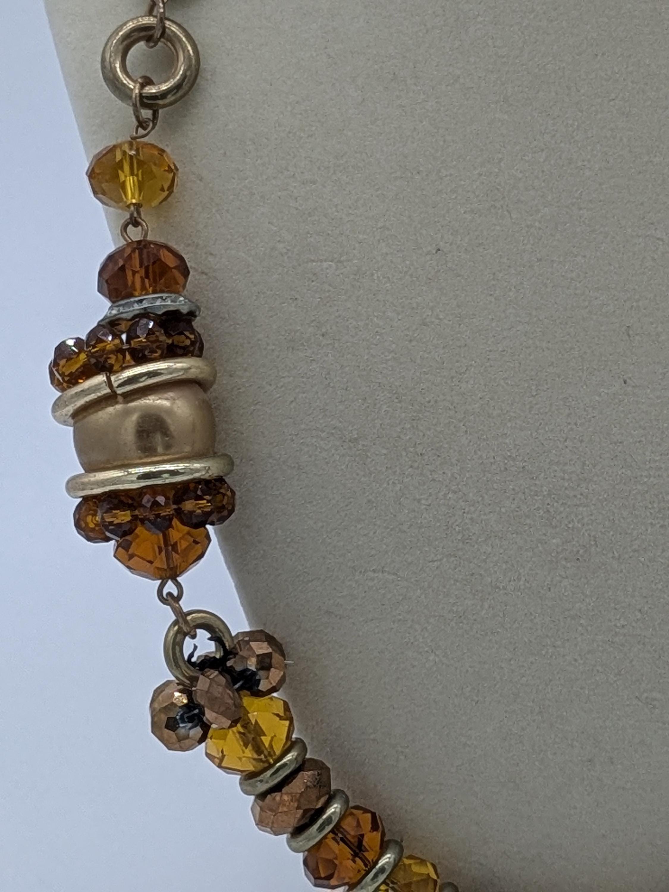 This beautiful statement necklace features warm amber, honey, and bronze-toned beads that shimmer with every movement. The mix of faceted glass and metallic accents gives it a rich, earthy glow — perfect for adding an autumn-inspired touch to your look. Ideal for both casual and elegant outfits.