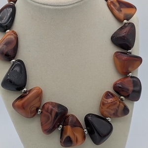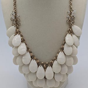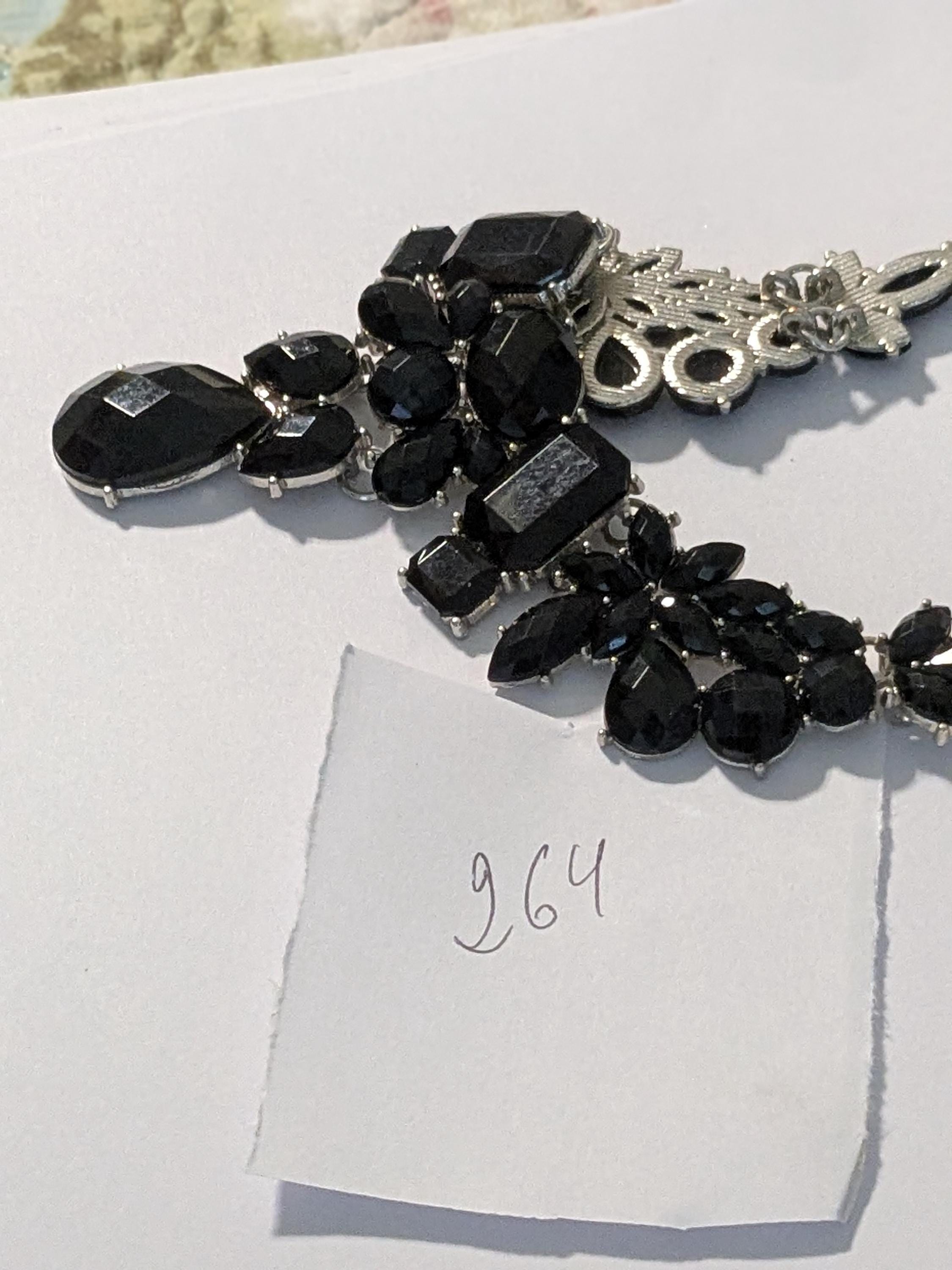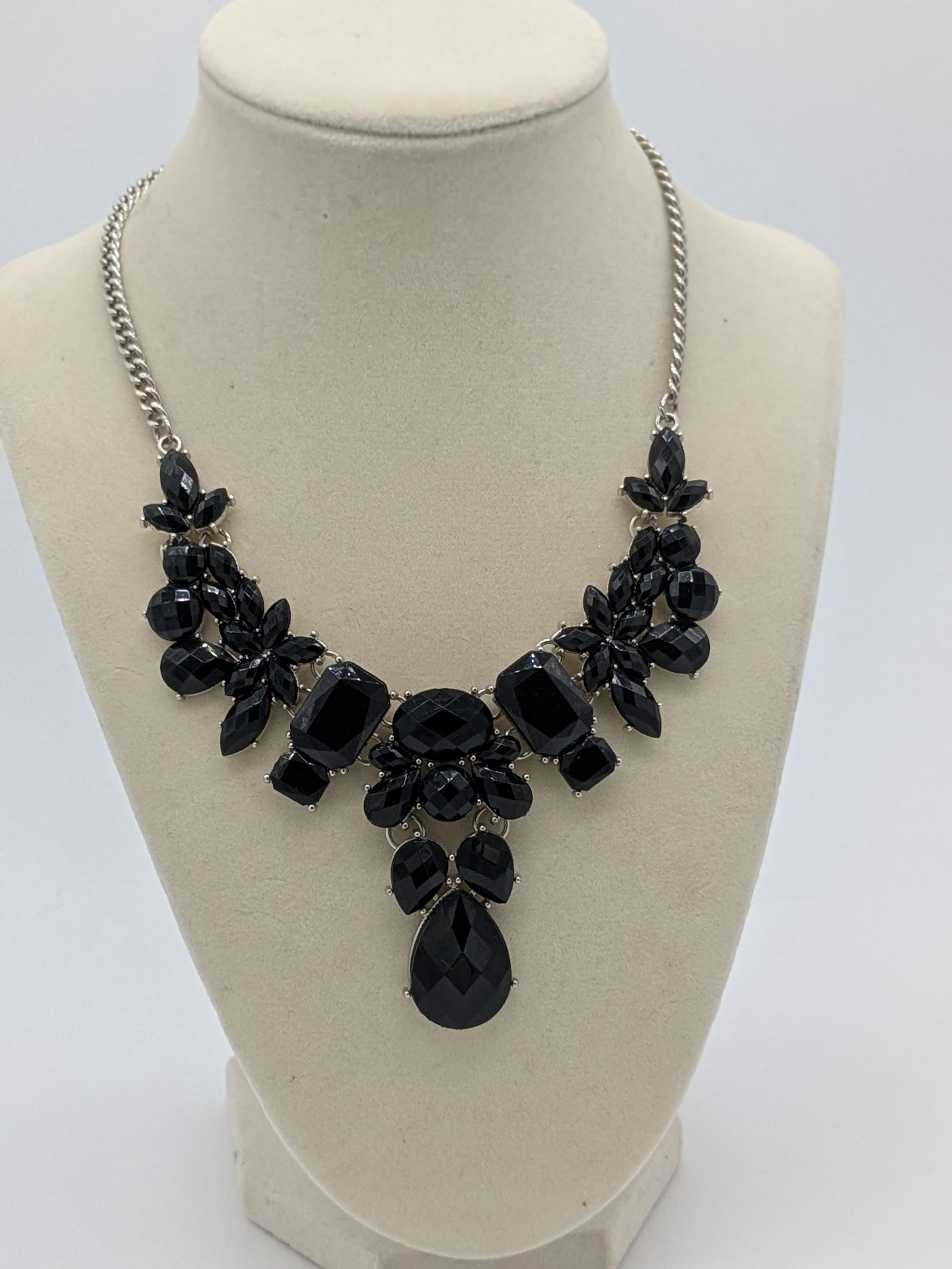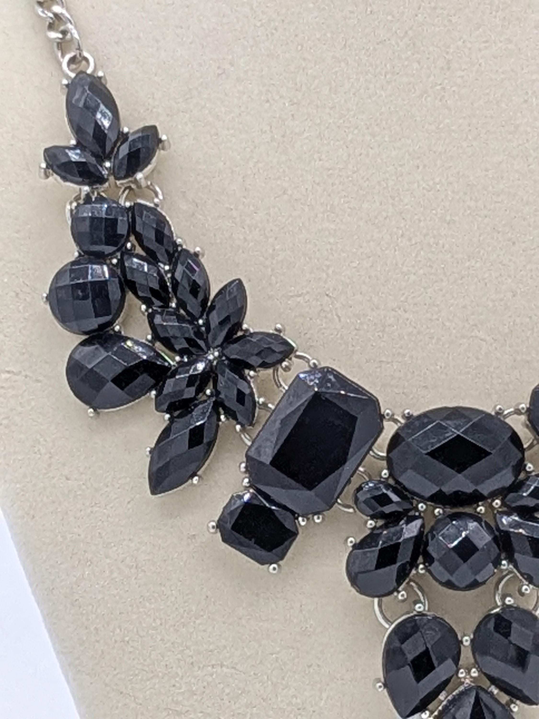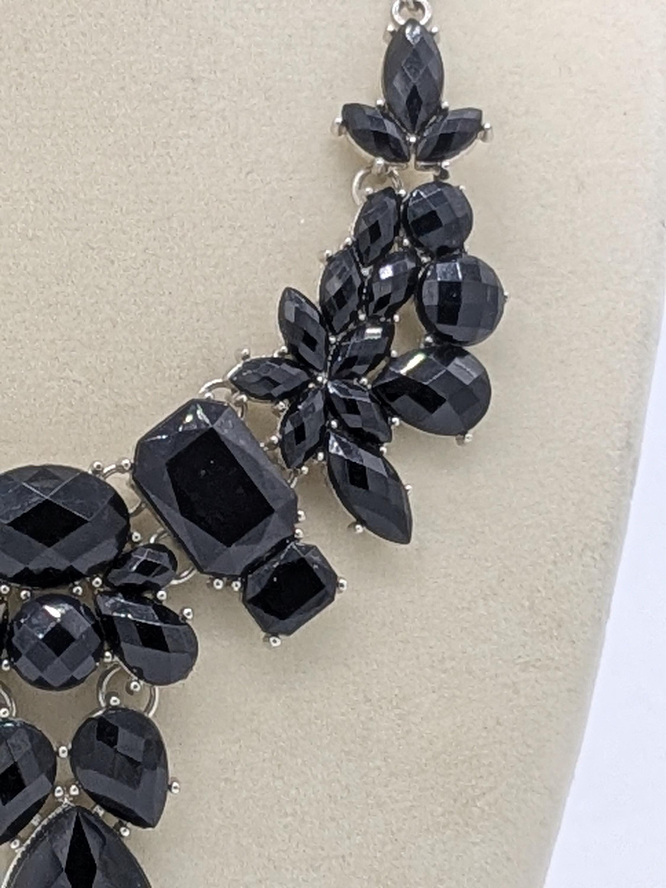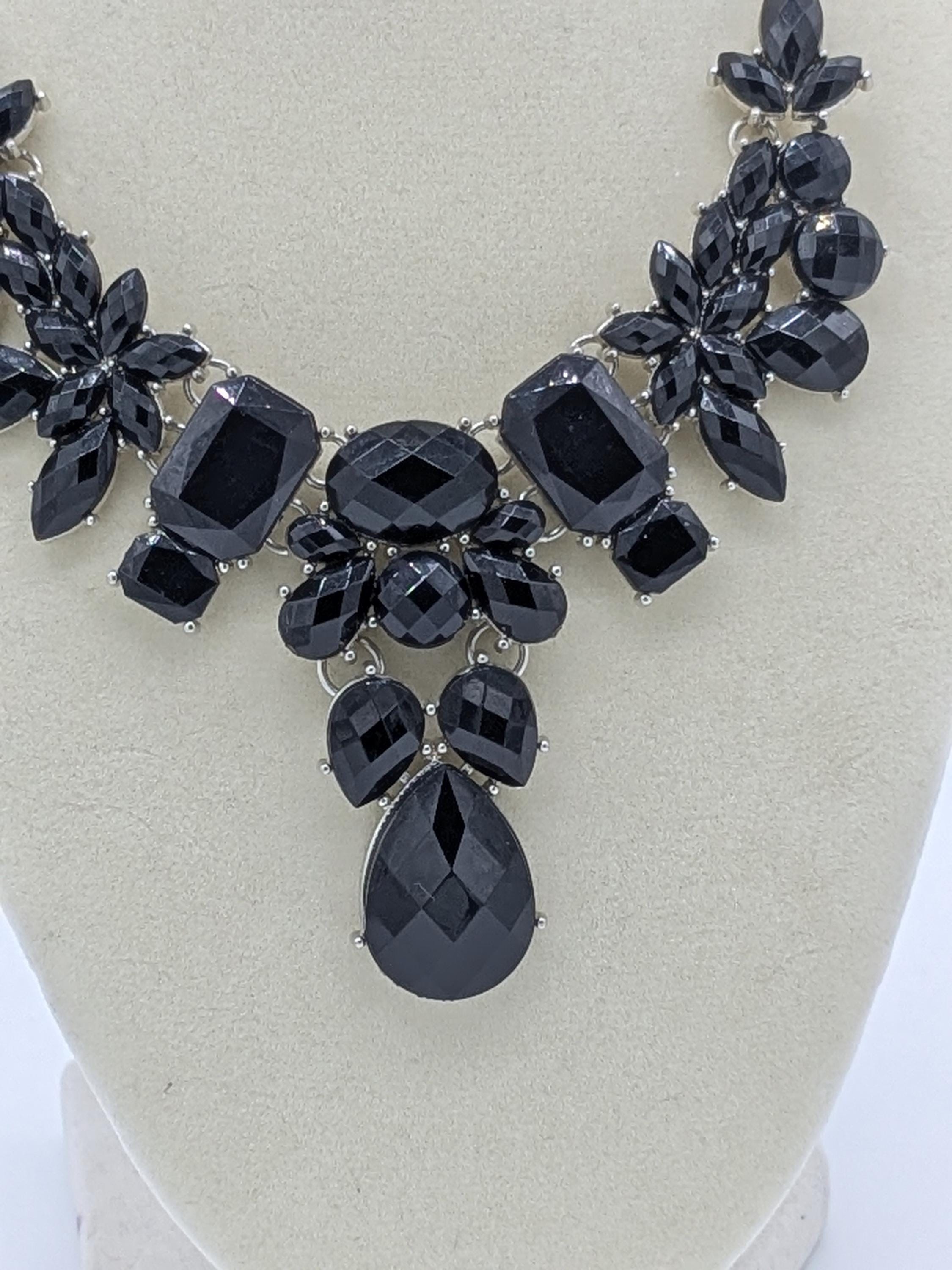 This elegant statement necklace features faceted black teardrop and geometric beads arranged in a cascading design. The dark, glossy finish paired with a sleek chain gives it a modern and sophisticated edge — perfect for evening events, special occasions, or adding drama to any outfit.