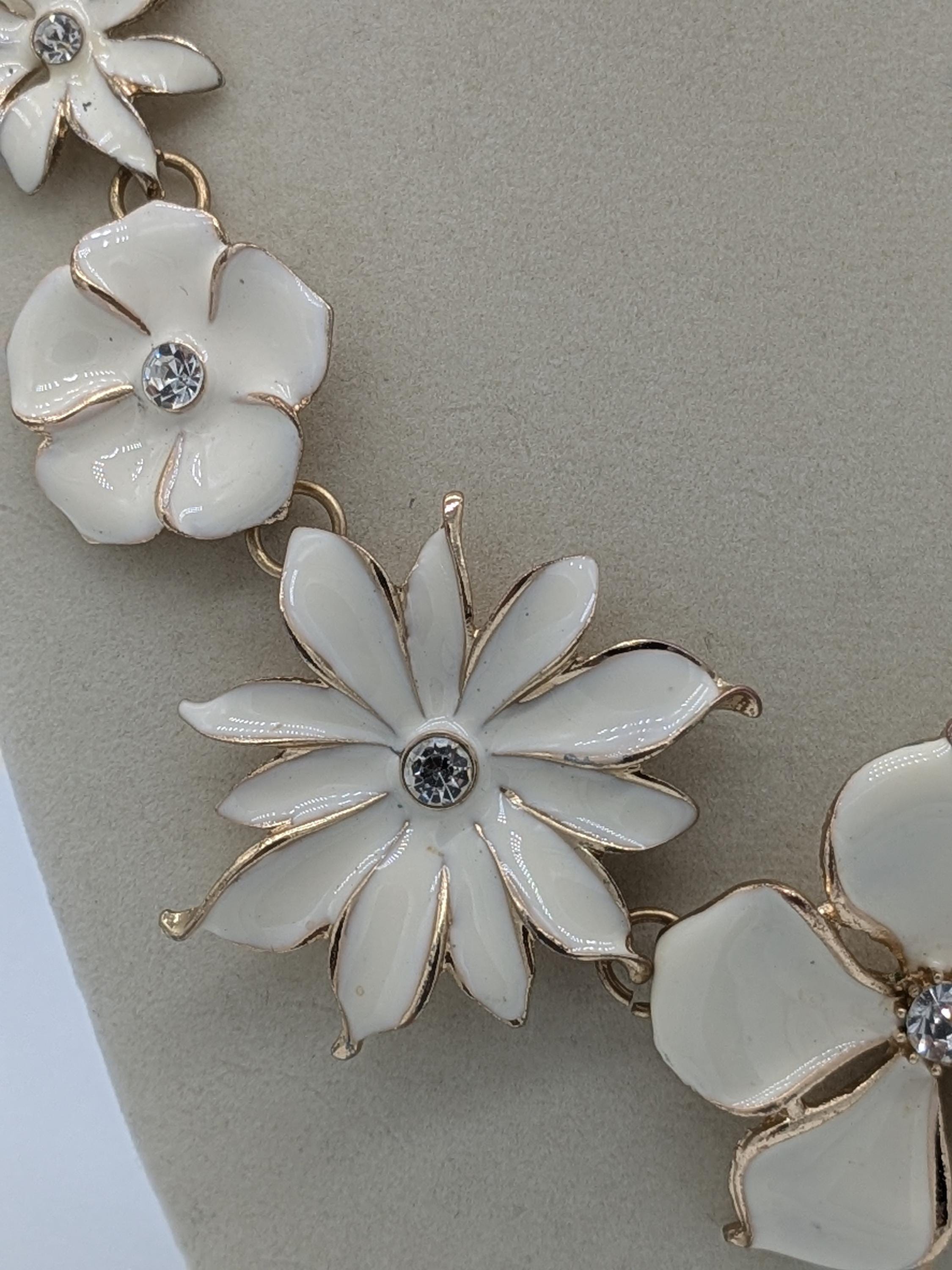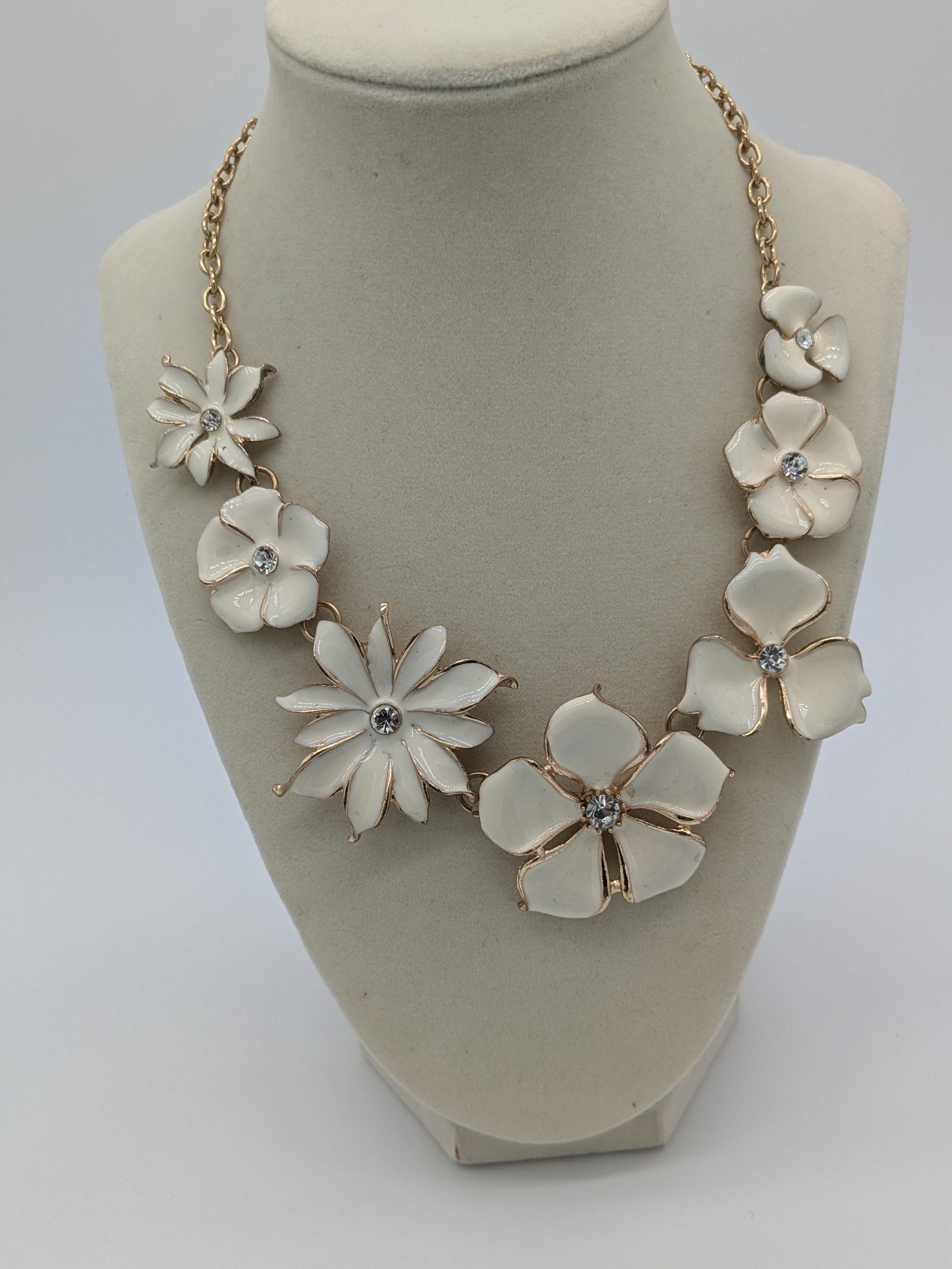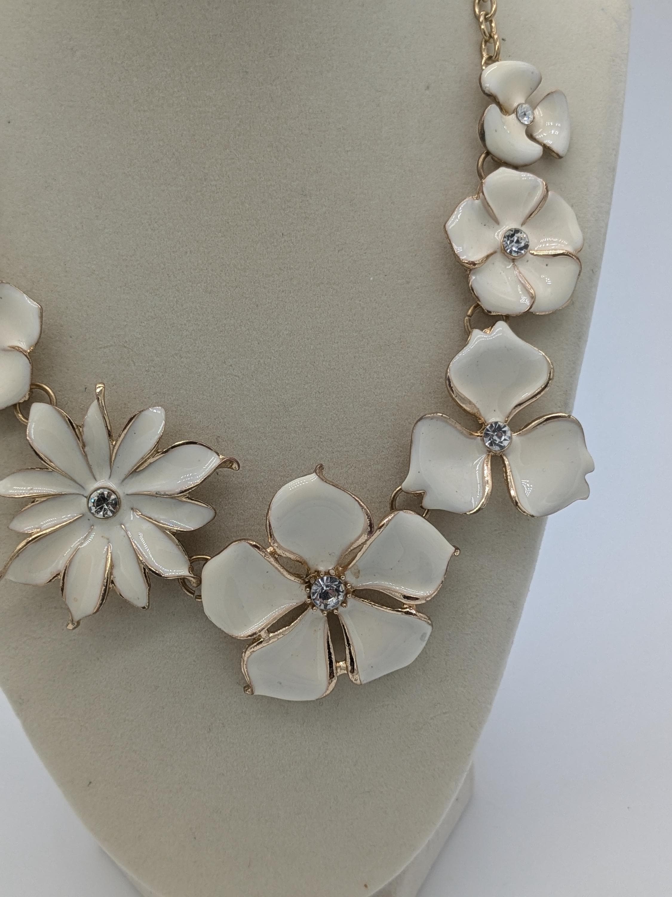 This elegant statement necklace features layered white enamel flowers with a glossy finish and crystal-like accents at the center. The soft neutral tones and sculpted floral shapes bring a touch of romance and sophistication — perfect for weddings, parties, or dressing up any casual outfit.