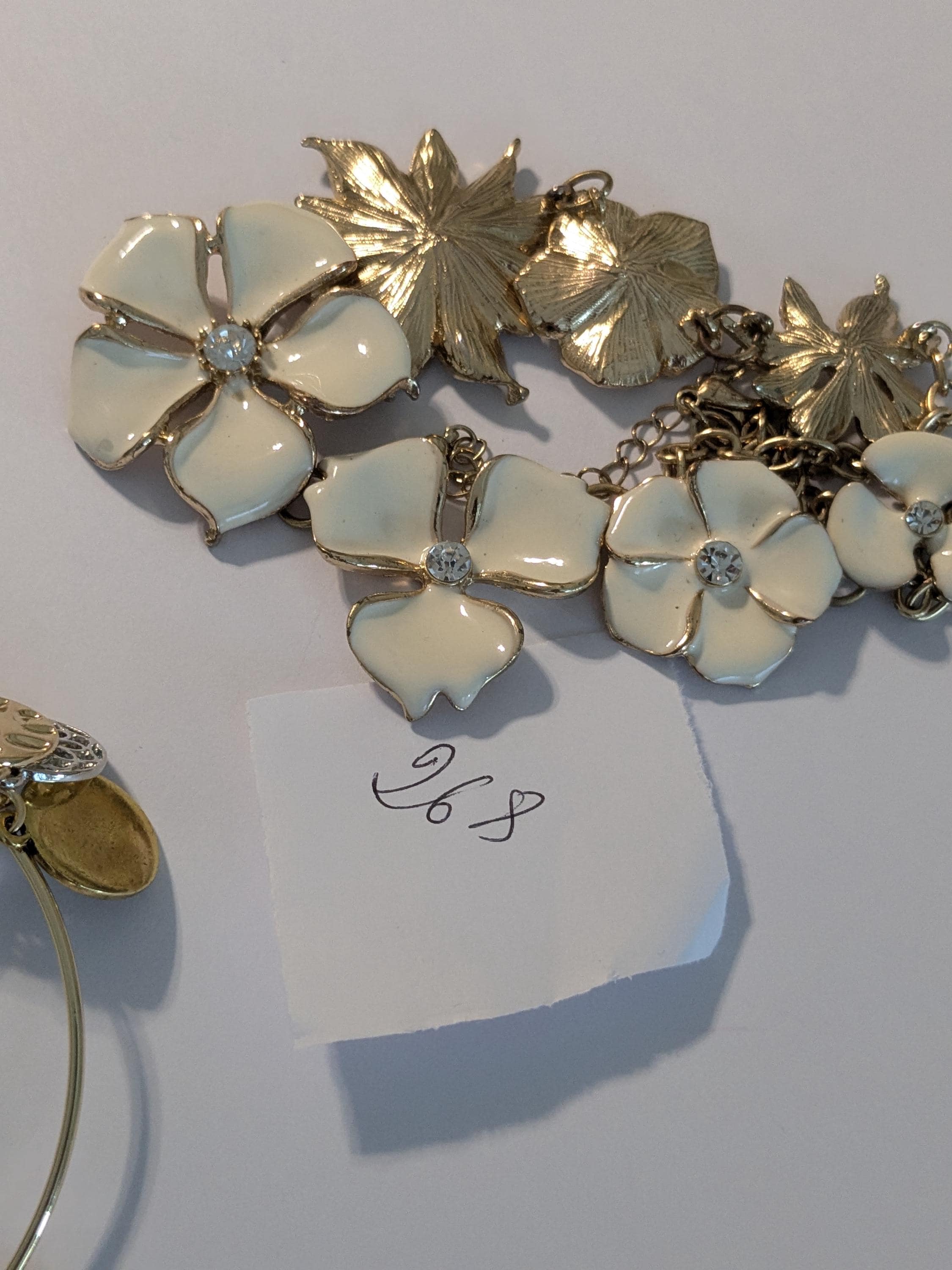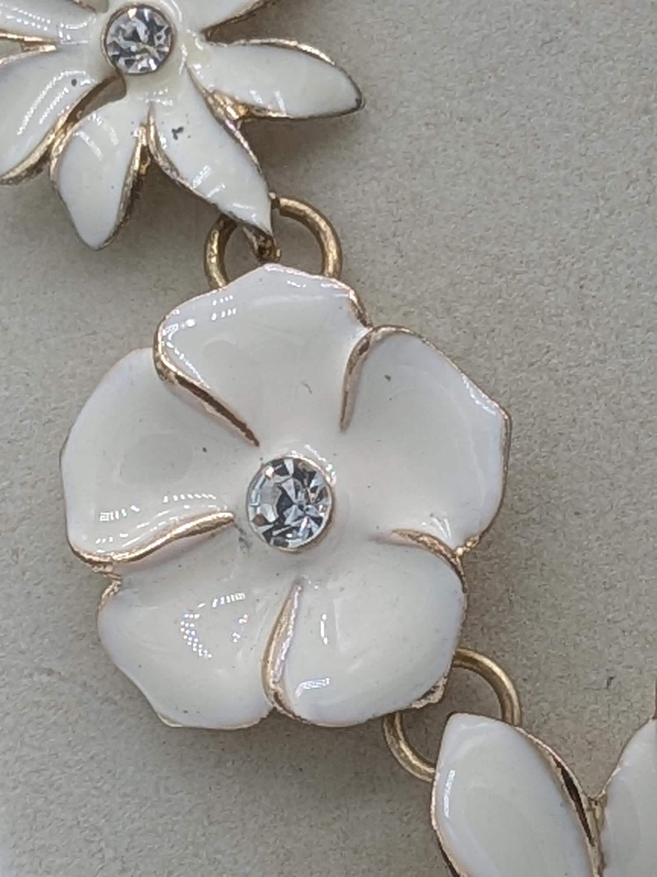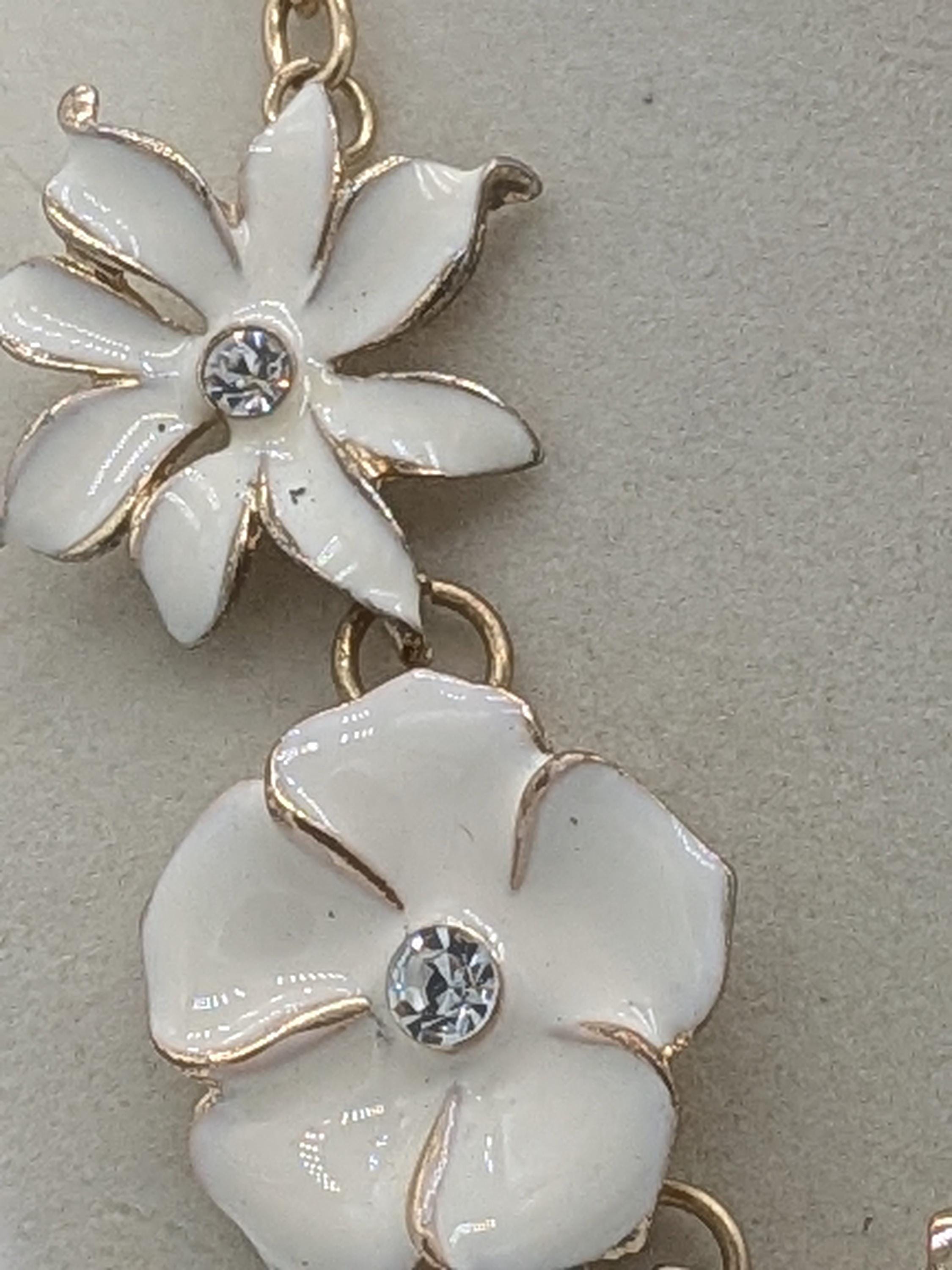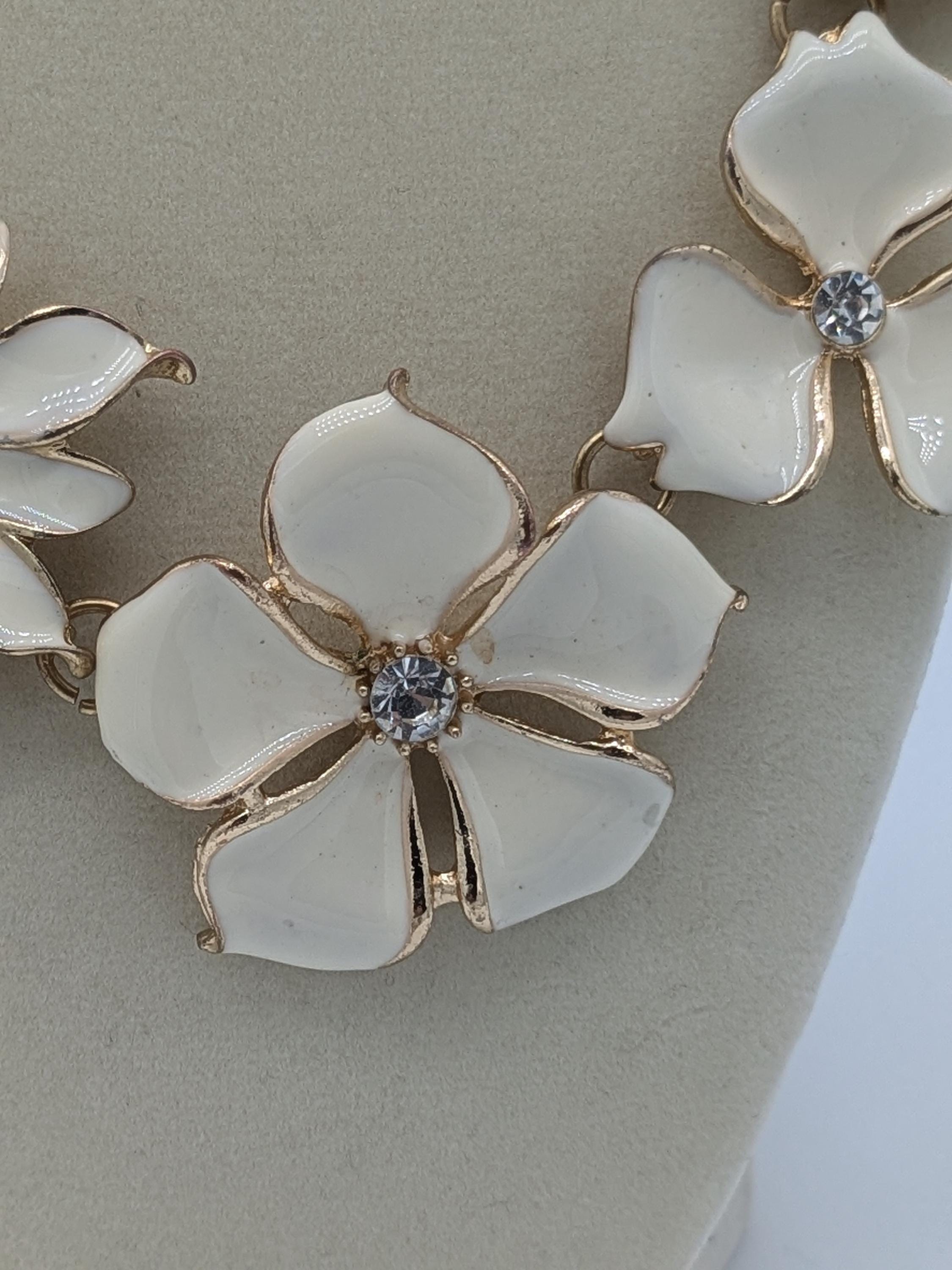 This elegant statement necklace features layered white enamel flowers with a glossy finish and crystal-like accents at the center. The soft neutral tones and sculpted floral shapes bring a touch of romance and sophistication — perfect for weddings, parties, or dressing up any casual outfit.