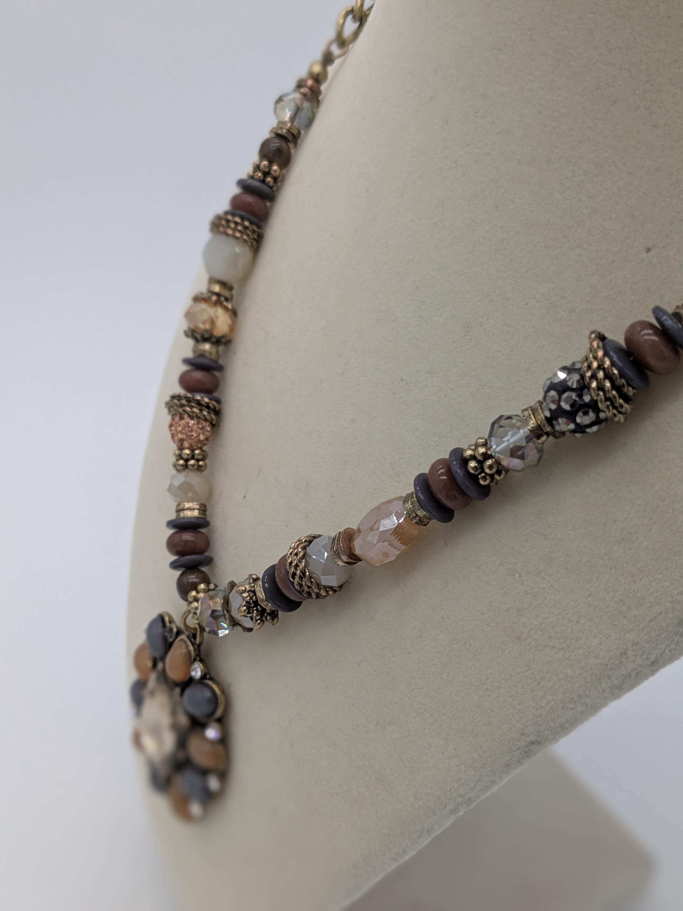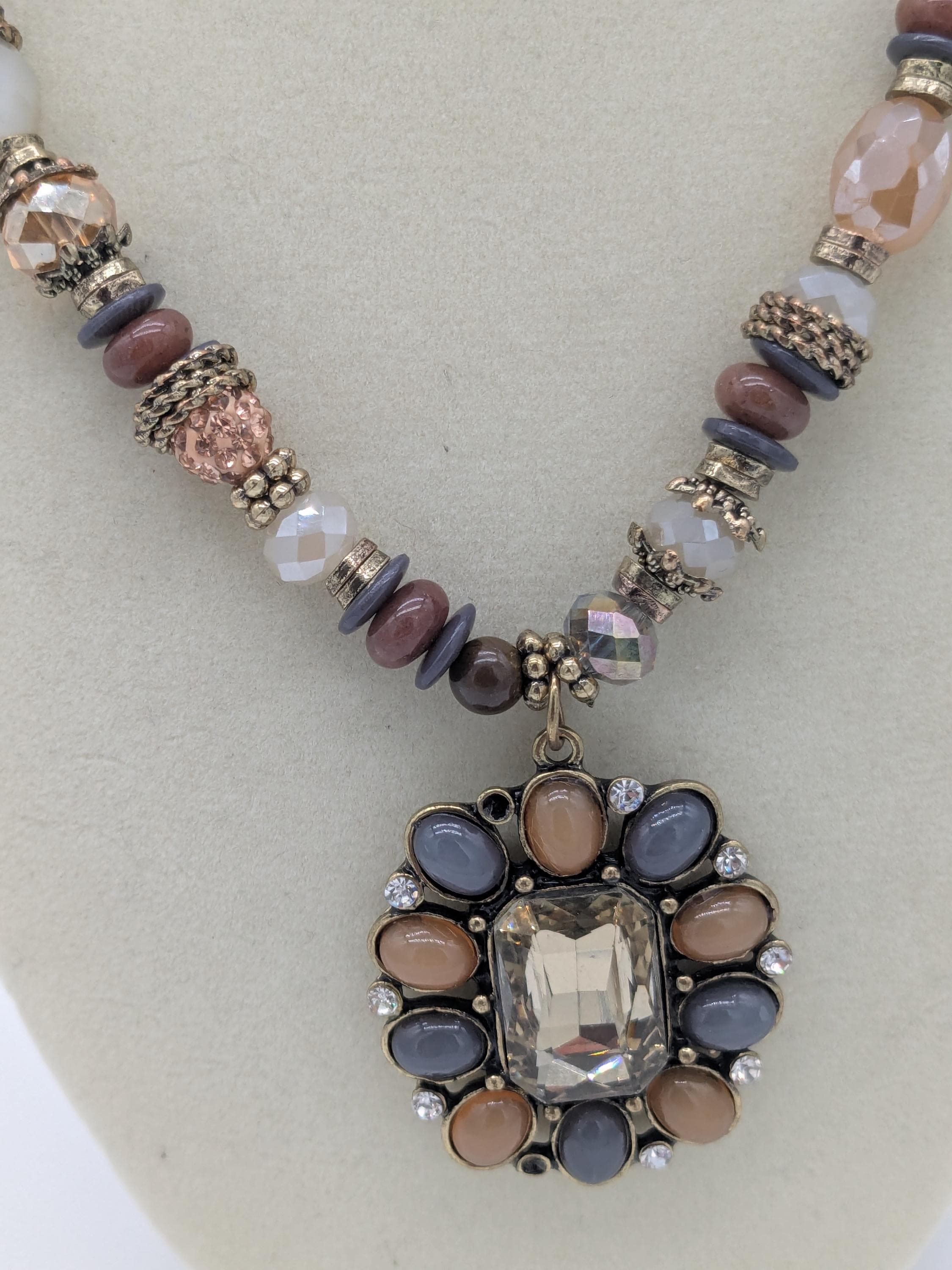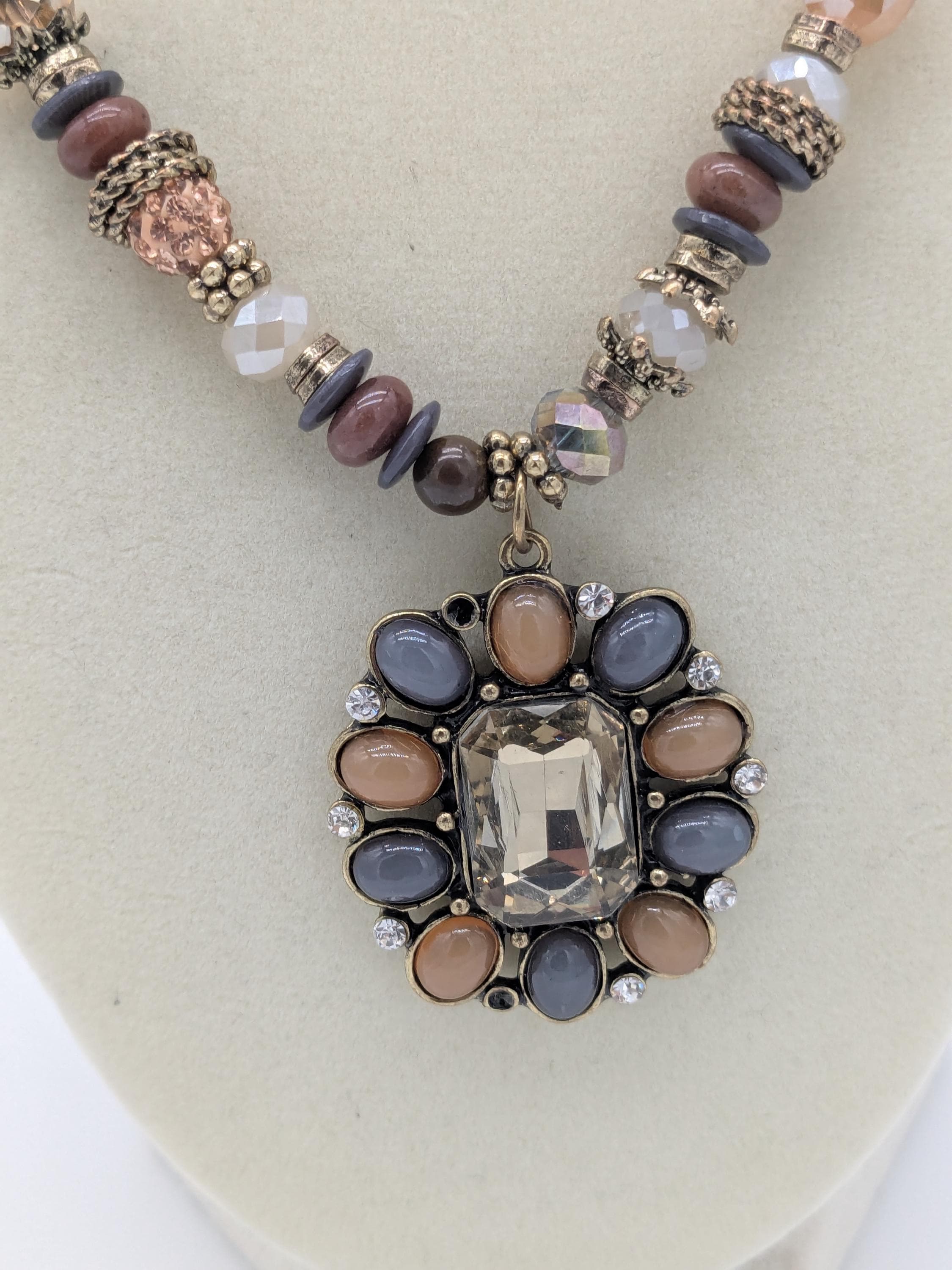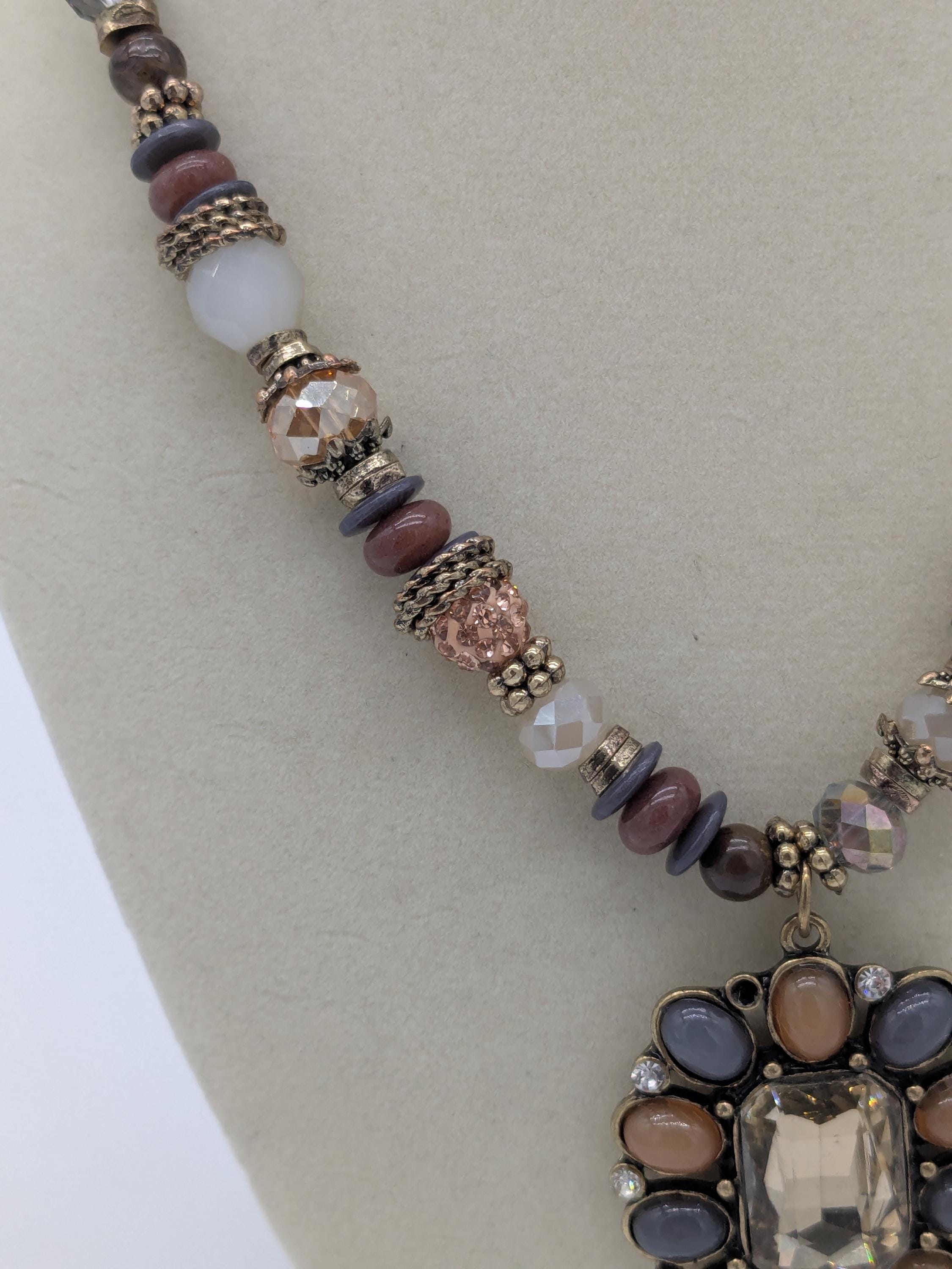 This boho-inspired statement necklace features a mix of faceted and smooth beads in soft neutral shades of gray, peach, and beige. The large central pendant adds an elegant vintage charm with its intricate beadwork and antique finish. A beautiful piece for adding sophistication to any outfit — perfect for special occasions or everyday style.