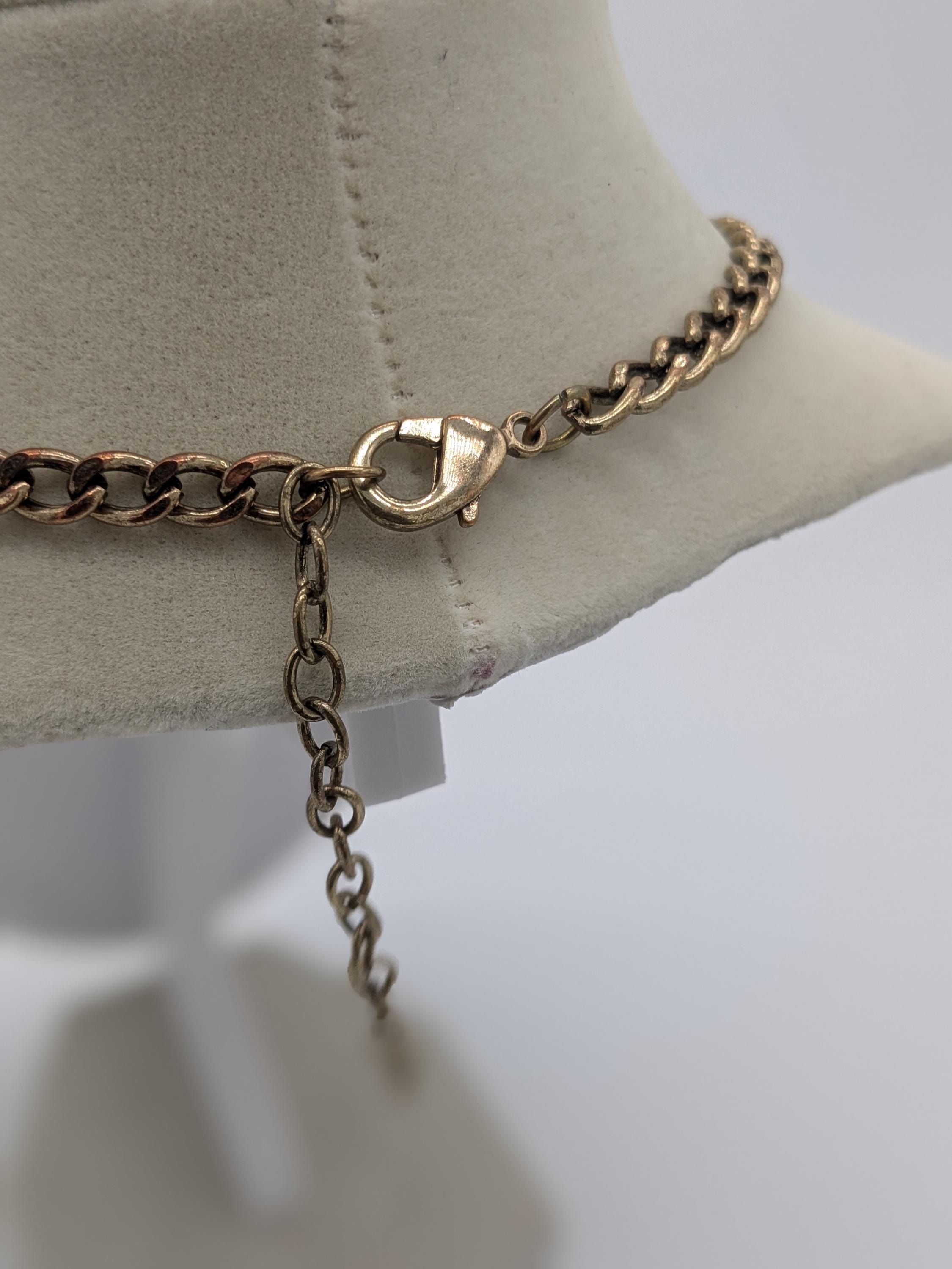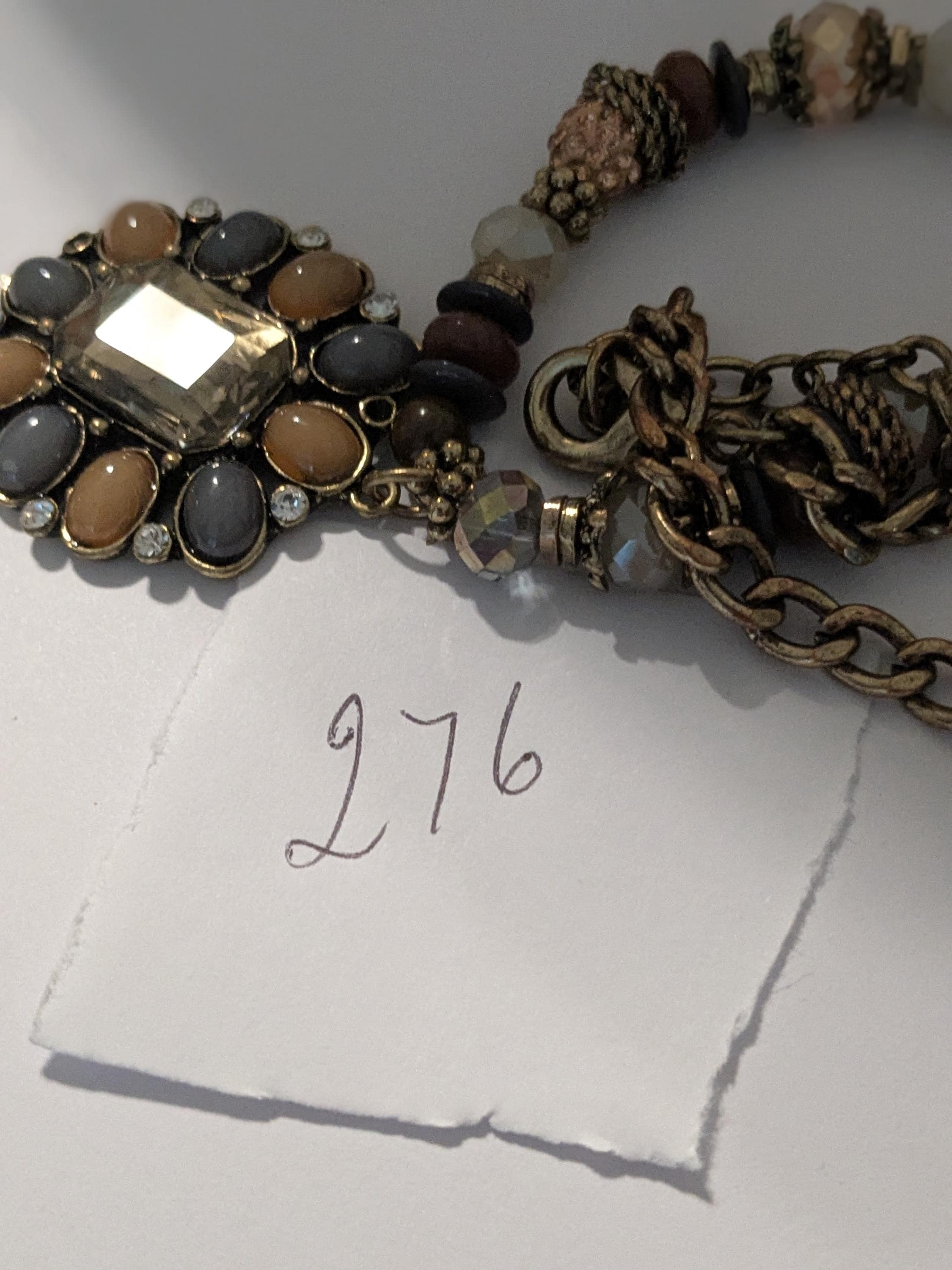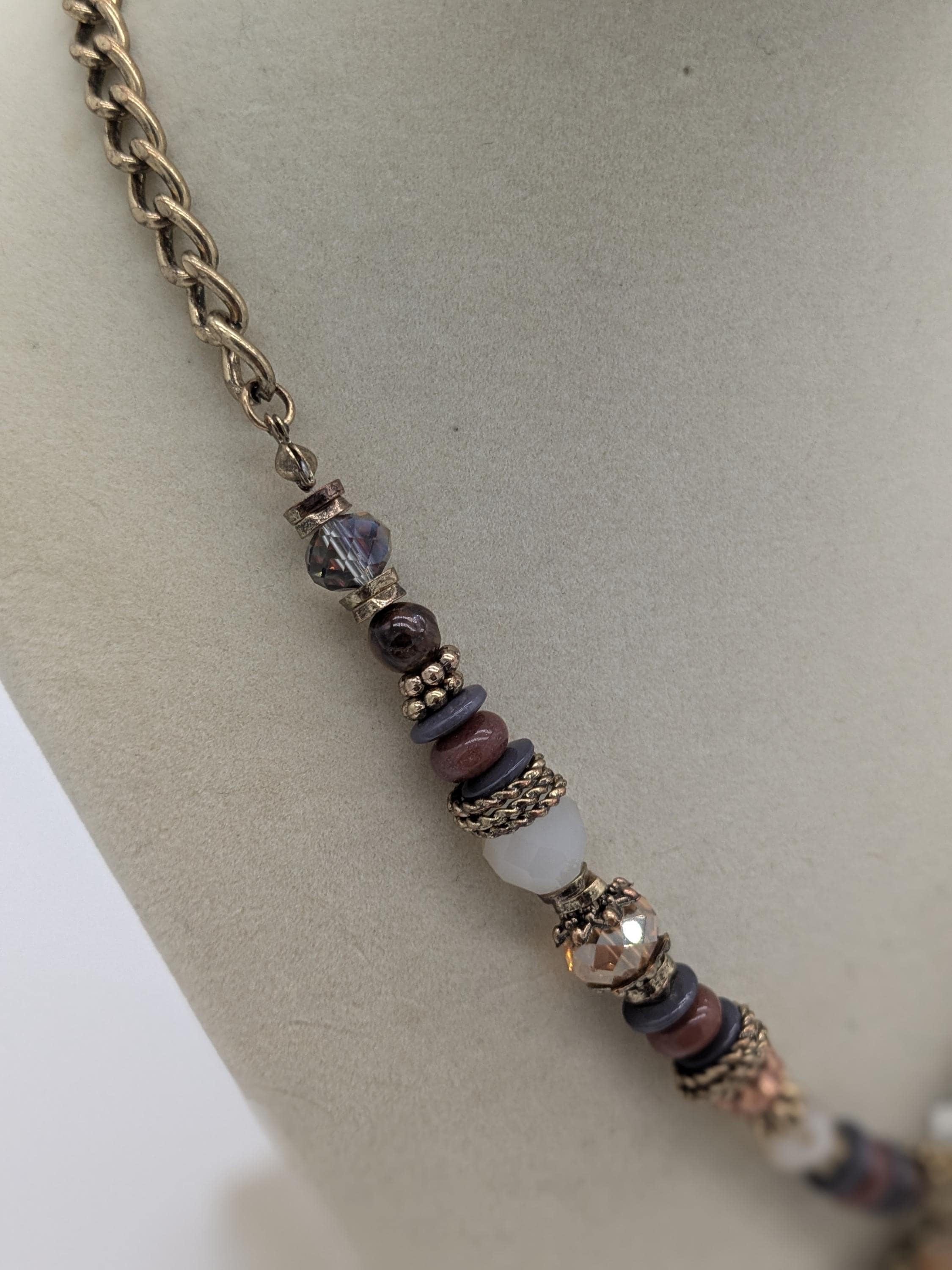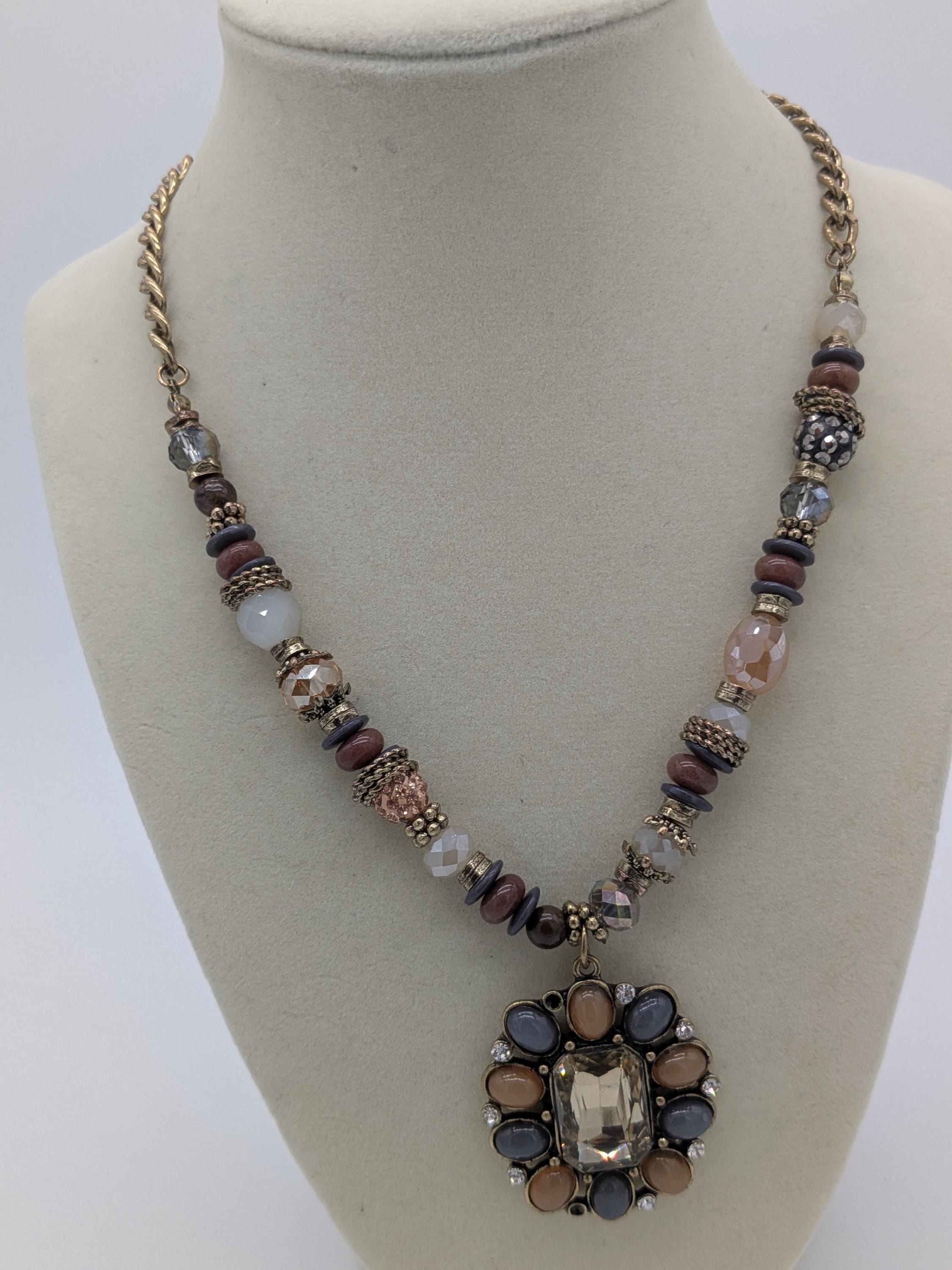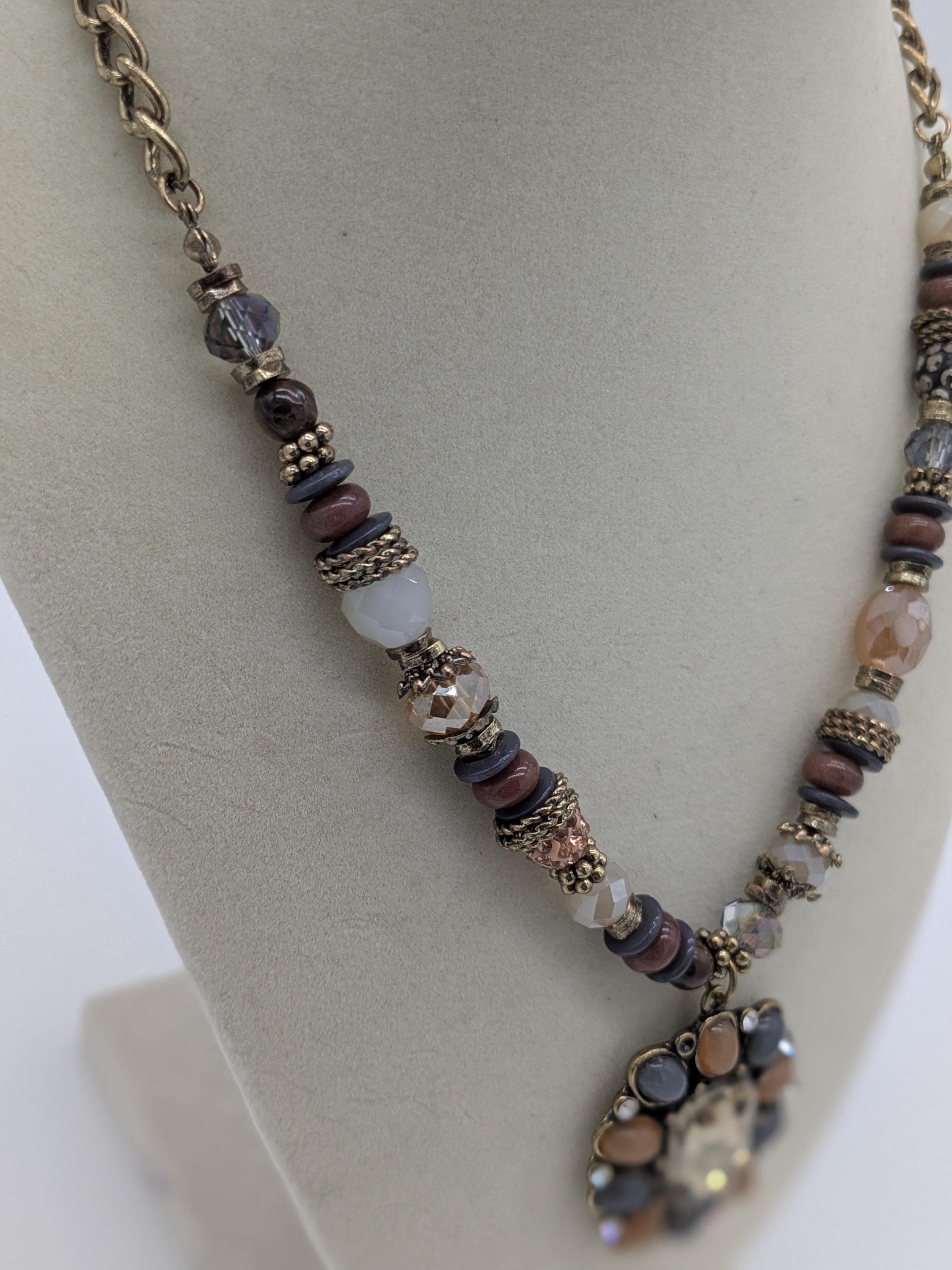 This boho-inspired statement necklace features a mix of faceted and smooth beads in soft neutral shades of gray, peach, and beige. The large central pendant adds an elegant vintage charm with its intricate beadwork and antique finish. A beautiful piece for adding sophistication to any outfit — perfect for special occasions or everyday style.