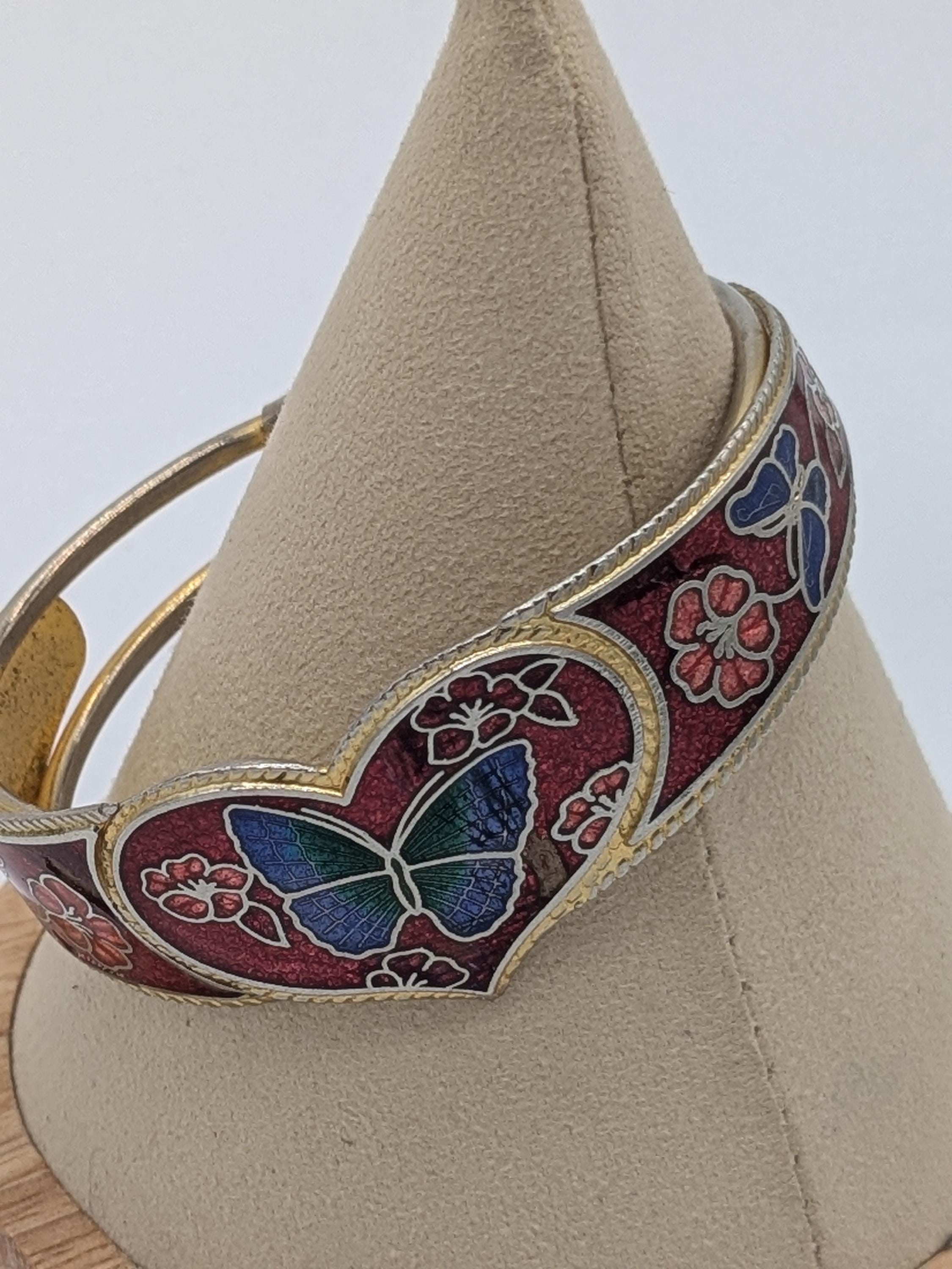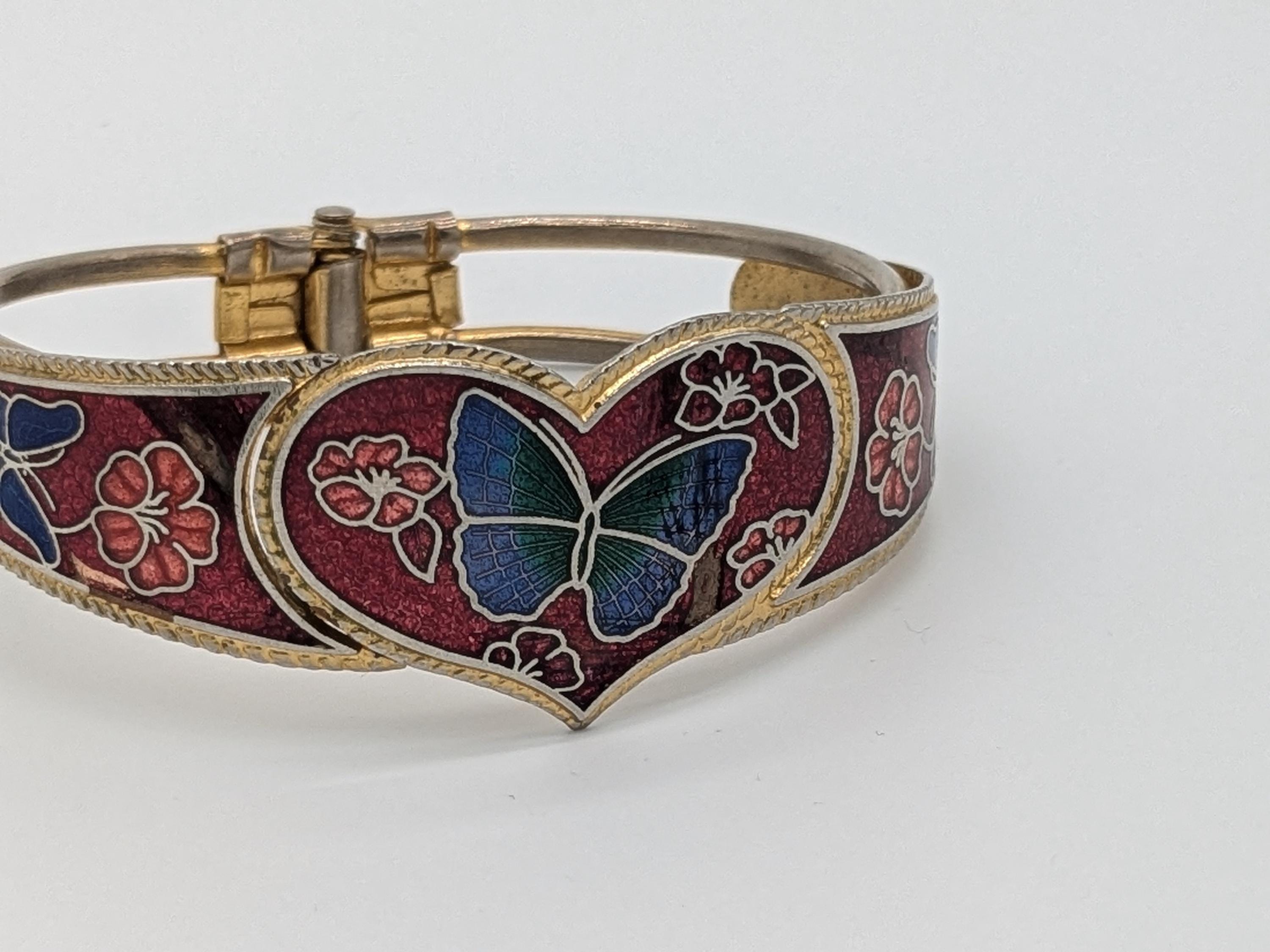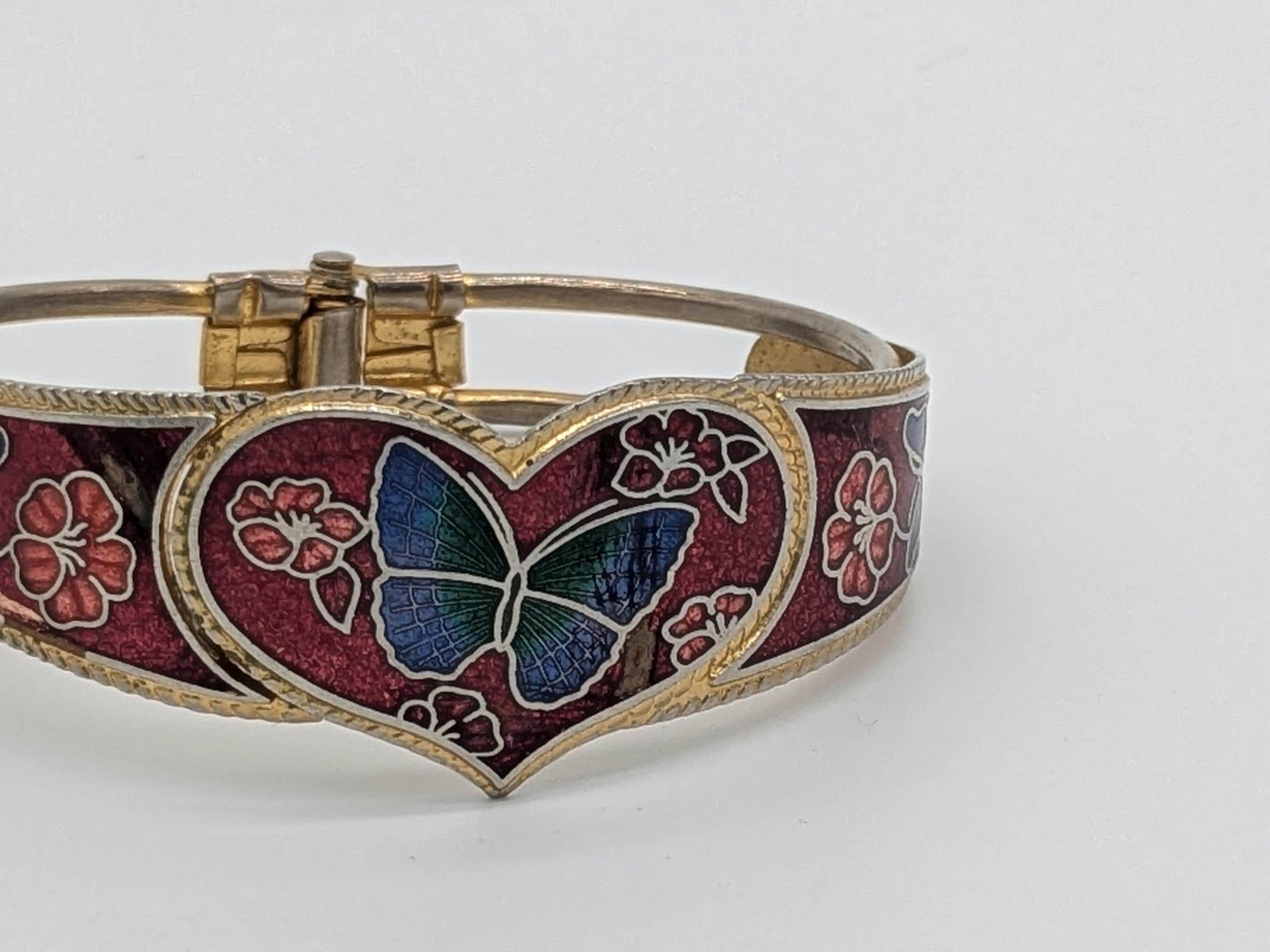 This beautiful vintage-style bangle features a heart-shaped butterfly motif surrounded by floral enamel detailing in deep red and blue tones. With its hinged design and intricate cloisonné craftsmanship, this bracelet adds a touch of artistic charm and timeless elegance to any outfit.
