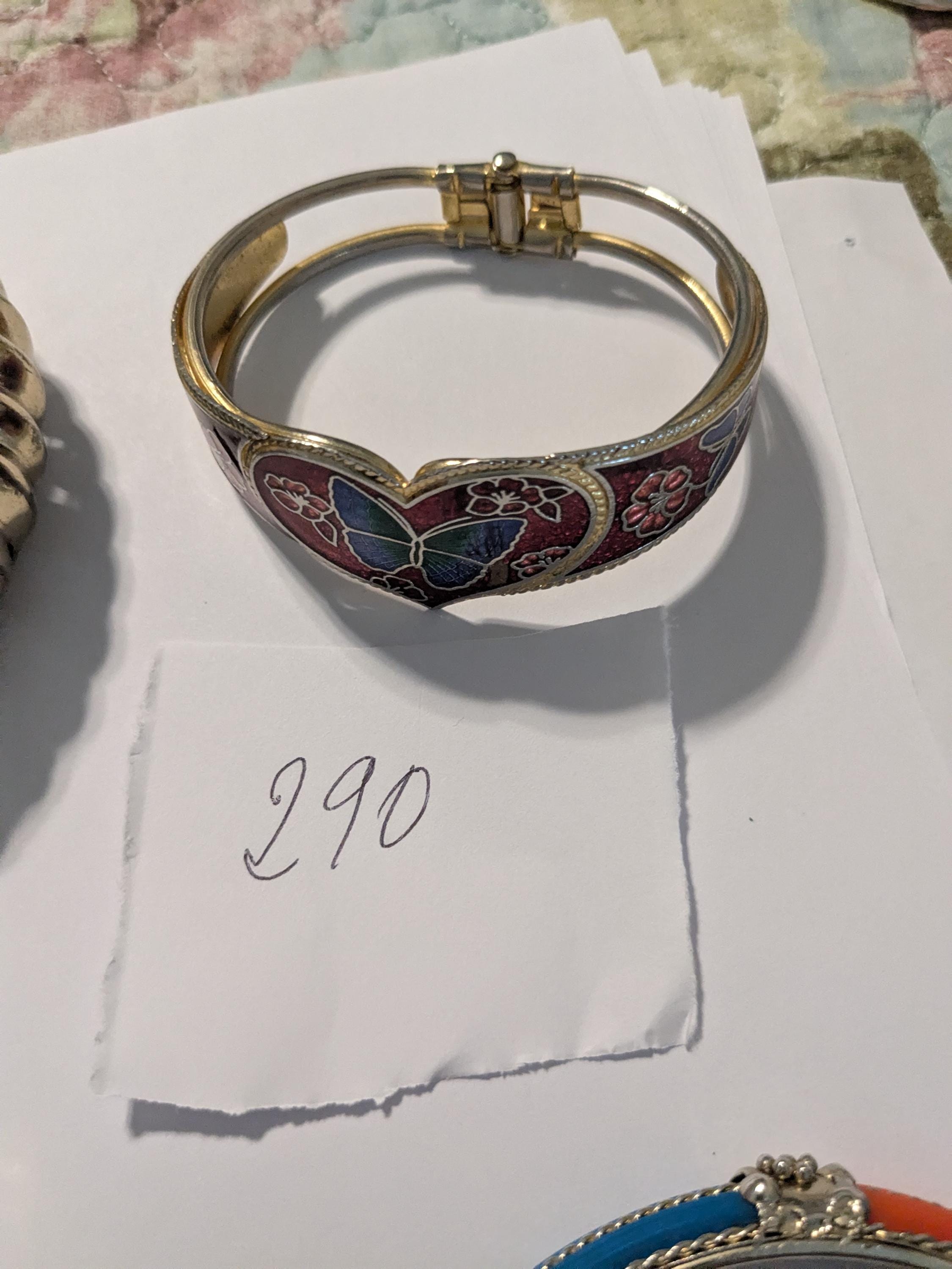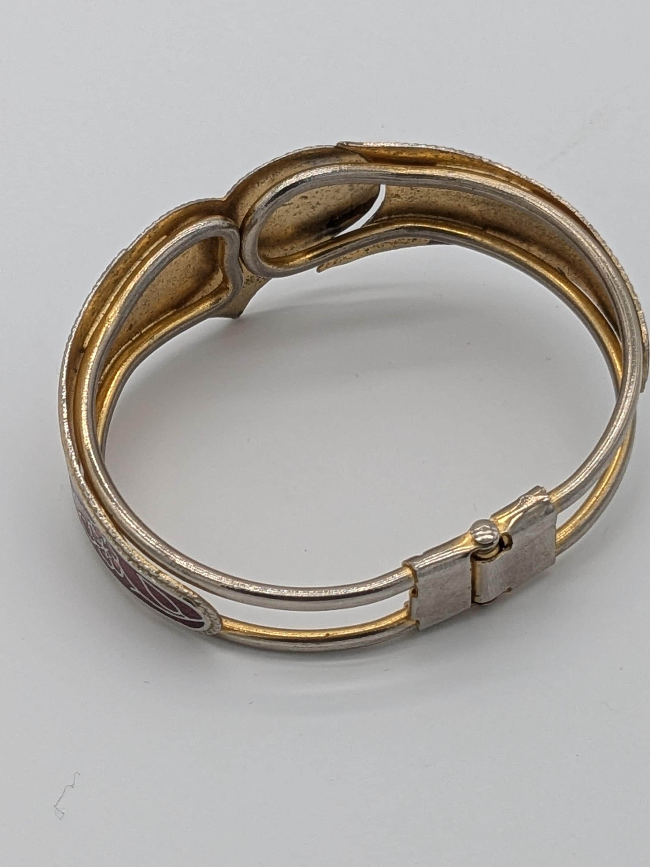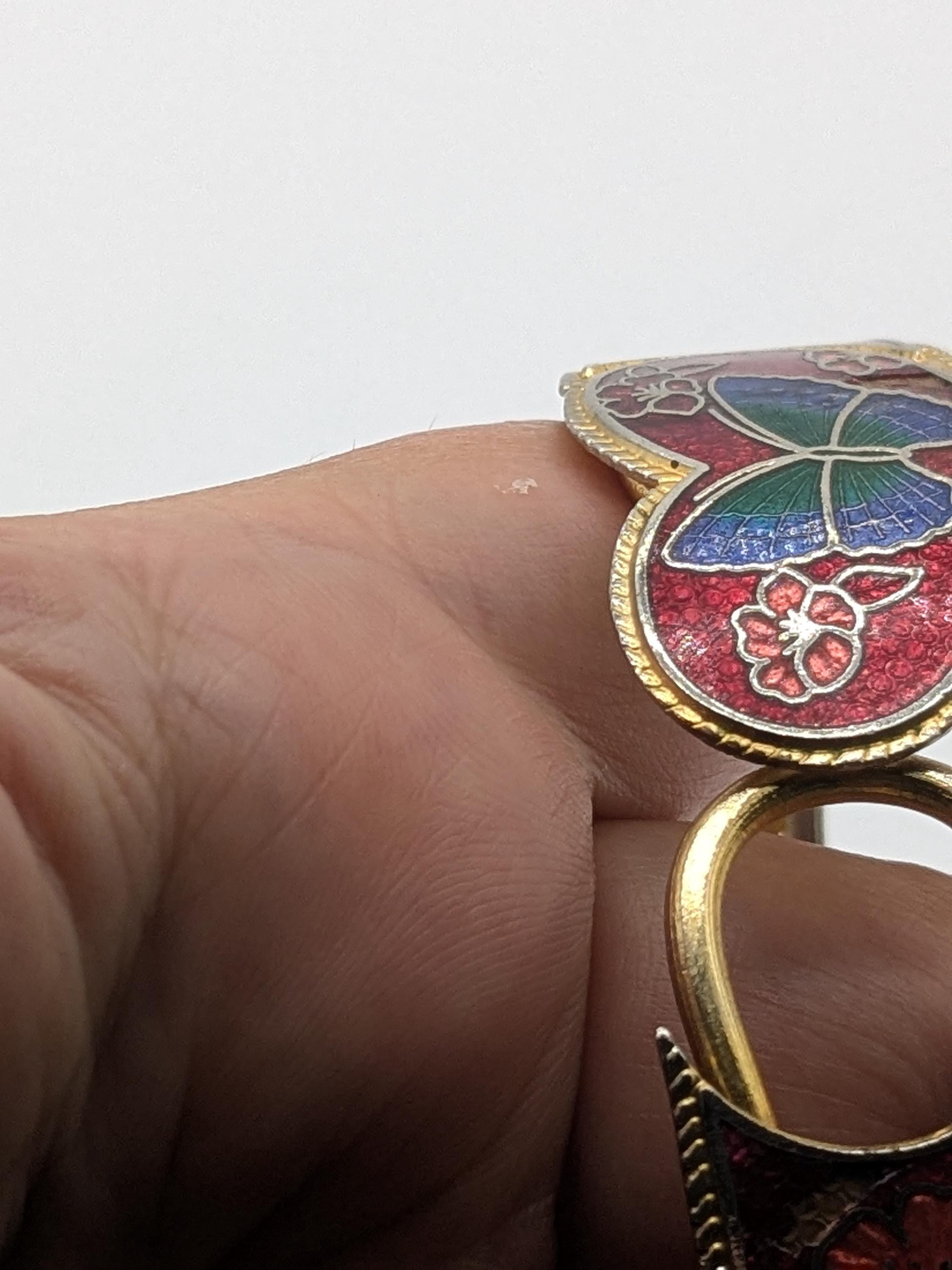 This beautiful vintage-style bangle features a heart-shaped butterfly motif surrounded by floral enamel detailing in deep red and blue tones. With its hinged design and intricate cloisonné craftsmanship, this bracelet adds a touch of artistic charm and timeless elegance to any outfit.