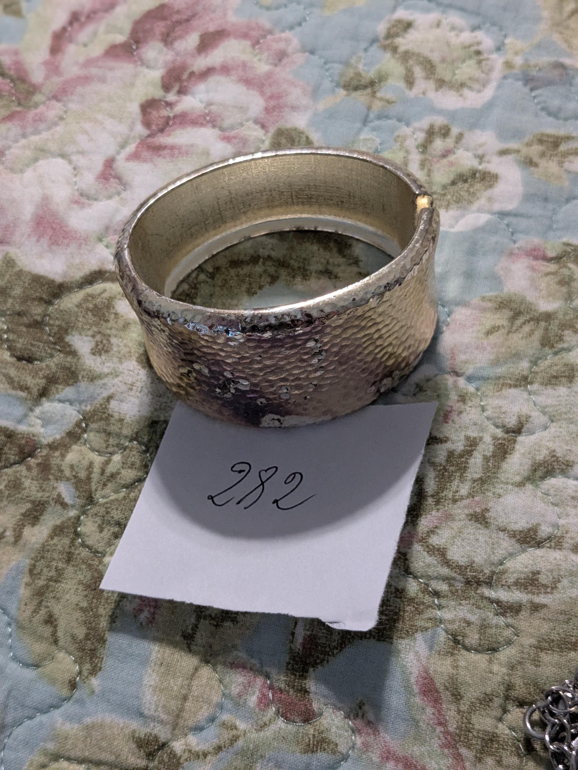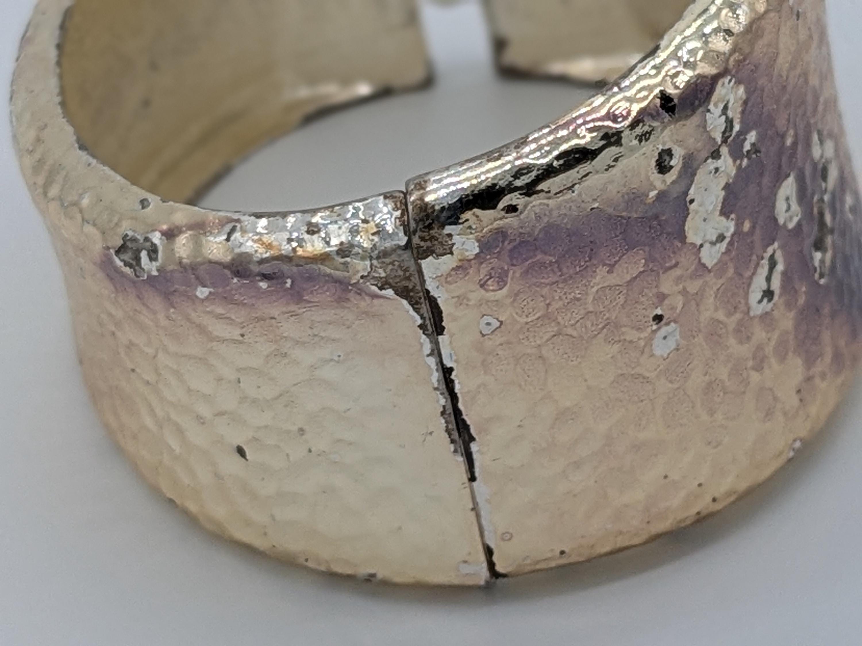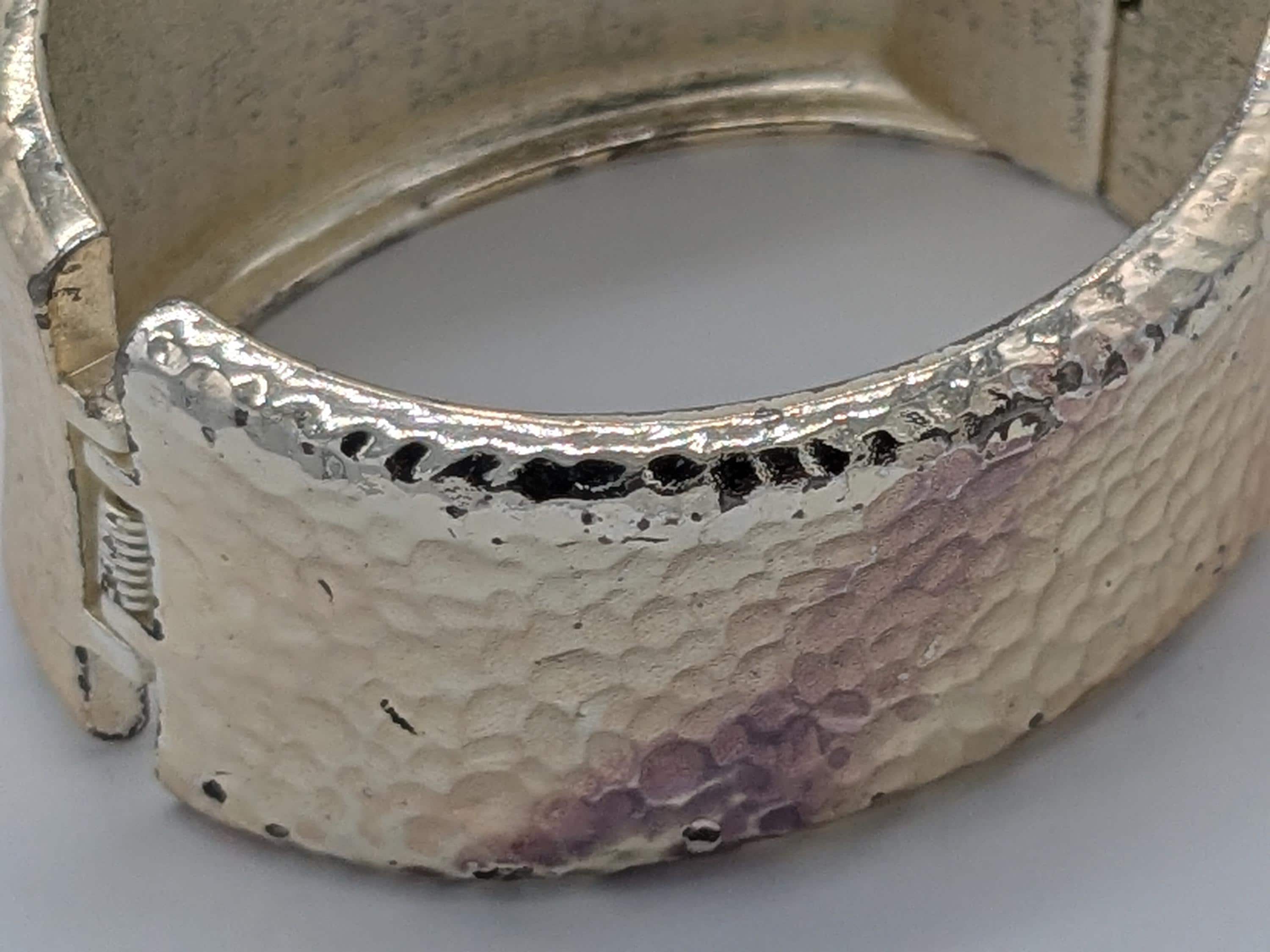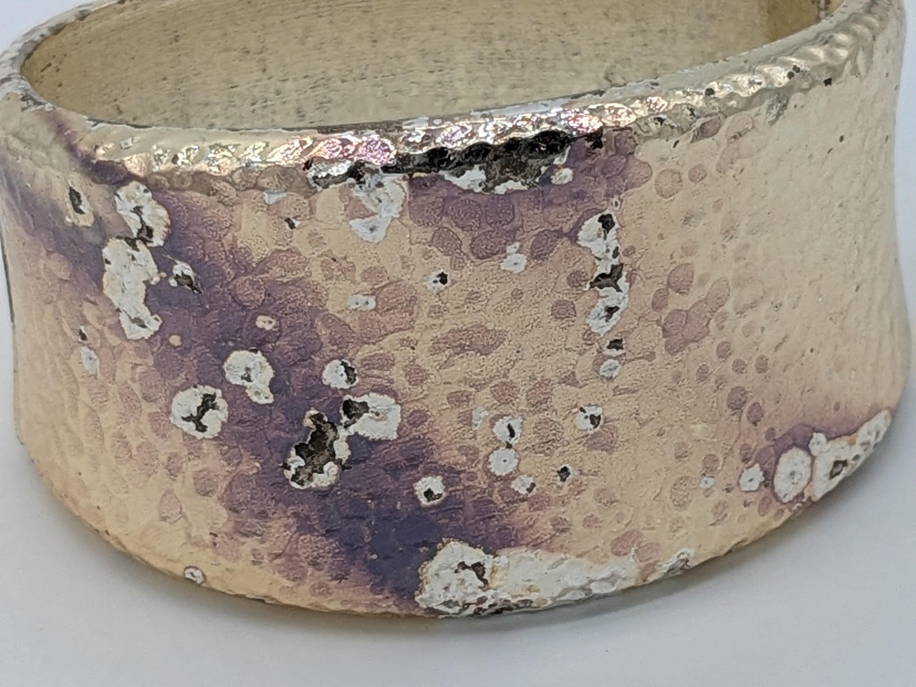 This artistic wide cuff bracelet showcases a distressed purple and cream finish with a hammered texture for a rustic, vintage-inspired look. Its weathered patina adds unique charm and character, making it the perfect statement piece for boho and eclectic styles.