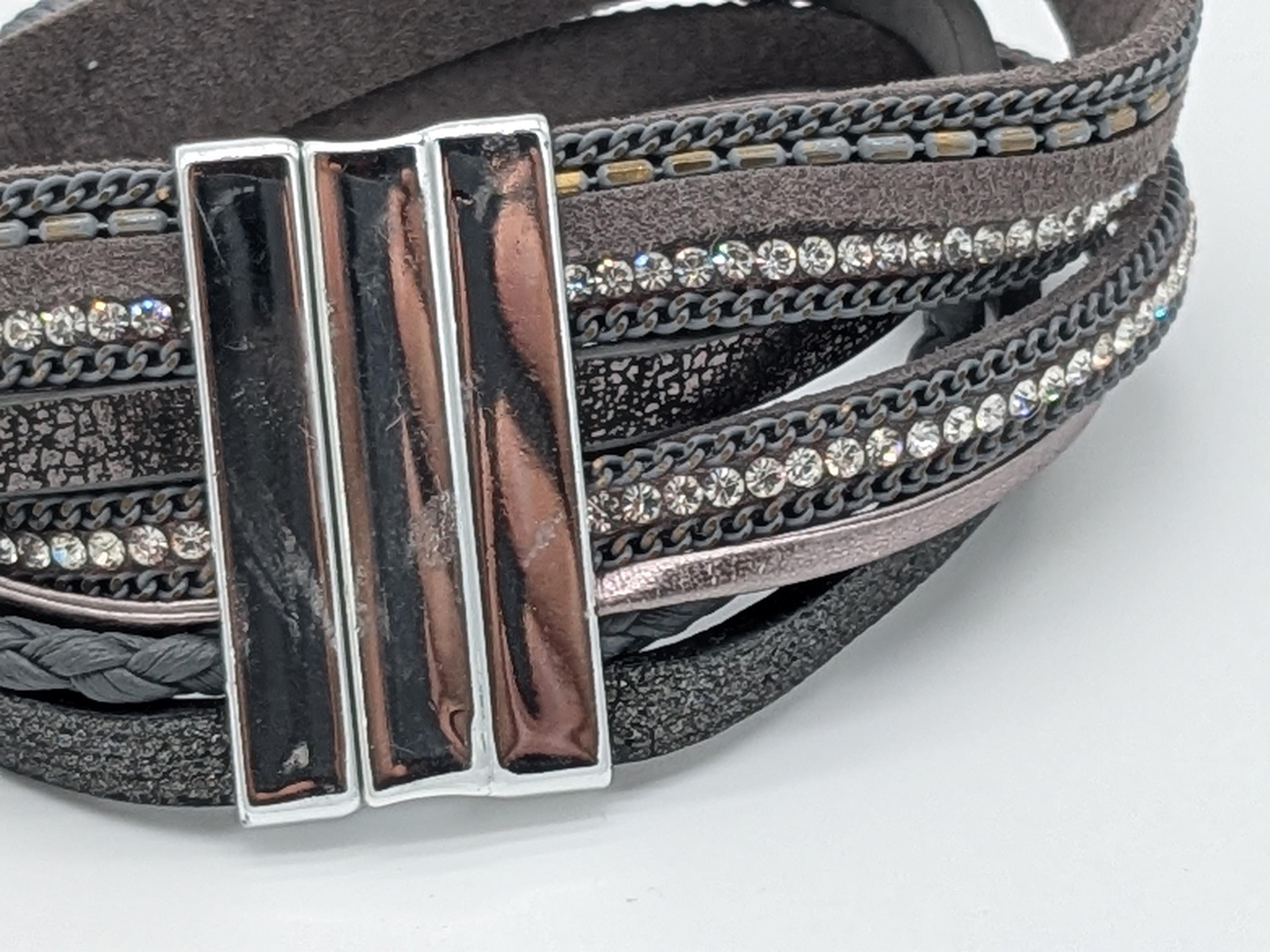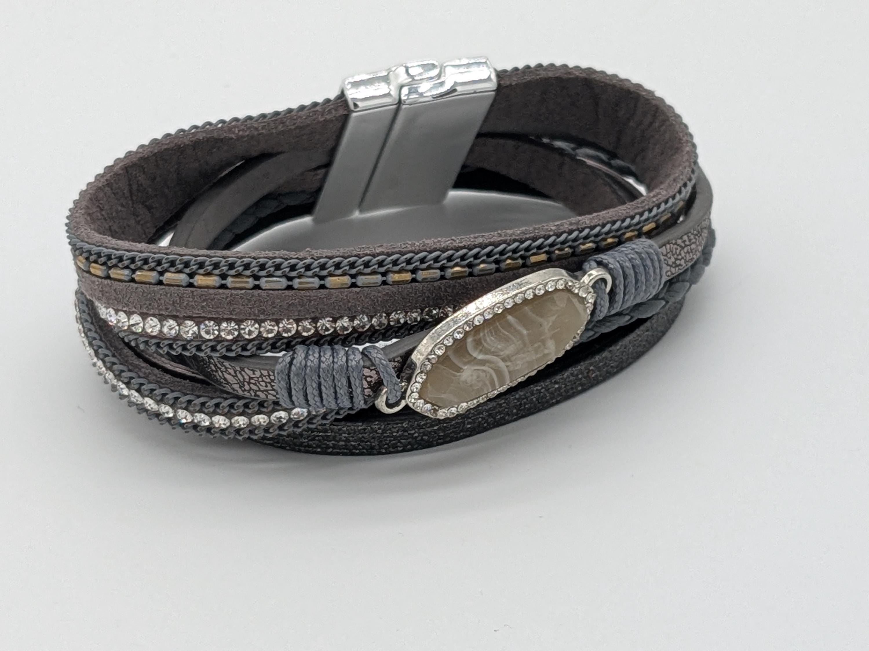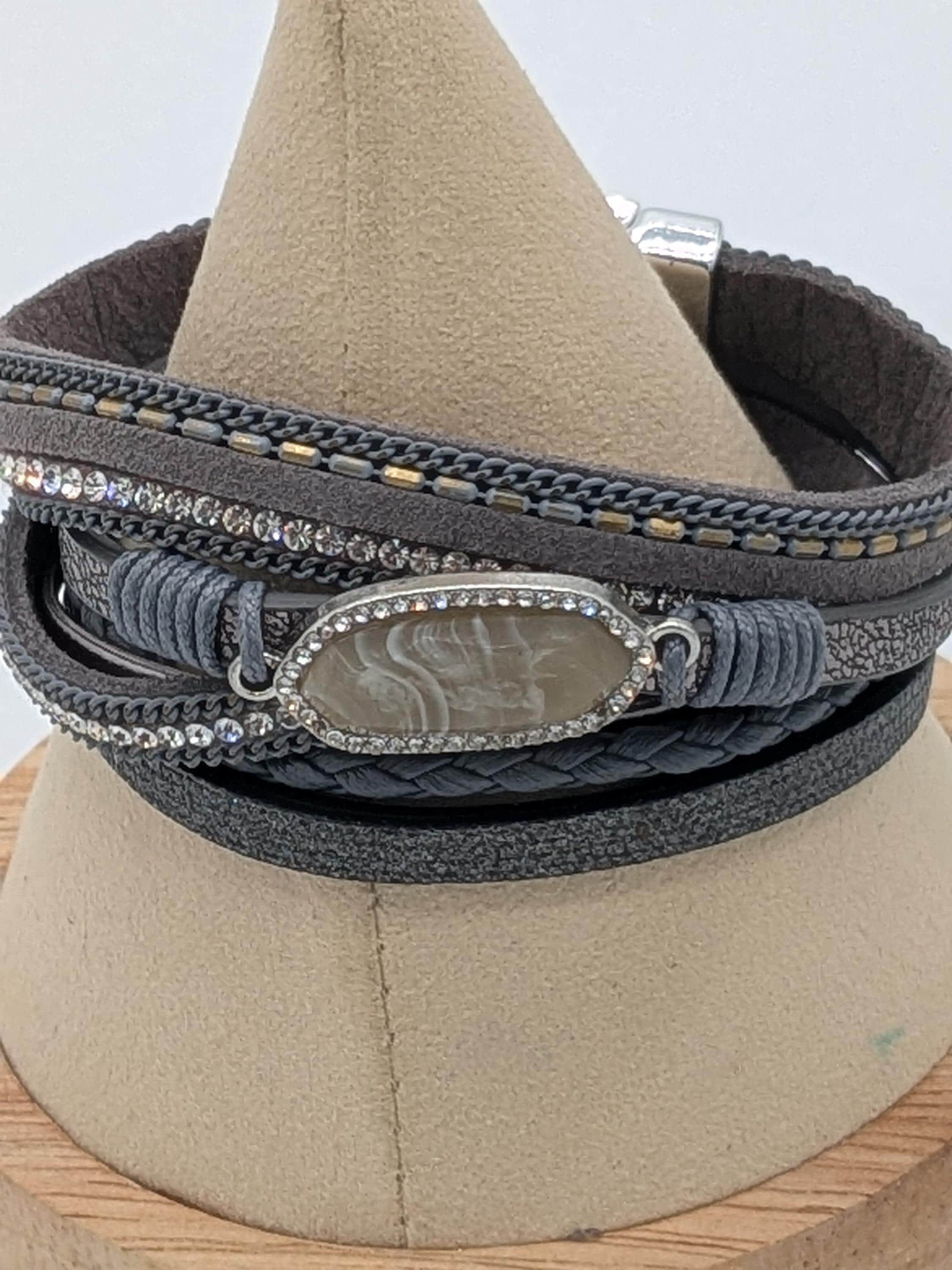 Chic and versatile, this gray faux leather wrap bracelet features multiple textured strands accented with sparkling crystals and a marble-style centerpiece. Designed with a secure magnetic clasp, it’s the perfect mix of casual edge and refined elegance.