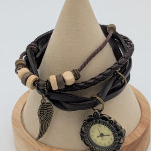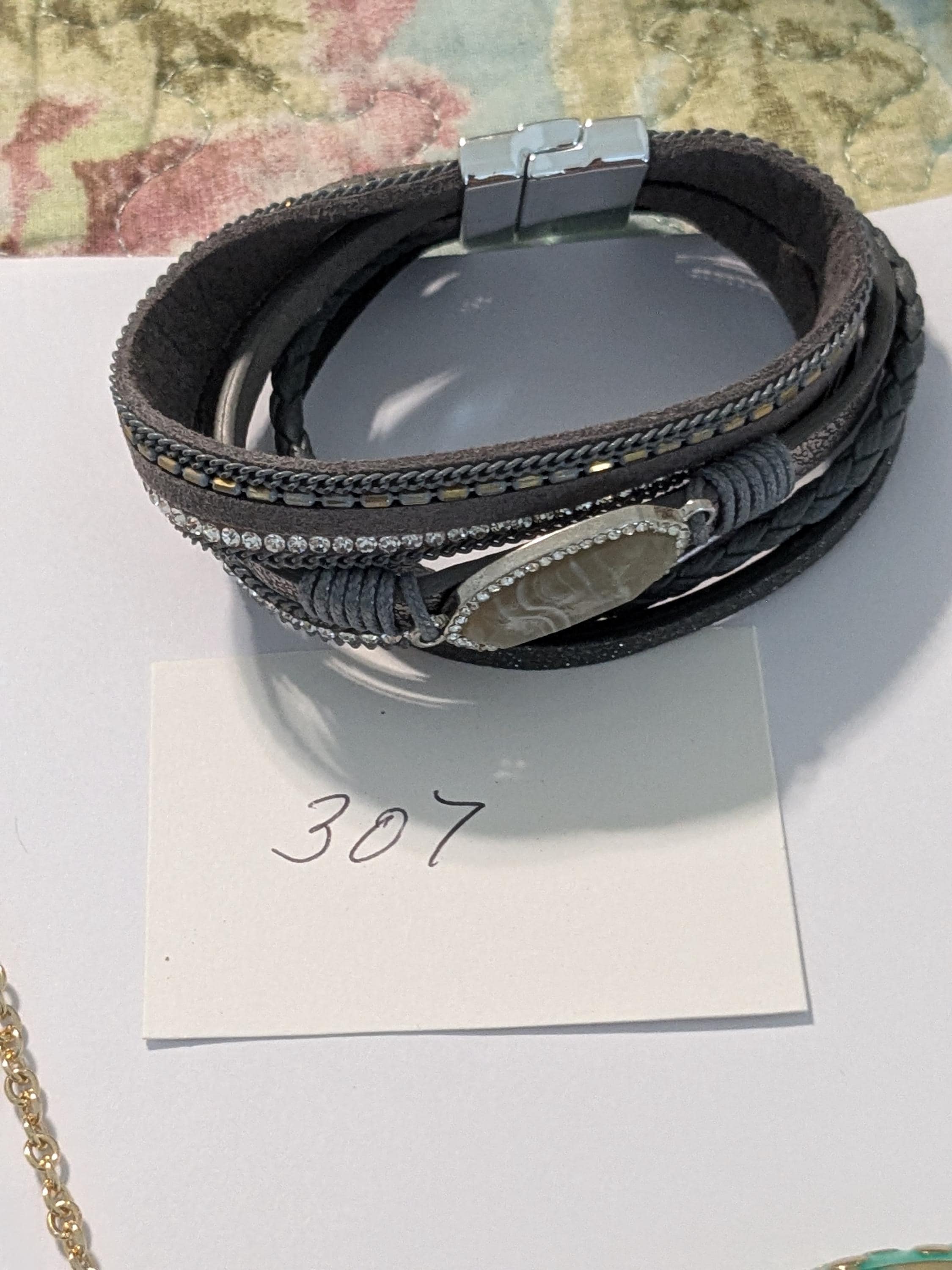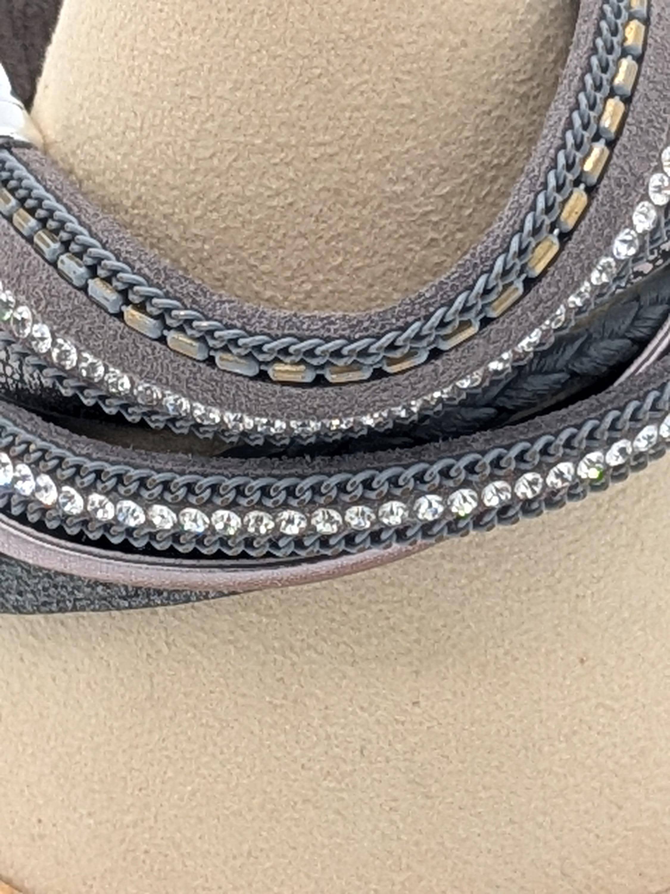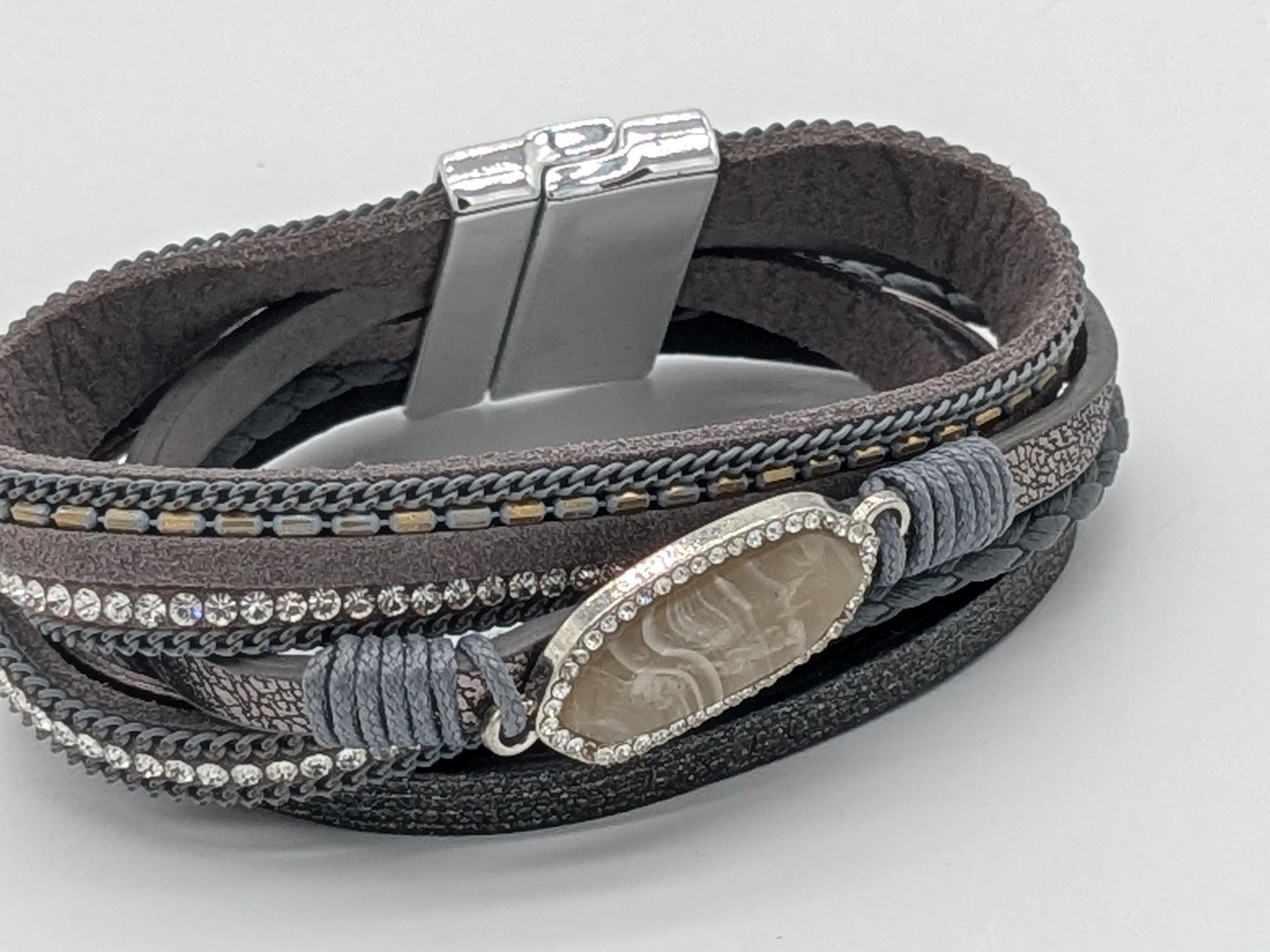 Chic and versatile, this gray faux leather wrap bracelet features multiple textured strands accented with sparkling crystals and a marble-style centerpiece. Designed with a secure magnetic clasp, it’s the perfect mix of casual edge and refined elegance.