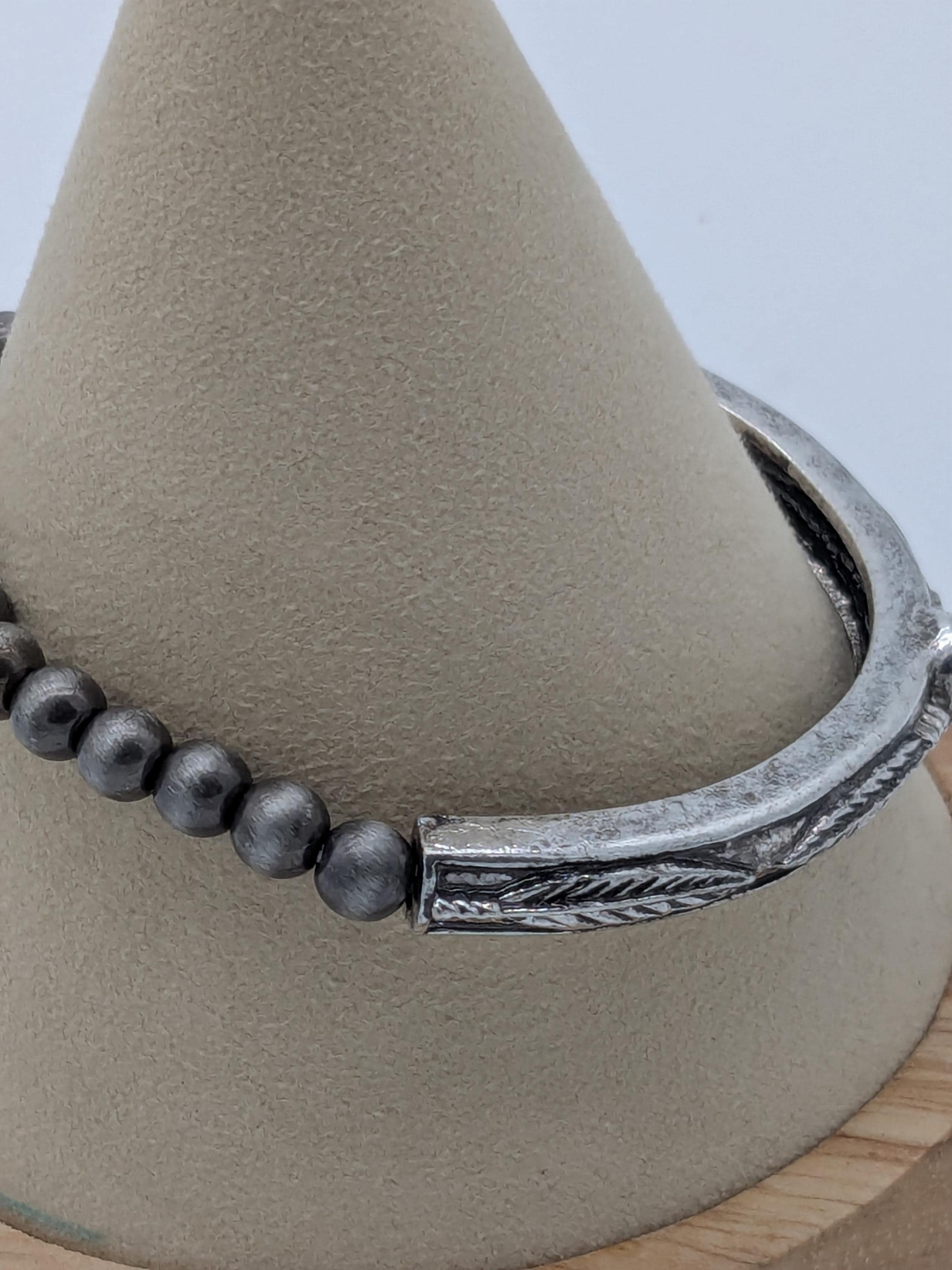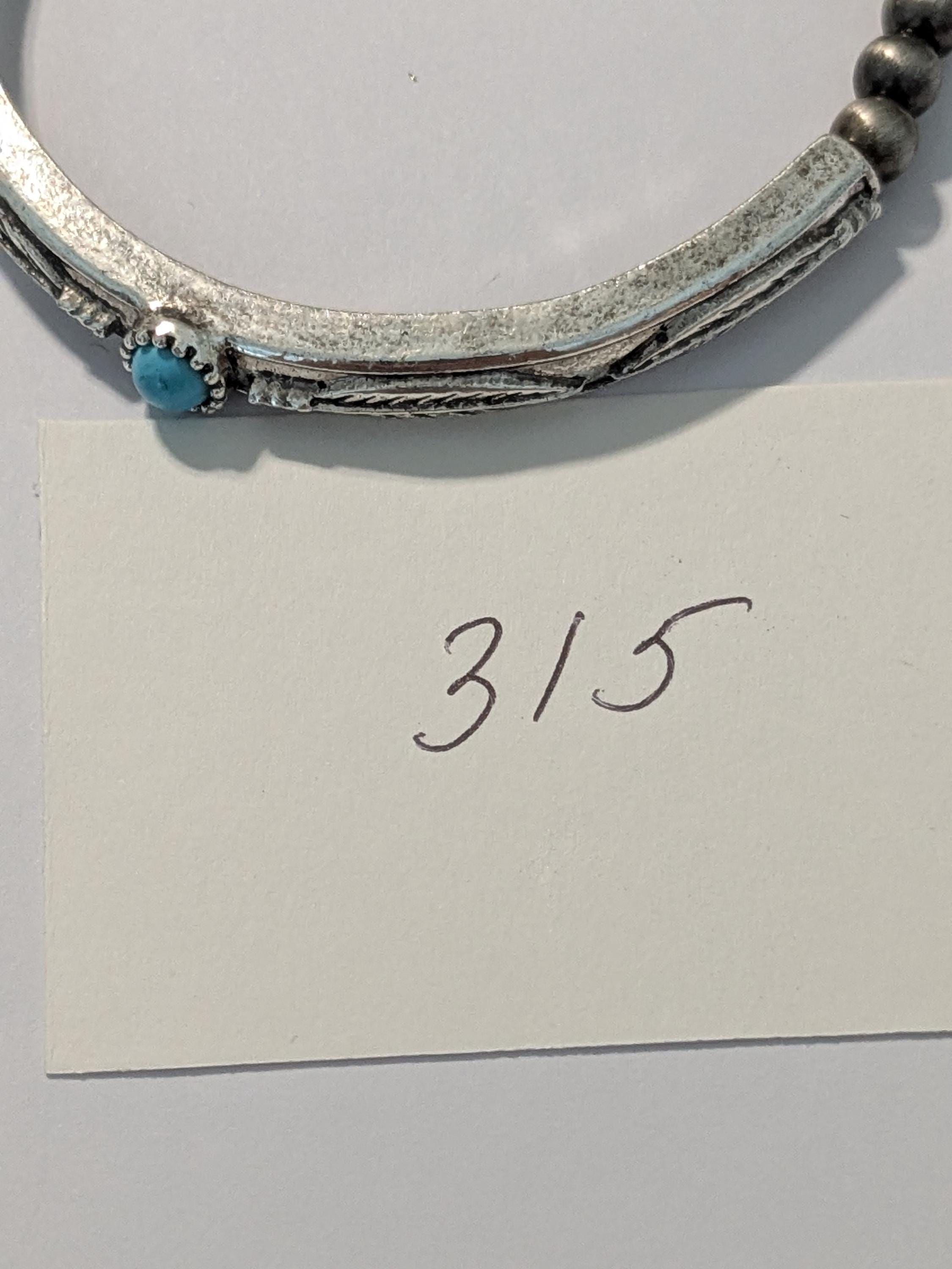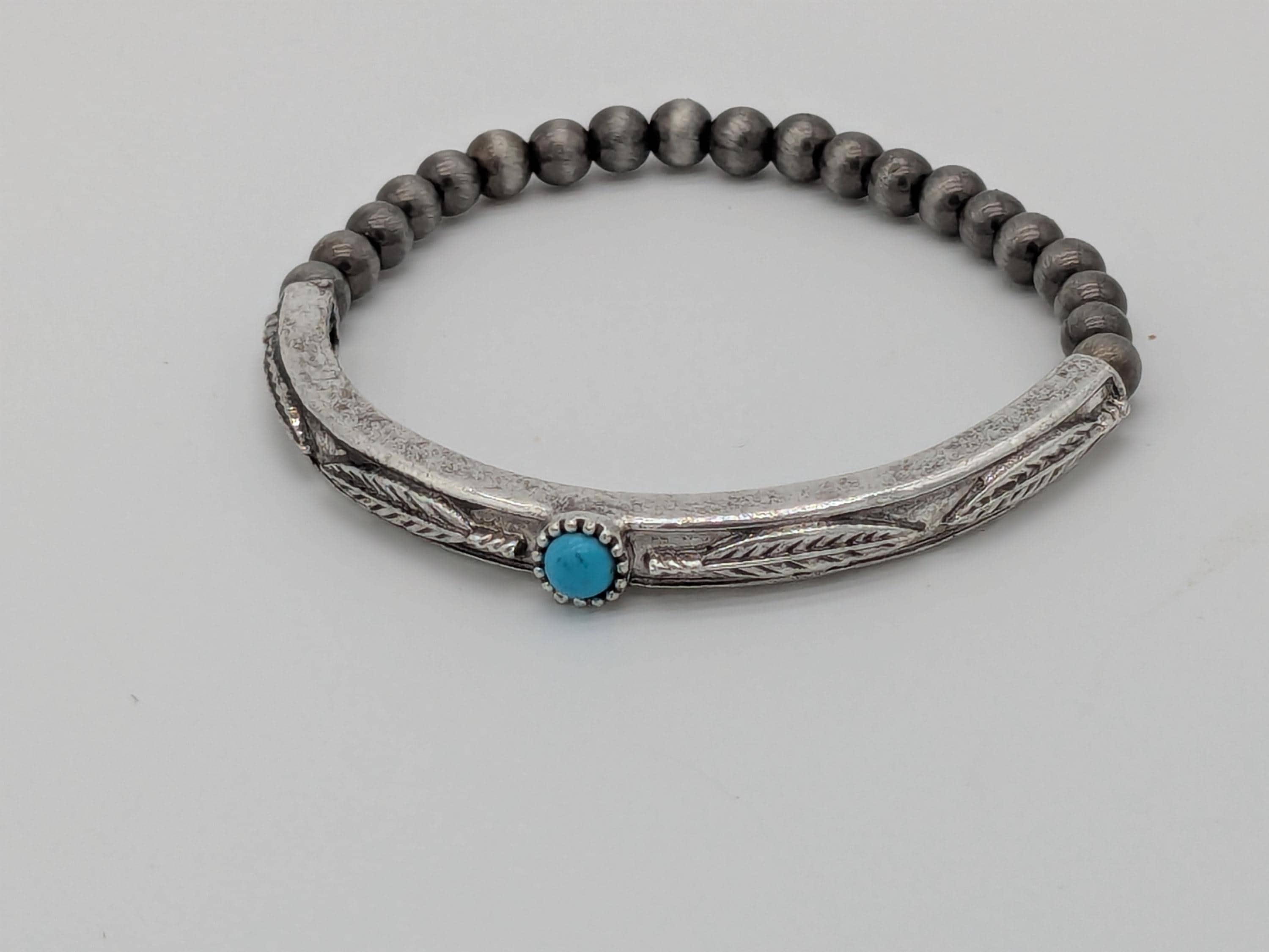 This bohemian-inspired bracelet features dark metallic beads with an engraved curved bar and a single turquoise accent. Stretch design for an easy fit, perfect for everyday wear or layered with other bracelets for a stylish boho look.