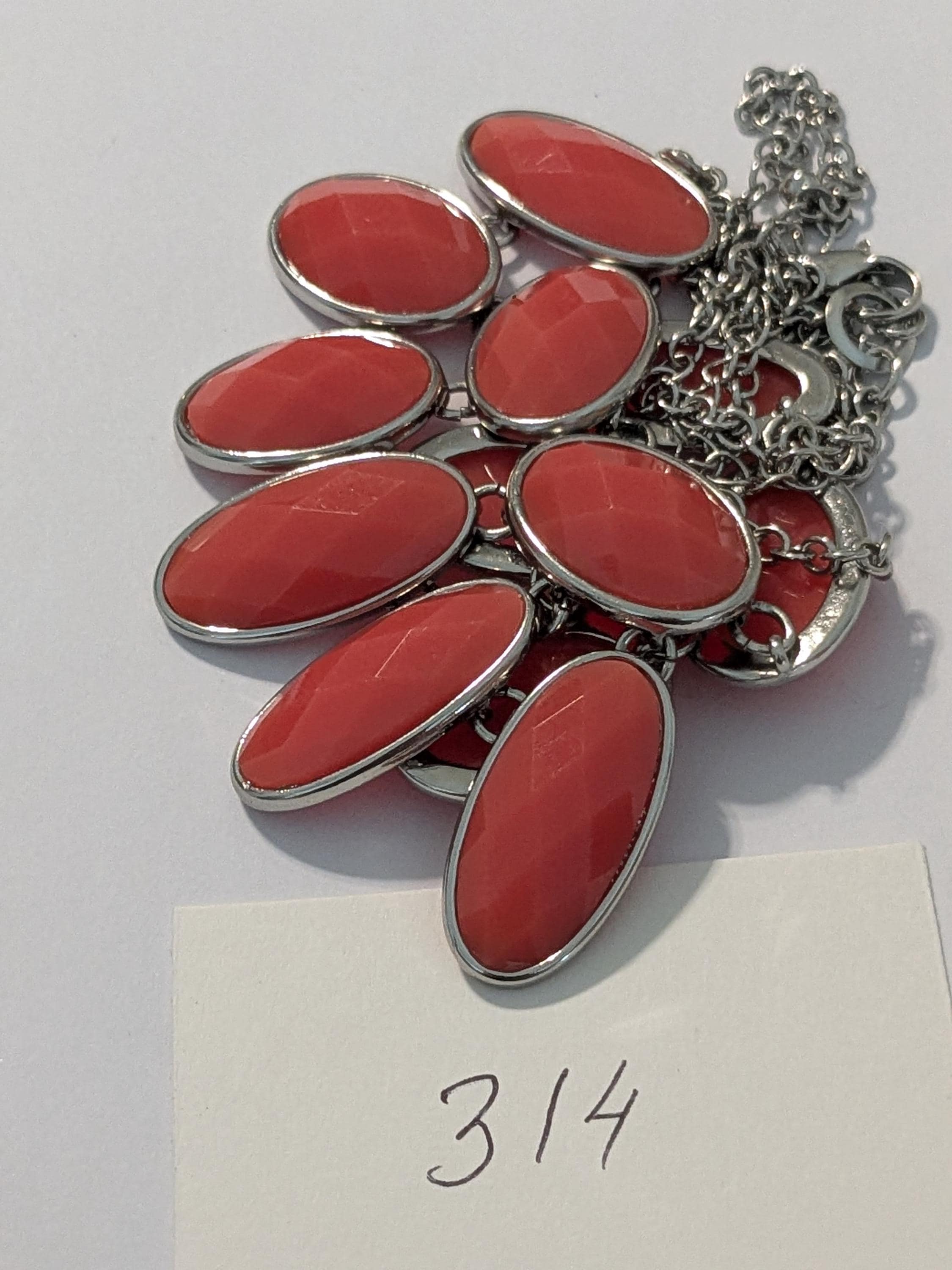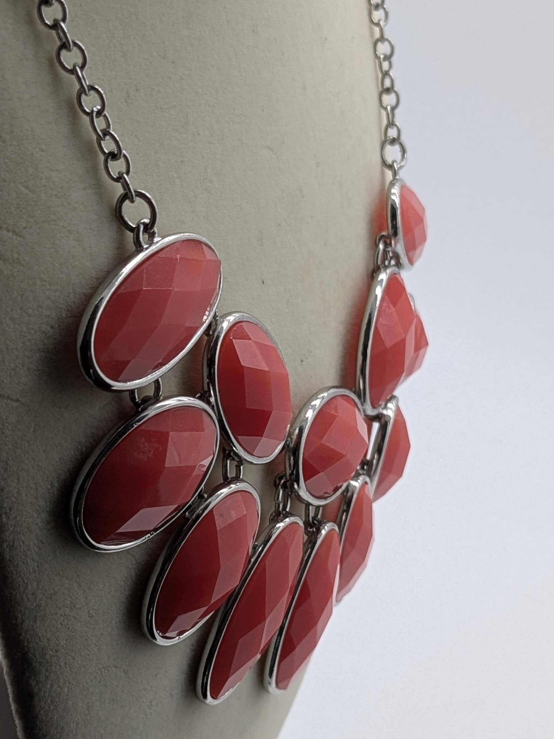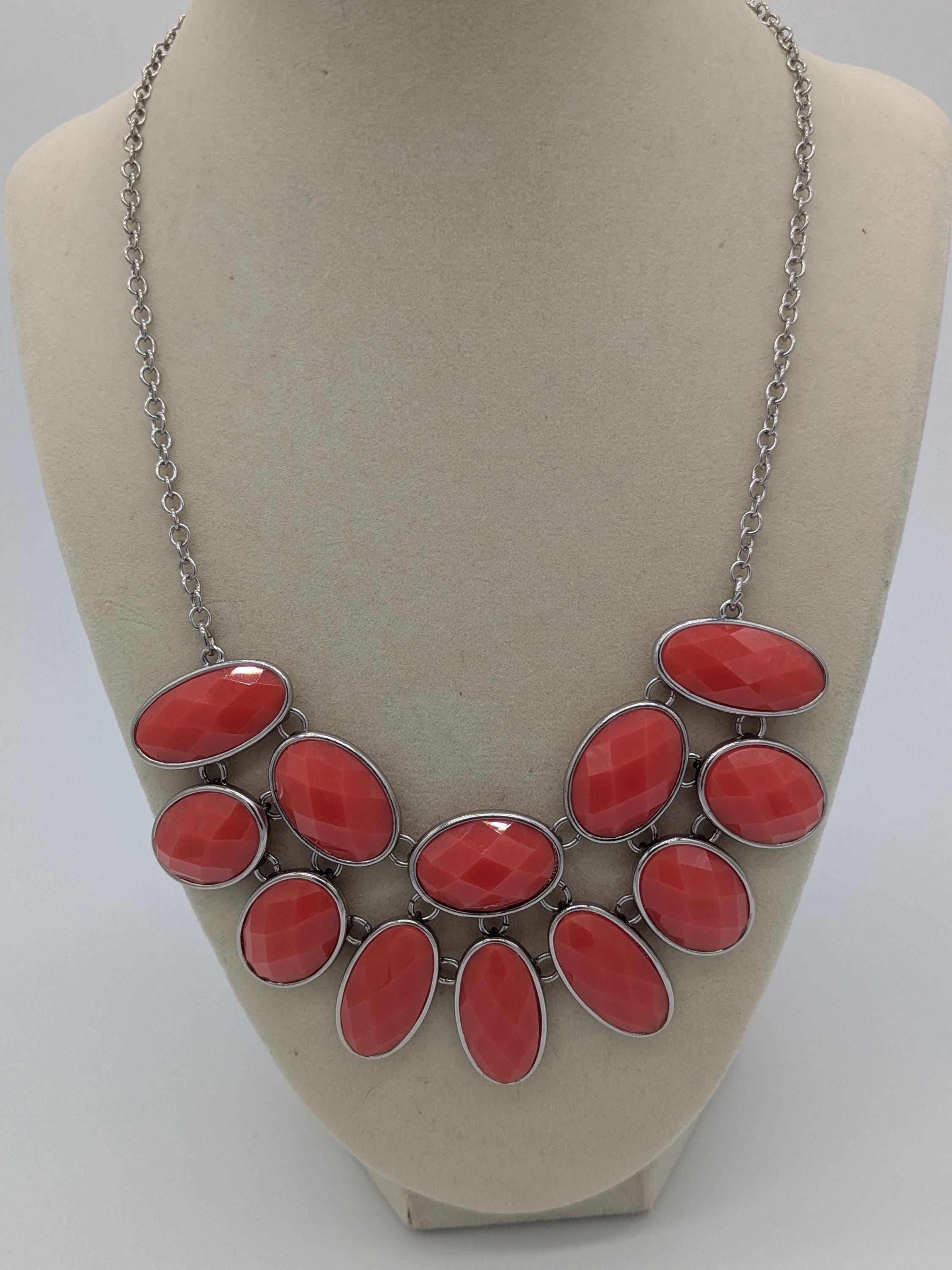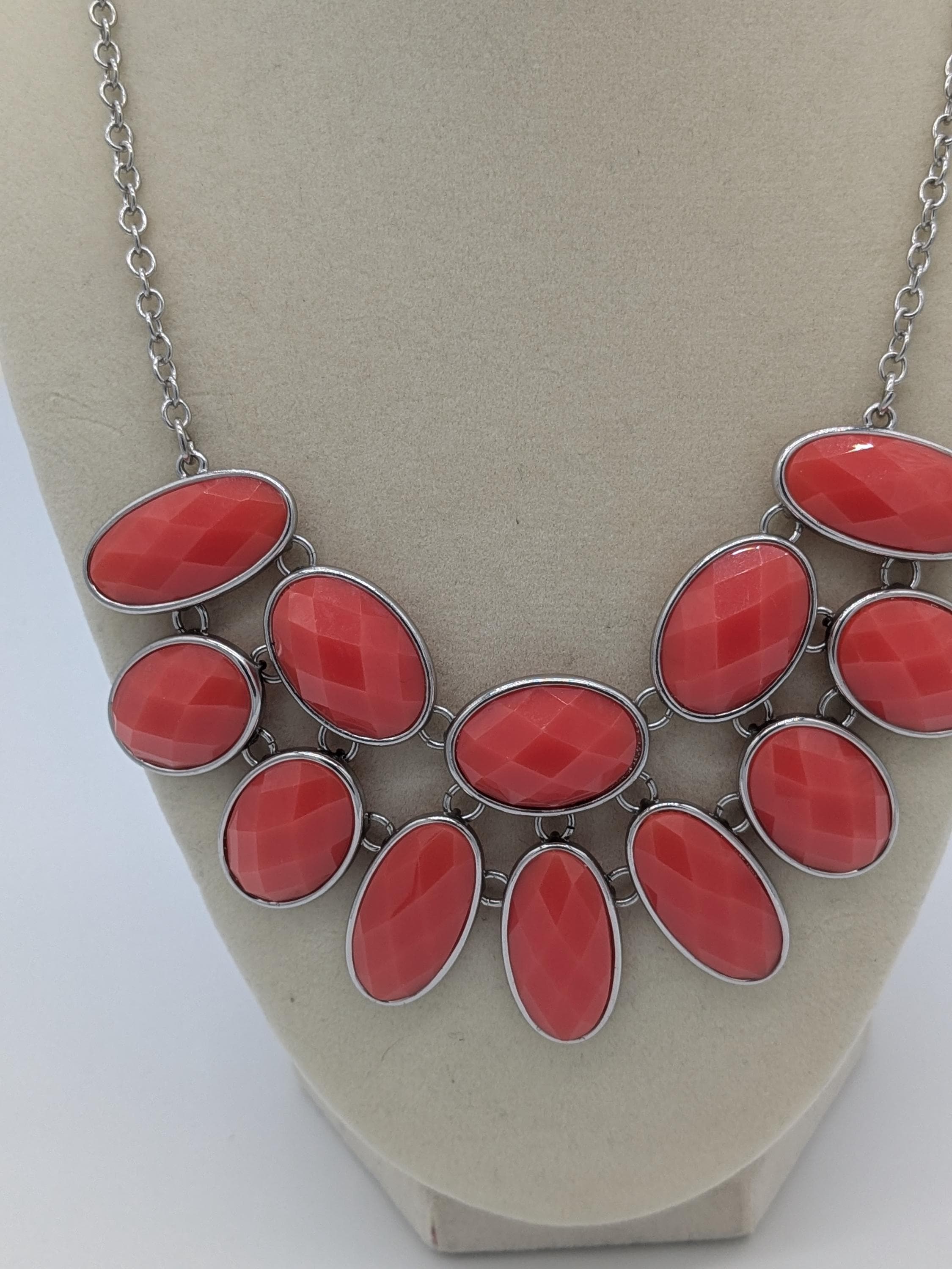 This striking coral bib necklace features faceted oval resin beads set in a tiered design. The vibrant coral hue adds a pop of color to any outfit, making it the perfect accessory for both casual and evening wear. Lightweight, eye-catching, and modern.