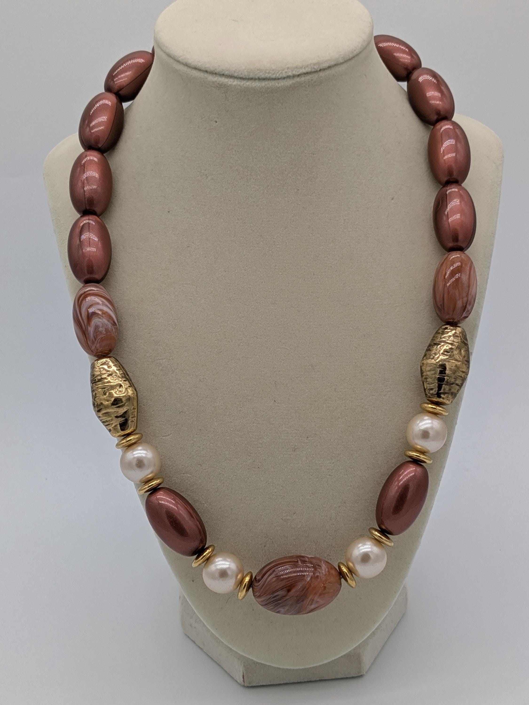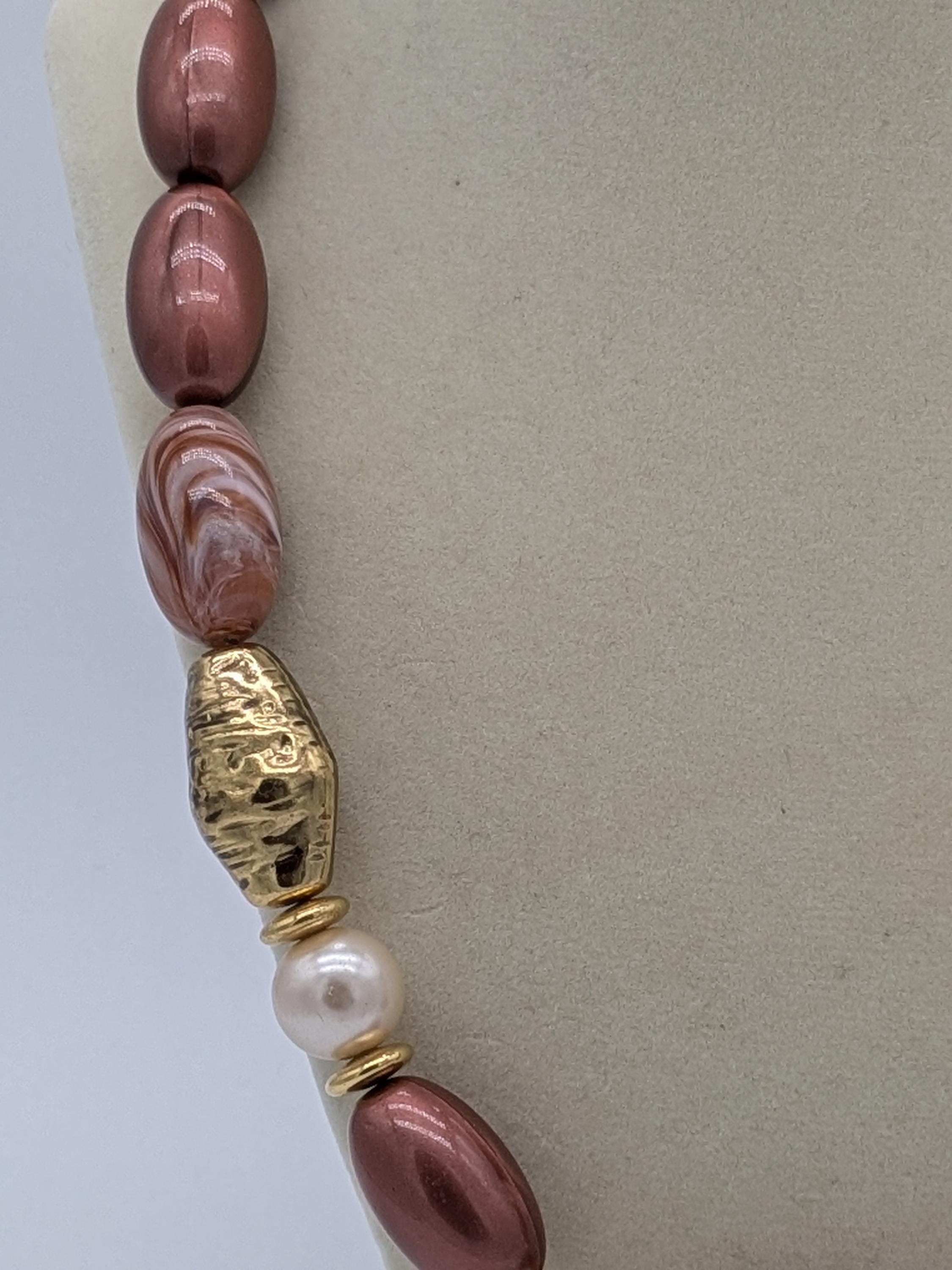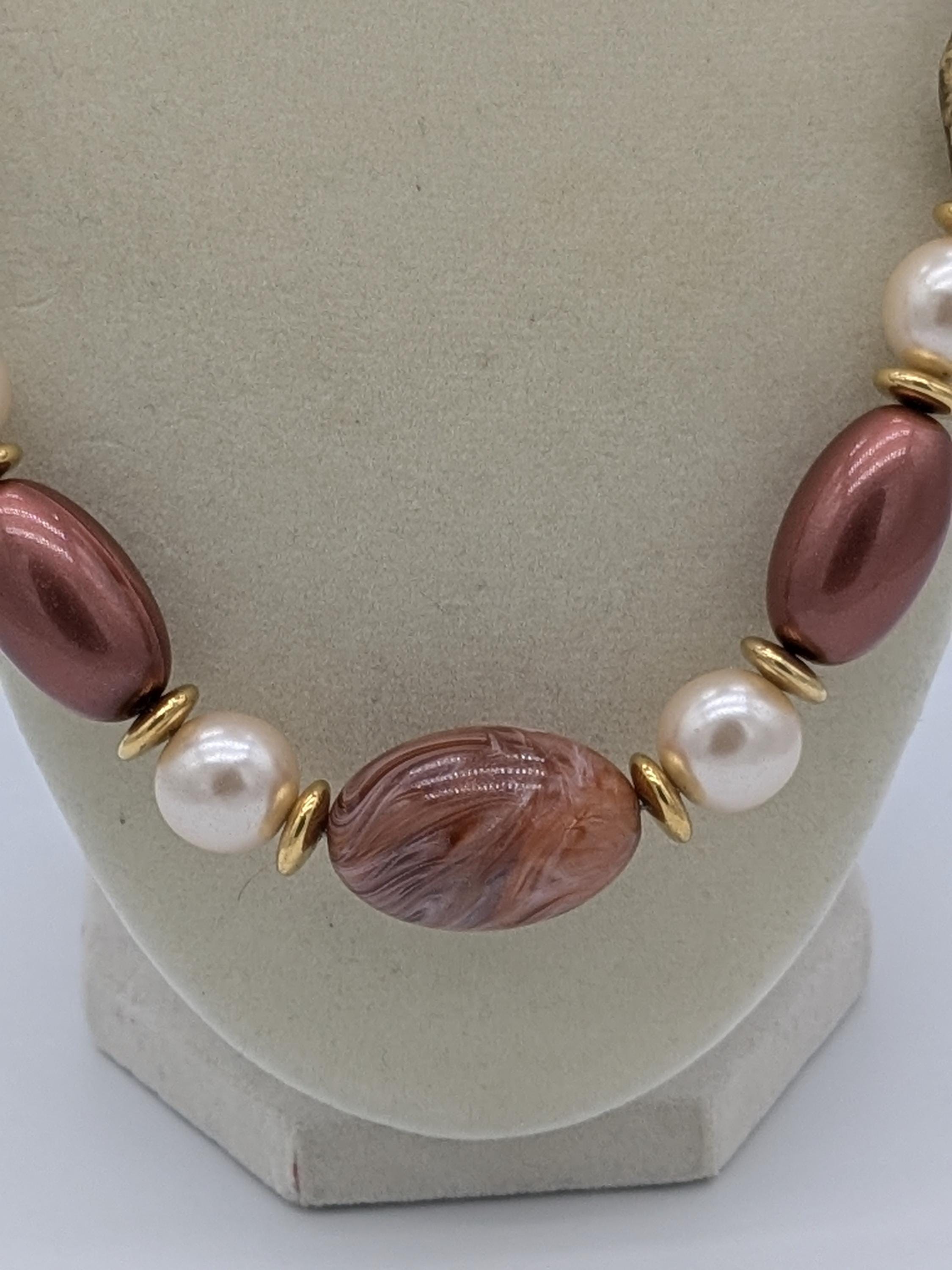 This elegant chunky necklace features a mix of marbled brown, pearl-like, and textured accent beads for a bold vintage-inspired look. The warm earthy tones and smooth glossy finish make it a standout statement piece for both casual and dressy outfits.