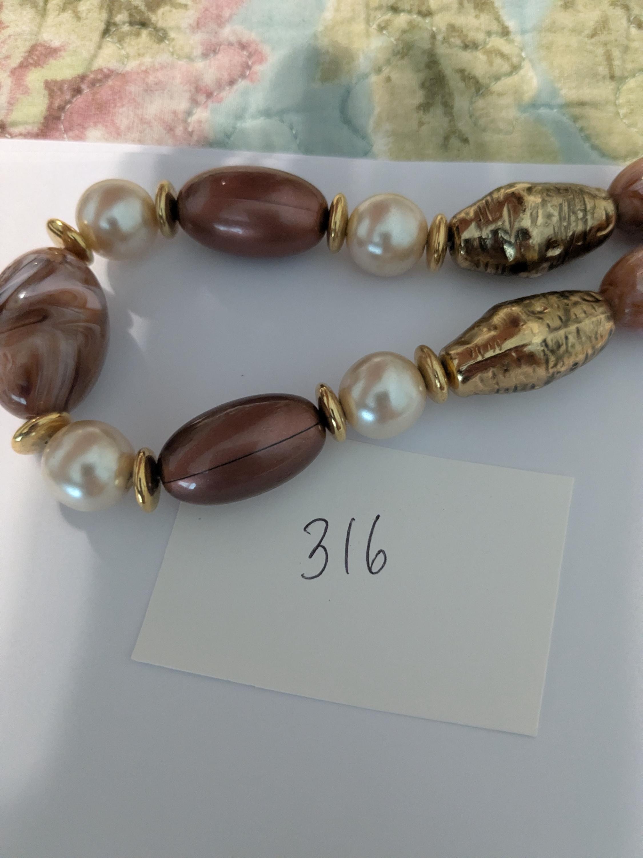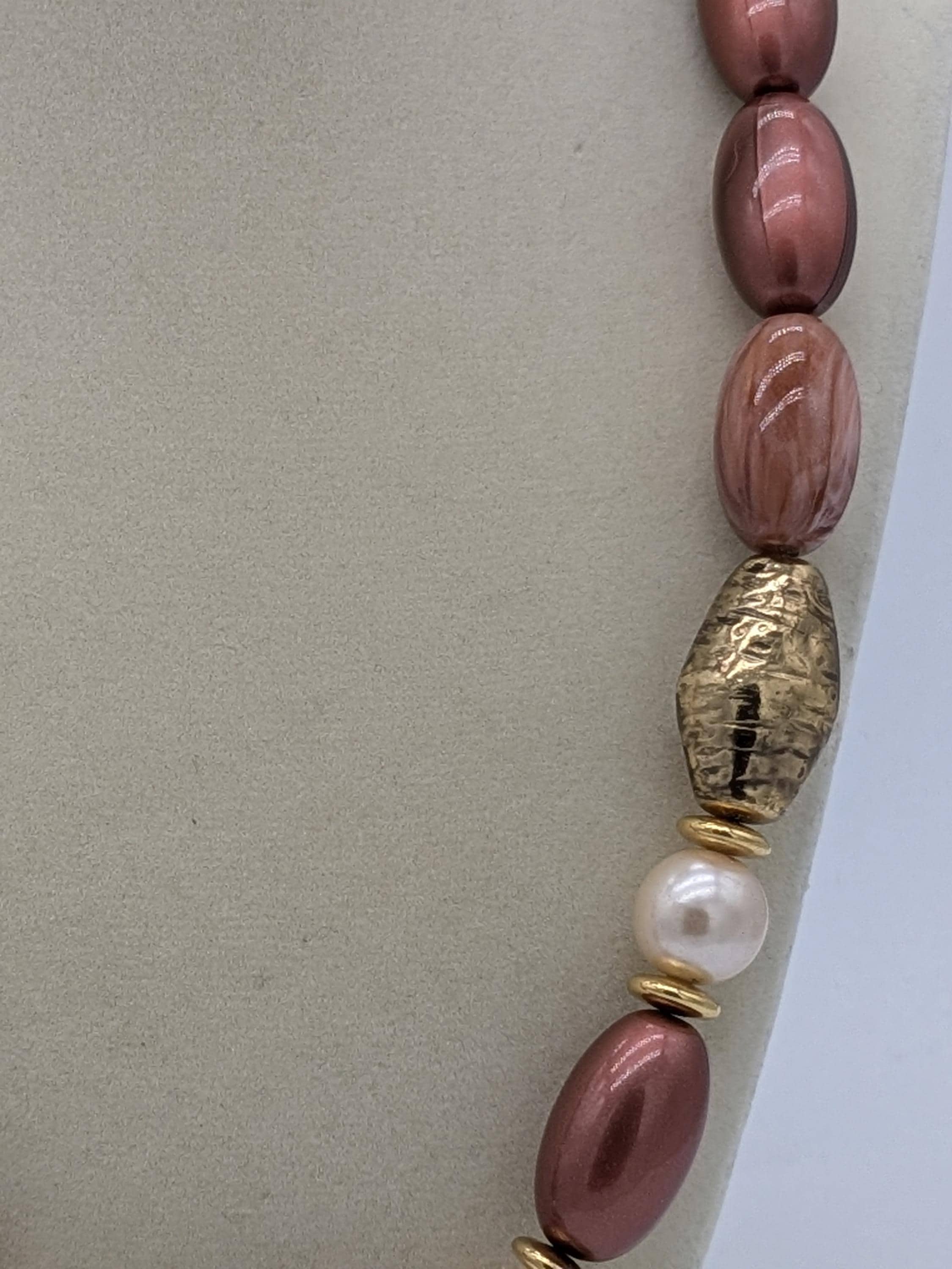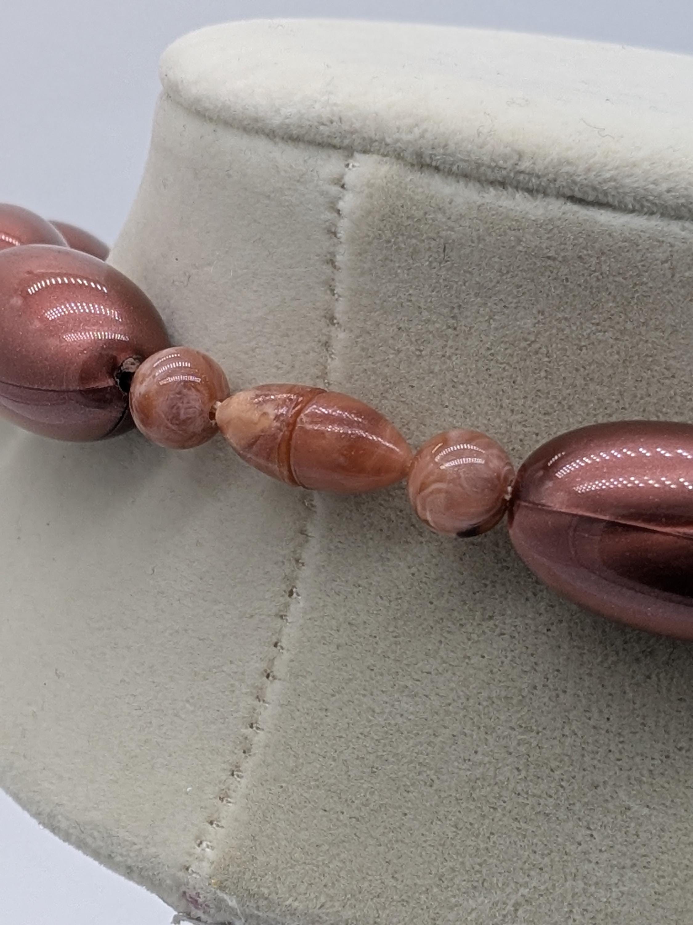 This elegant chunky necklace features a mix of marbled brown, pearl-like, and textured accent beads for a bold vintage-inspired look. The warm earthy tones and smooth glossy finish make it a standout statement piece for both casual and dressy outfits.