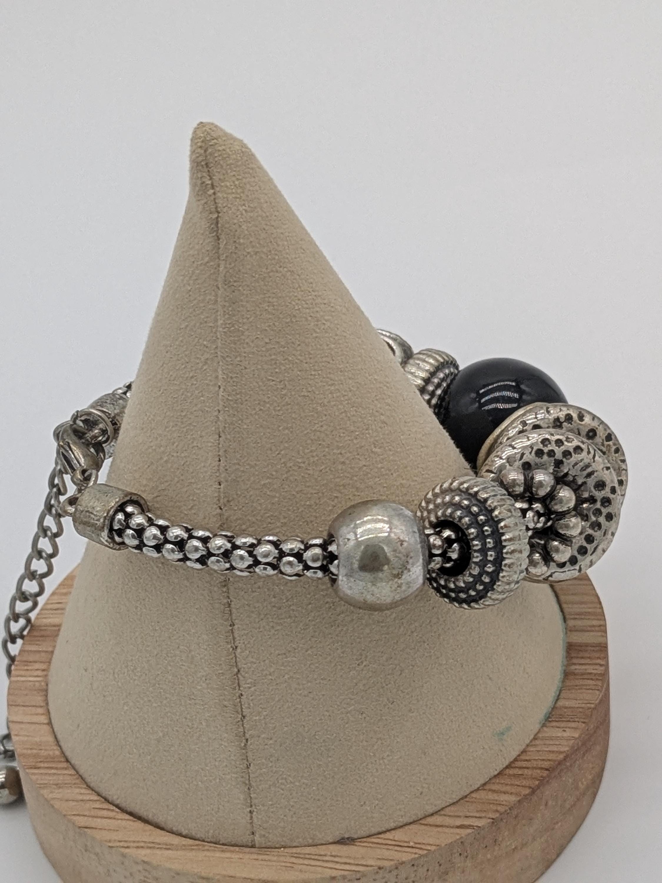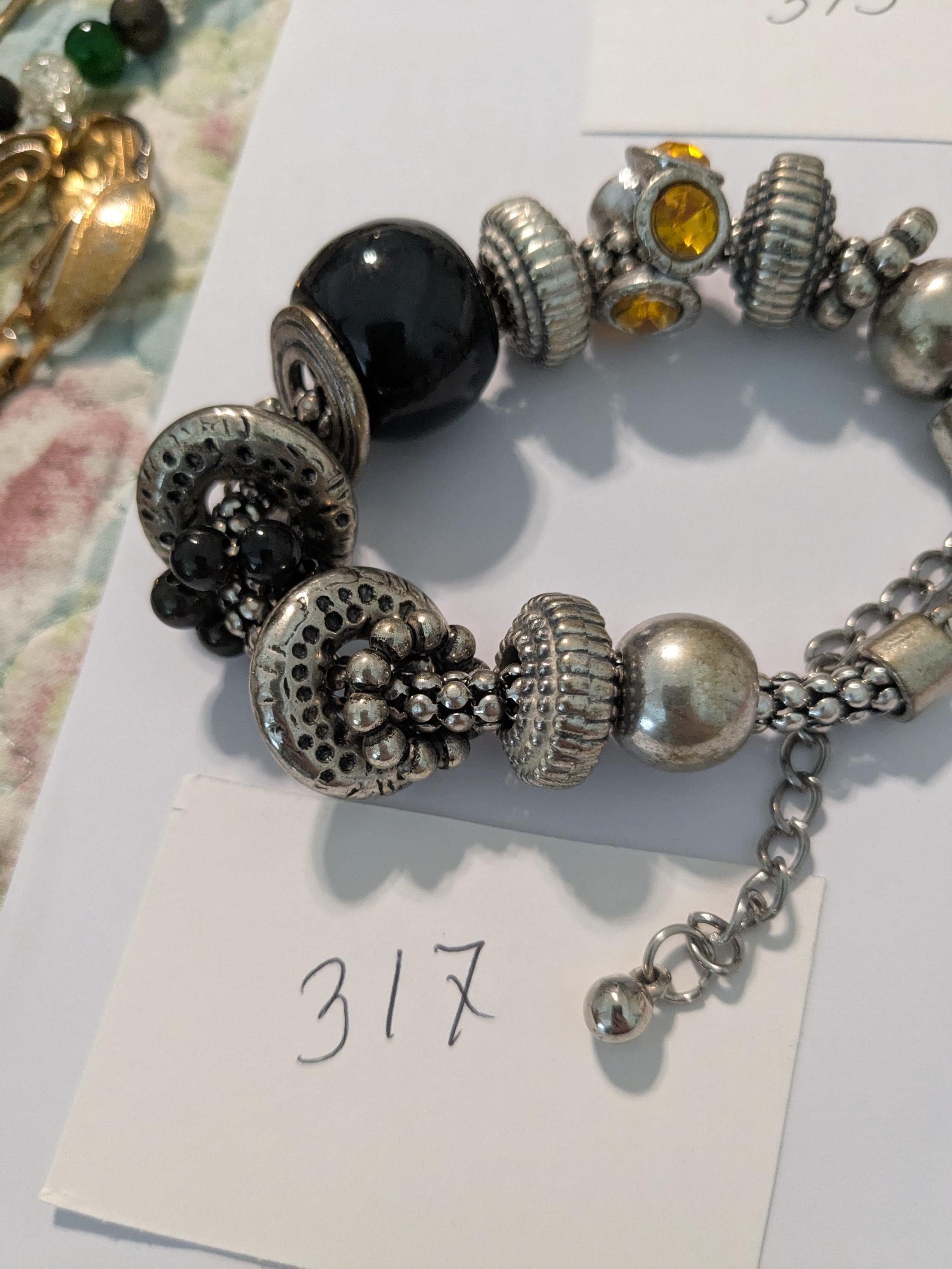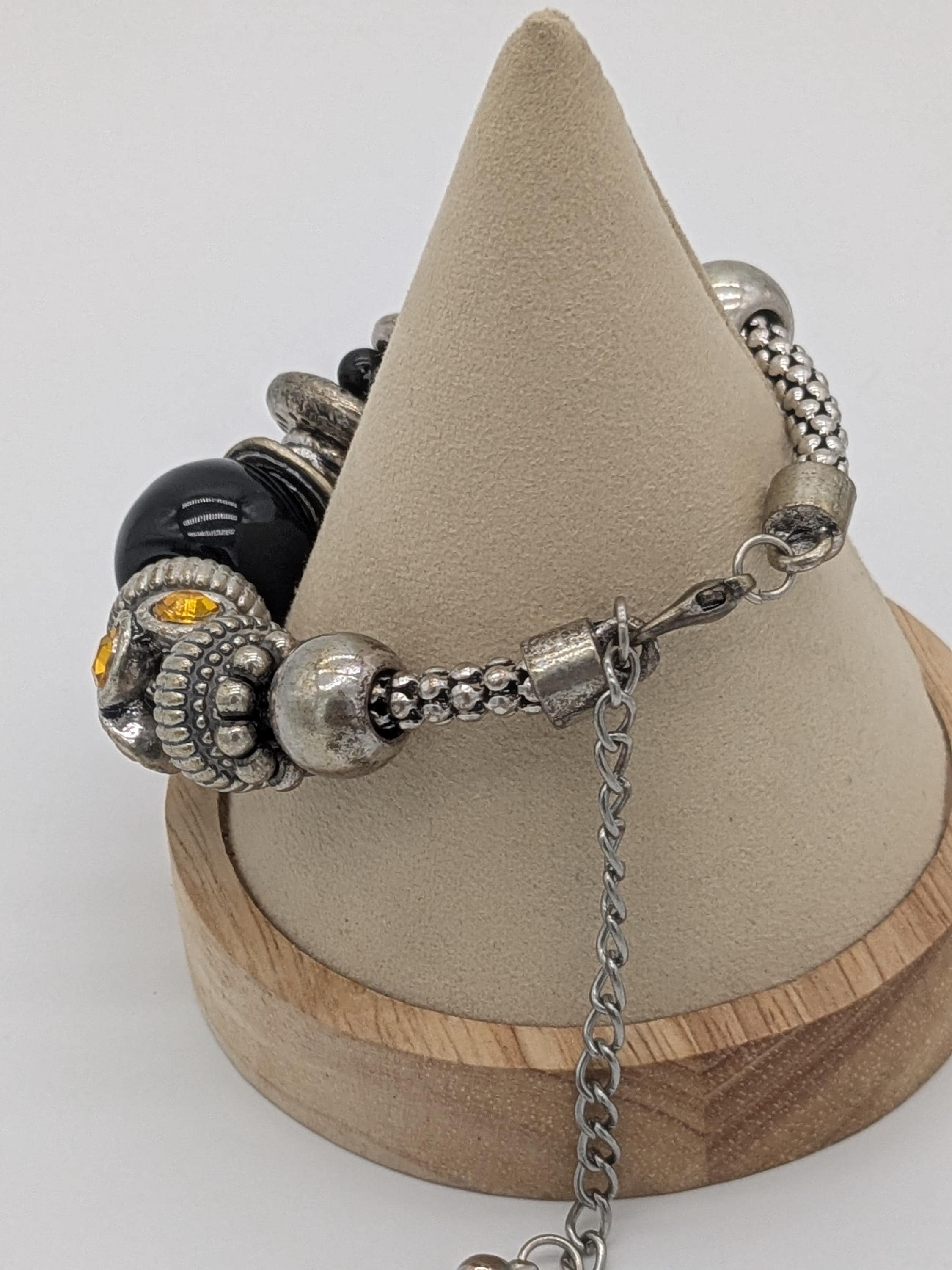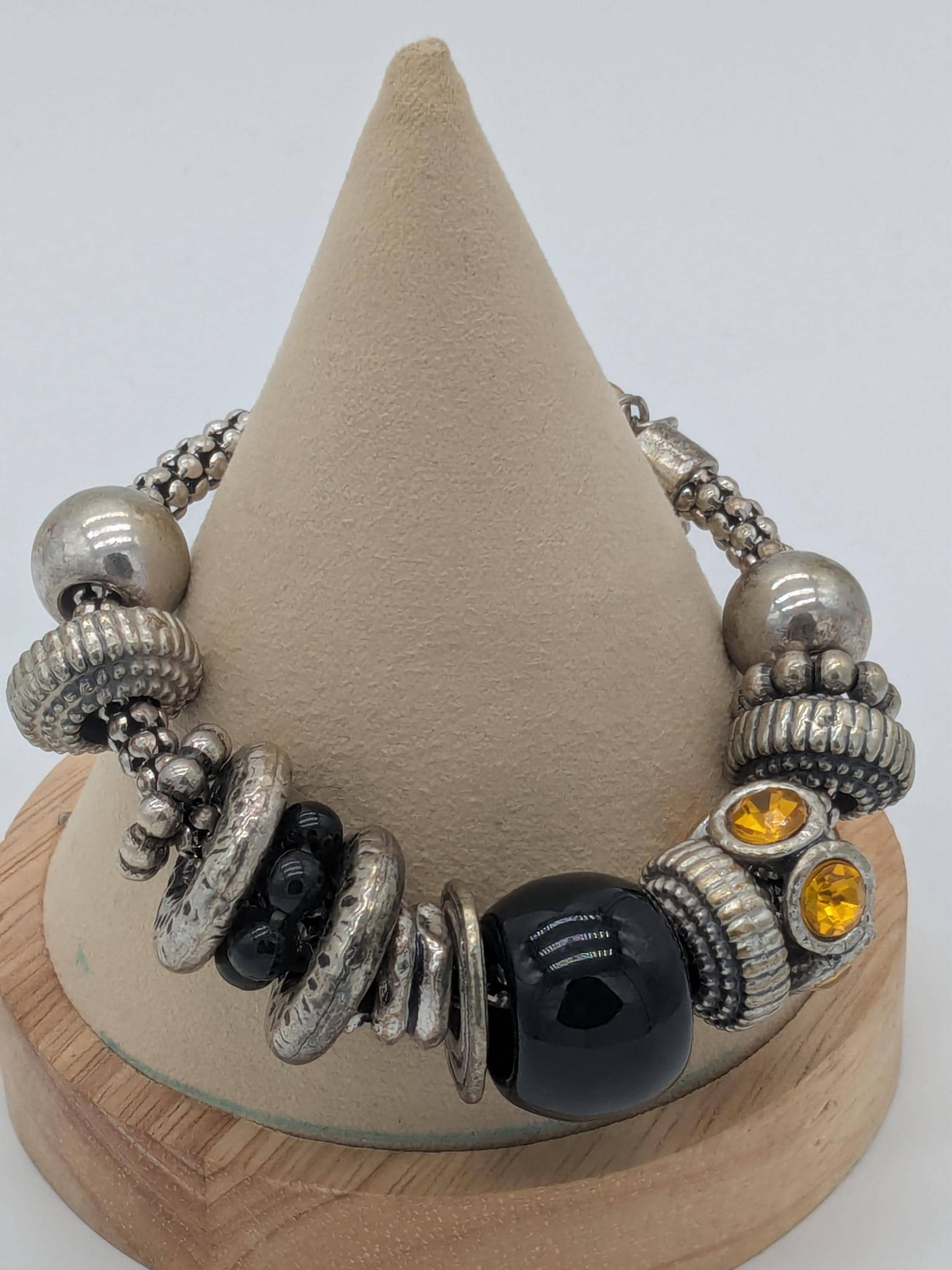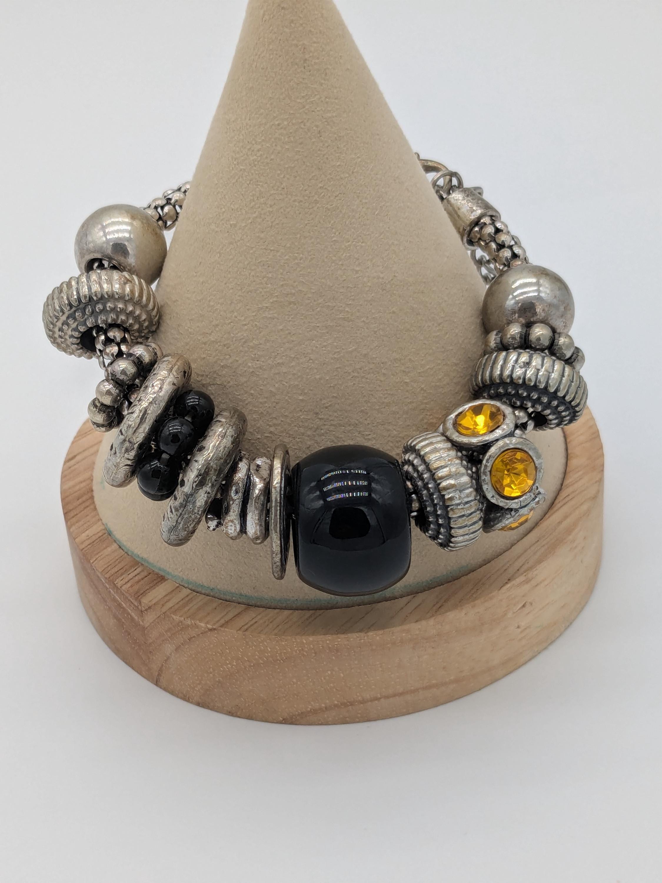Bold and eye-catching, this chunky beaded bracelet features a mix of textured metal beads, glossy black accents, and yellow decorative crystals. Perfect for making a statement, this bracelet combines artistic detail with a modern boho edge — ideal for casual or dressy looks.