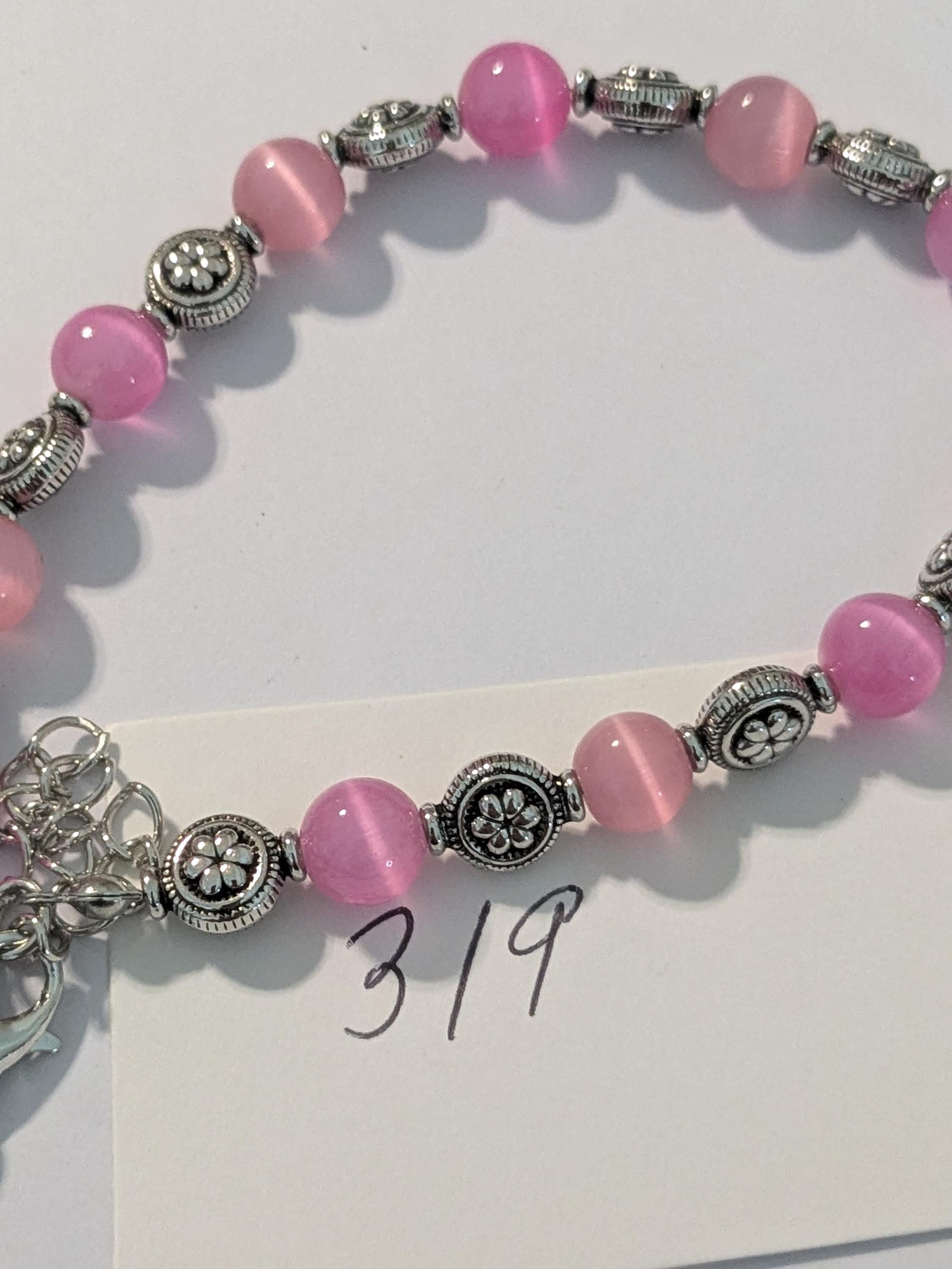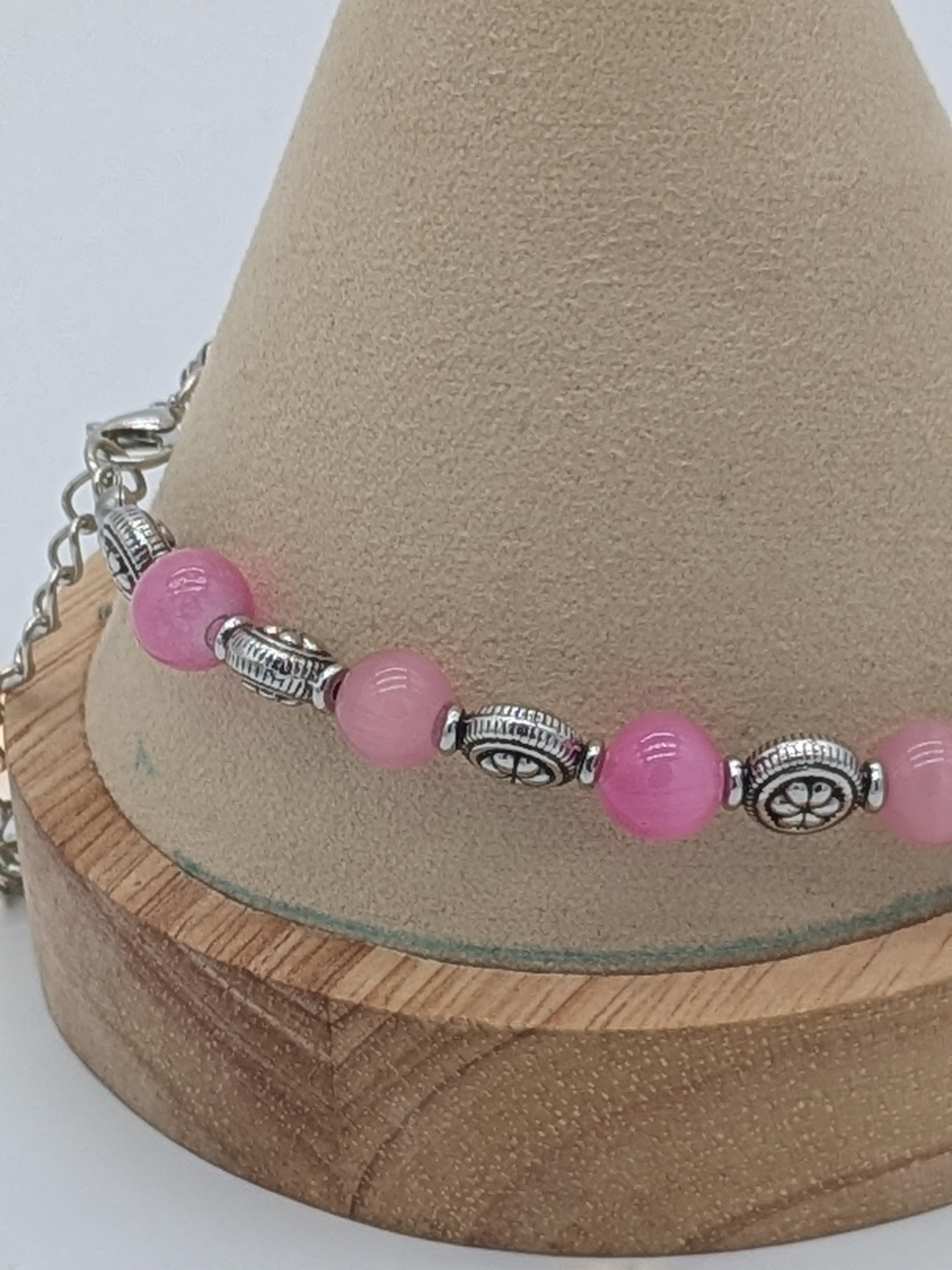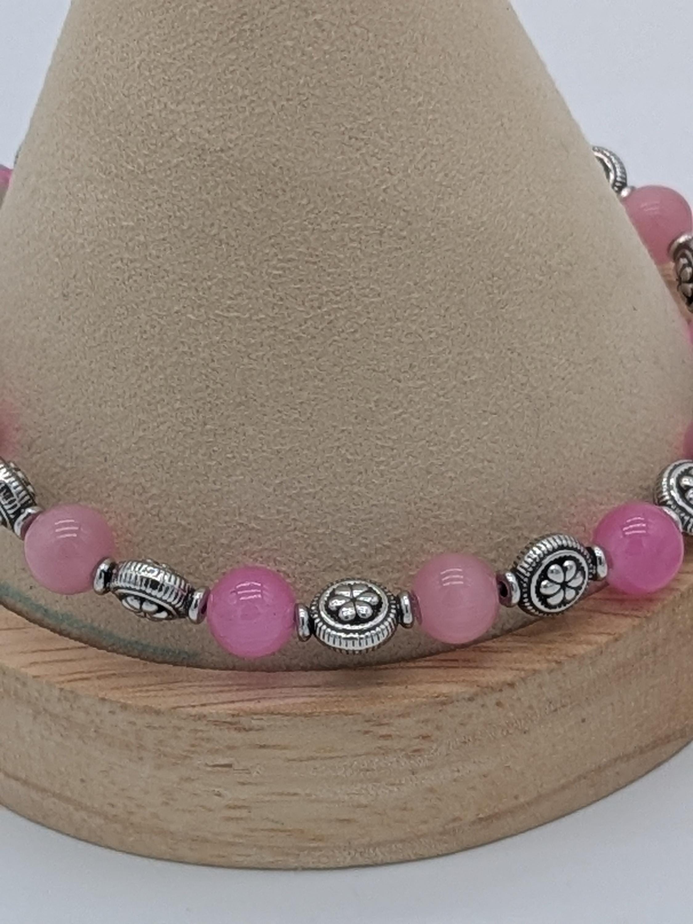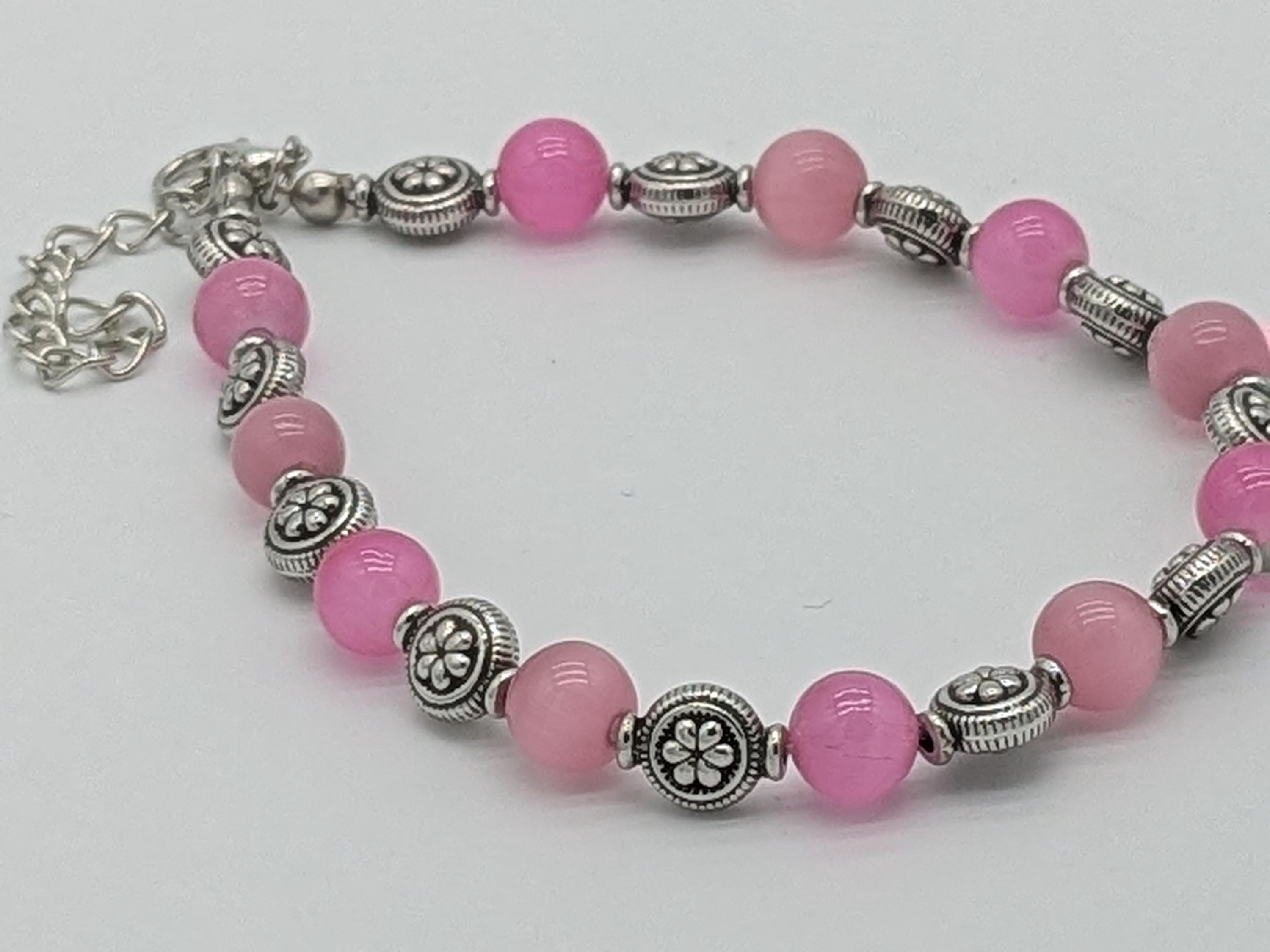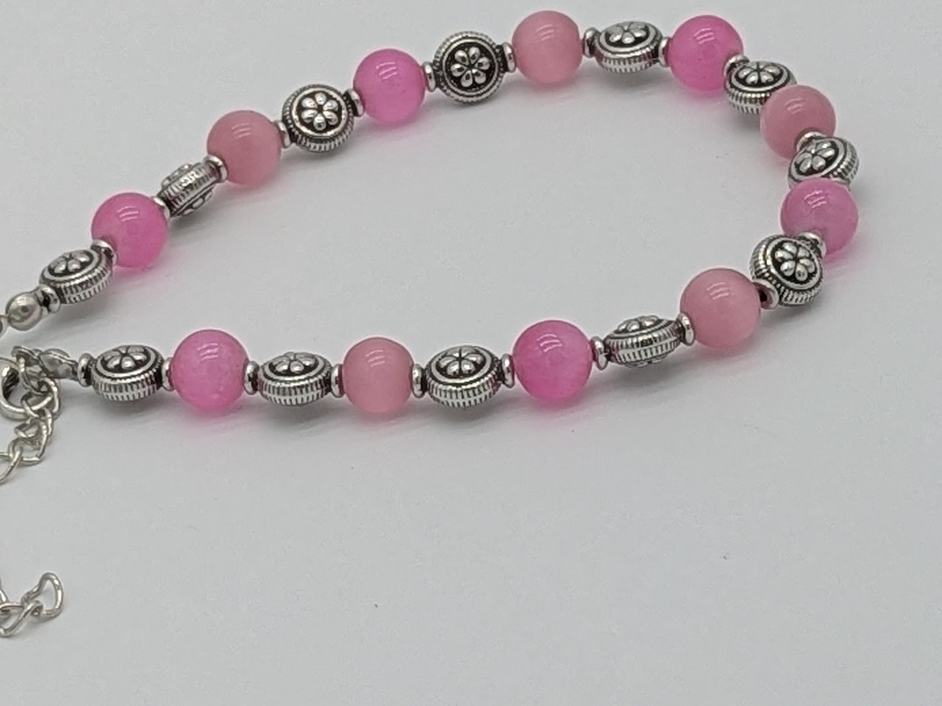A charming bracelet featuring soft pink round beads paired with ornate metallic accents. The simple yet elegant design makes it perfect for everyday wear or as a thoughtful gift. Adjustable for a comfortable fit and versatile for layering with other bracelets.