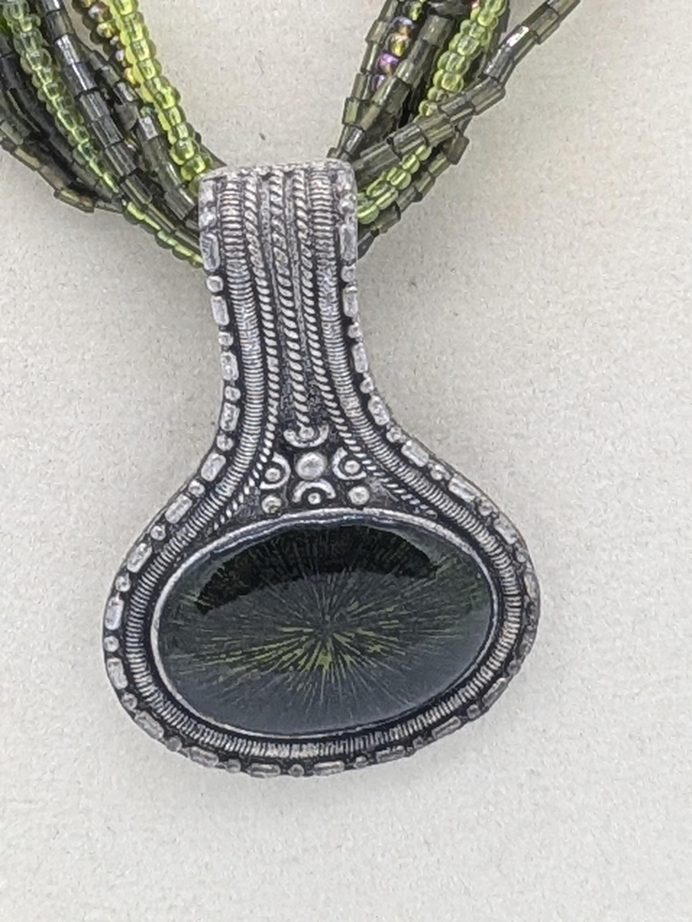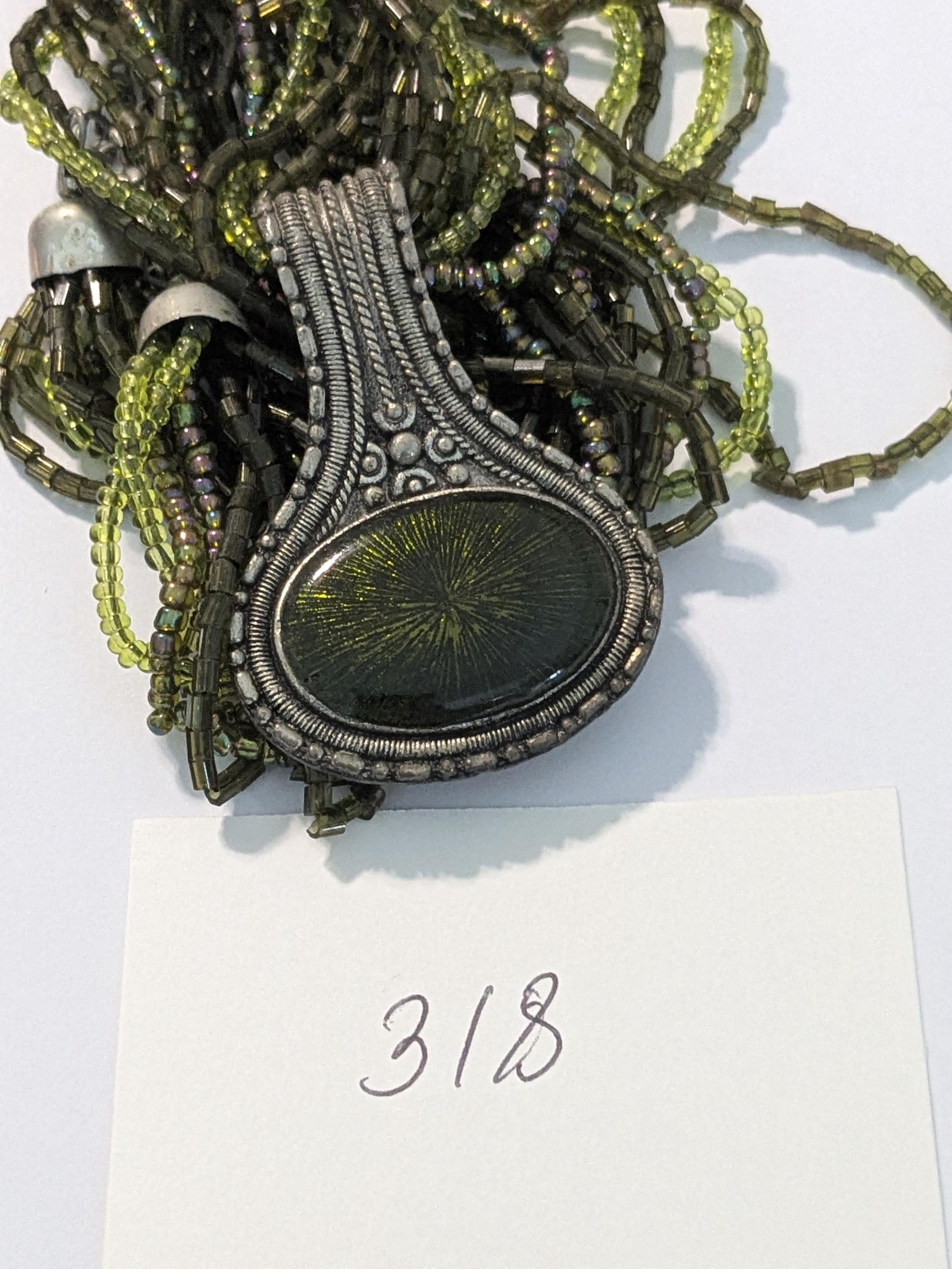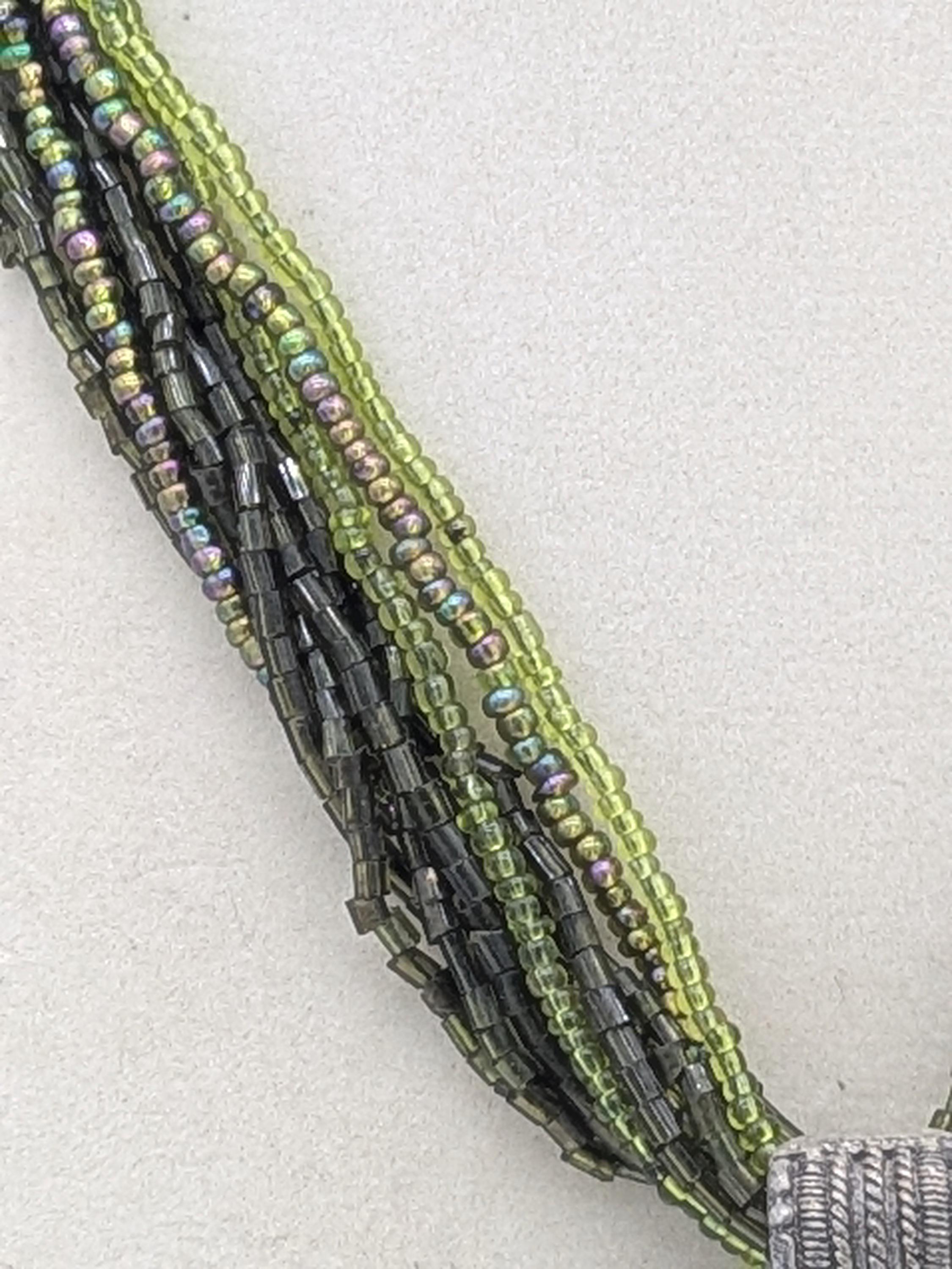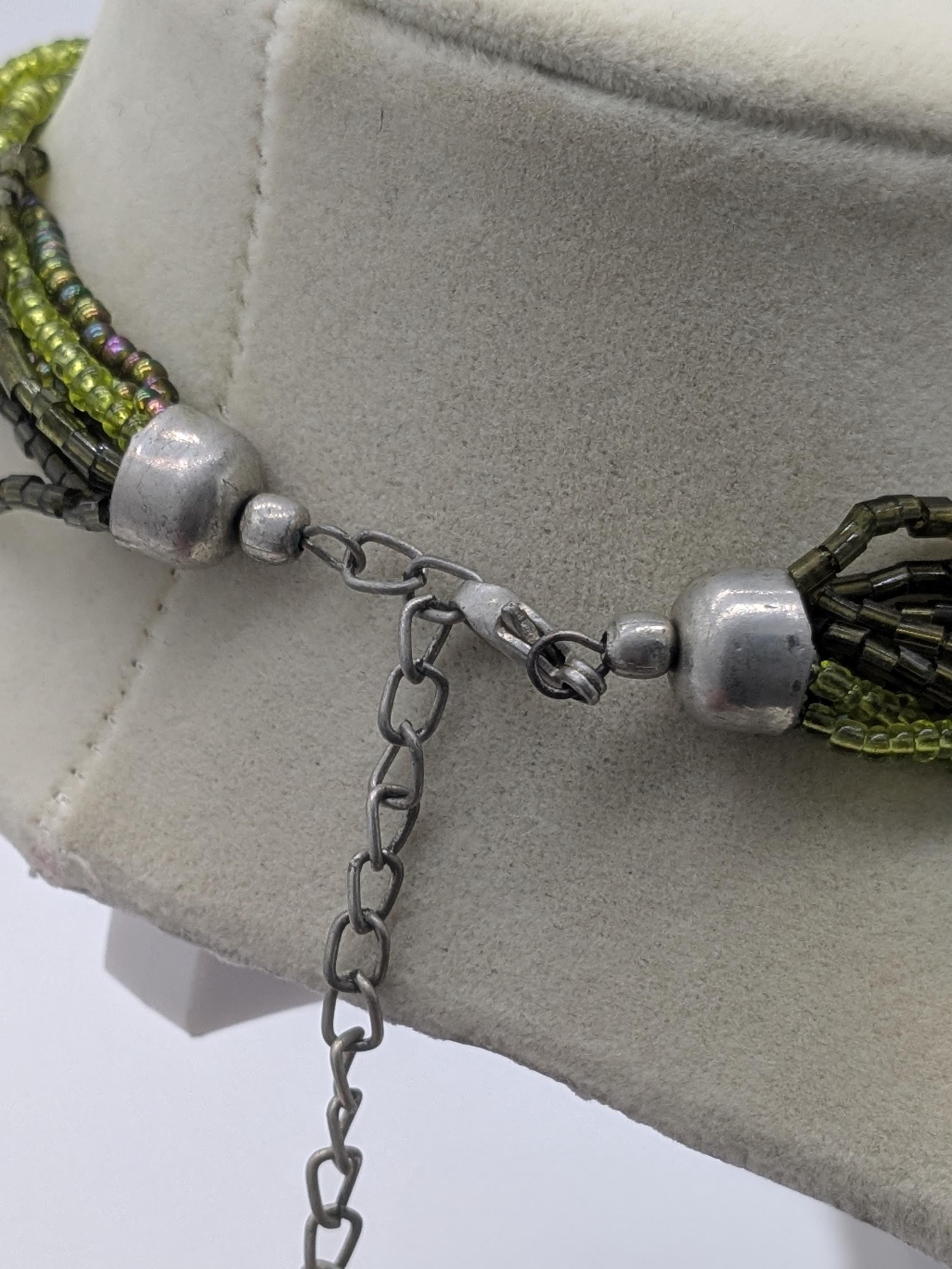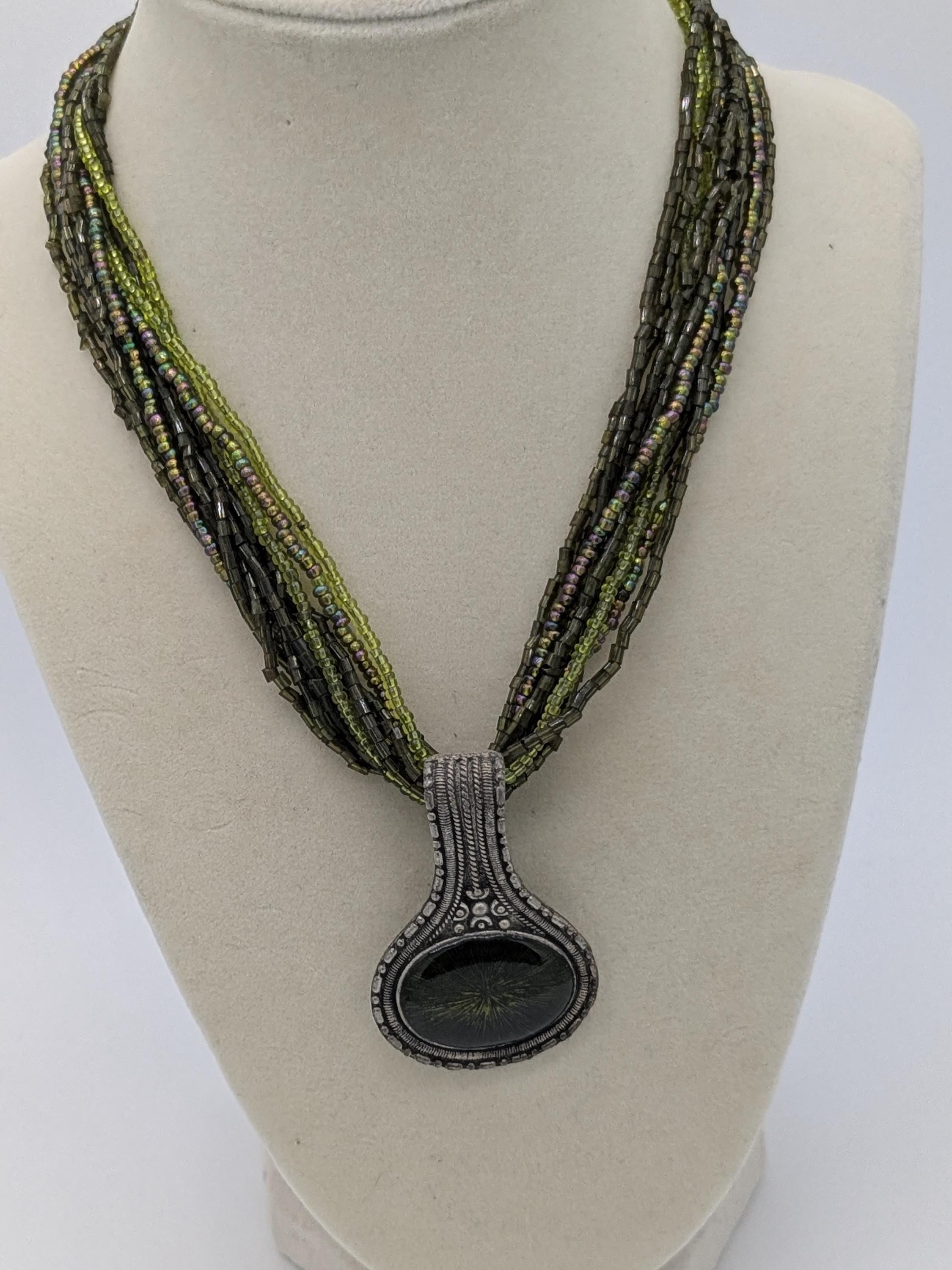 This striking multi-strand necklace features layers of green seed beads paired with a bold central pendant. Earthy and artistic, it blends texture and color beautifully, creating a statement piece perfect for bohemian, casual, or artistic styles. Lightweight and versatile for any occasion.