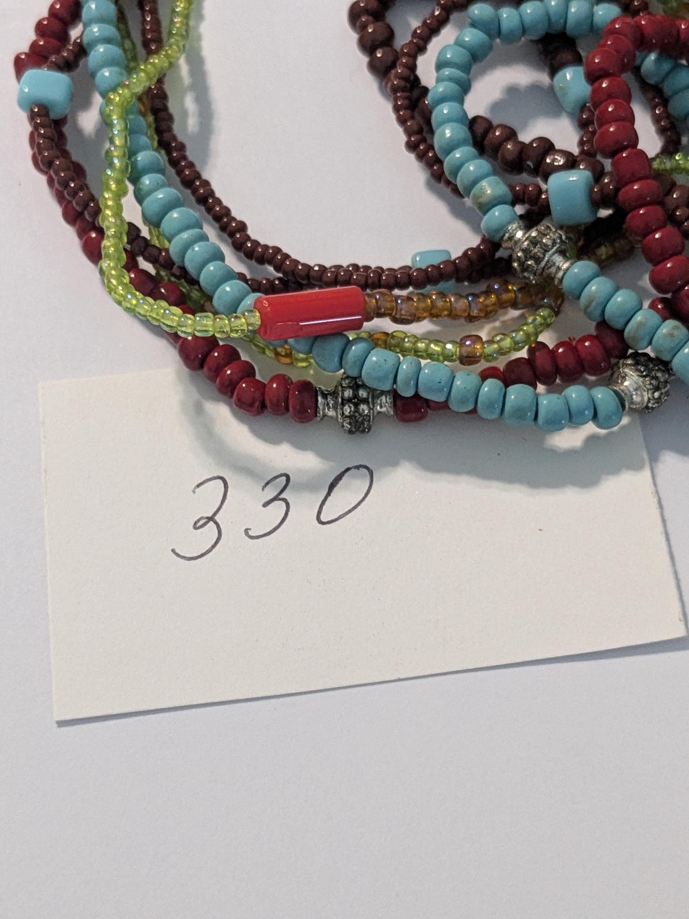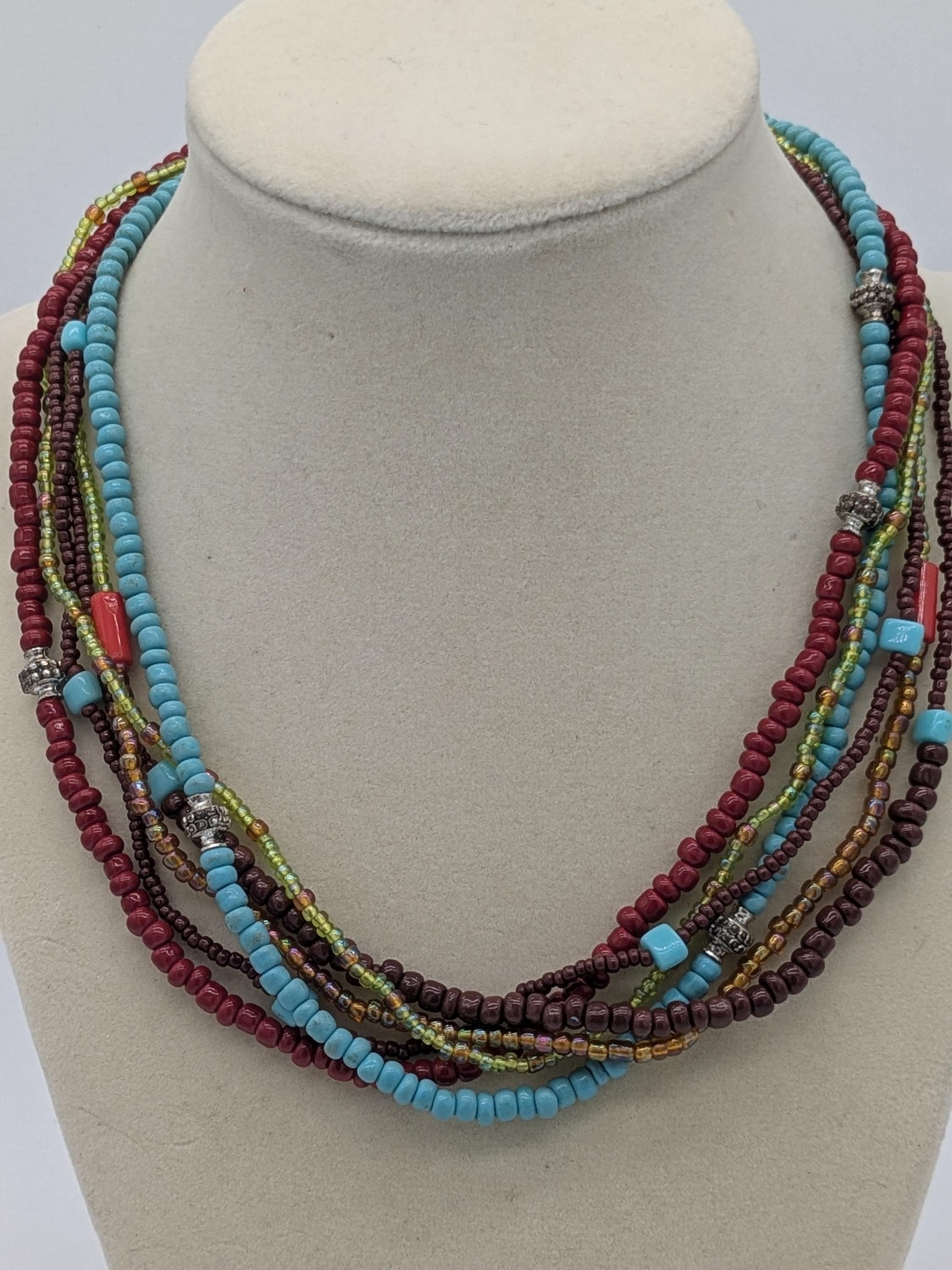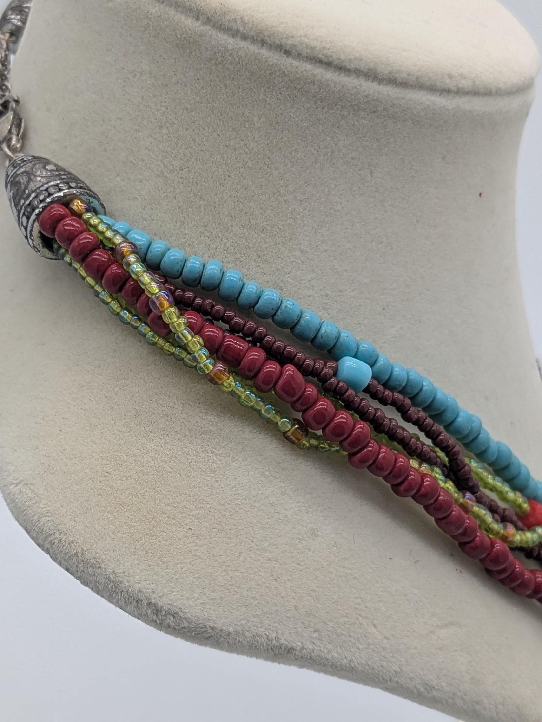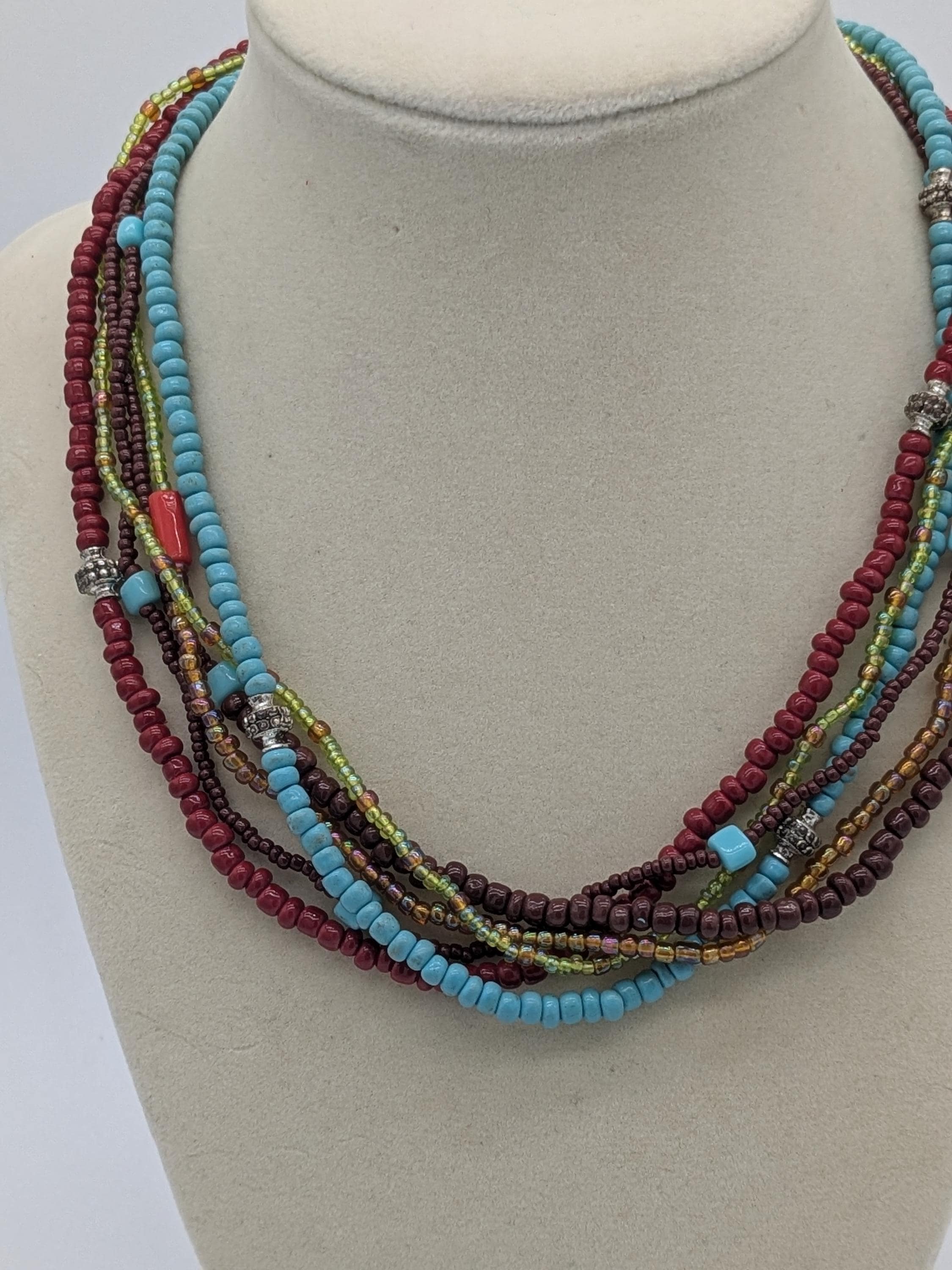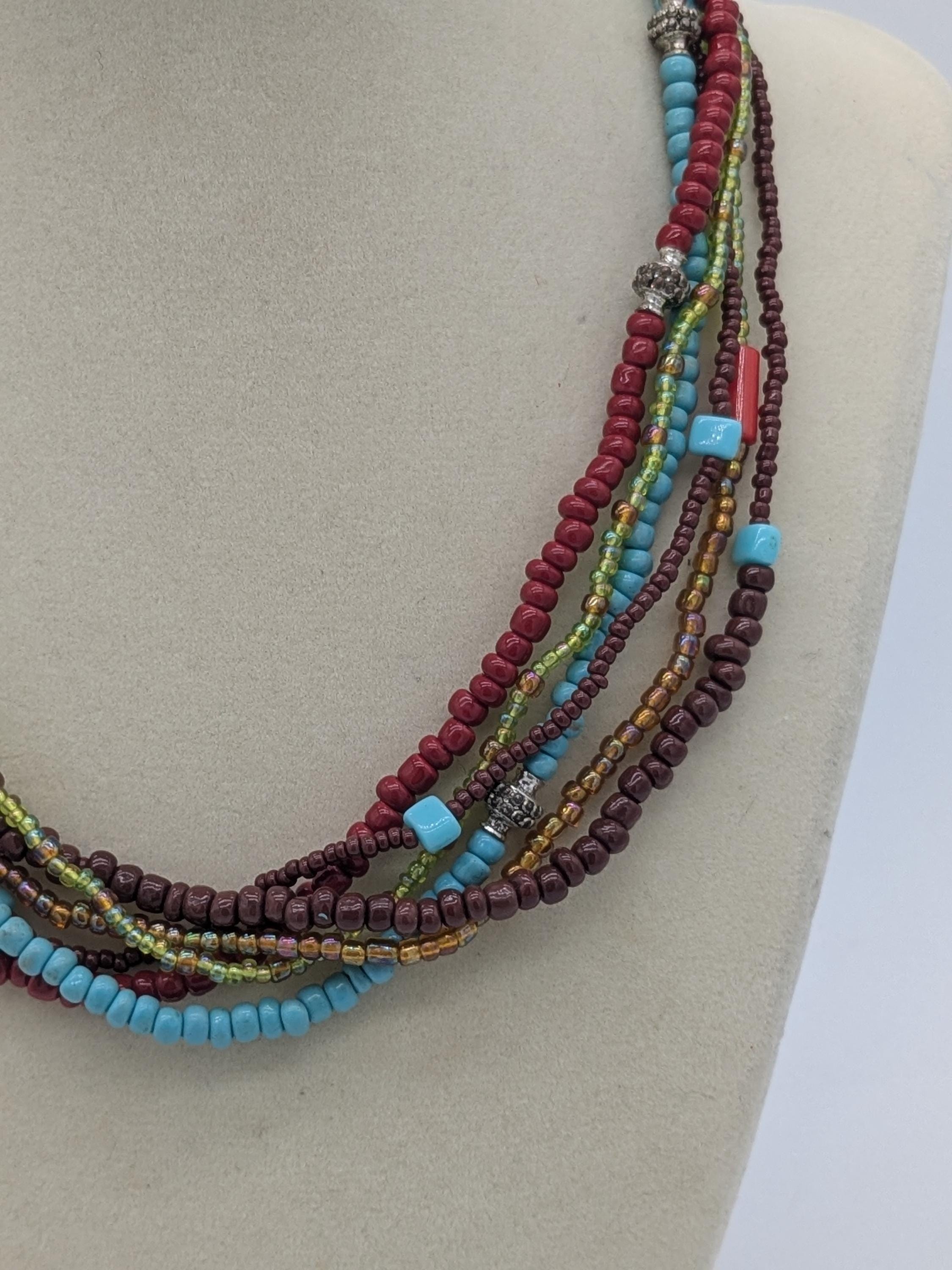 This vibrant multicolor necklace features layered strands of turquoise, red, yellow, and brown seed beads accented with metallic spacers. A perfect statement piece for boho, tribal, or casual looks, adding a pop of color and texture to any outfit.