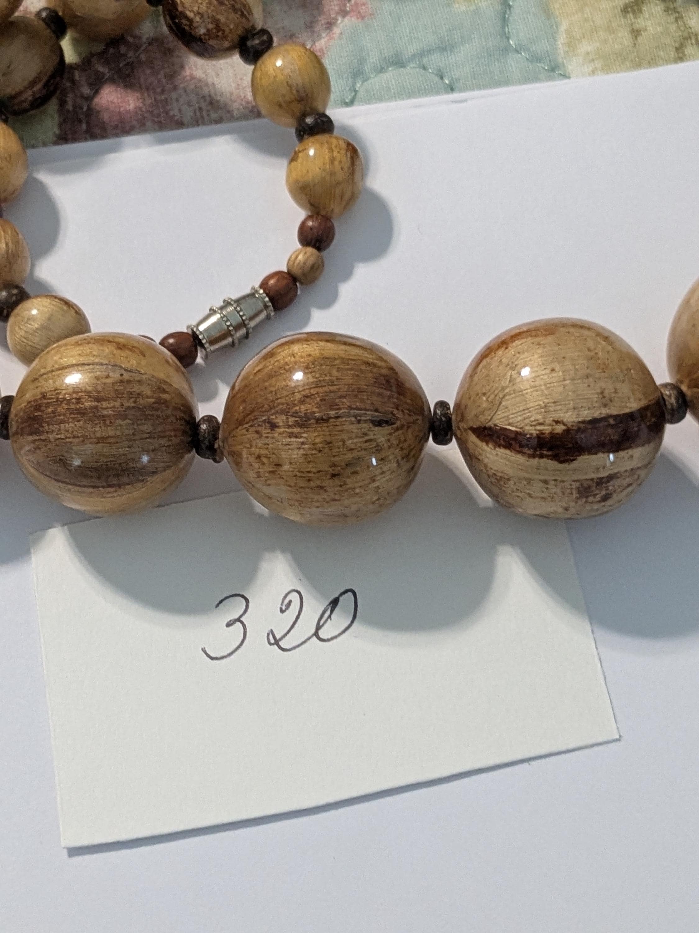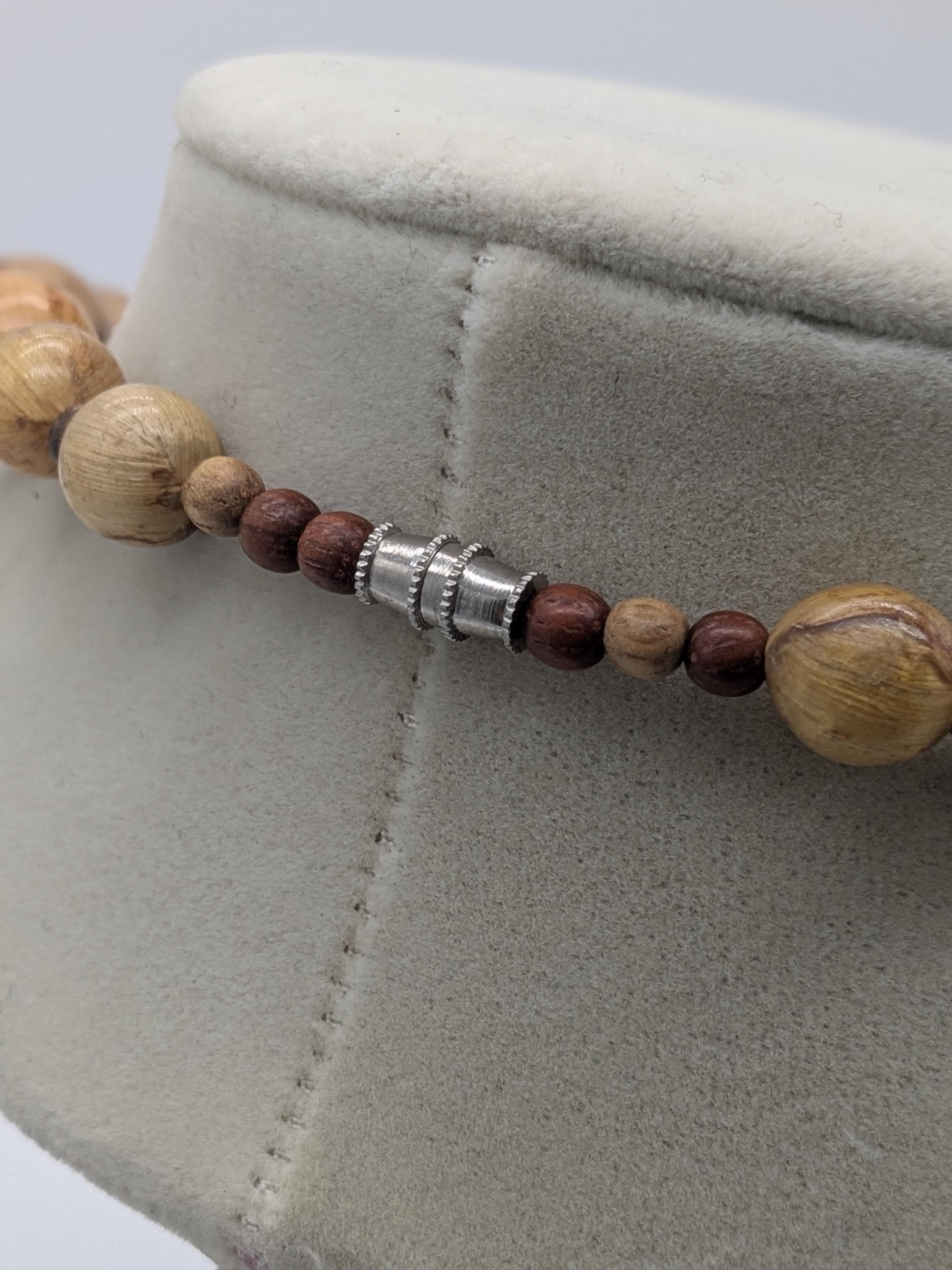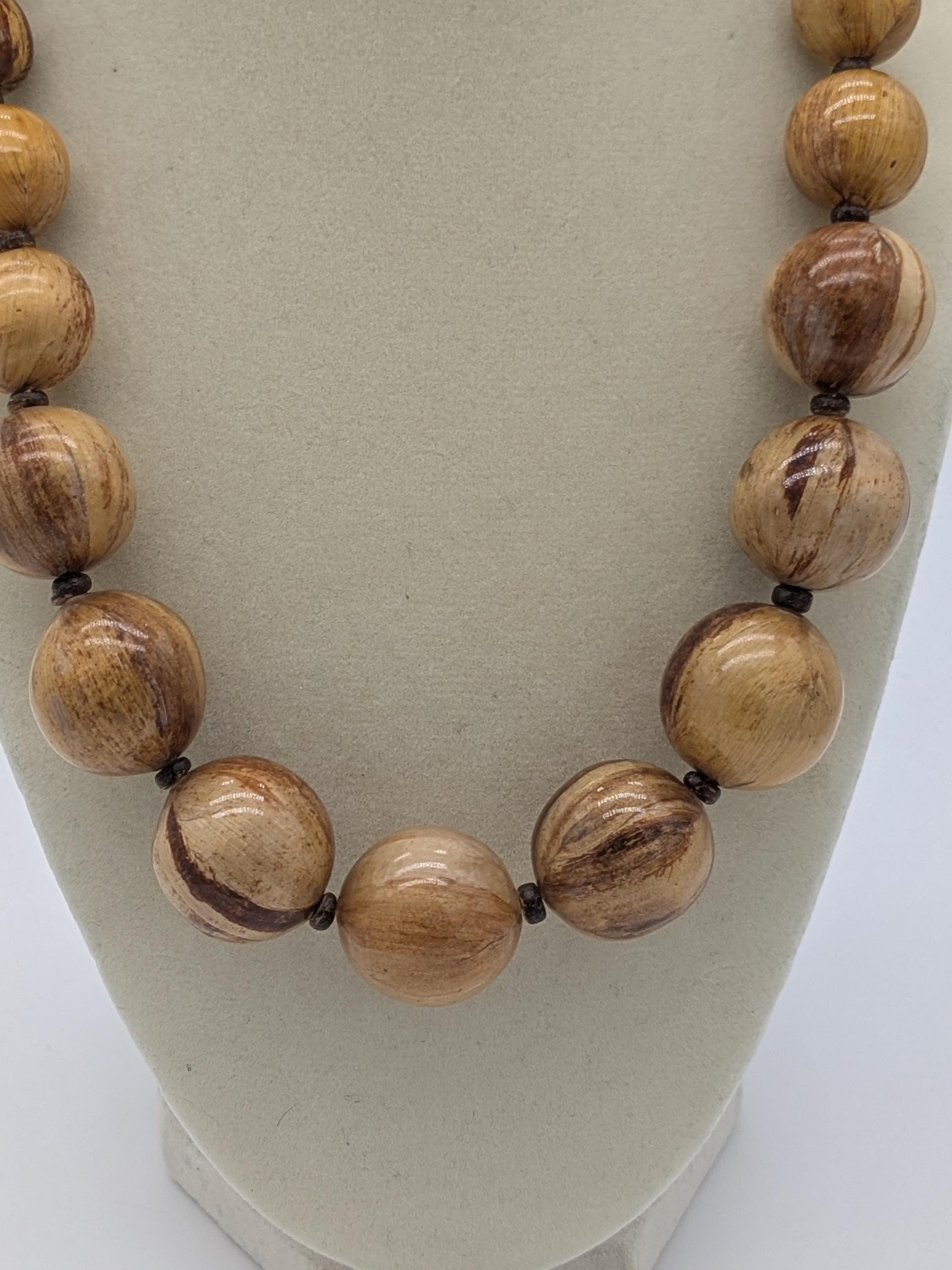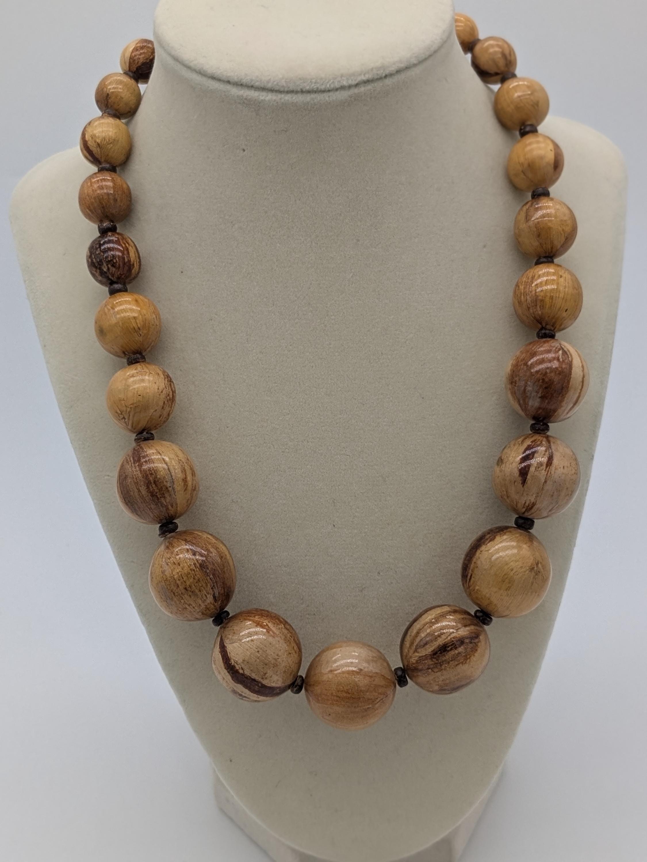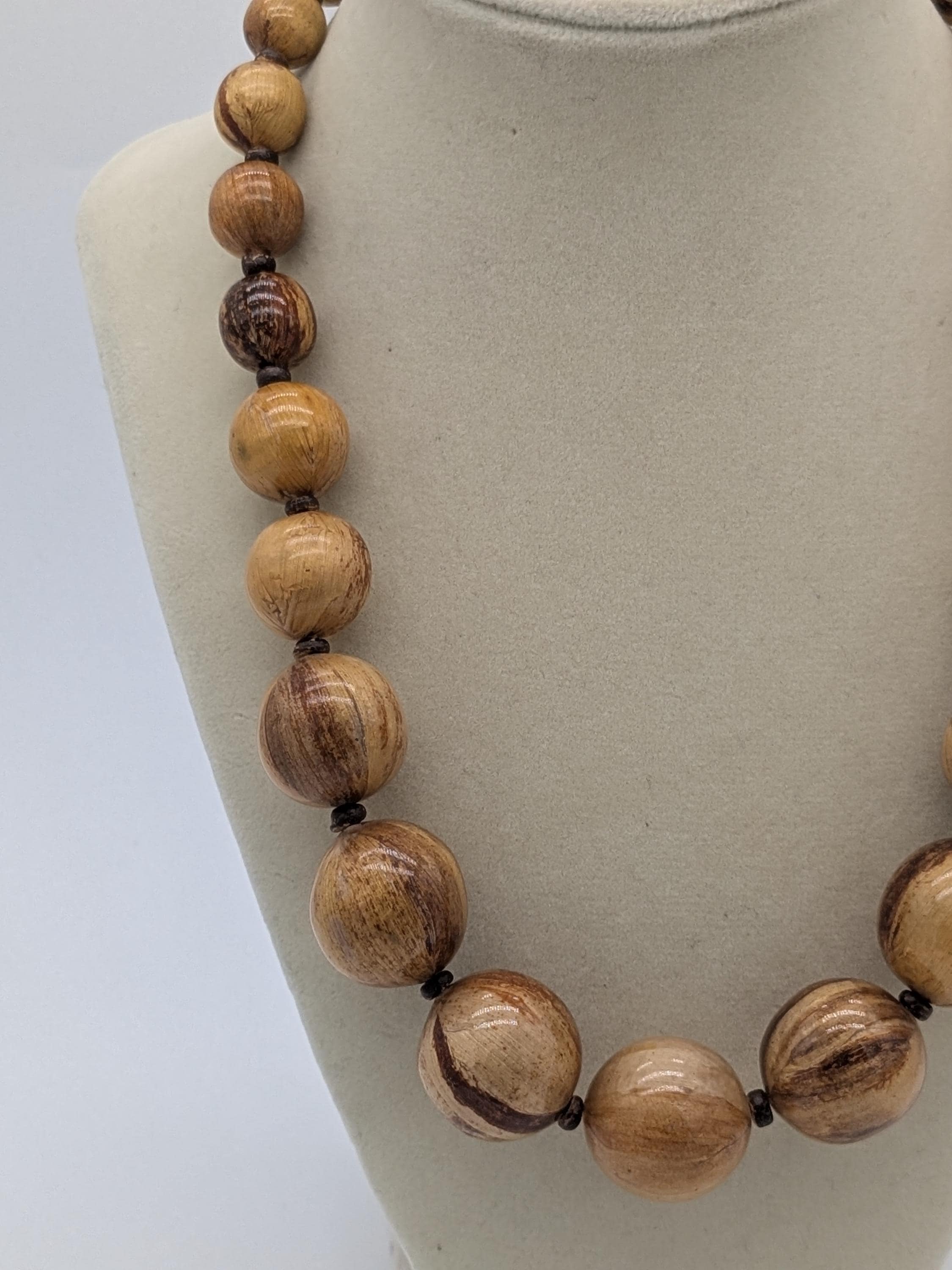This chunky natural wood bead necklace showcases beautifully grained round beads in rich earthy tones. Lightweight and organic, it adds rustic elegance to any outfit — perfect for boho styles, casual looks, or layering with other natural accessories.