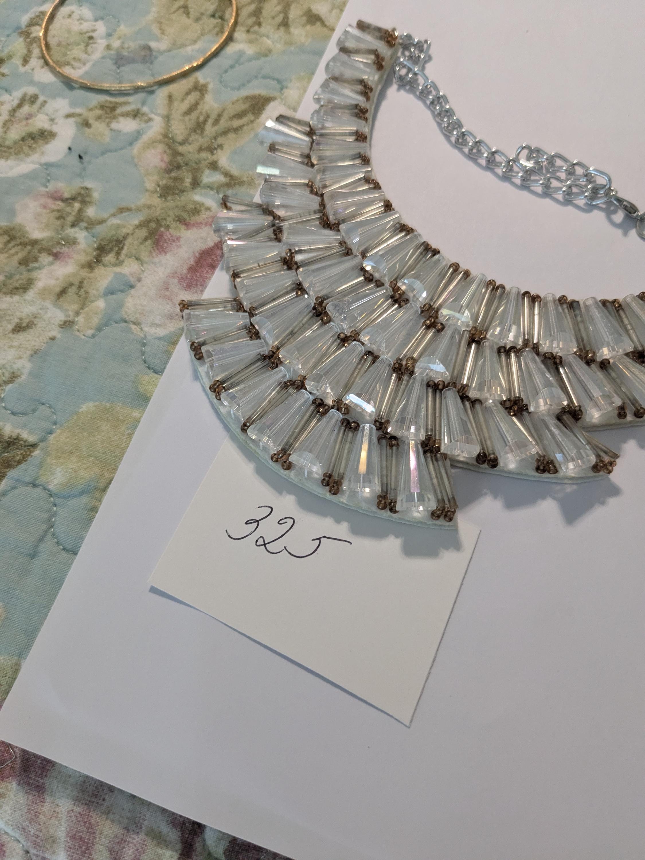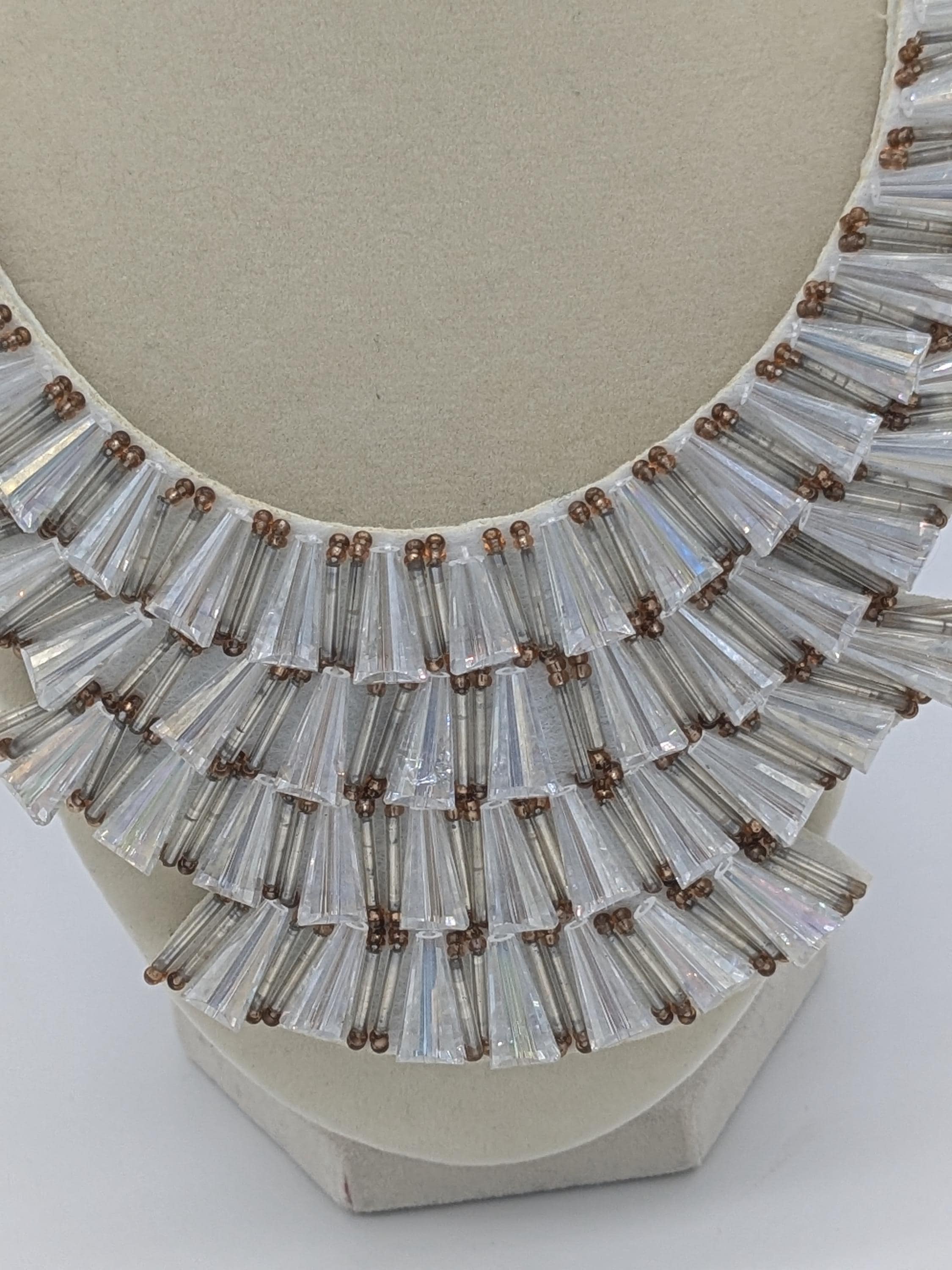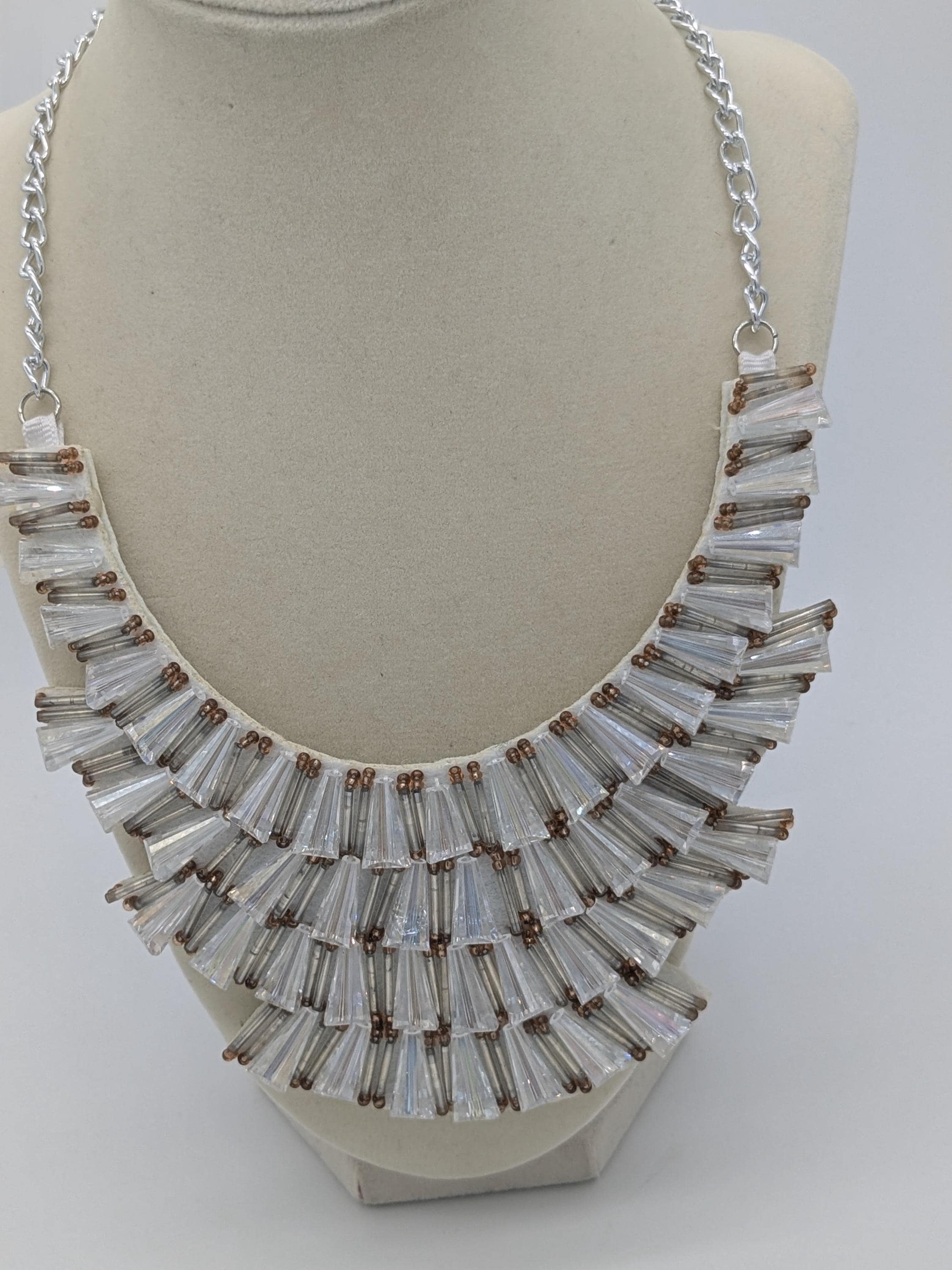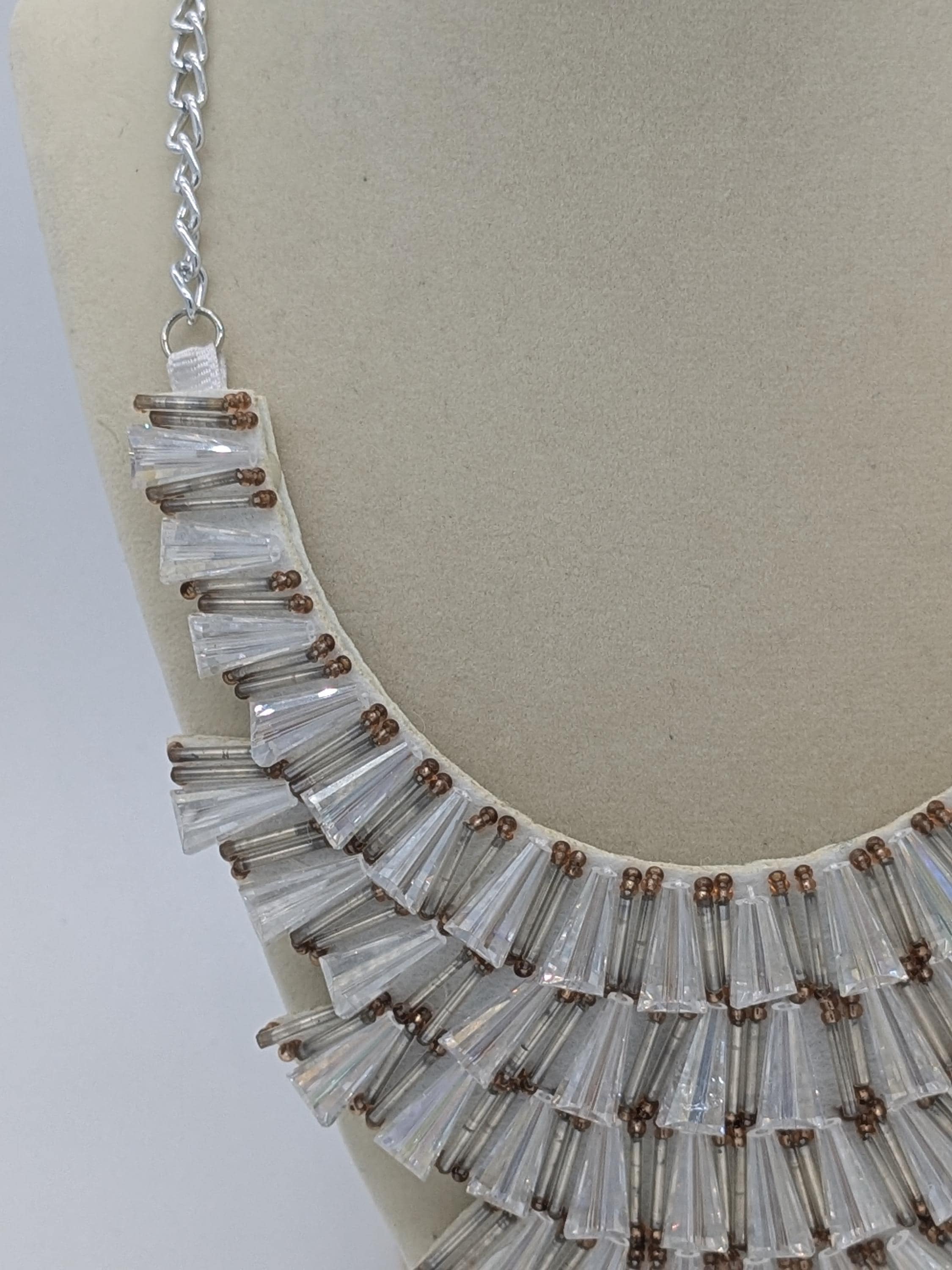 This modern statement necklace features cascading rows of clear tube beads accented with small bronze spacers for a sleek geometric look. The layered design adds dimension and movement, making it perfect for evening outfits or elevating everyday wear.