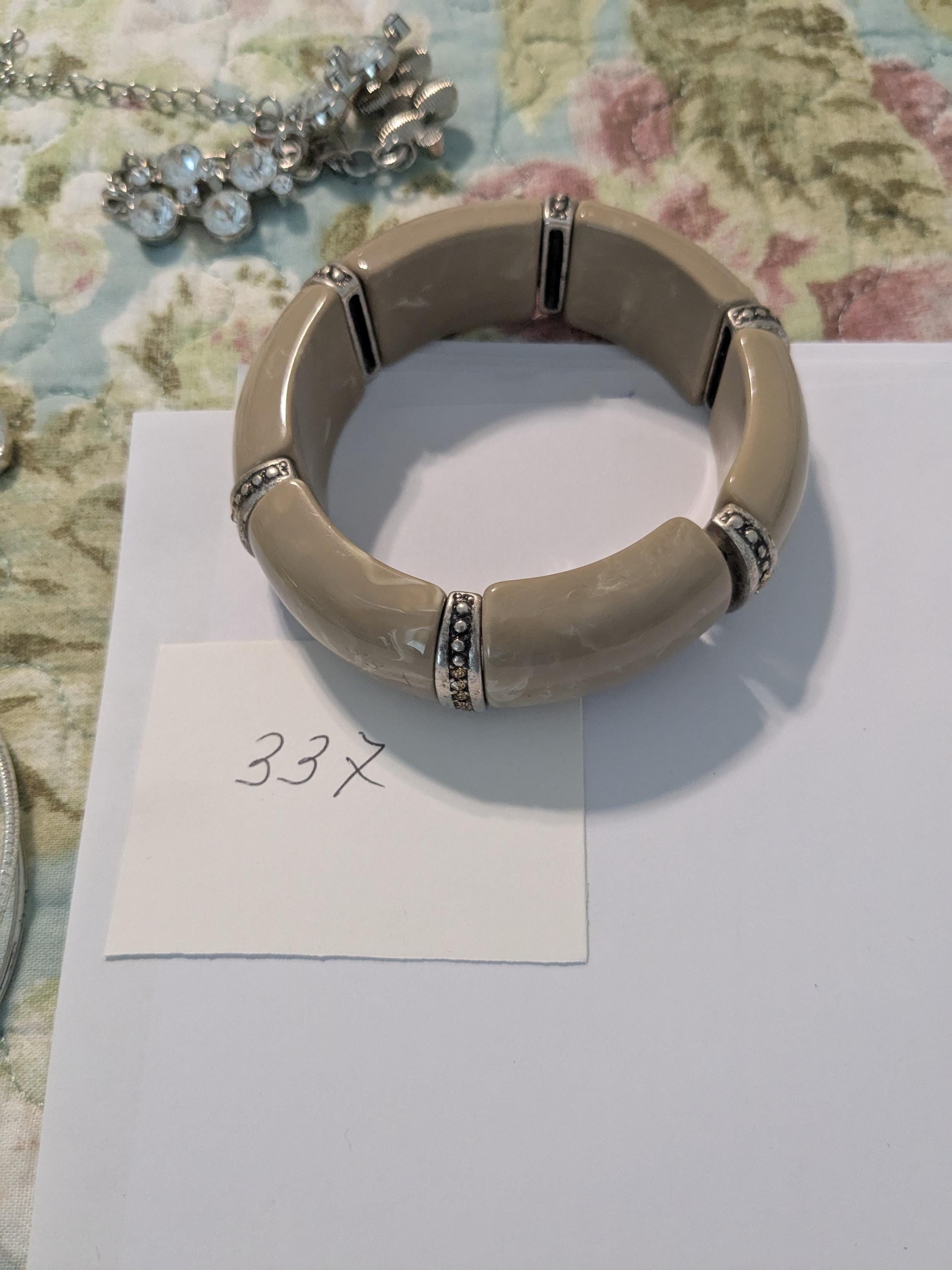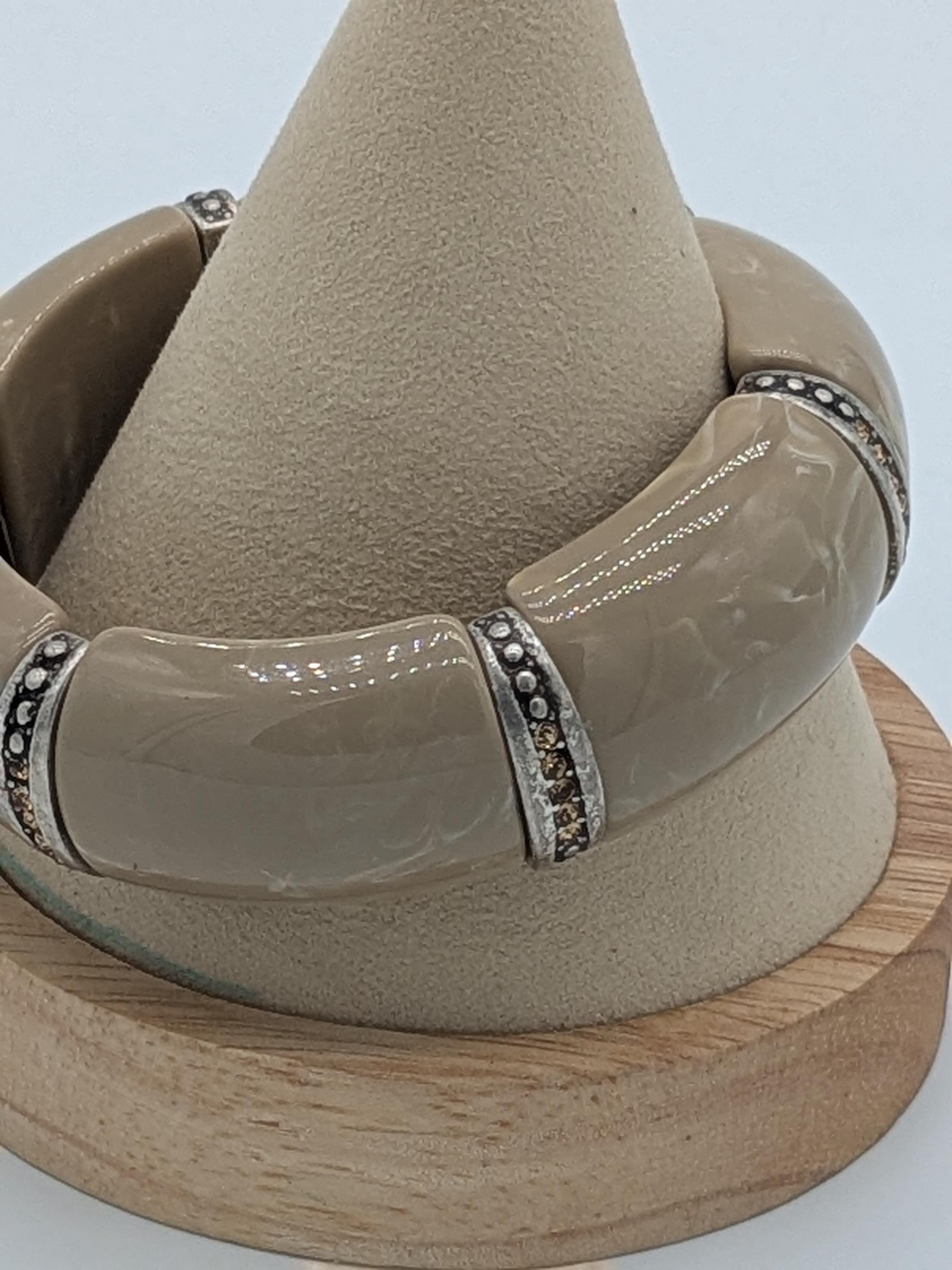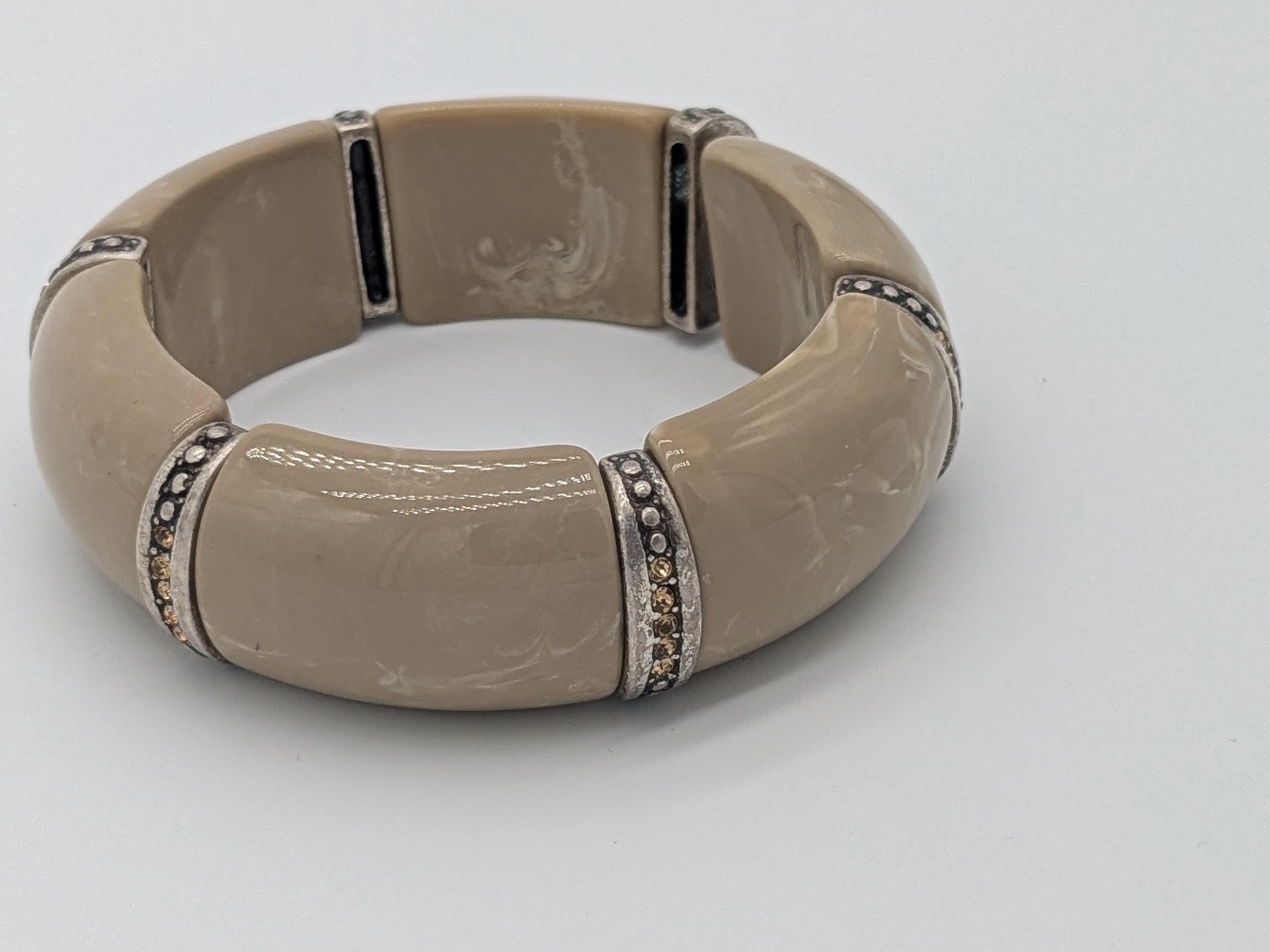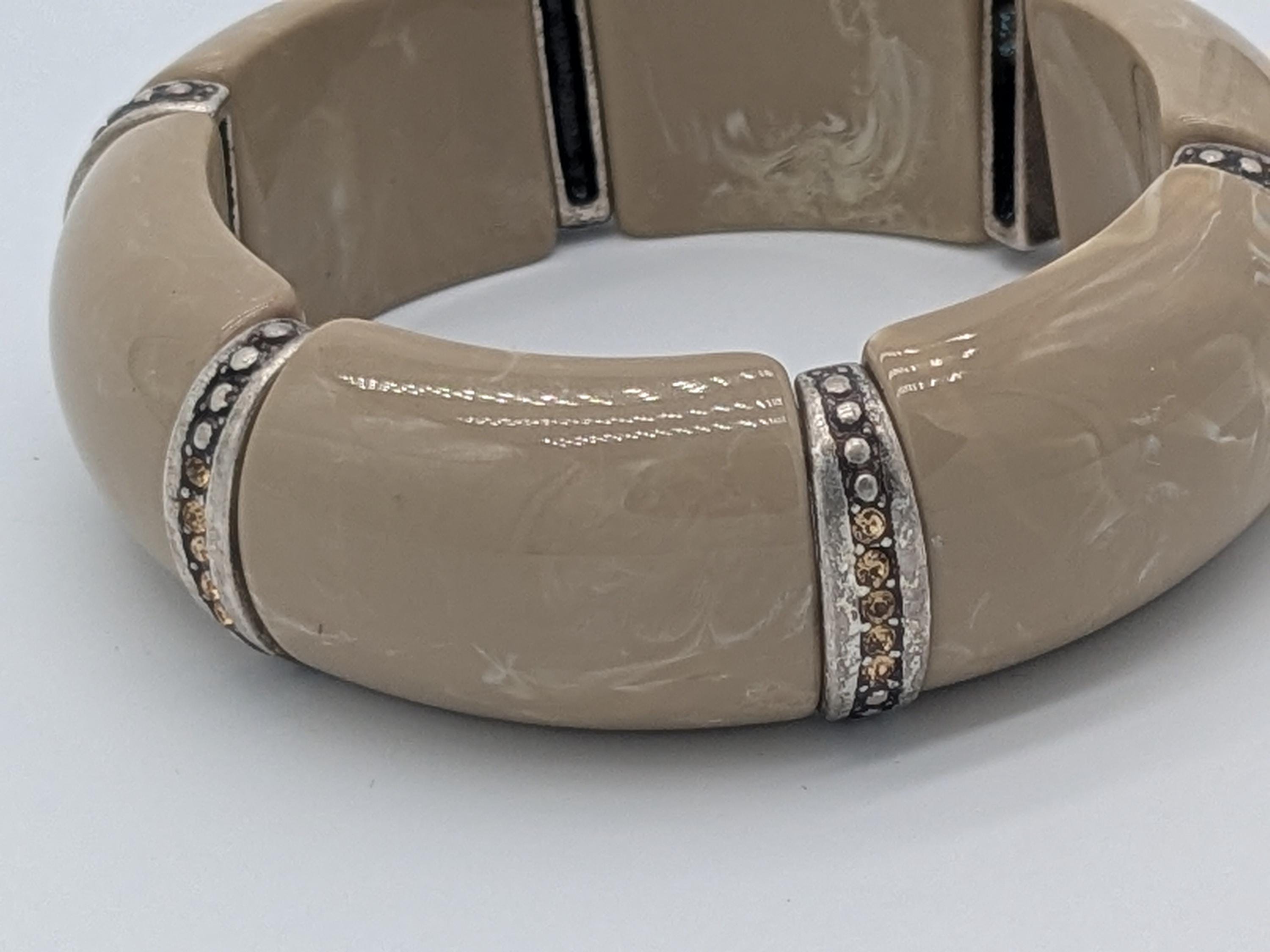 This elegant beige chunky bracelet features smooth resin segments with sparkling rhinestone details for a touch of vintage glamour. The stretch design ensures a comfortable fit, making it a perfect statement accessory for any outfit. Ideal for lovers of retro and modern fusion styles.
