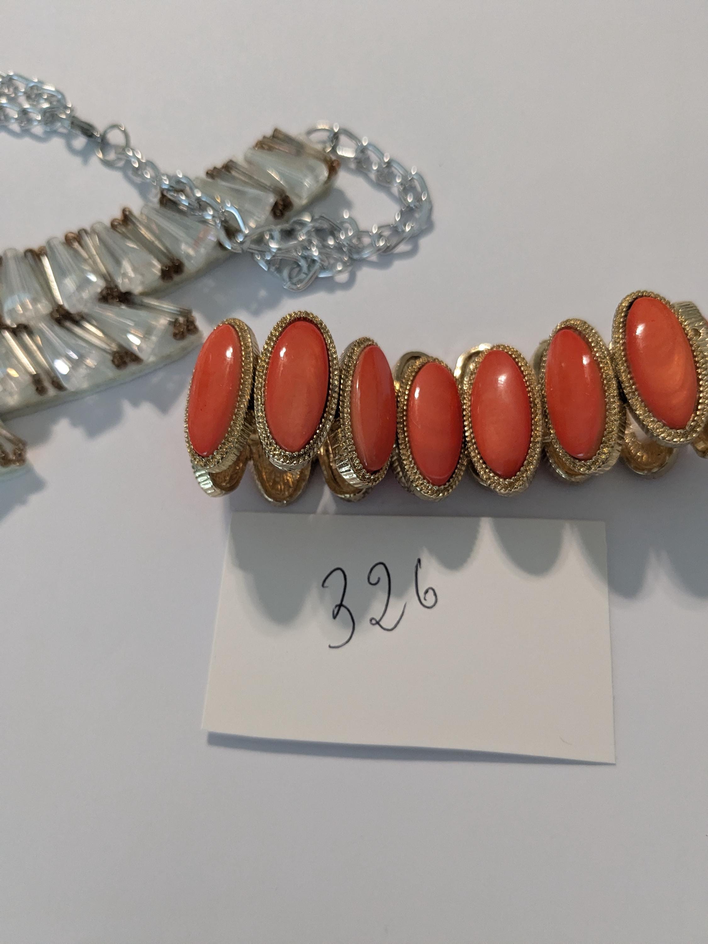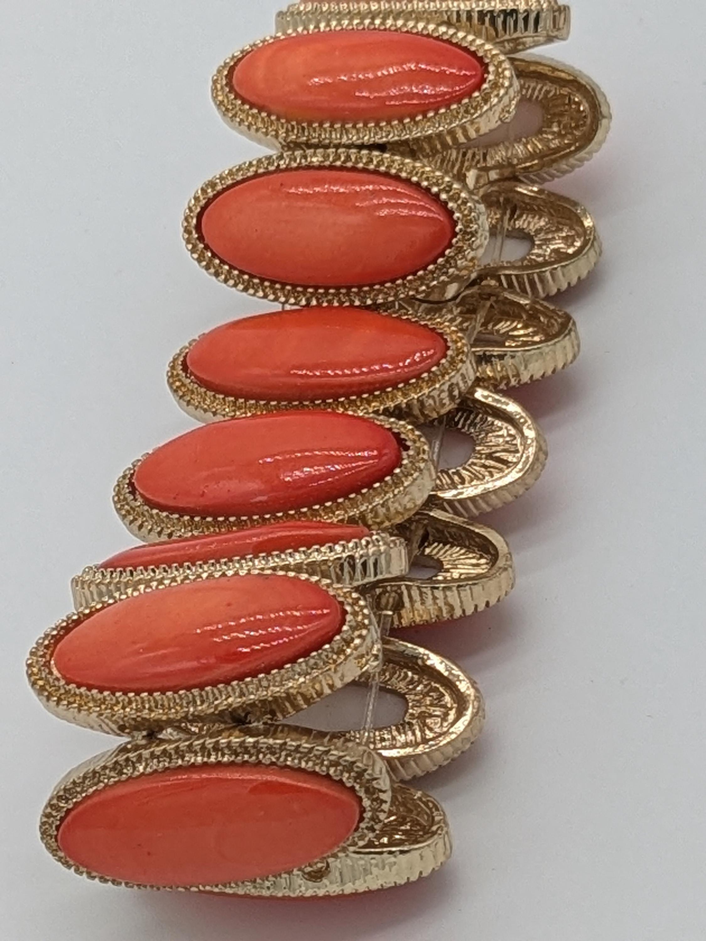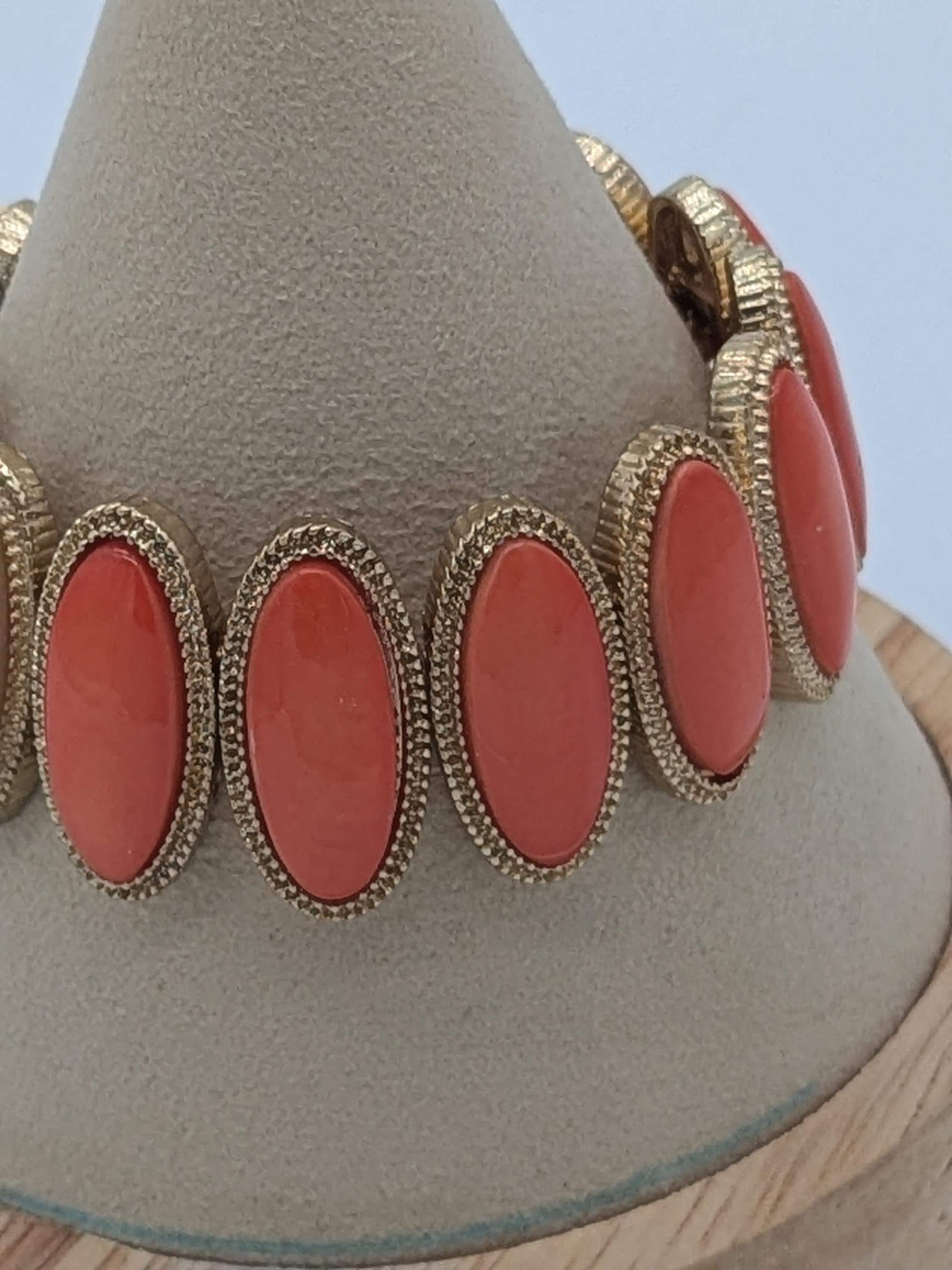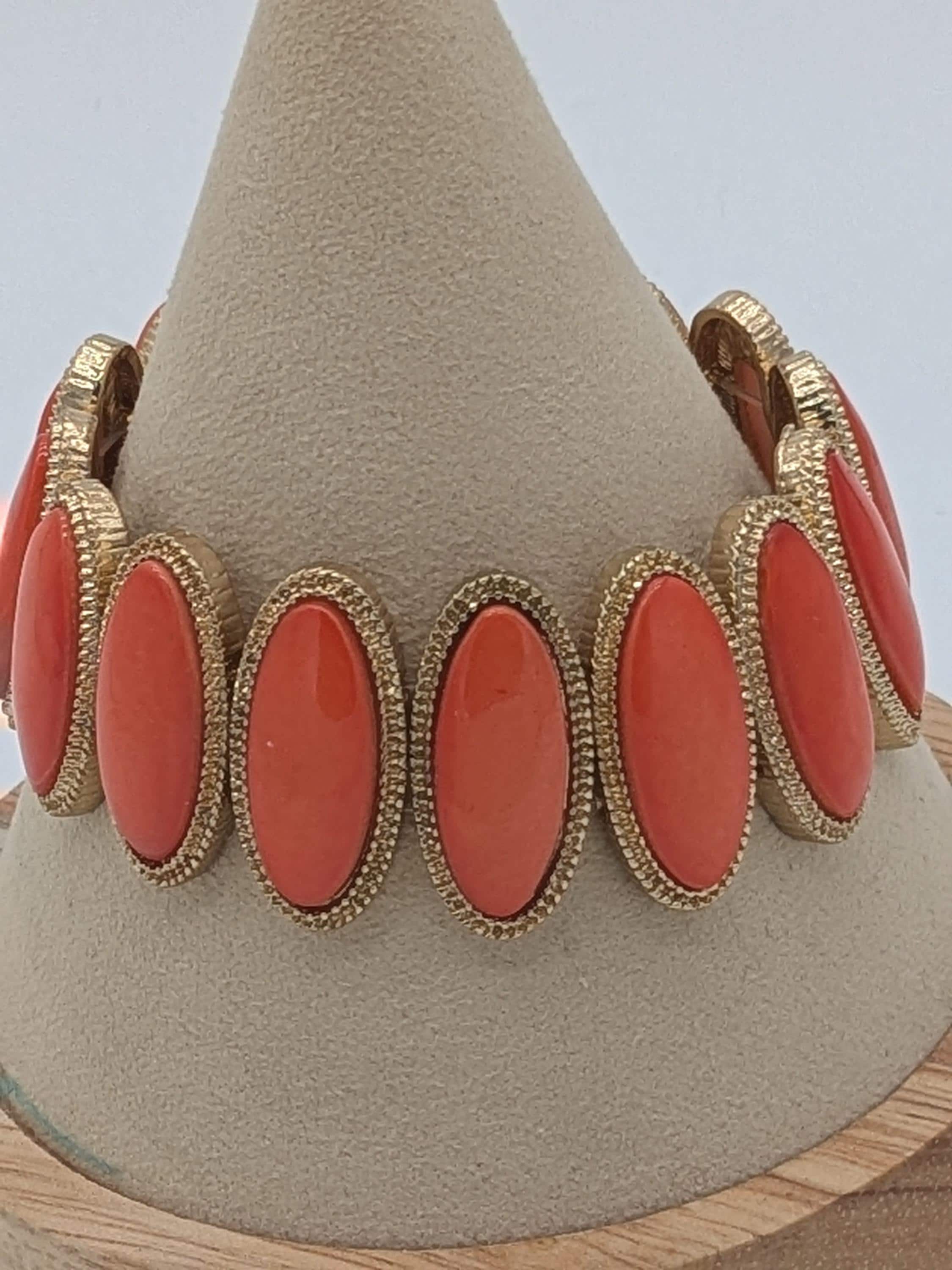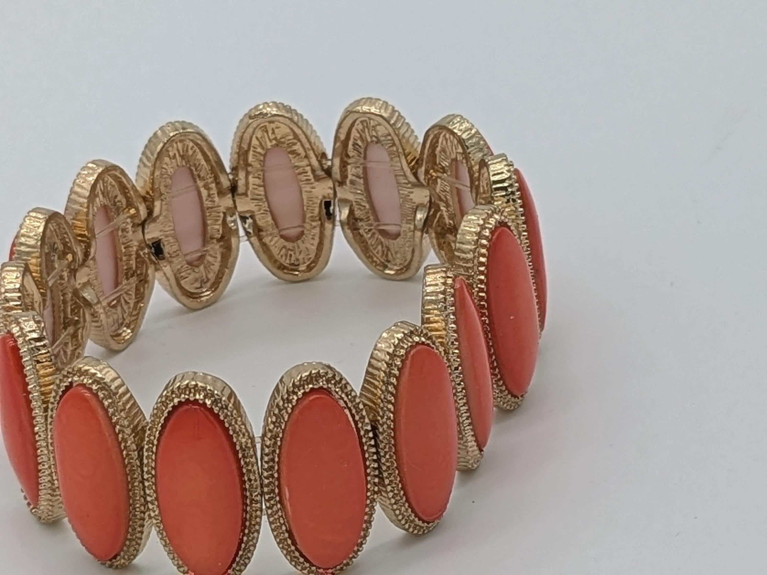 This striking vintage-inspired bracelet features smooth coral-colored oval panels framed in textured metal. Its bold, stretchy design ensures a comfortable fit while adding a pop of retro charm to any outfit. Perfect for boho, summer, or statement jewelry lovers.