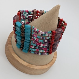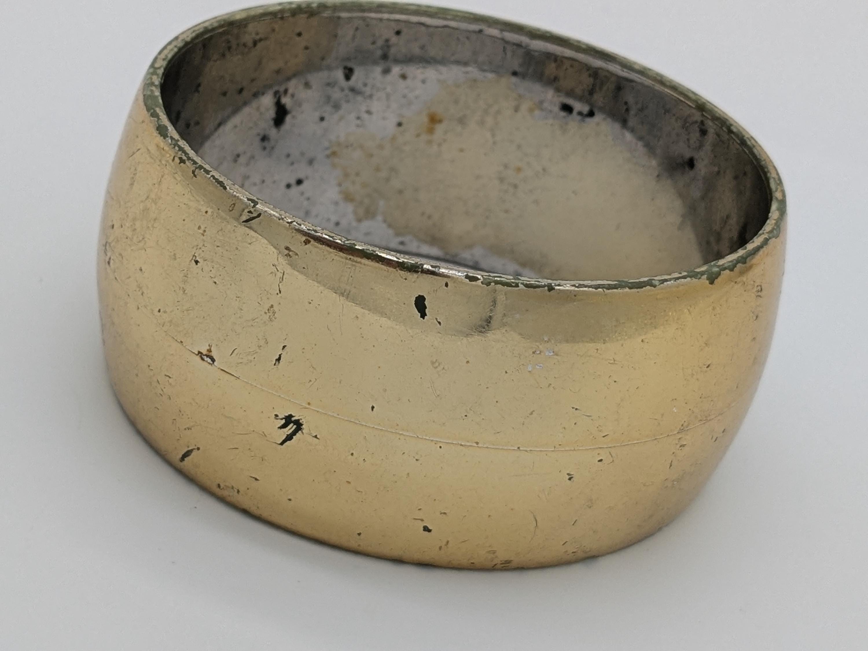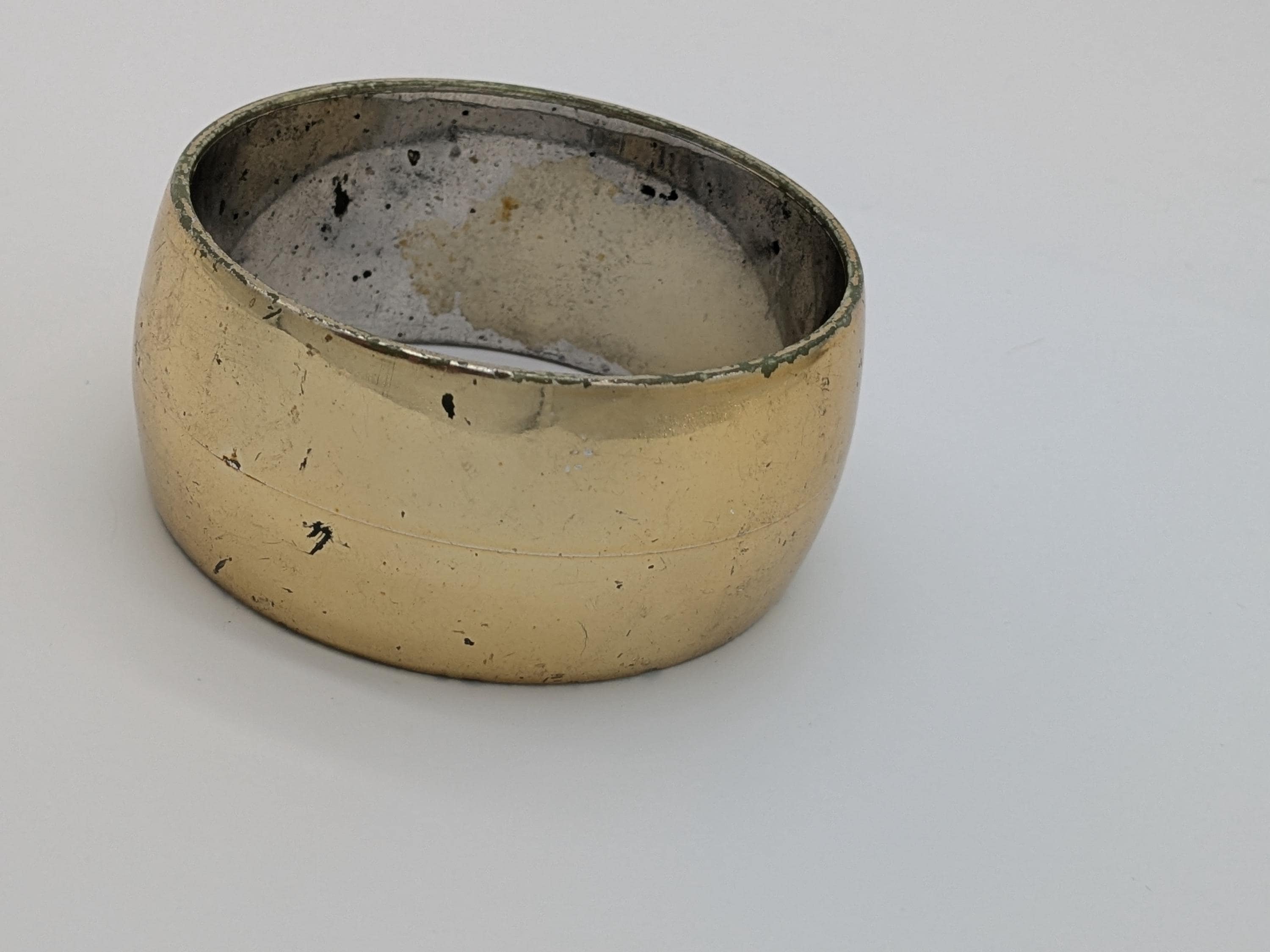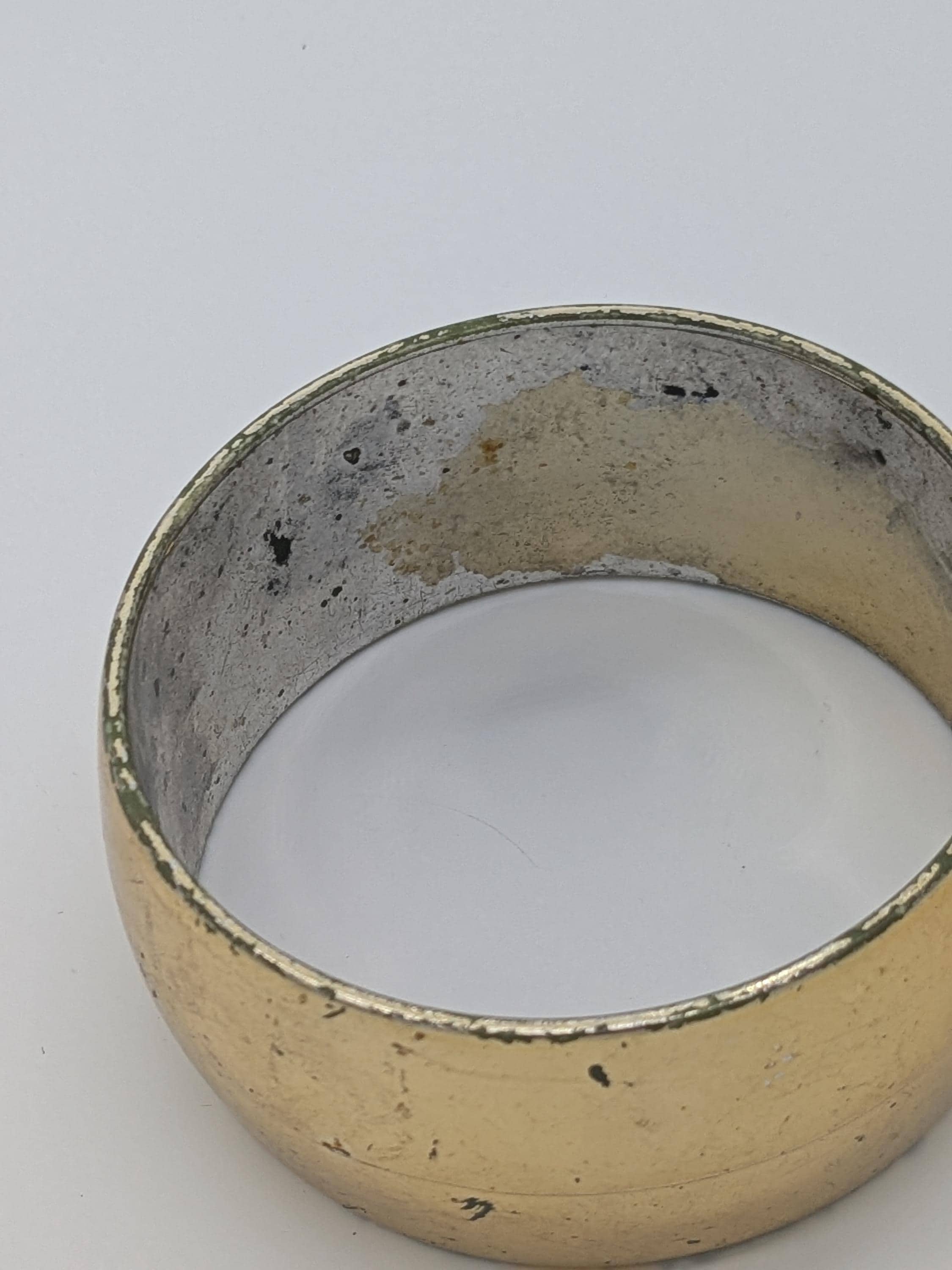 This vintage-inspired wide bangle features a bold brass tone with natural aged patina and character marks. Its minimalist yet rustic look makes it a perfect accessory for lovers of retro or industrial-style fashion. A charming piece with authentic vintage flair.