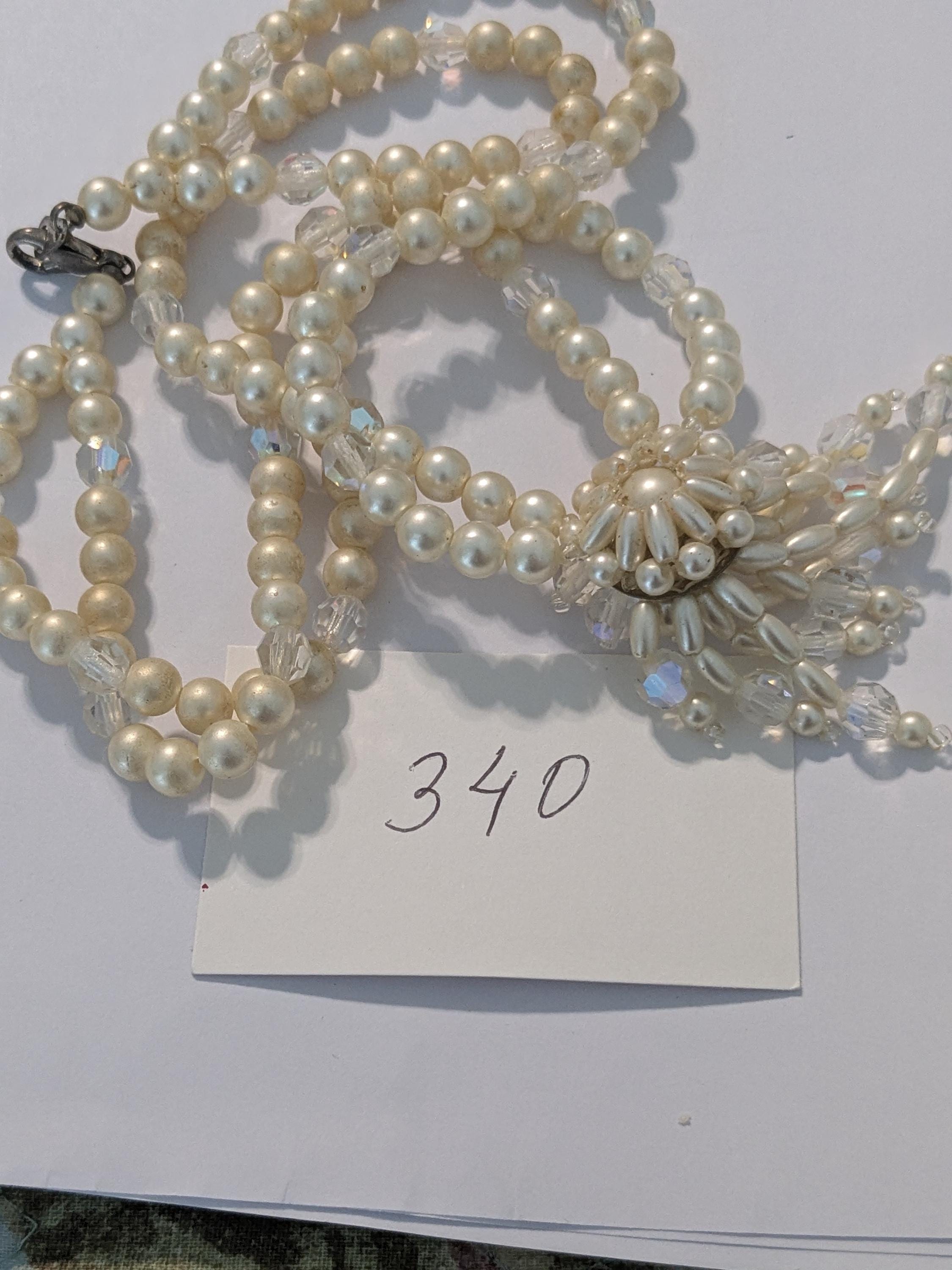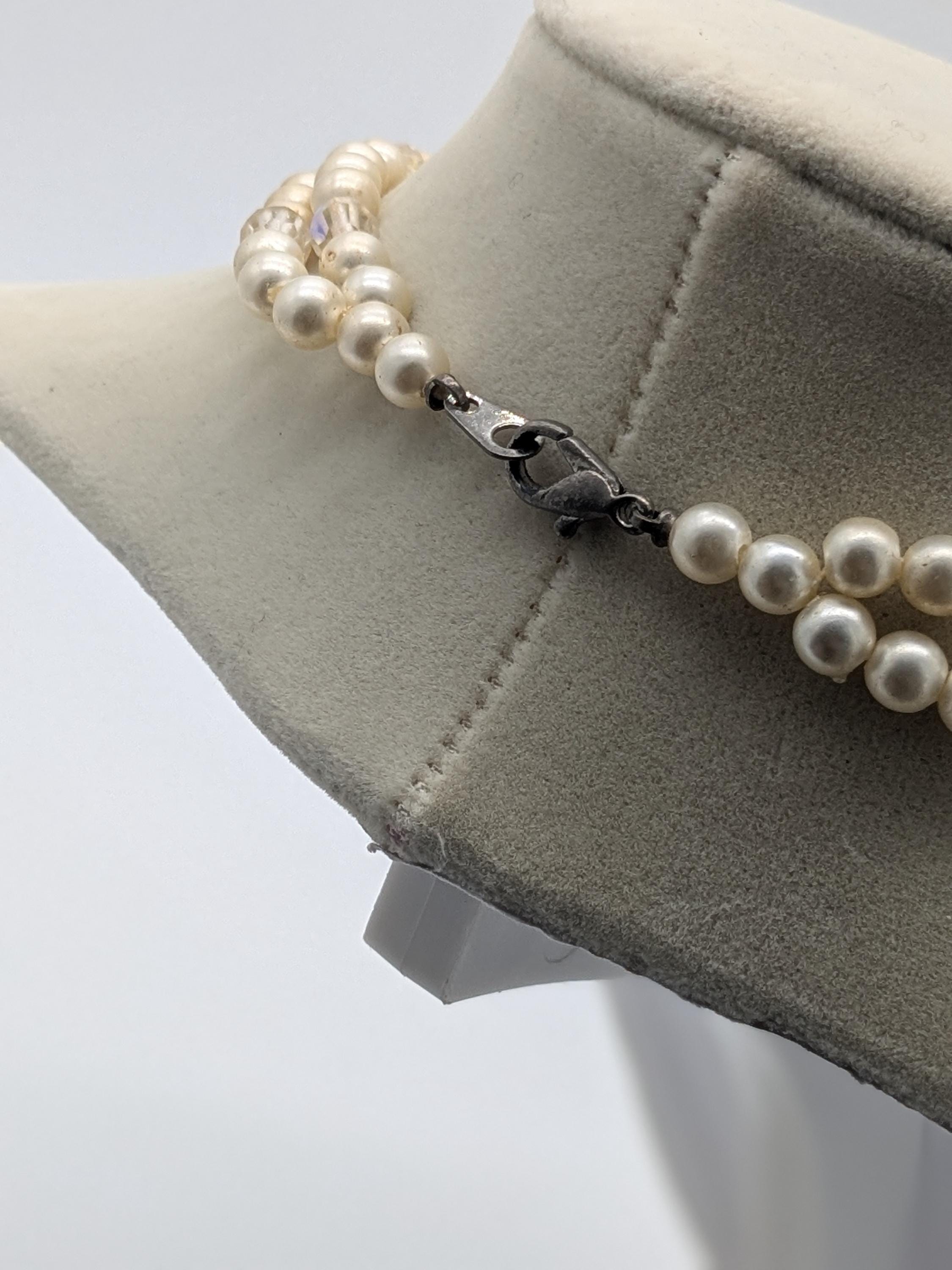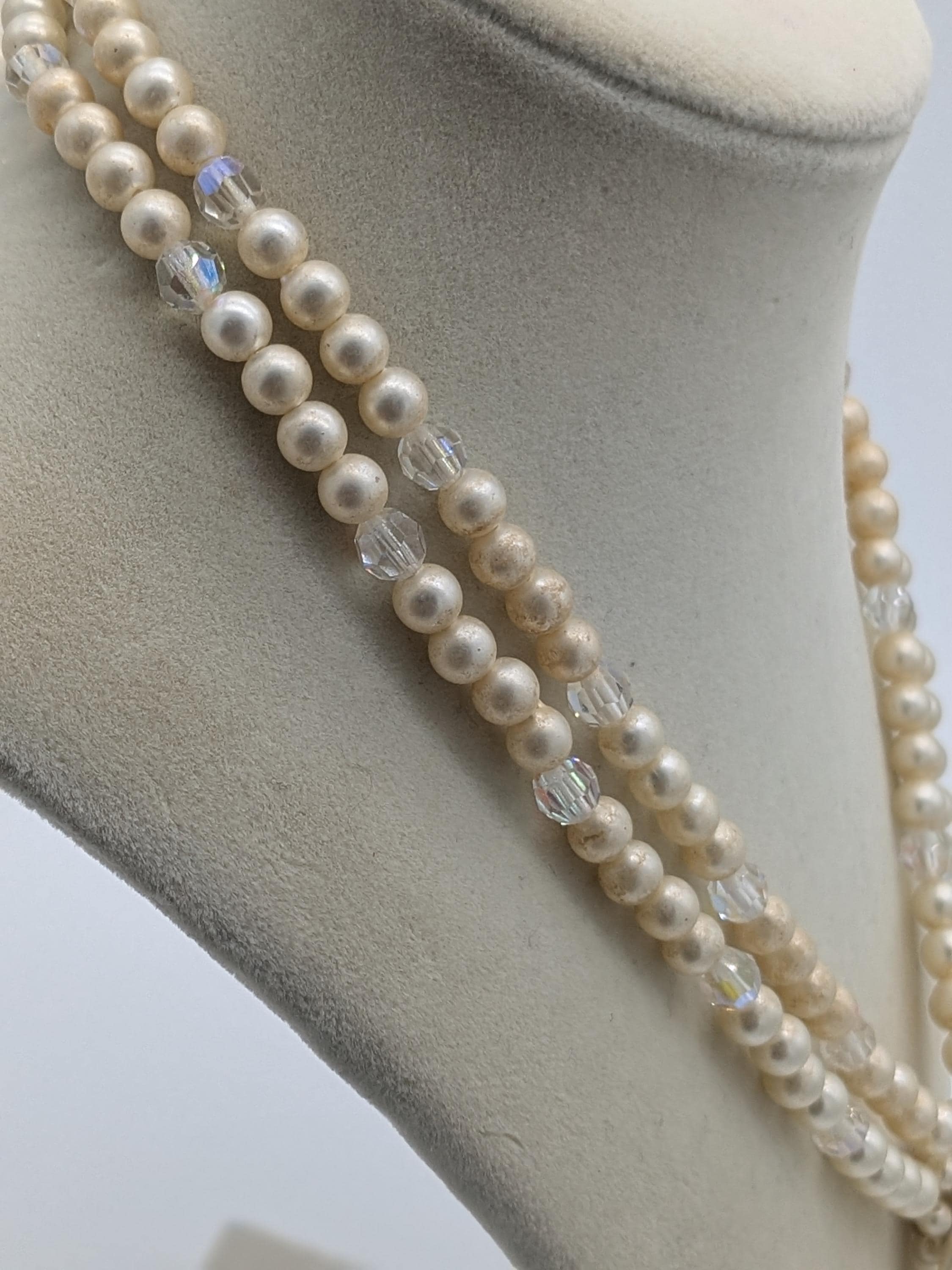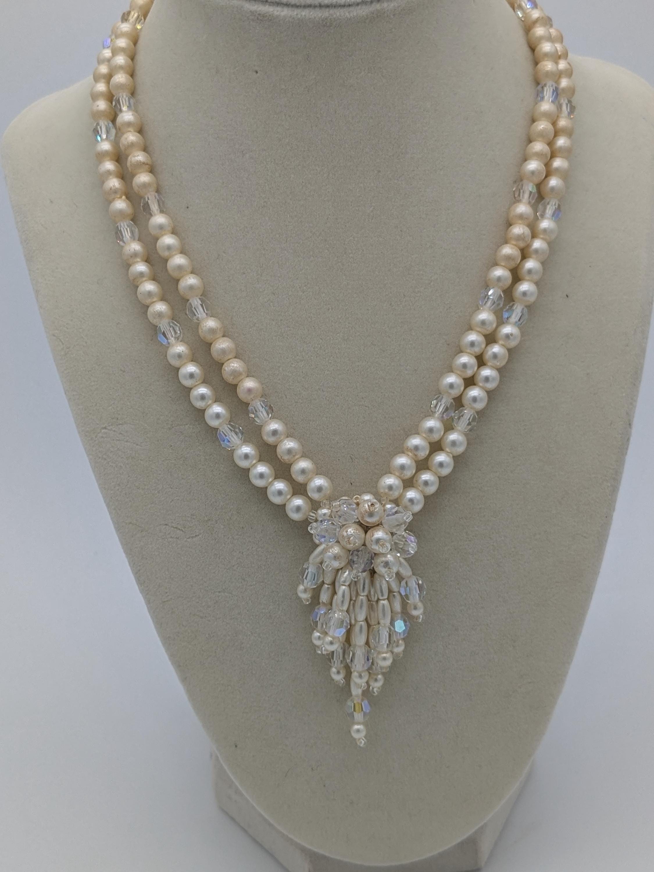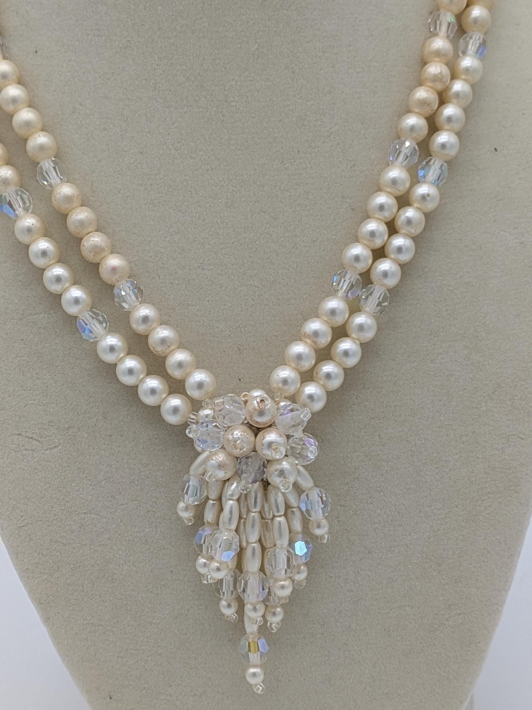 This elegant vintage-inspired necklace features two strands of lustrous ivory faux pearls accented with clear crystal-style beads. A stunning clustered centerpiece adds a touch of glamour, making it the perfect accessory for weddings, formal events, or timeless everyday elegance.