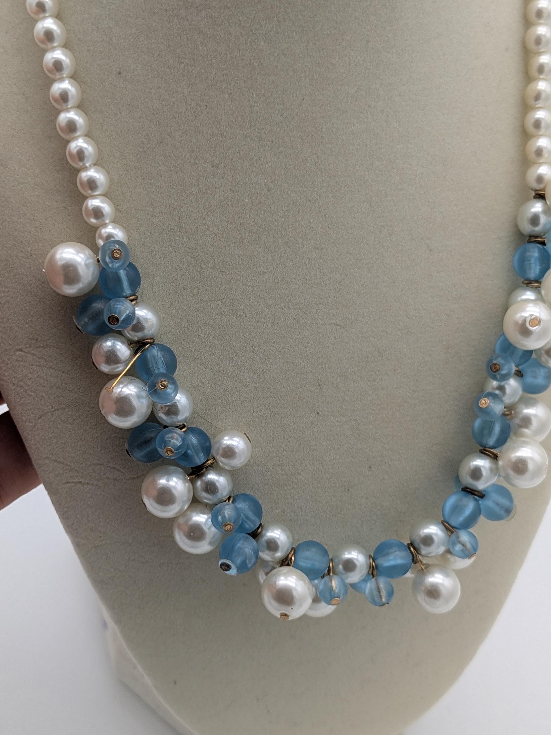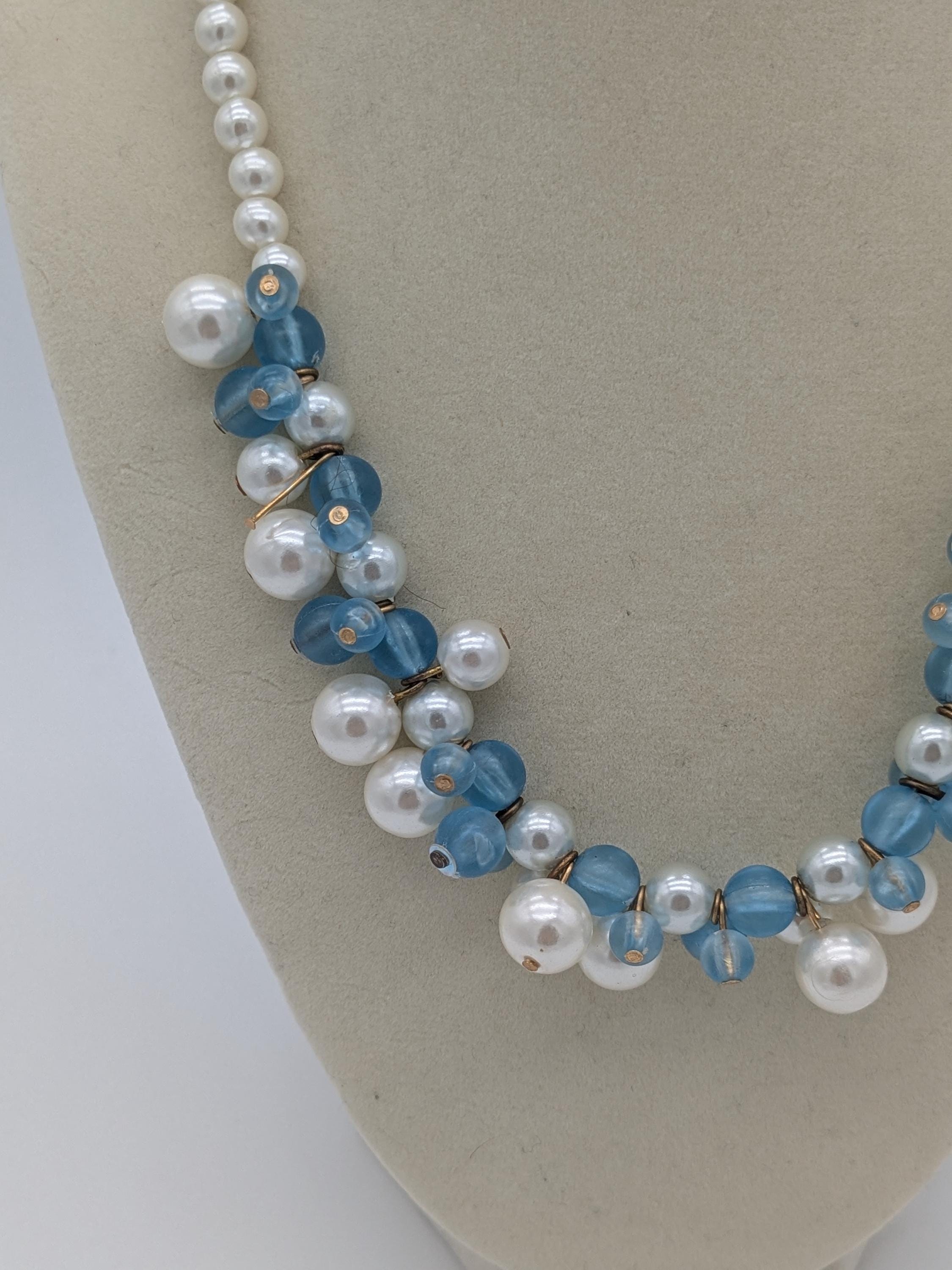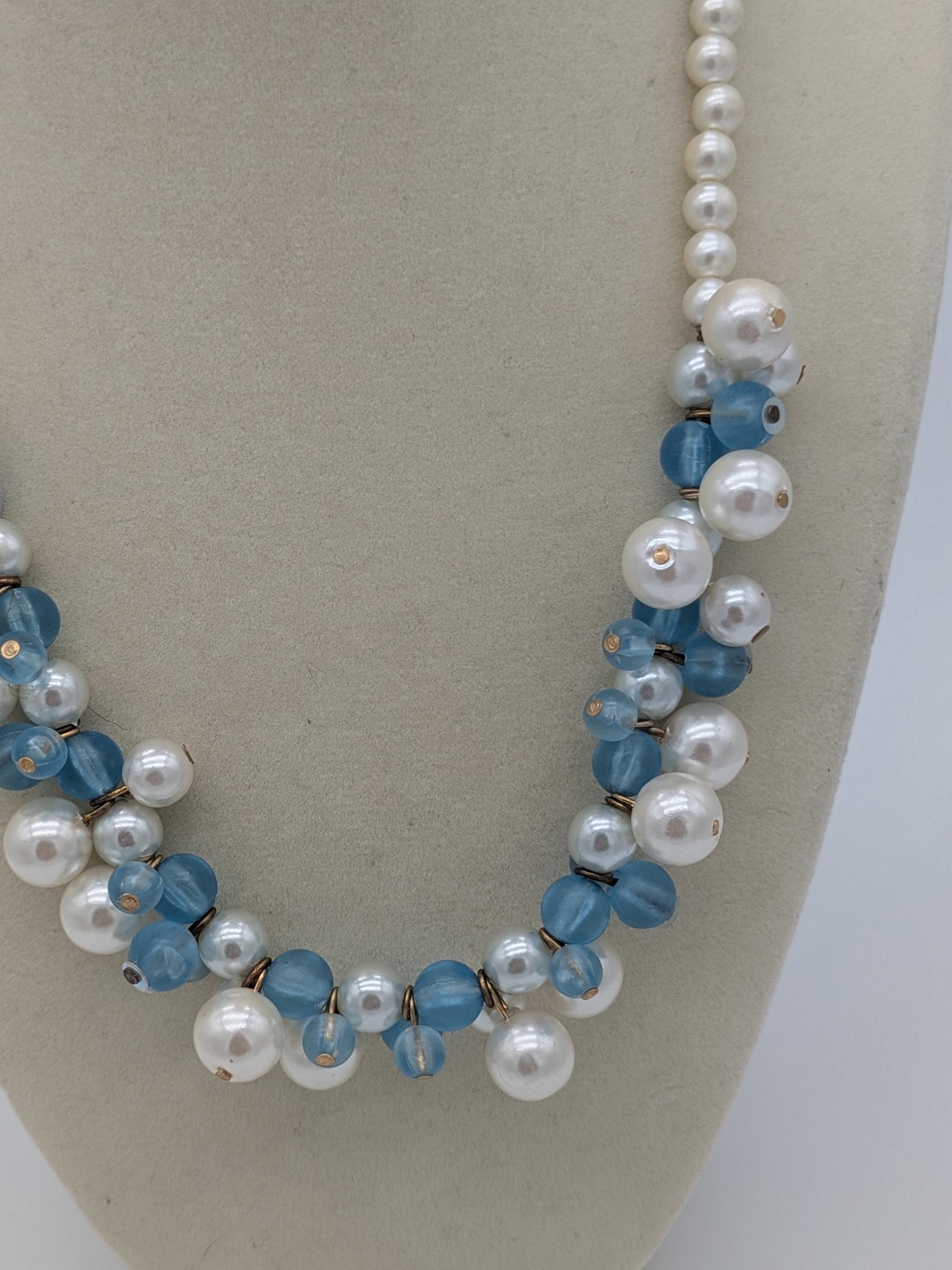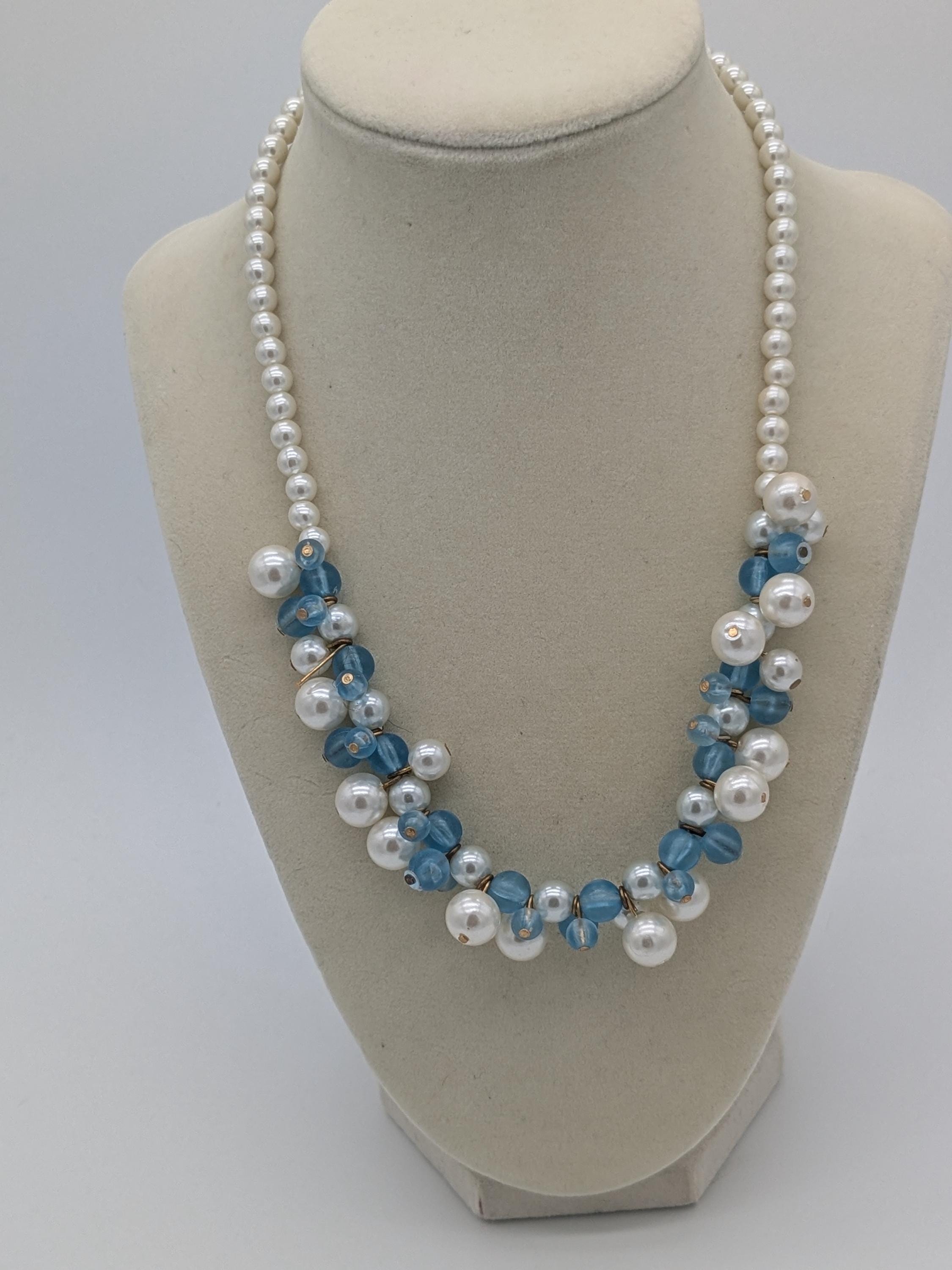 This elegant necklace features a stunning combination of white faux pearls and translucent blue beads. Designed with alternating textures and soft shine, it’s a perfect statement piece for both formal occasions and everyday elegance. Lightweight and easy to style, it adds a timeless touch to any outfit.
