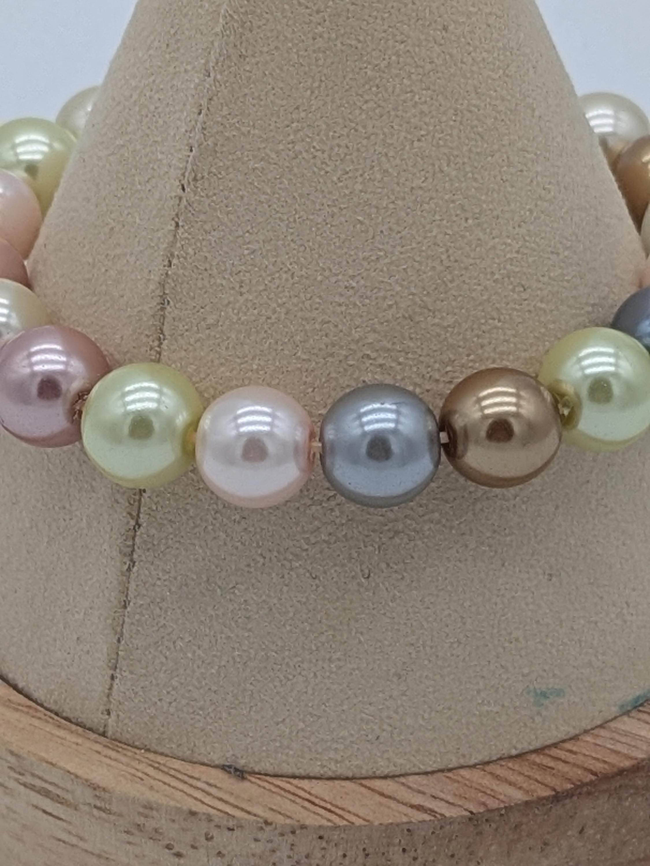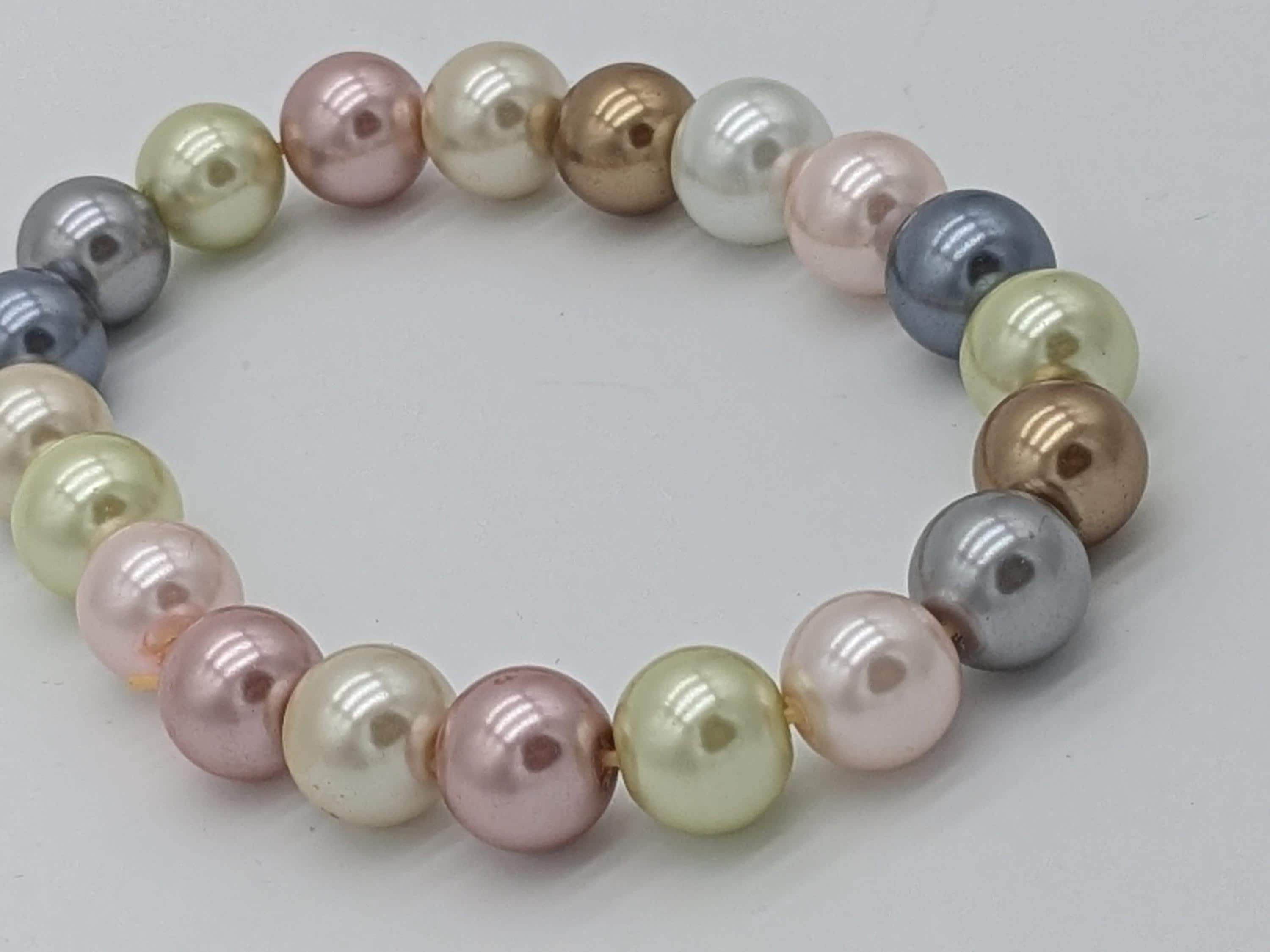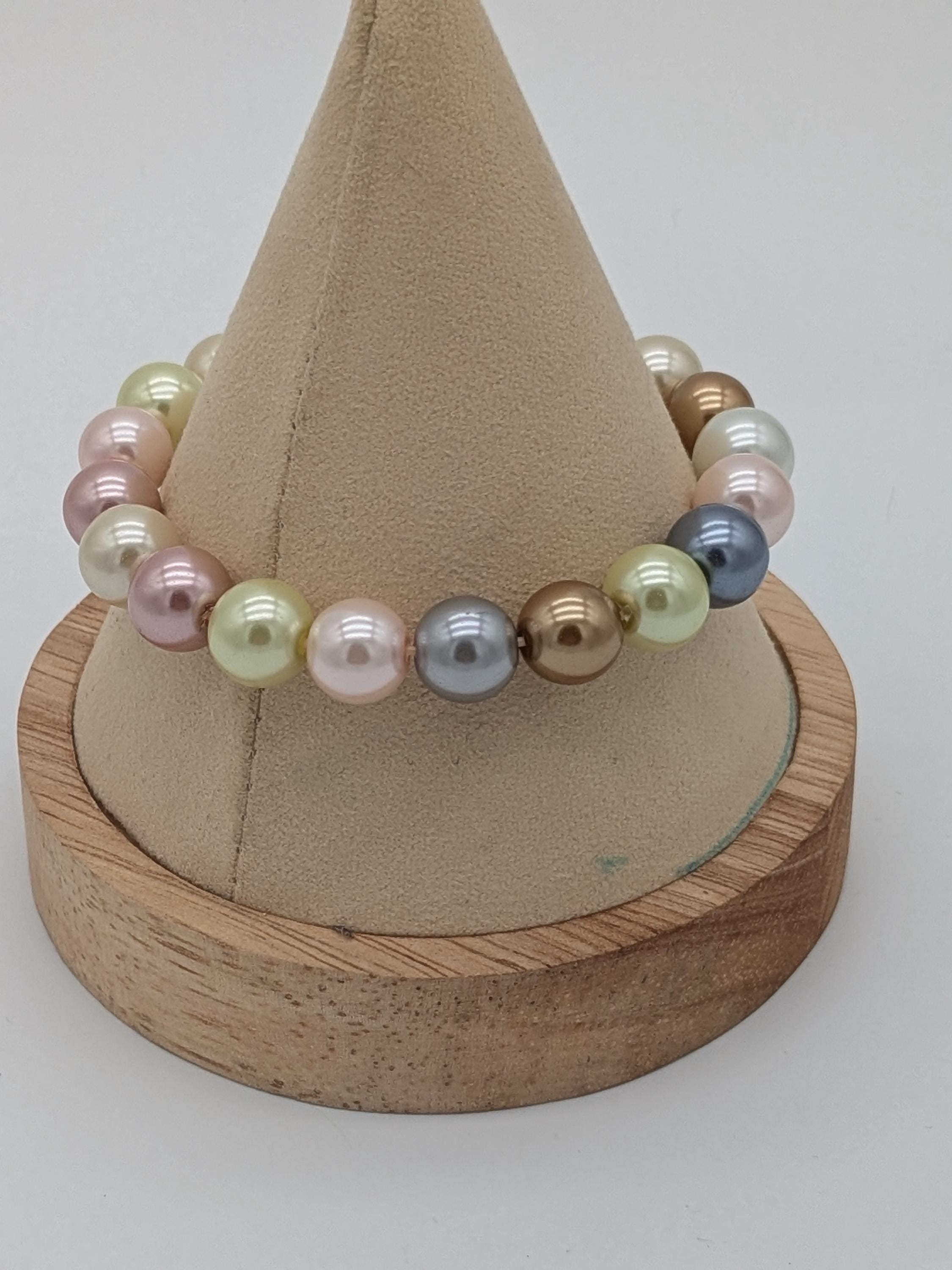 This elegant pastel bracelet features smooth, round faux pearls in soft hues of pink, gold, blue, green, and cream. Designed with a flexible stretch band for a comfortable fit, it adds a touch of timeless charm and versatility to any look—perfect for daily wear or special occasions.
