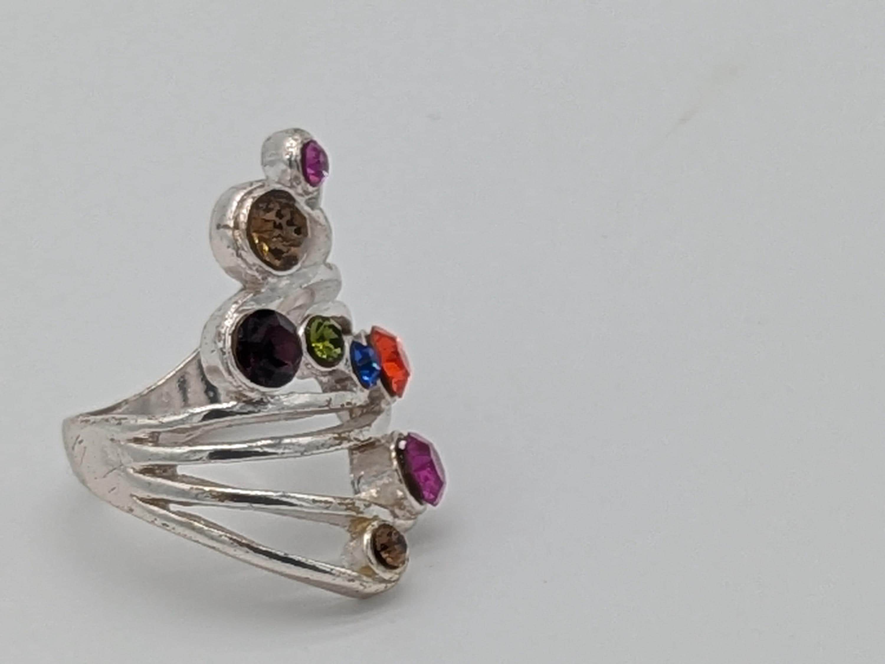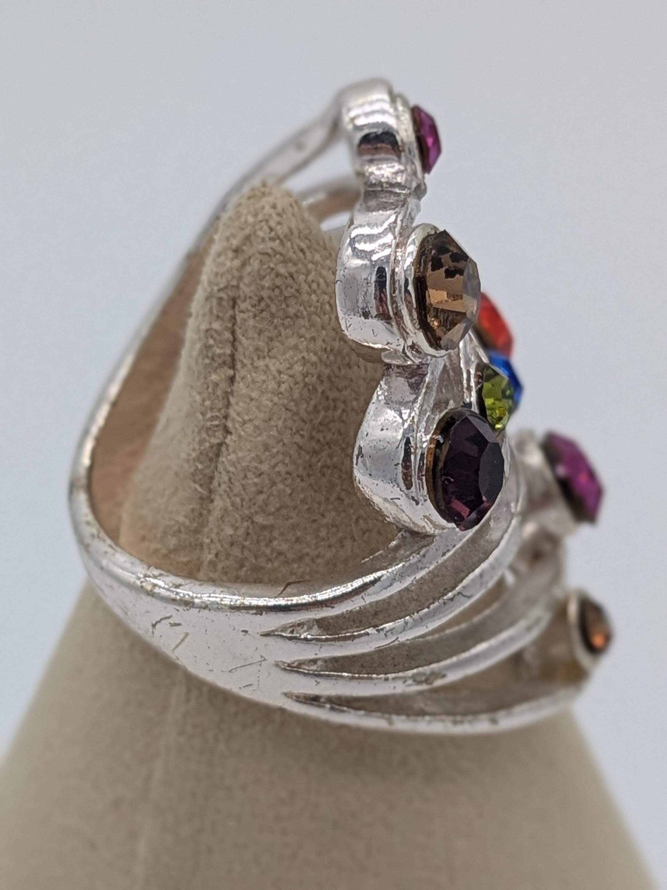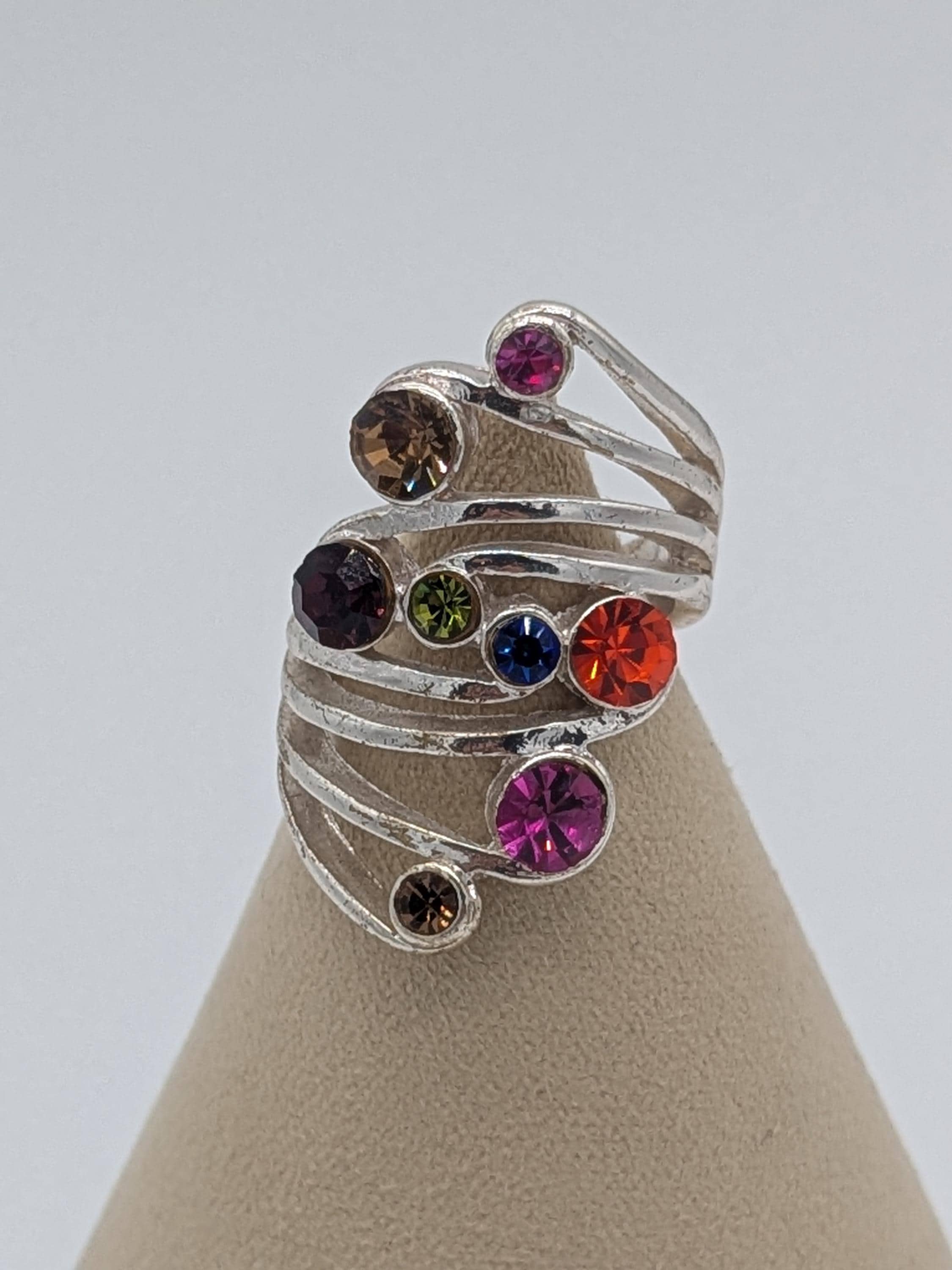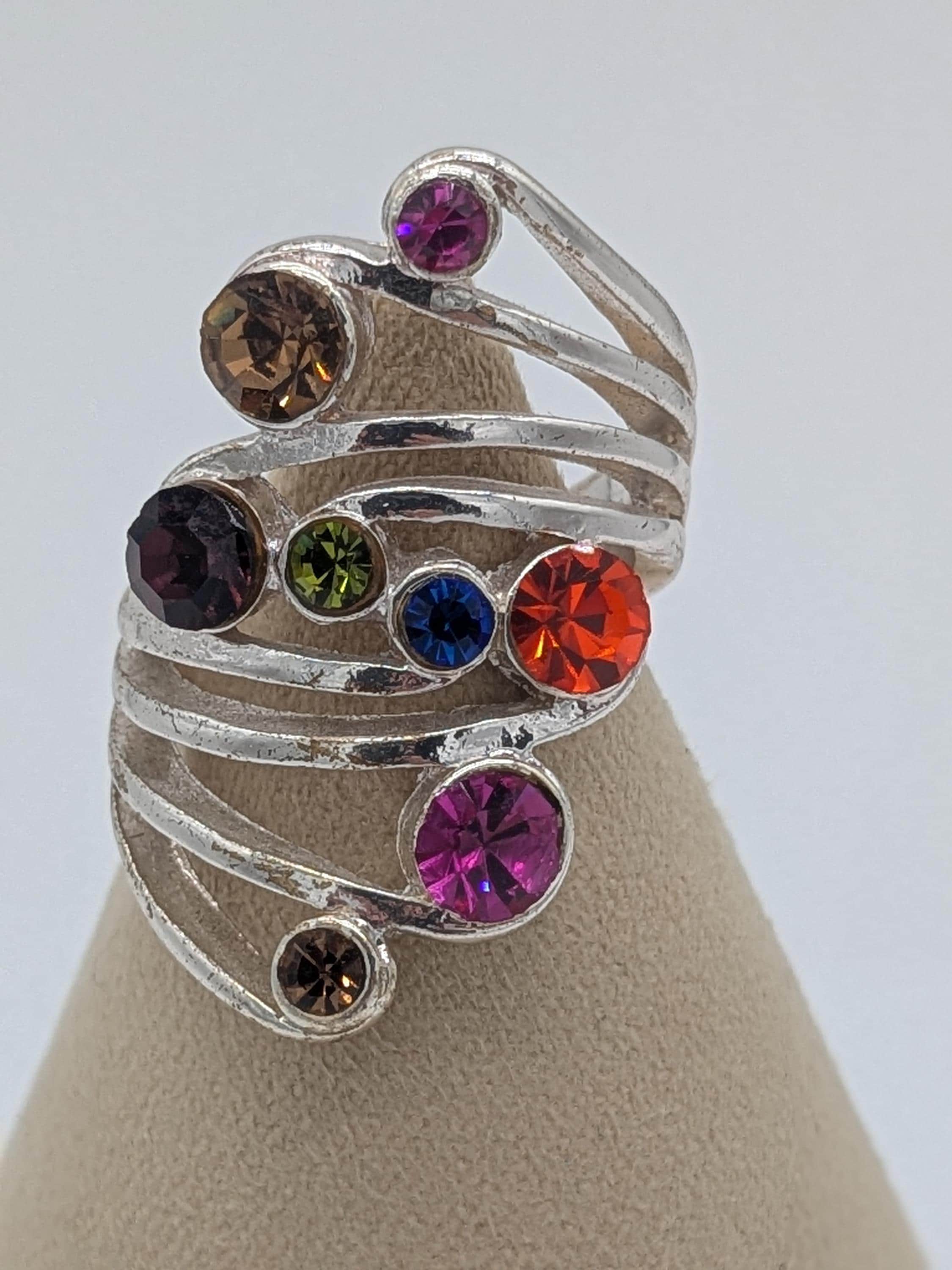 This vibrant swirl ring features a stunning array of multi-color crystals set in a sleek, modern adjustable band. The rainbow-inspired design brings a playful yet elegant touch to any outfit. Perfect for gifting or adding a pop of color to your jewelry collection.