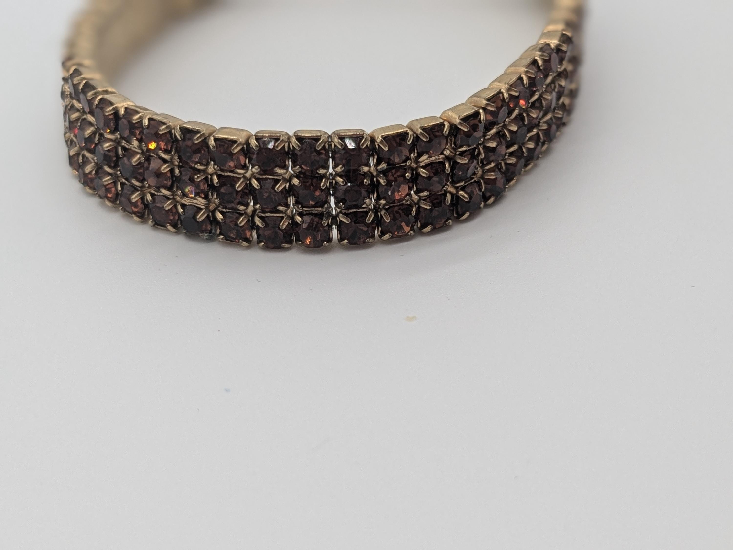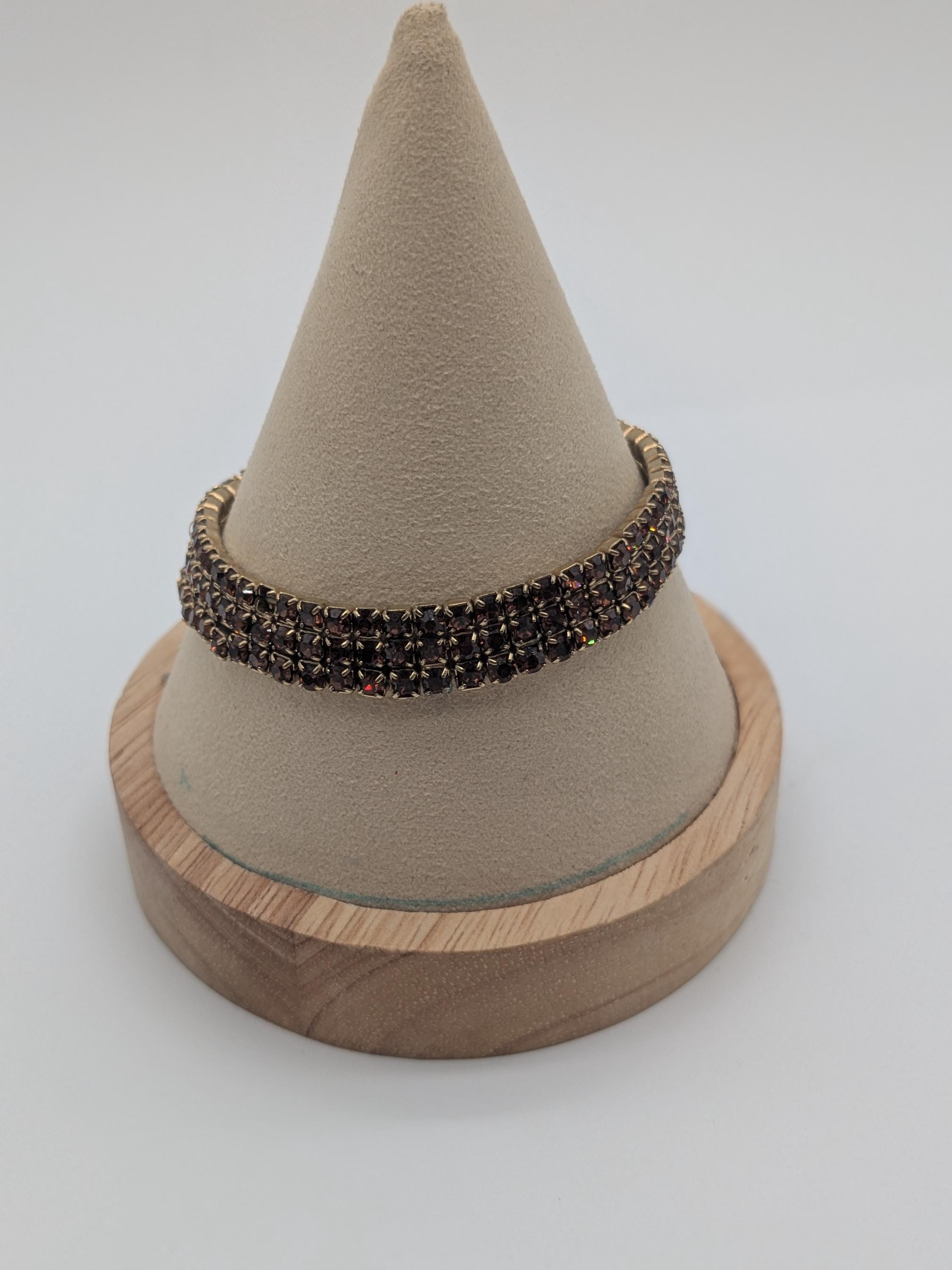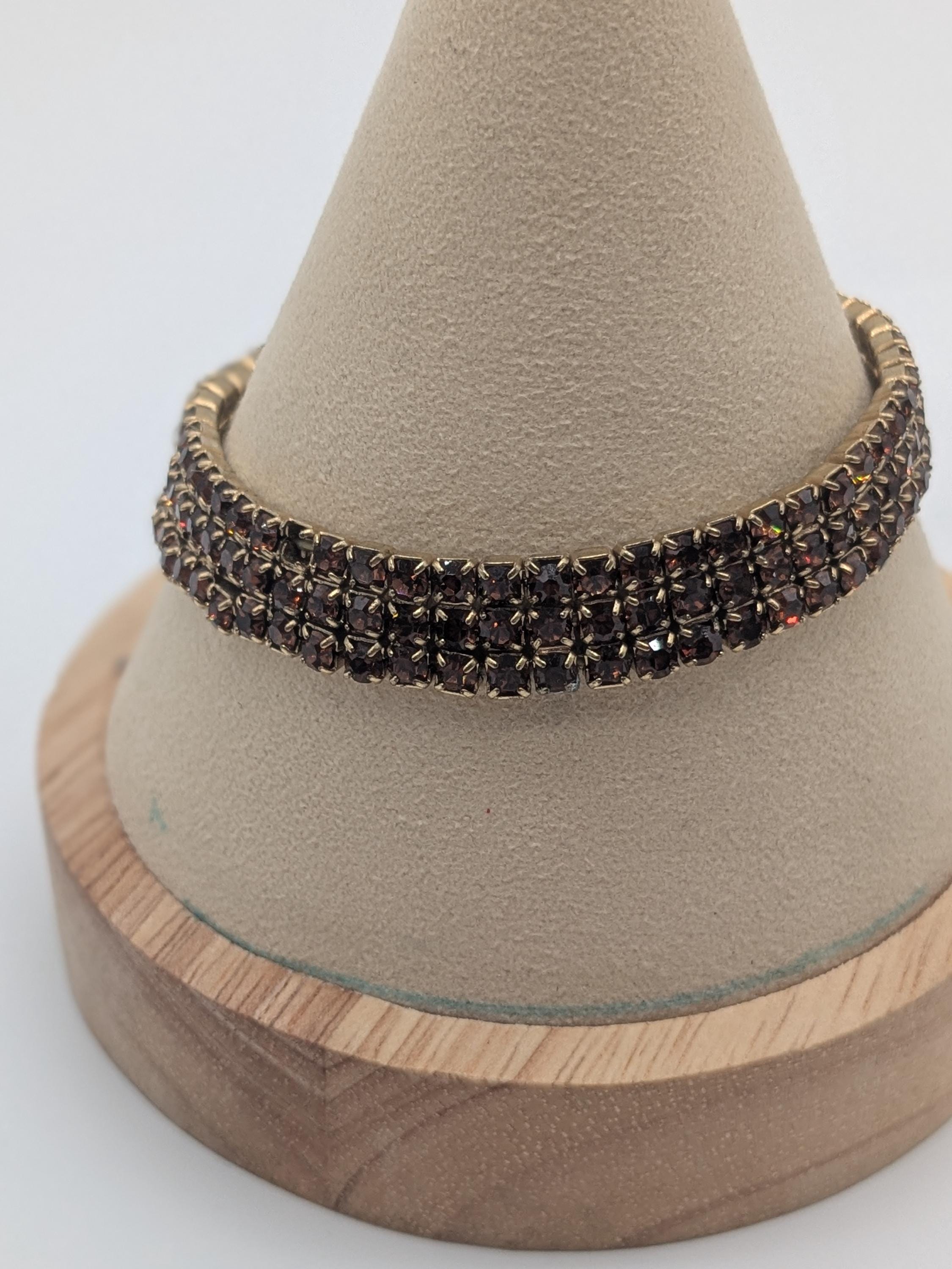 This elegant vintage-inspired stretch bracelet features rows of deep brown rhinestones set in a flexible band, creating a timeless sparkle. Perfect for both casual and evening wear, it adds a touch of retro glamour to any outfit.