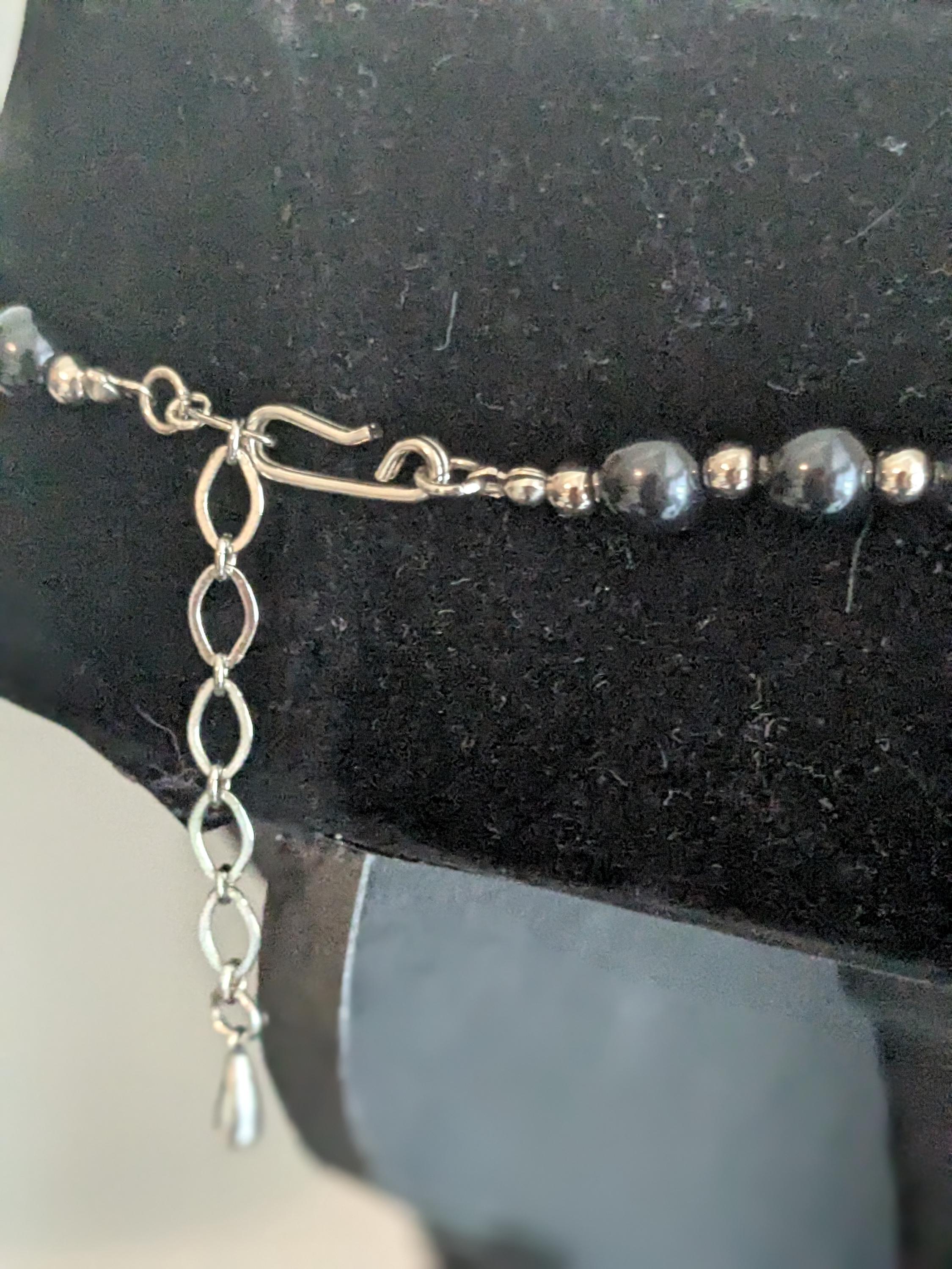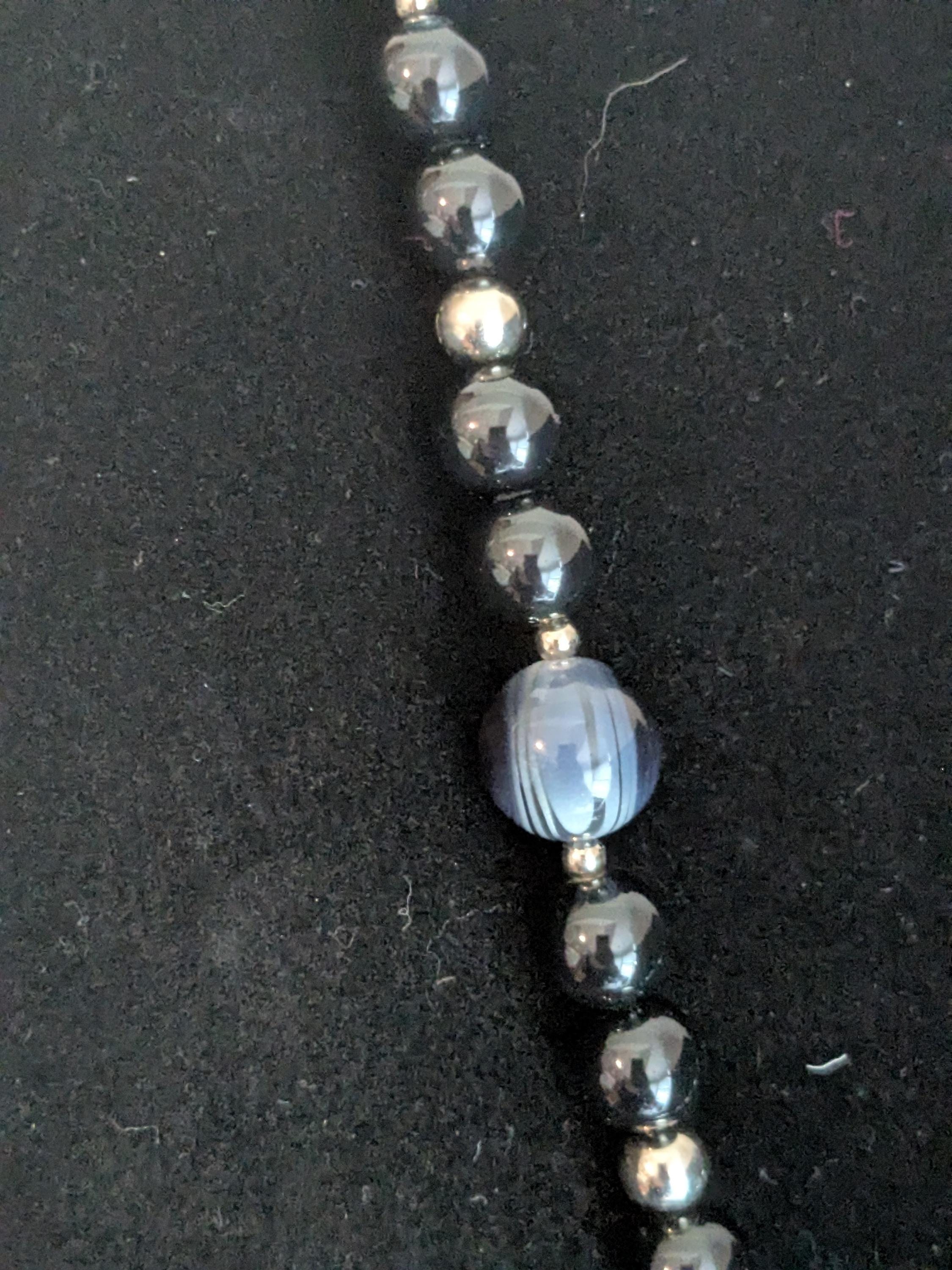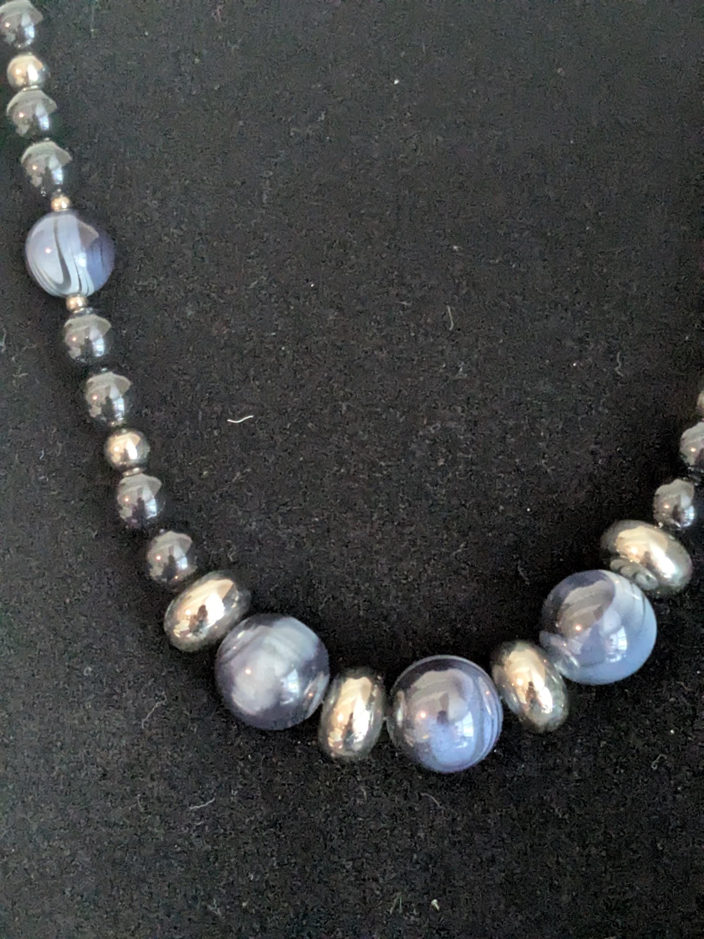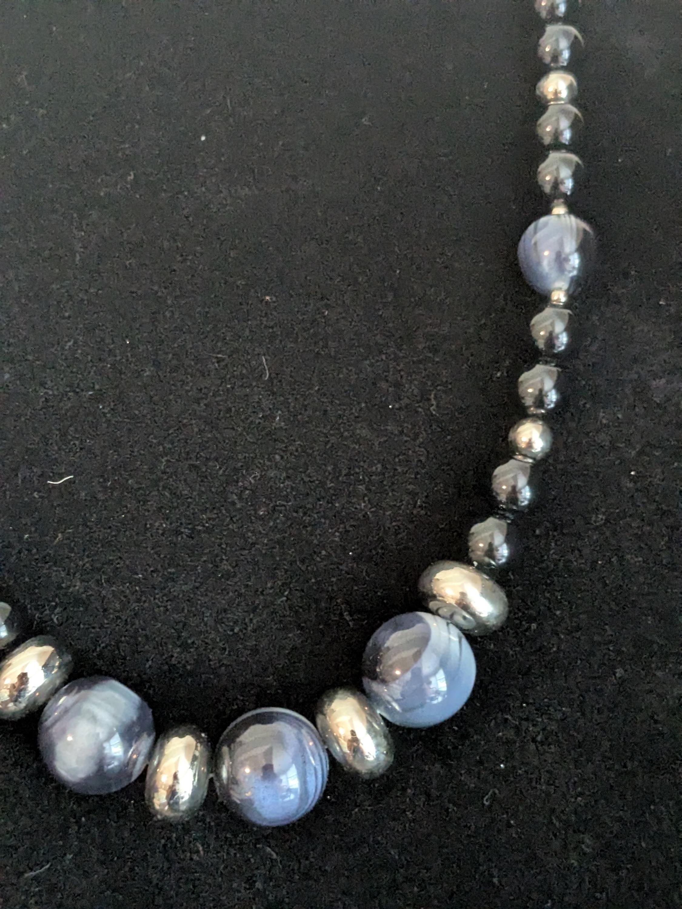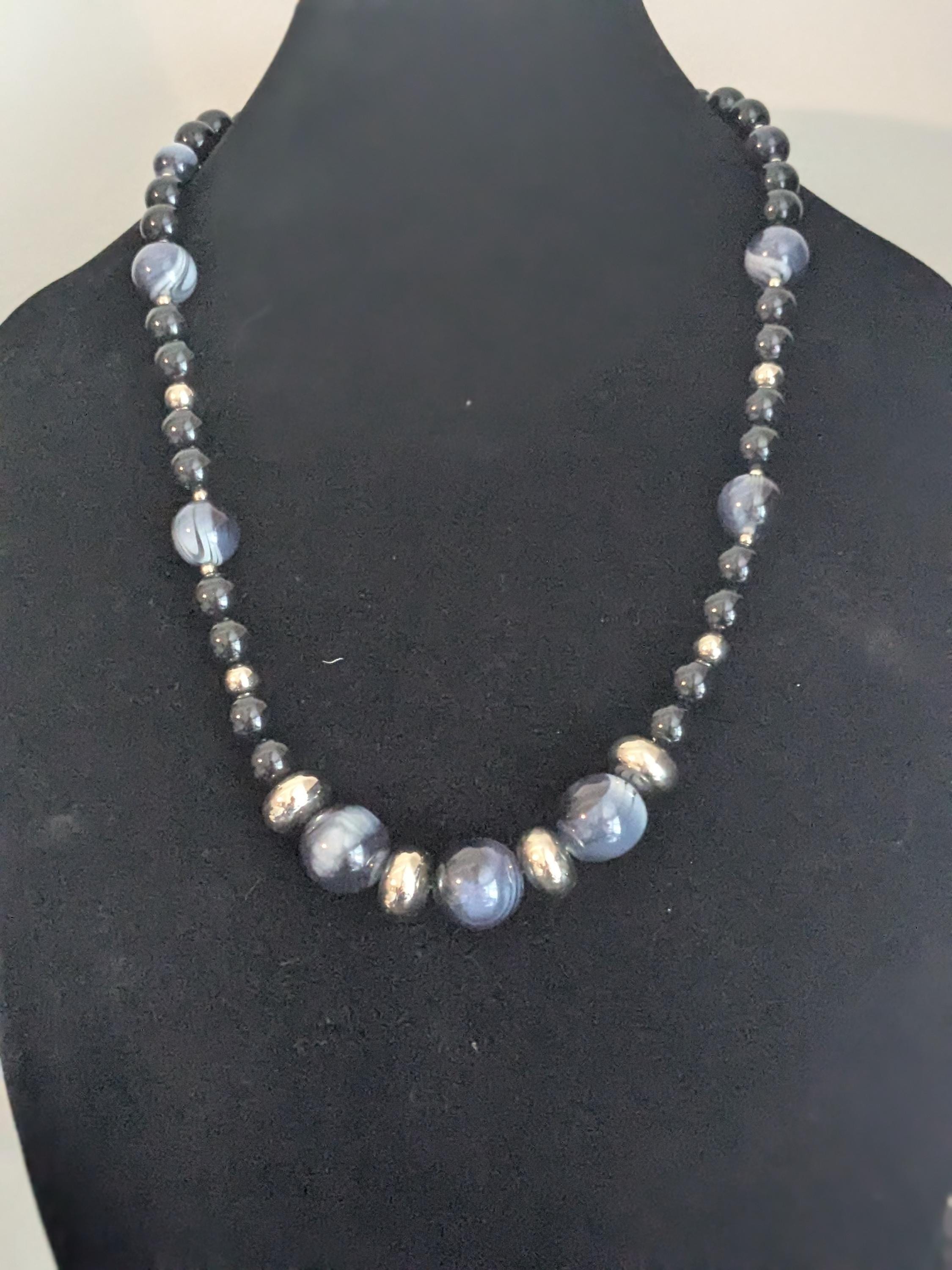 Elegant and timeless, this midnight blue beaded necklace features glossy marbled beads with metallic accents. The smooth, graduated design creates a classic silhouette perfect for both casual and formal occasions. A versatile statement piece that adds a touch of sophistication to any outfit.
