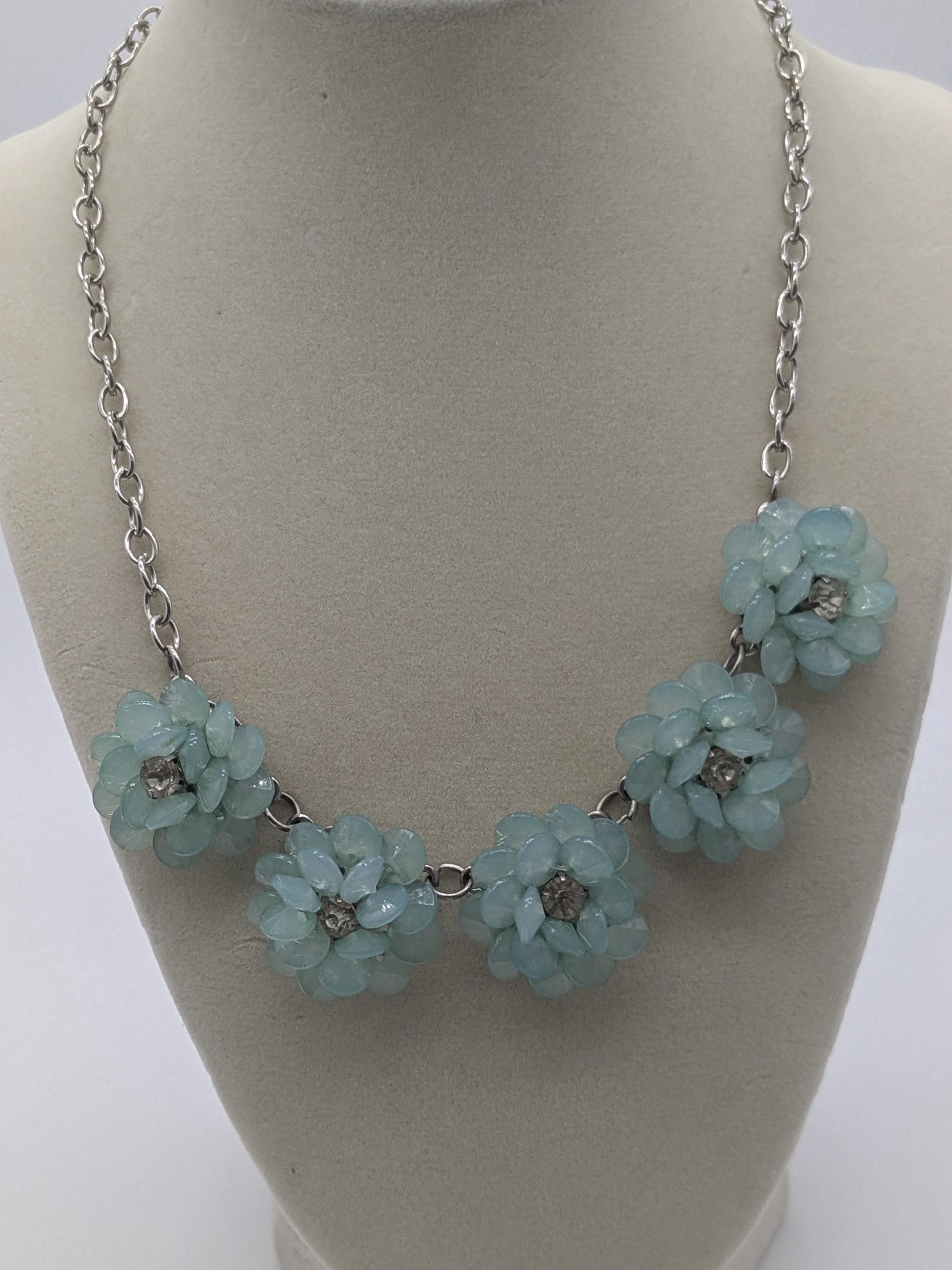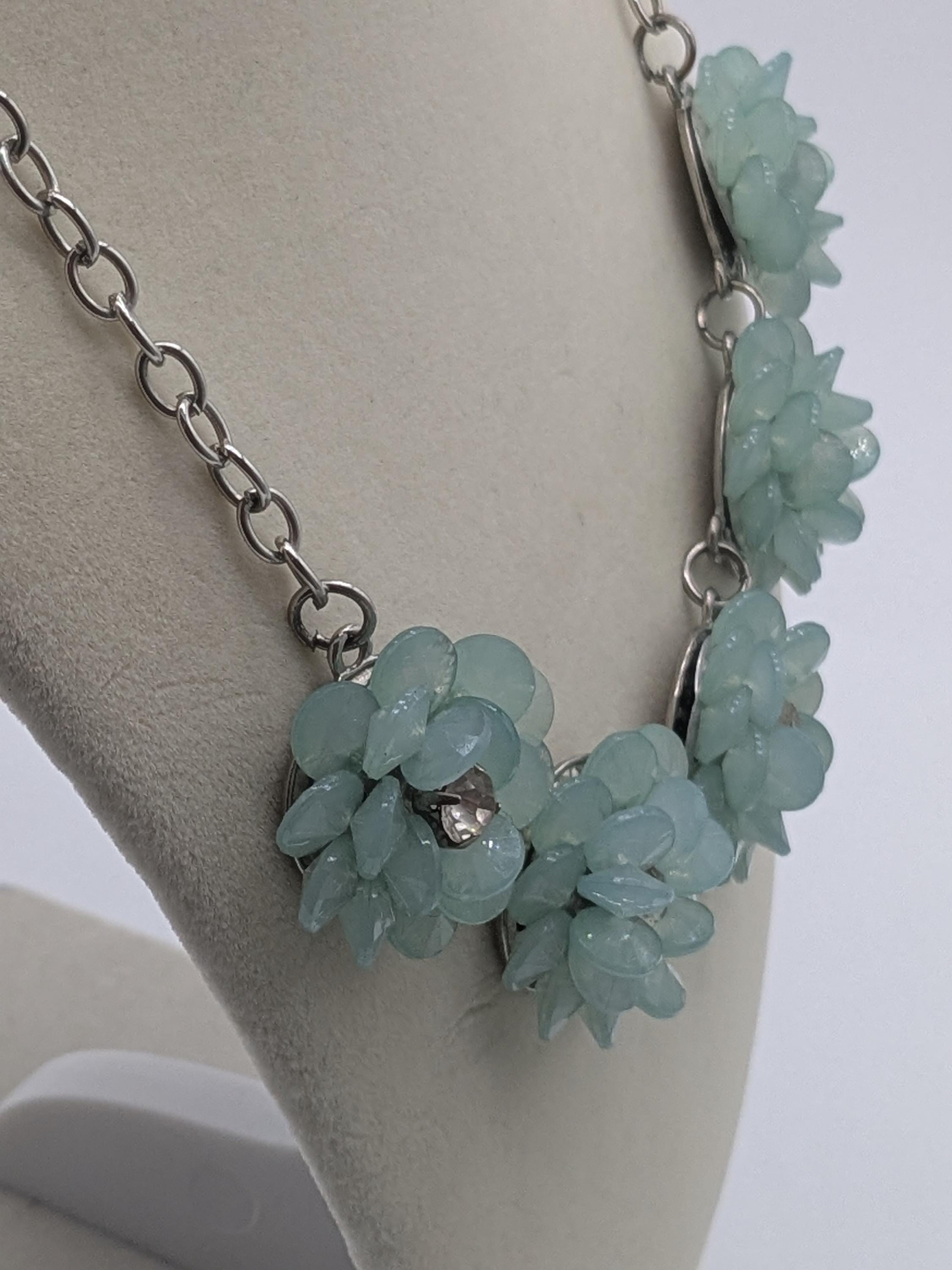 This stunning mint flower statement necklace features five delicate light blue floral clusters made of beaded petals. A perfect blend of elegance and charm, this choker-style necklace adds a refreshing touch to any outfit—ideal for spring weddings, parties, or everyday chic style.