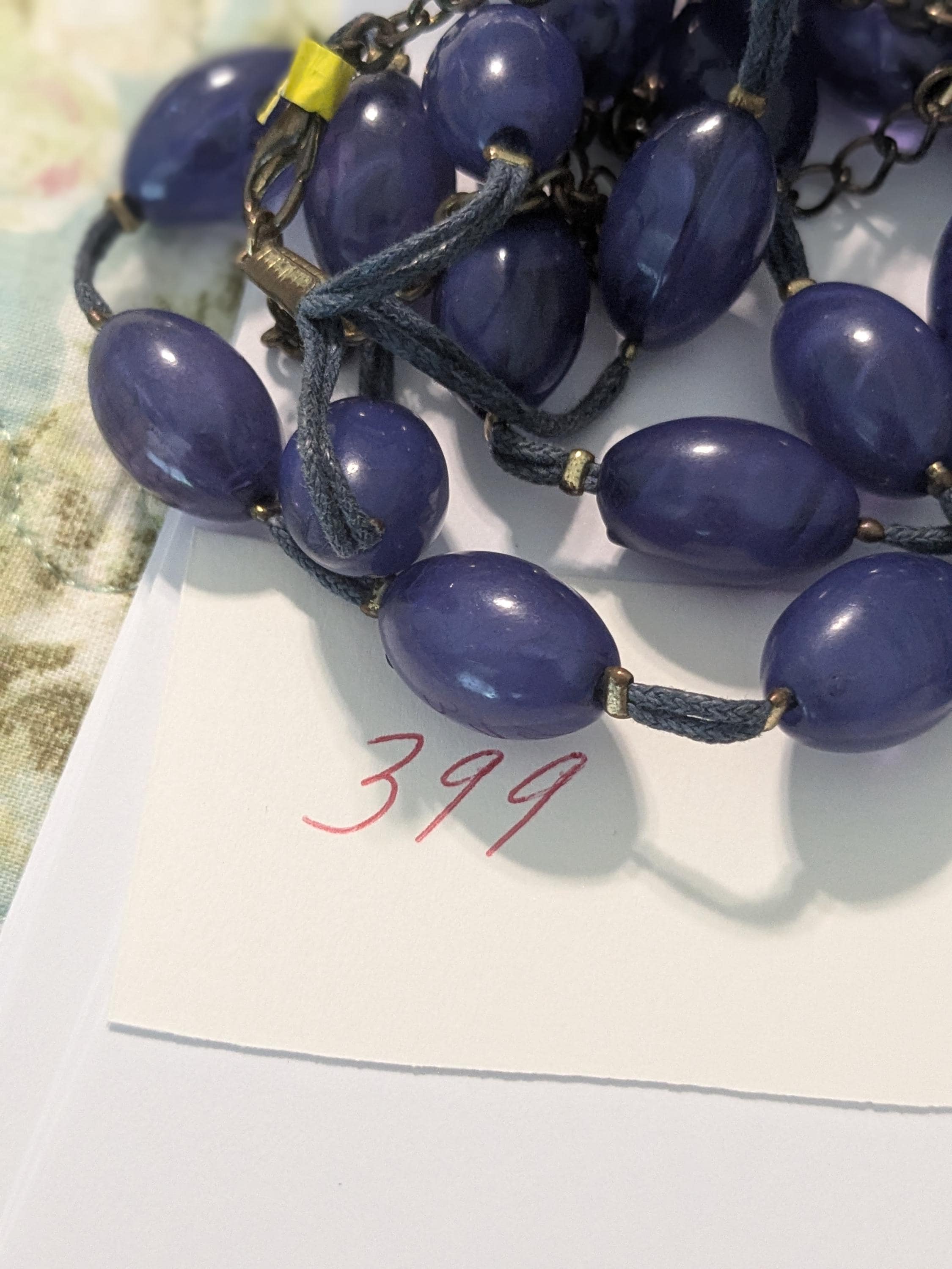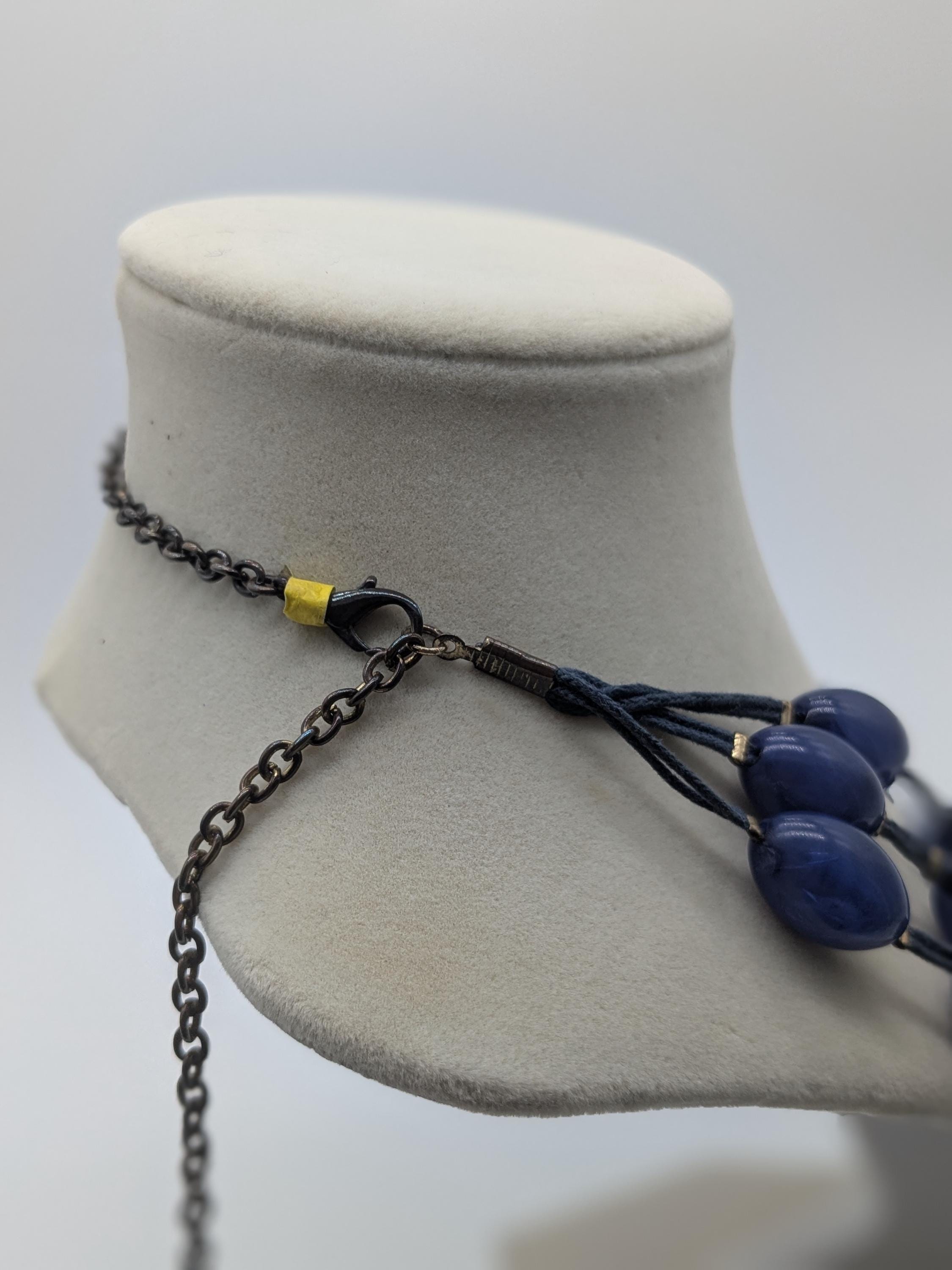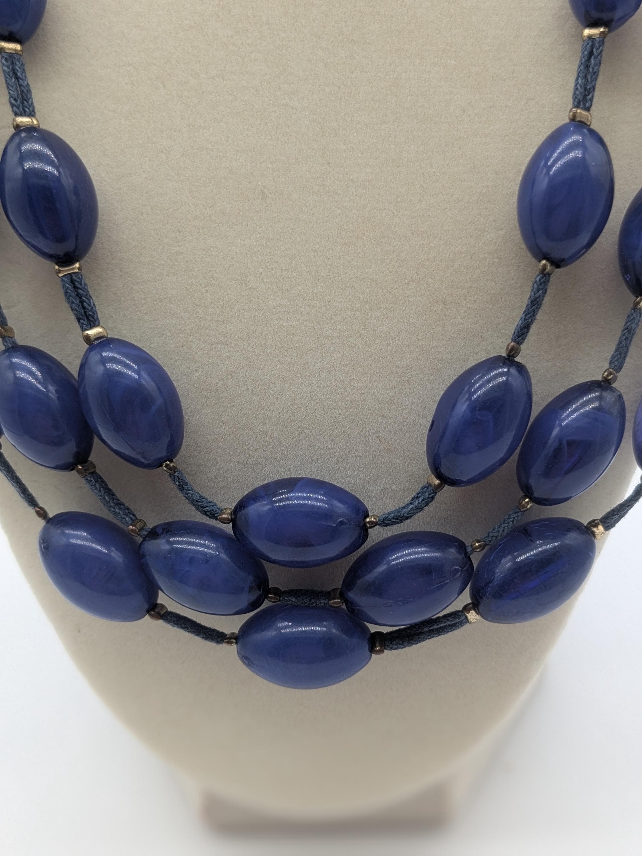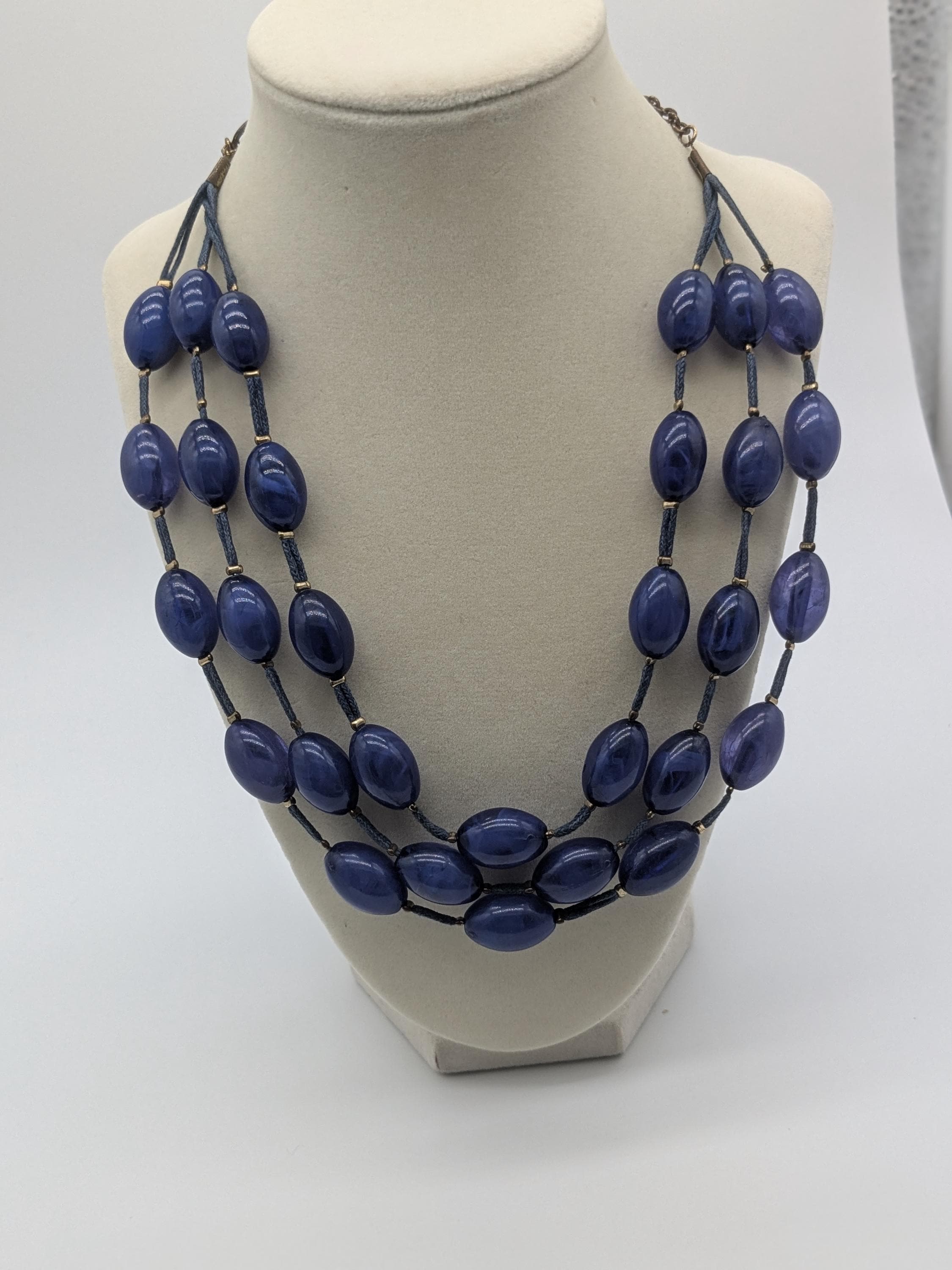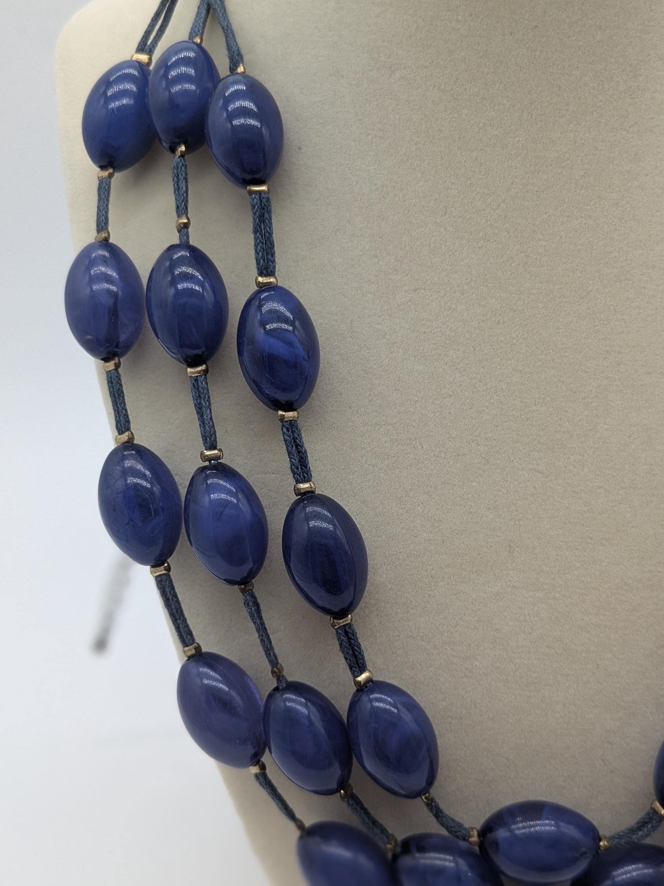 This elegant three-strand necklace features glossy navy blue oval beads on a dark cord, creating a bold yet versatile layered look. Perfect for adding a sophisticated touch to both casual and formal outfits.