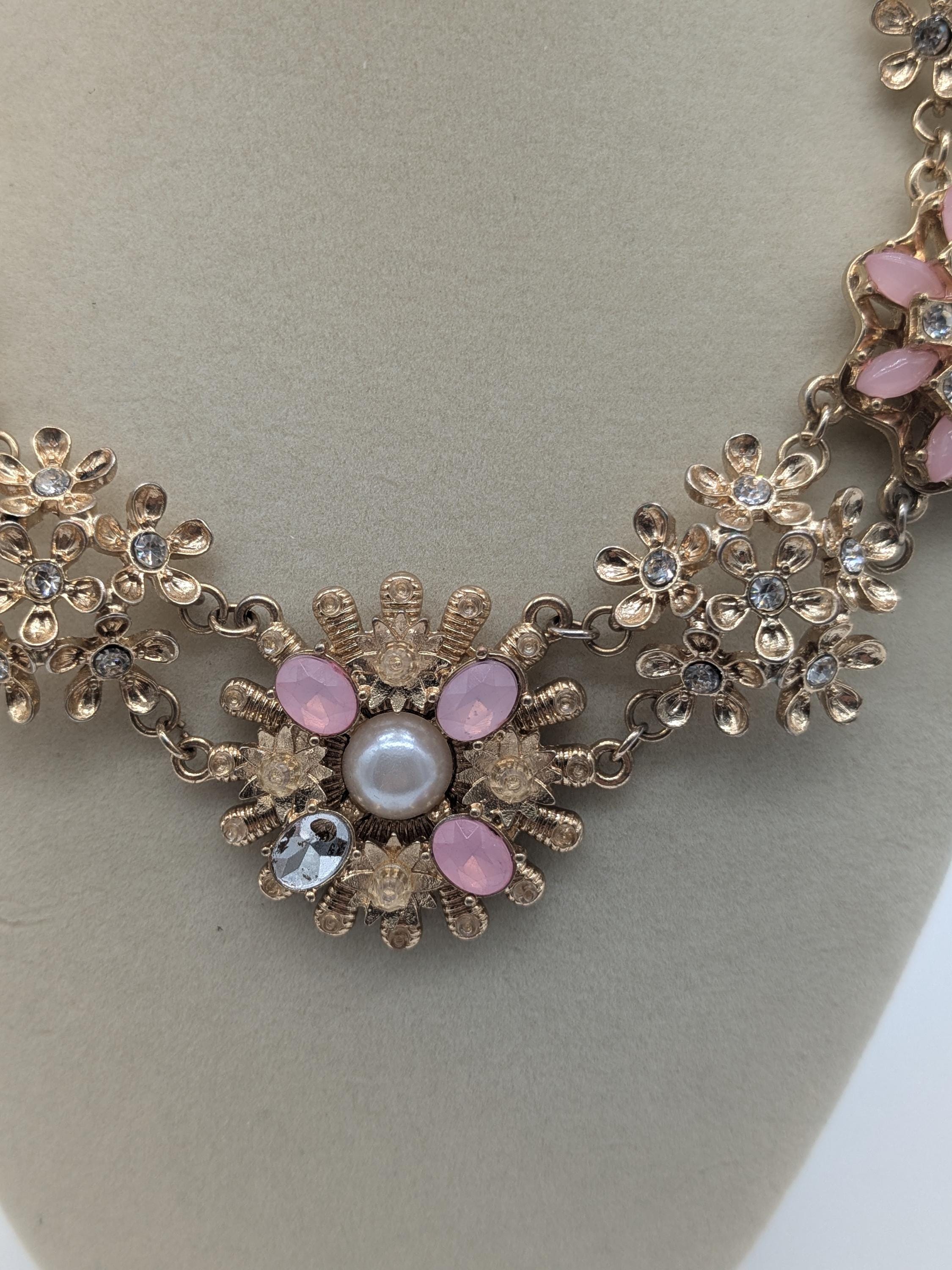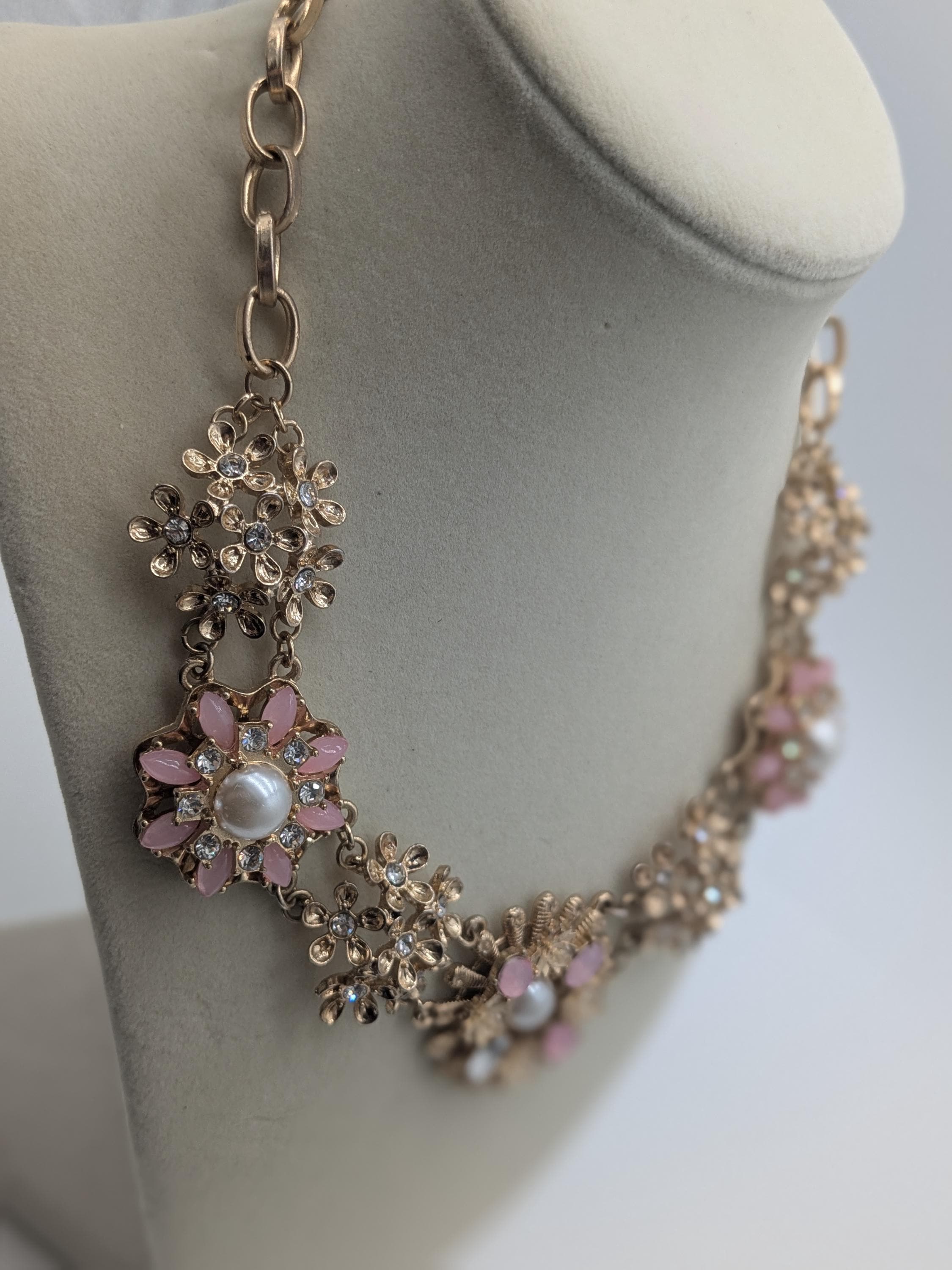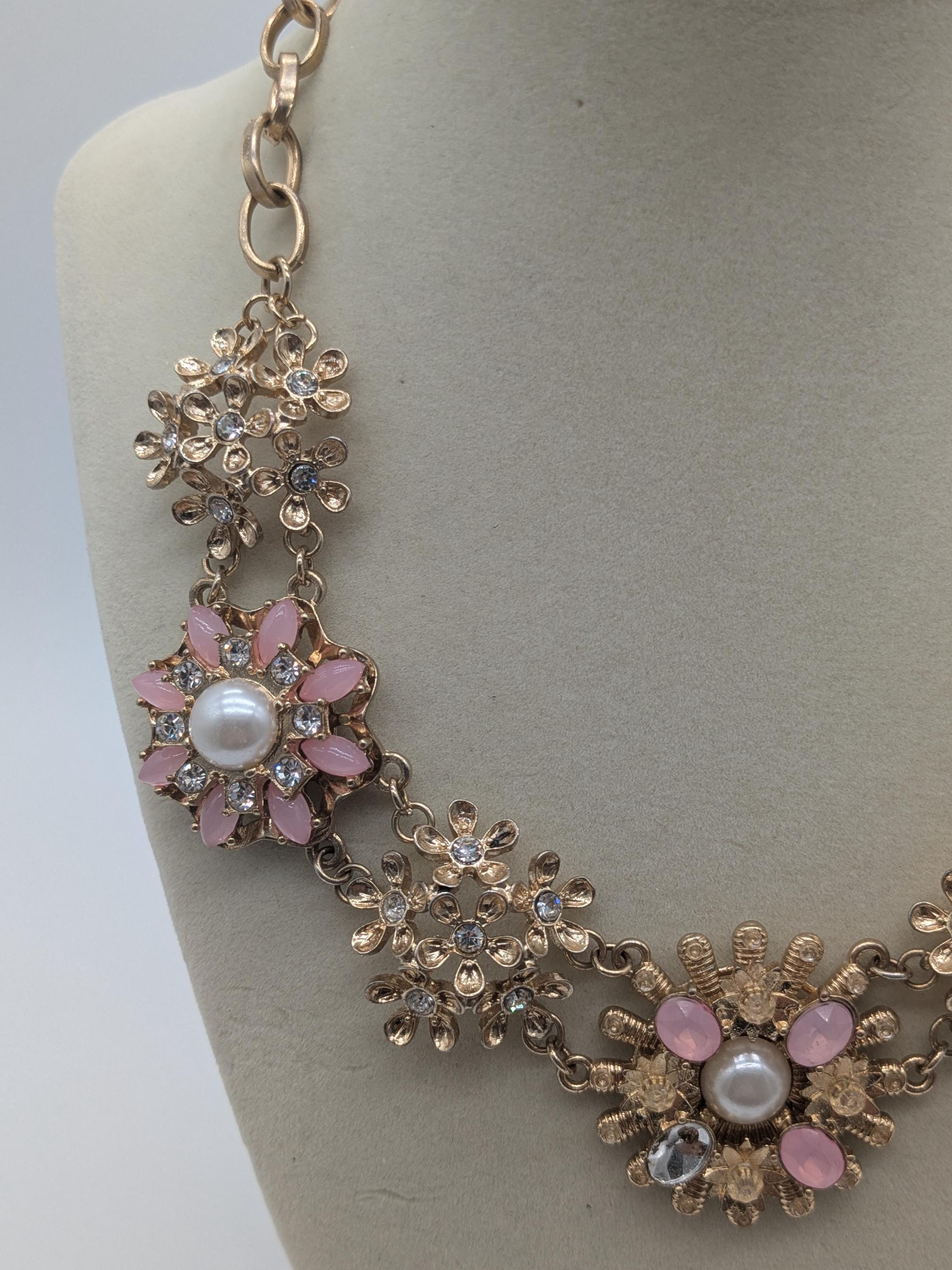 This elegant floral statement necklace features intricate flower clusters with faux pearls, pink petal accents, and shimmering clear crystals. The design radiates vintage charm and timeless beauty, making it perfect for weddings, parties, or a refined everyday look. Lightweight and beautifully crafted to elevate any outfit.