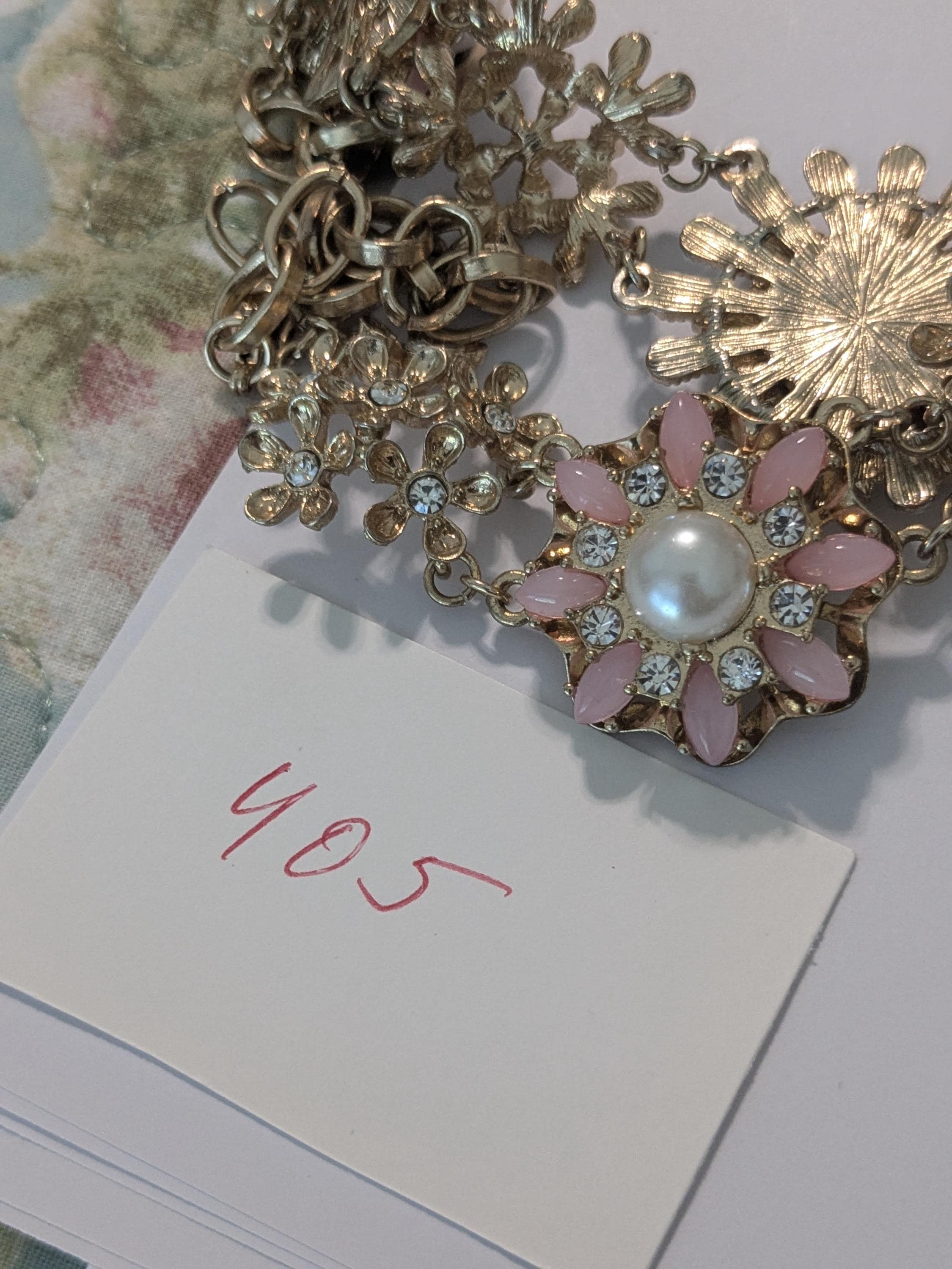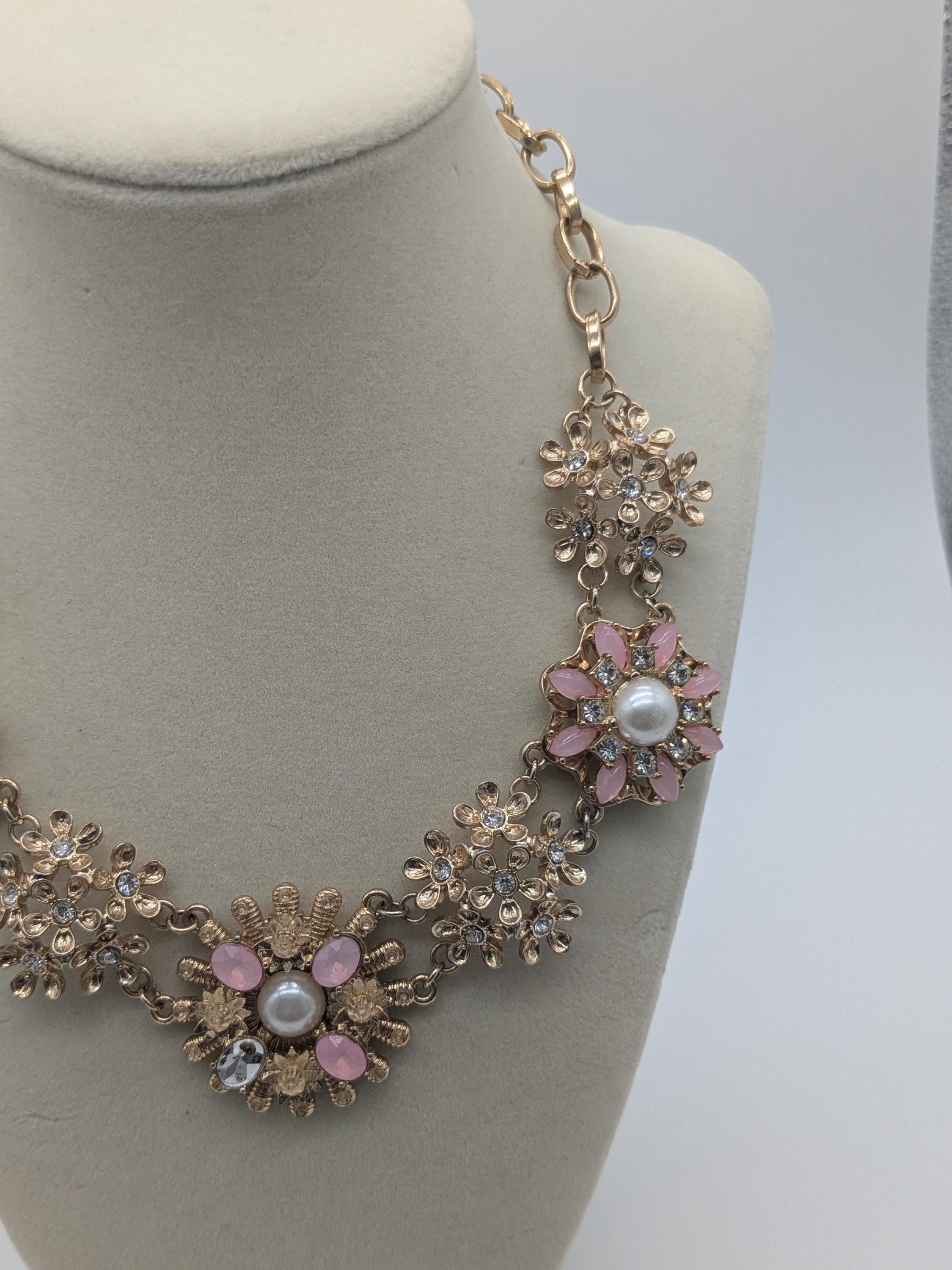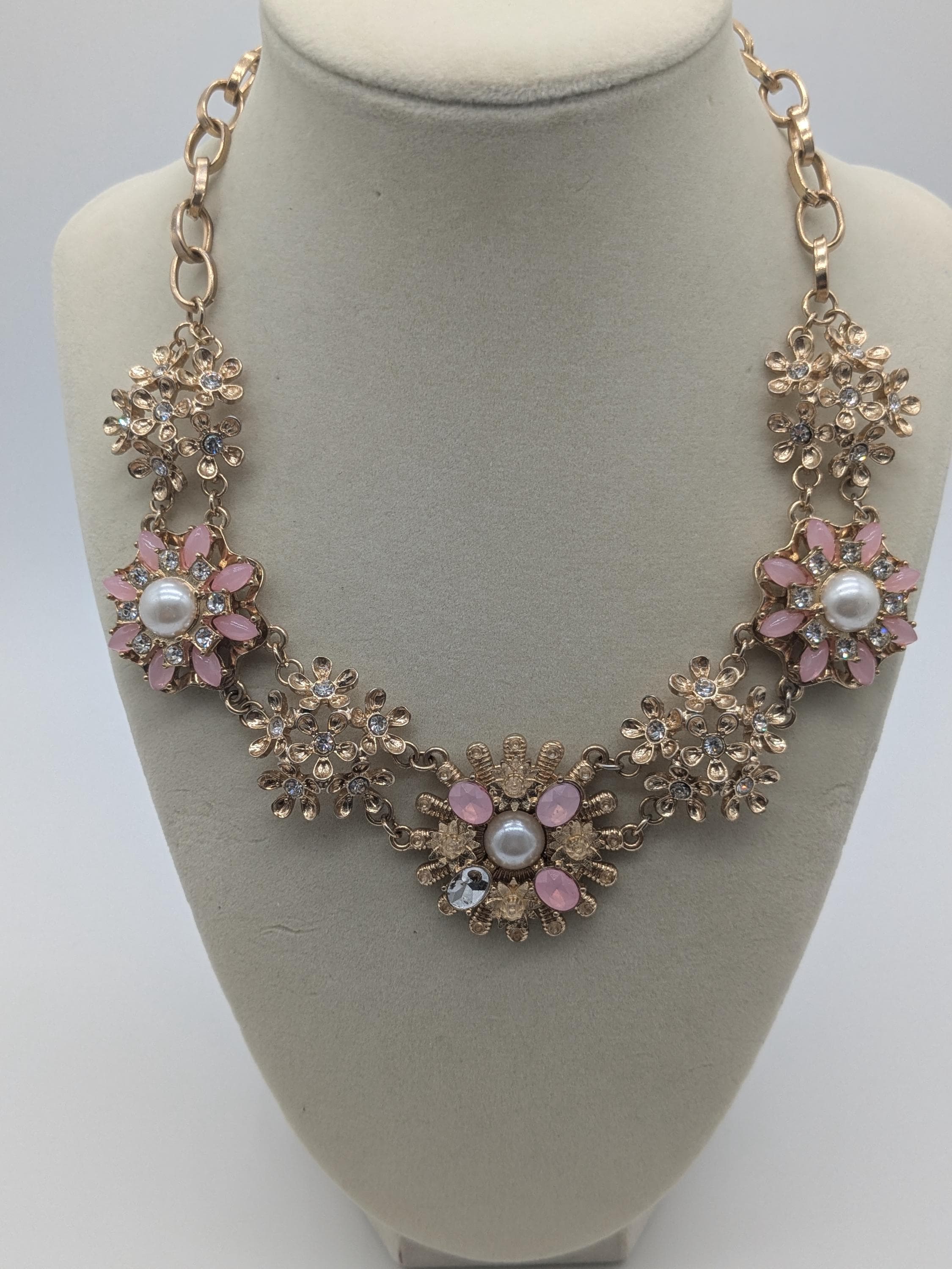 This elegant floral statement necklace features intricate flower clusters with faux pearls, pink petal accents, and shimmering clear crystals. The design radiates vintage charm and timeless beauty, making it perfect for weddings, parties, or a refined everyday look. Lightweight and beautifully crafted to elevate any outfit.