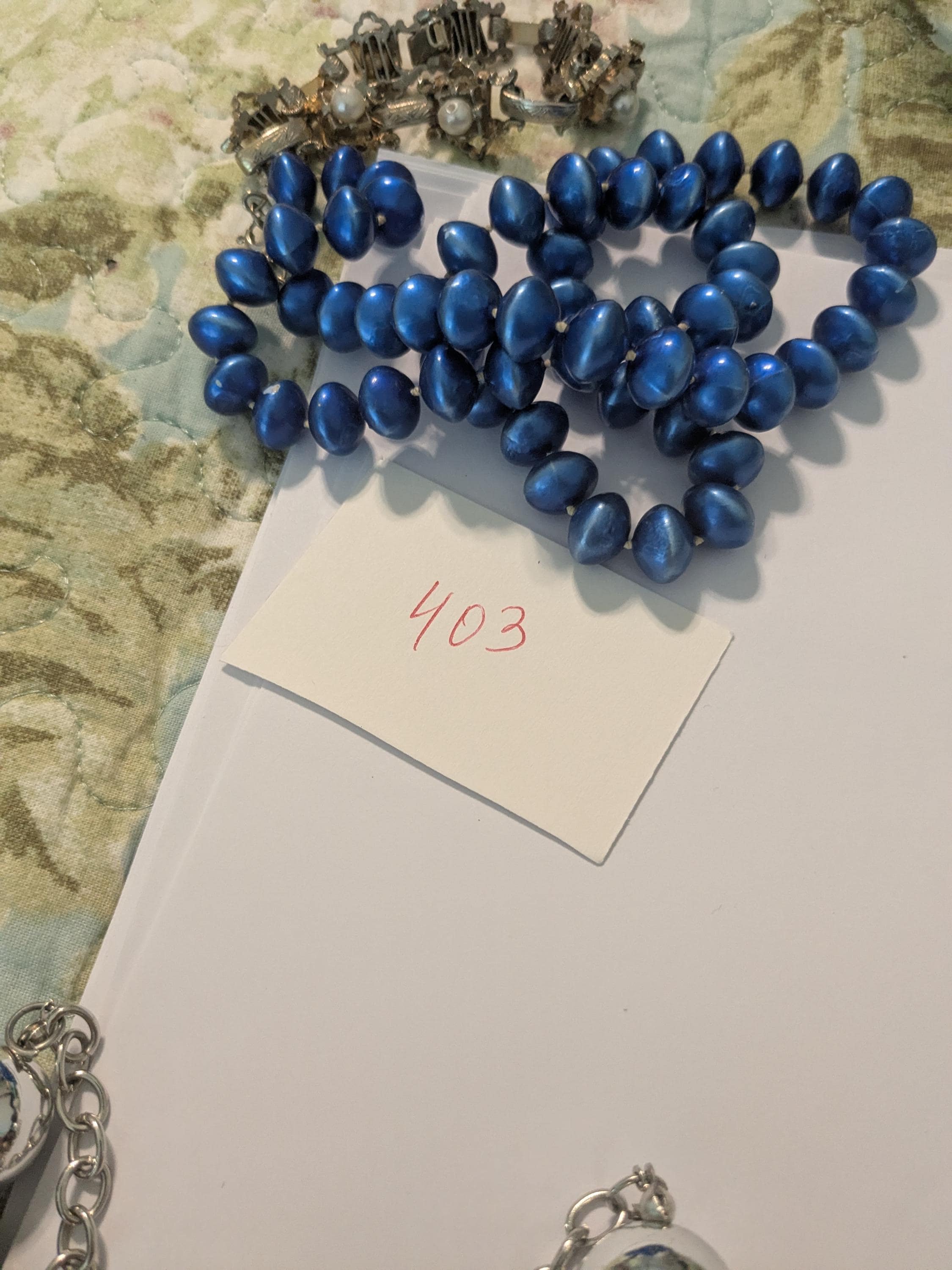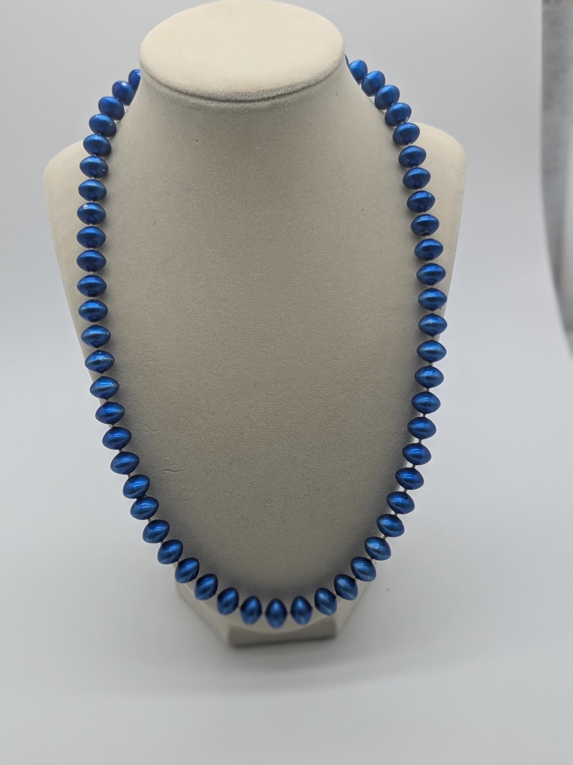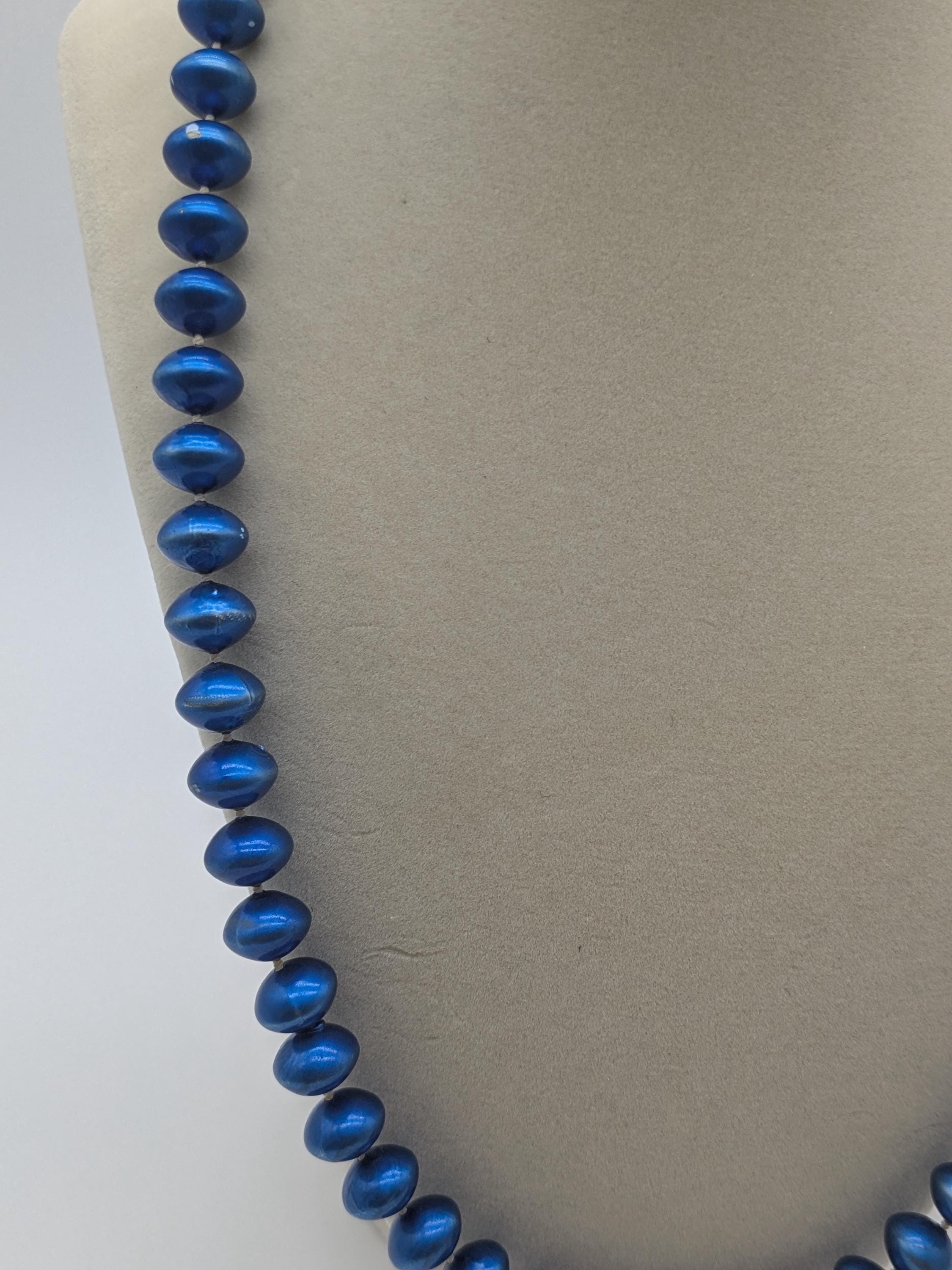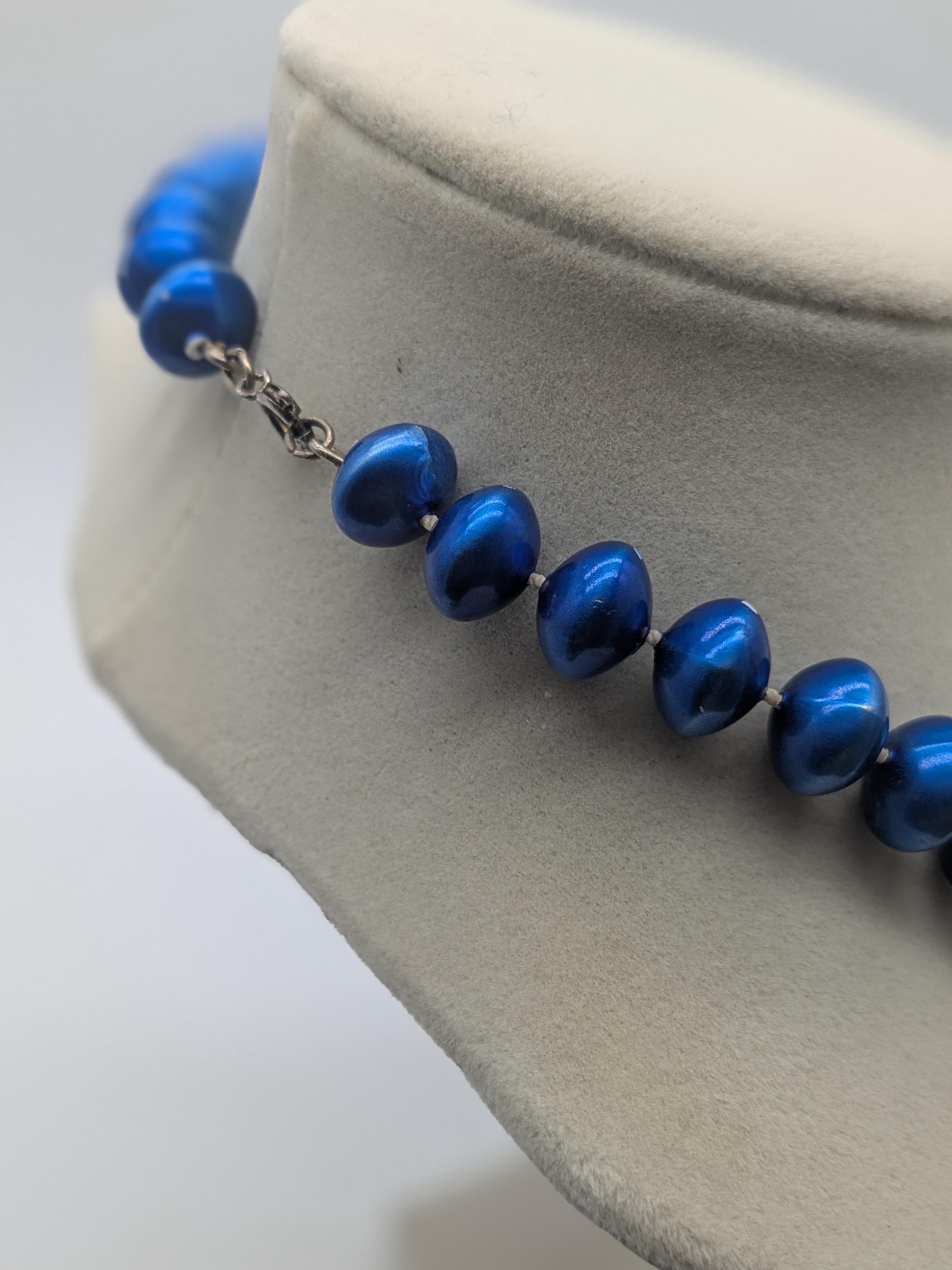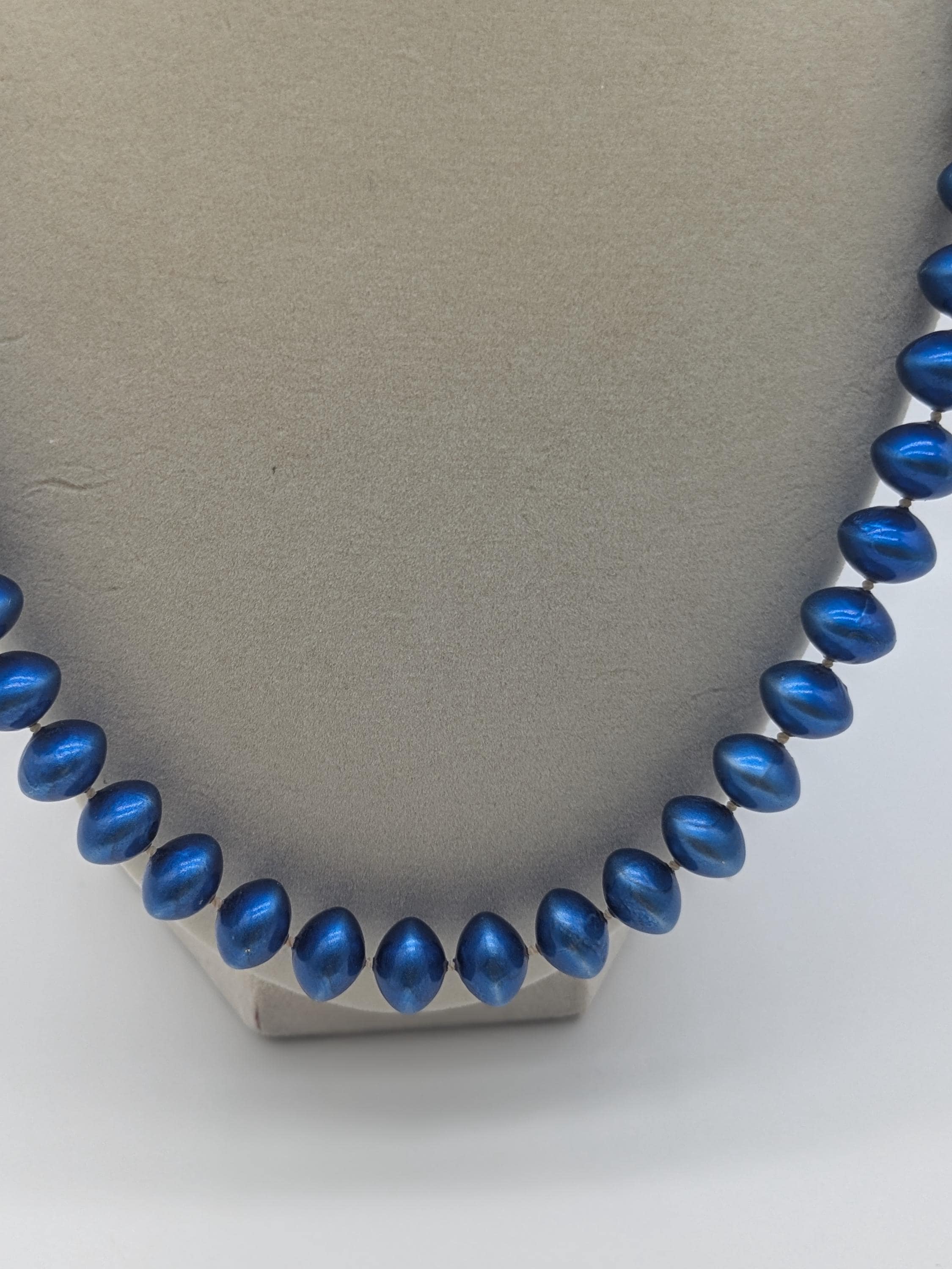 This elegant blue beaded necklace features glossy oval beads with a smooth, reflective finish. Its deep cobalt hue adds a touch of sophistication and charm, perfect for both everyday wear and special occasions. Lightweight and easy to pair with any outfit.