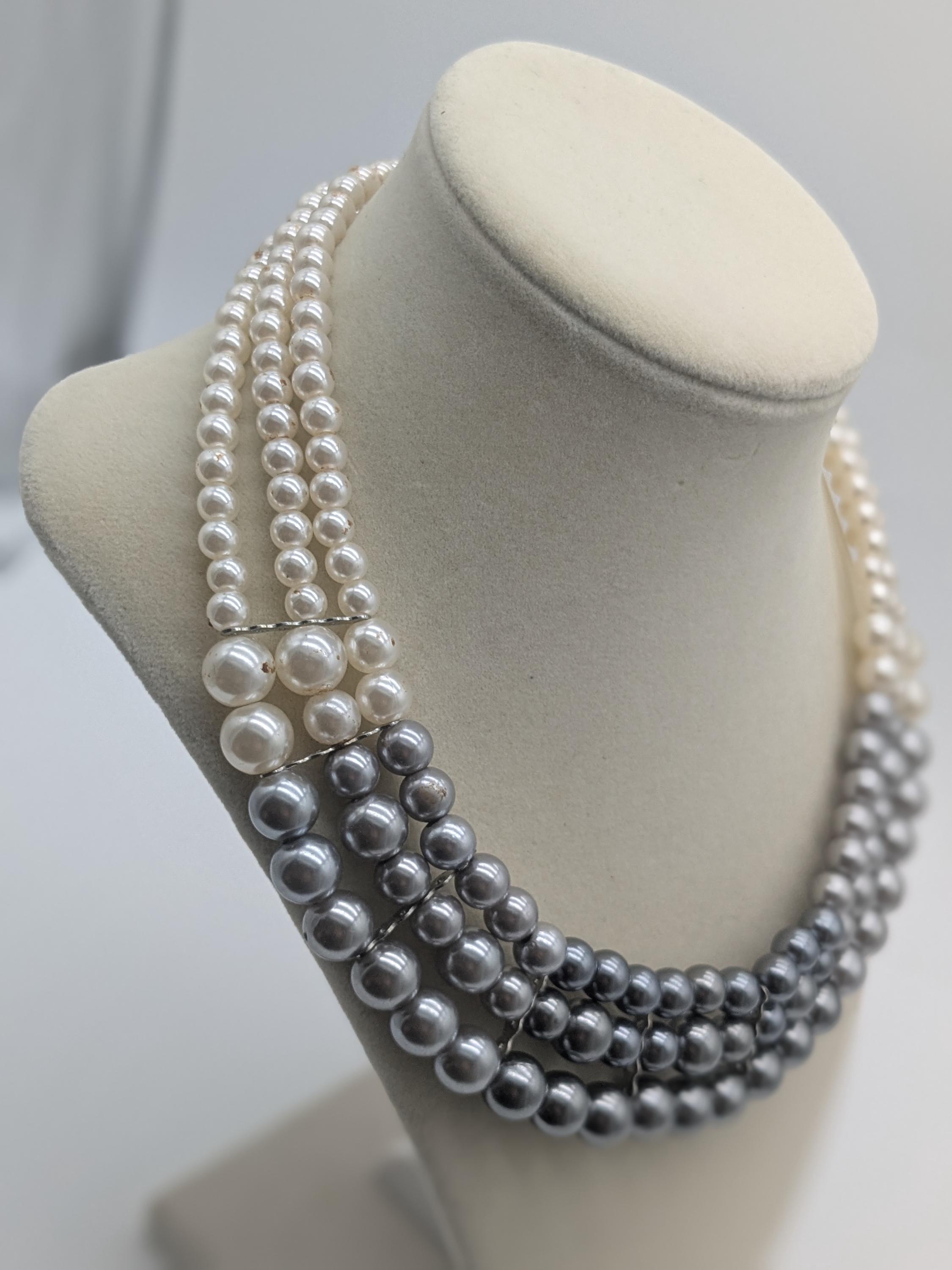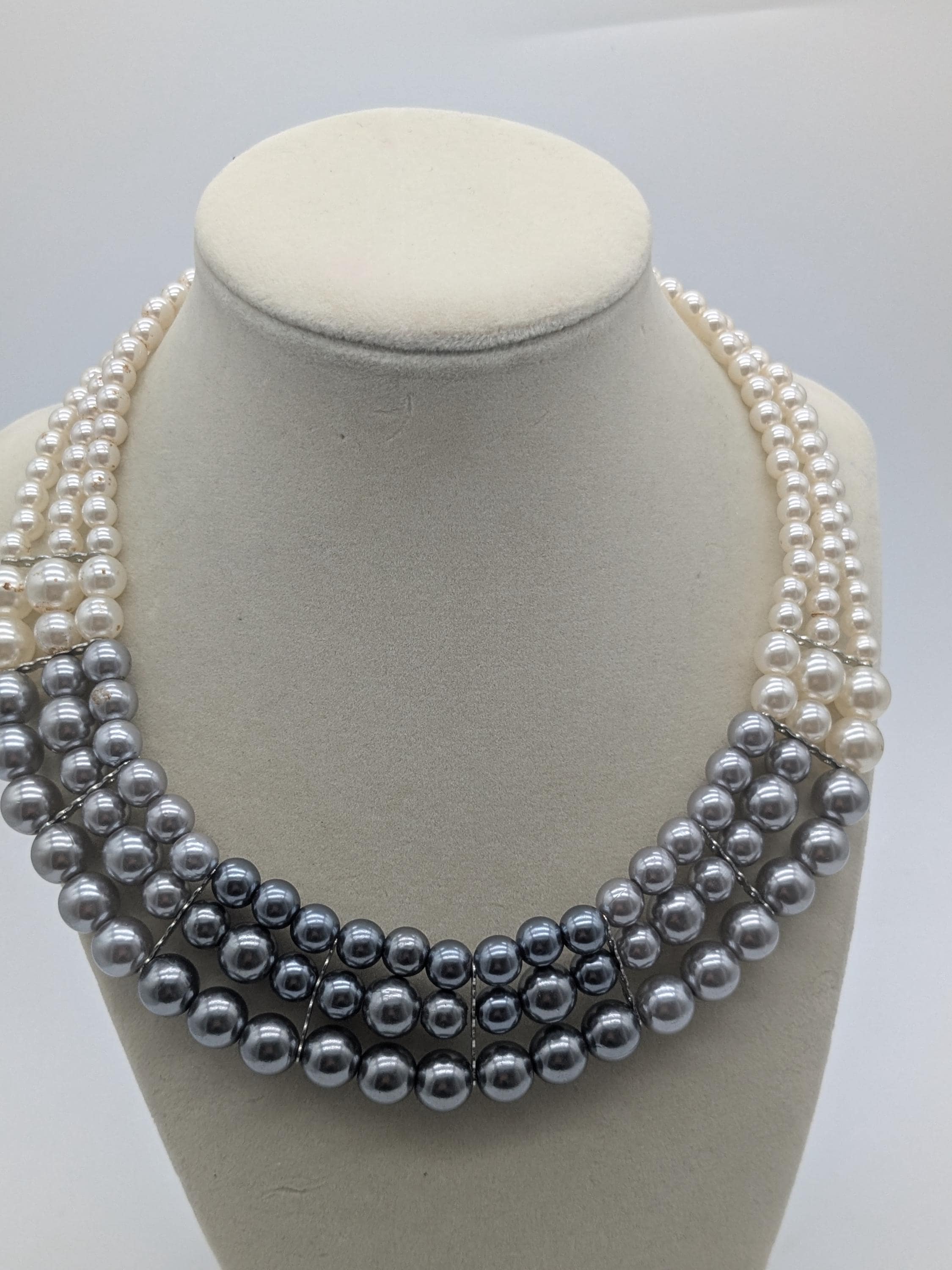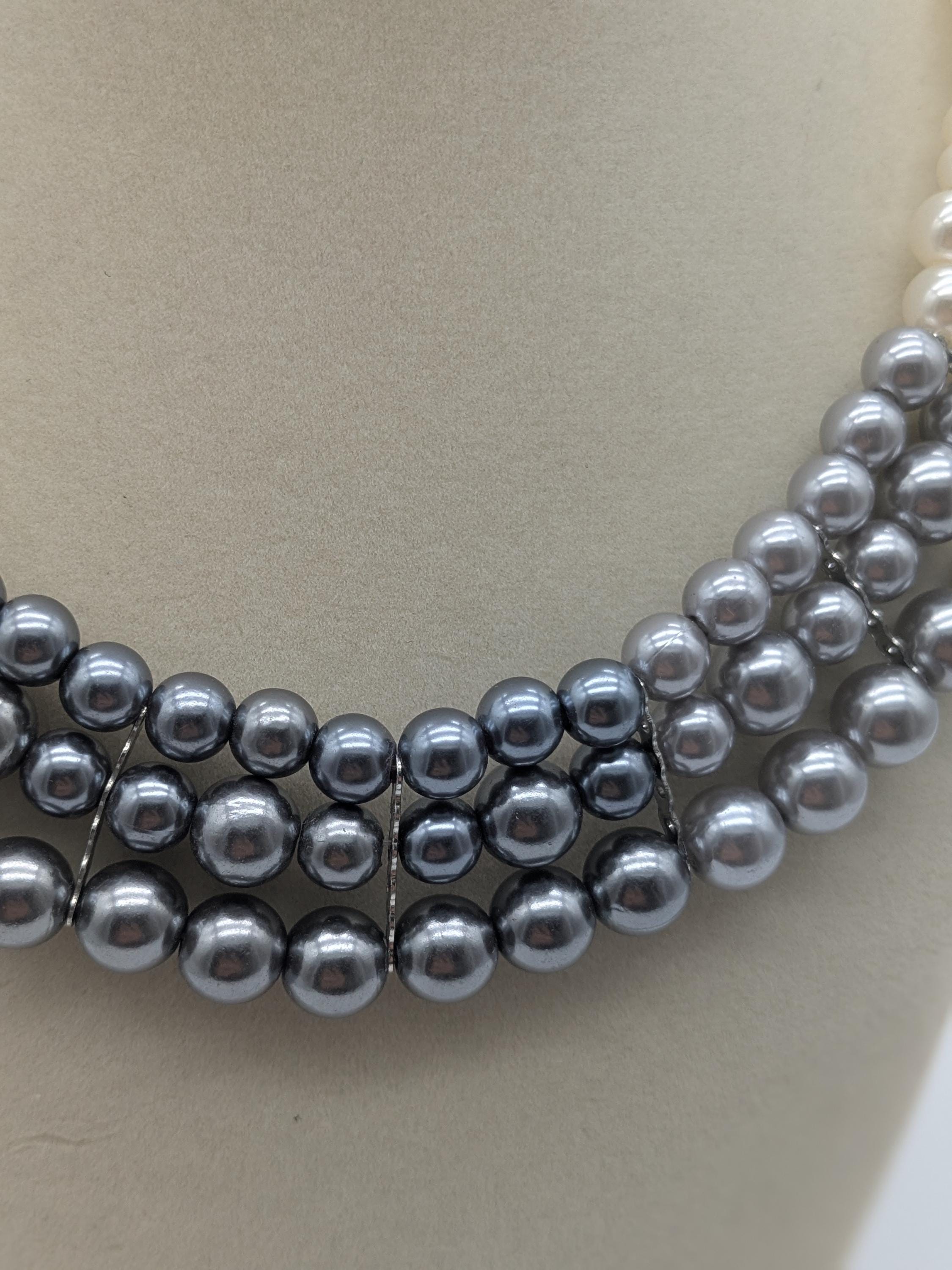 A stunning double-tone pearl beaded necklace featuring glossy white and gray strands. This timeless piece adds elegance and sophistication to any outfit, perfect for formal occasions or stylish everyday wear.
