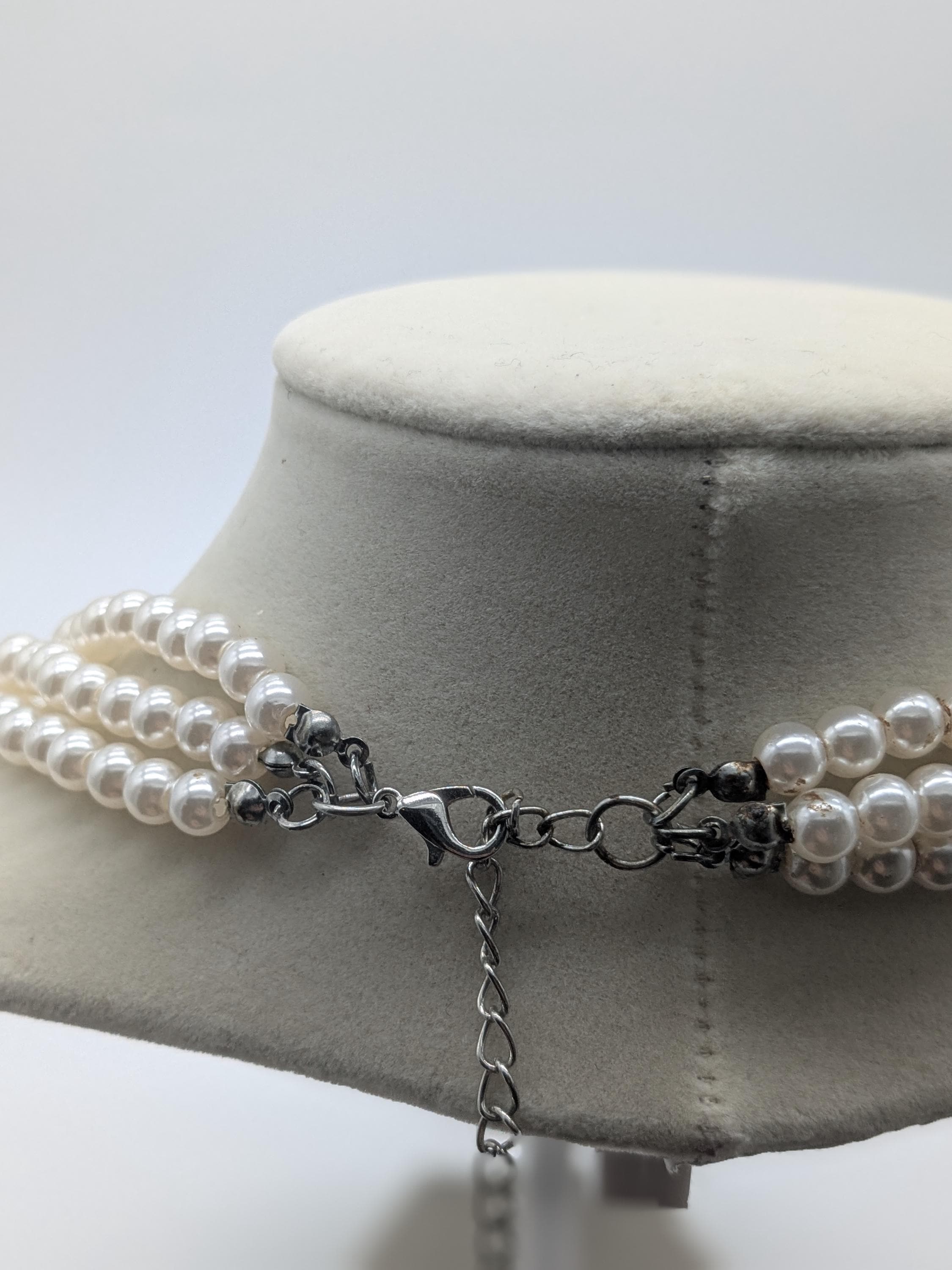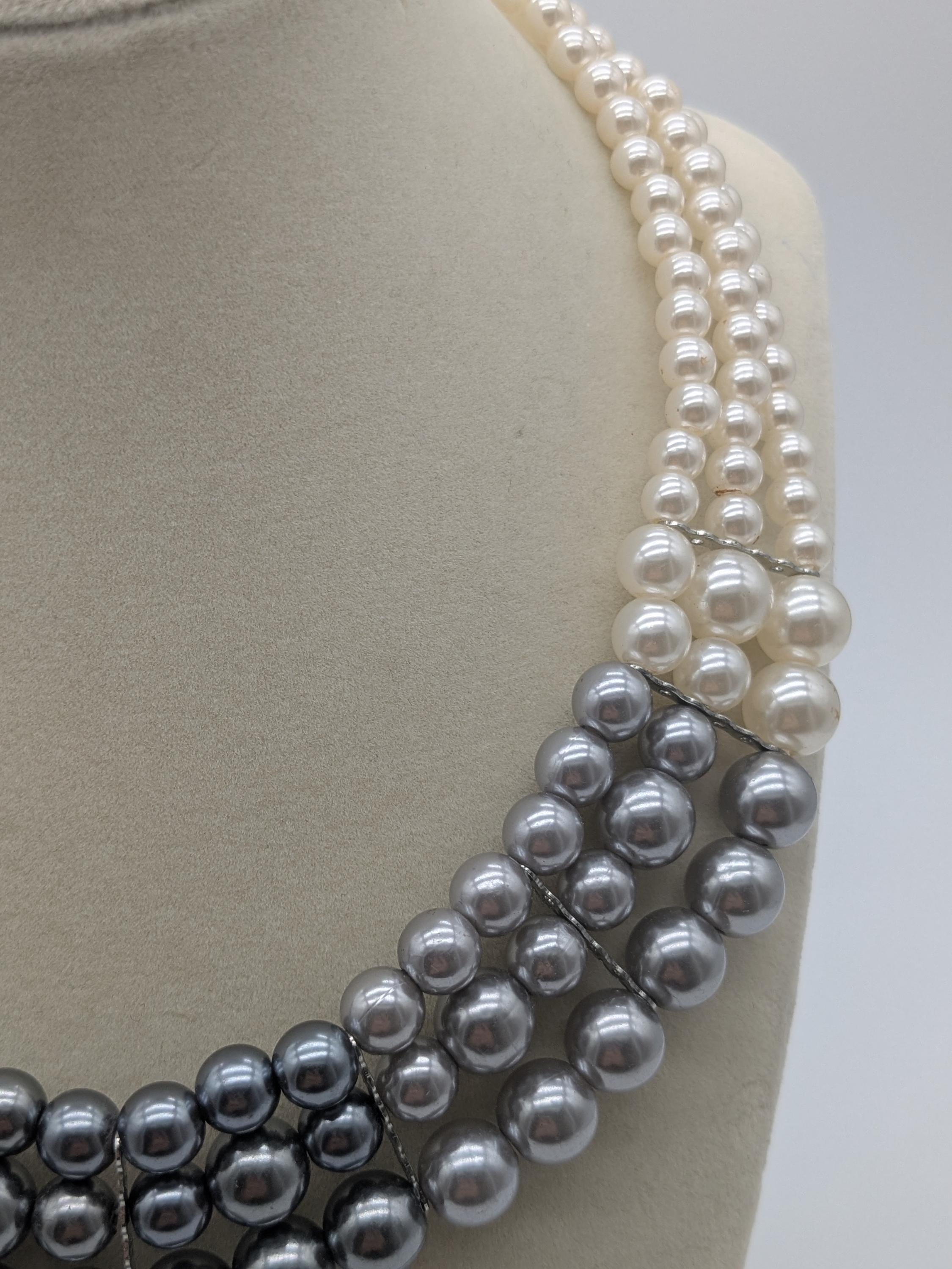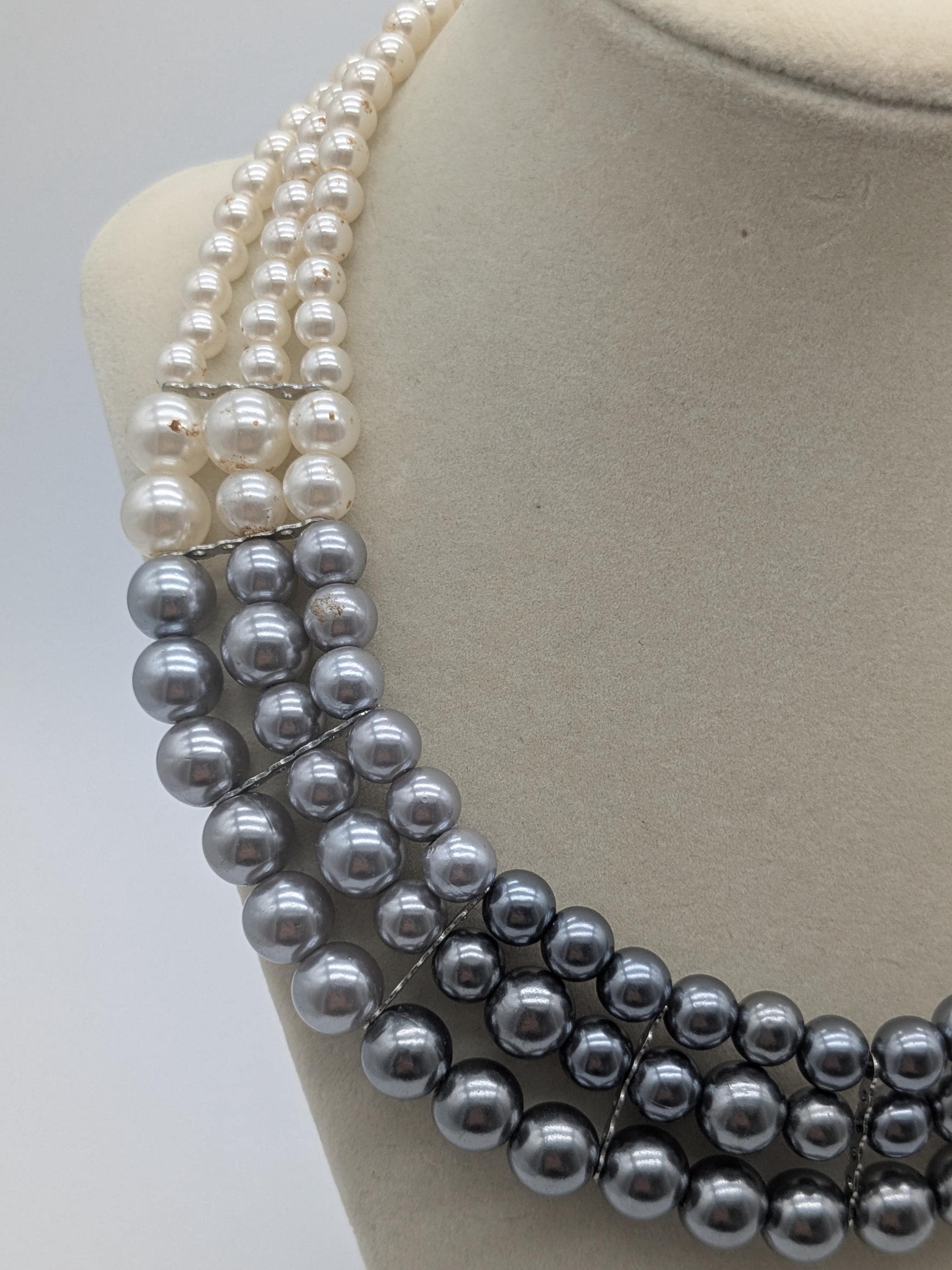 A stunning double-tone pearl beaded necklace featuring glossy white and gray strands. This timeless piece adds elegance and sophistication to any outfit, perfect for formal occasions or stylish everyday wear.