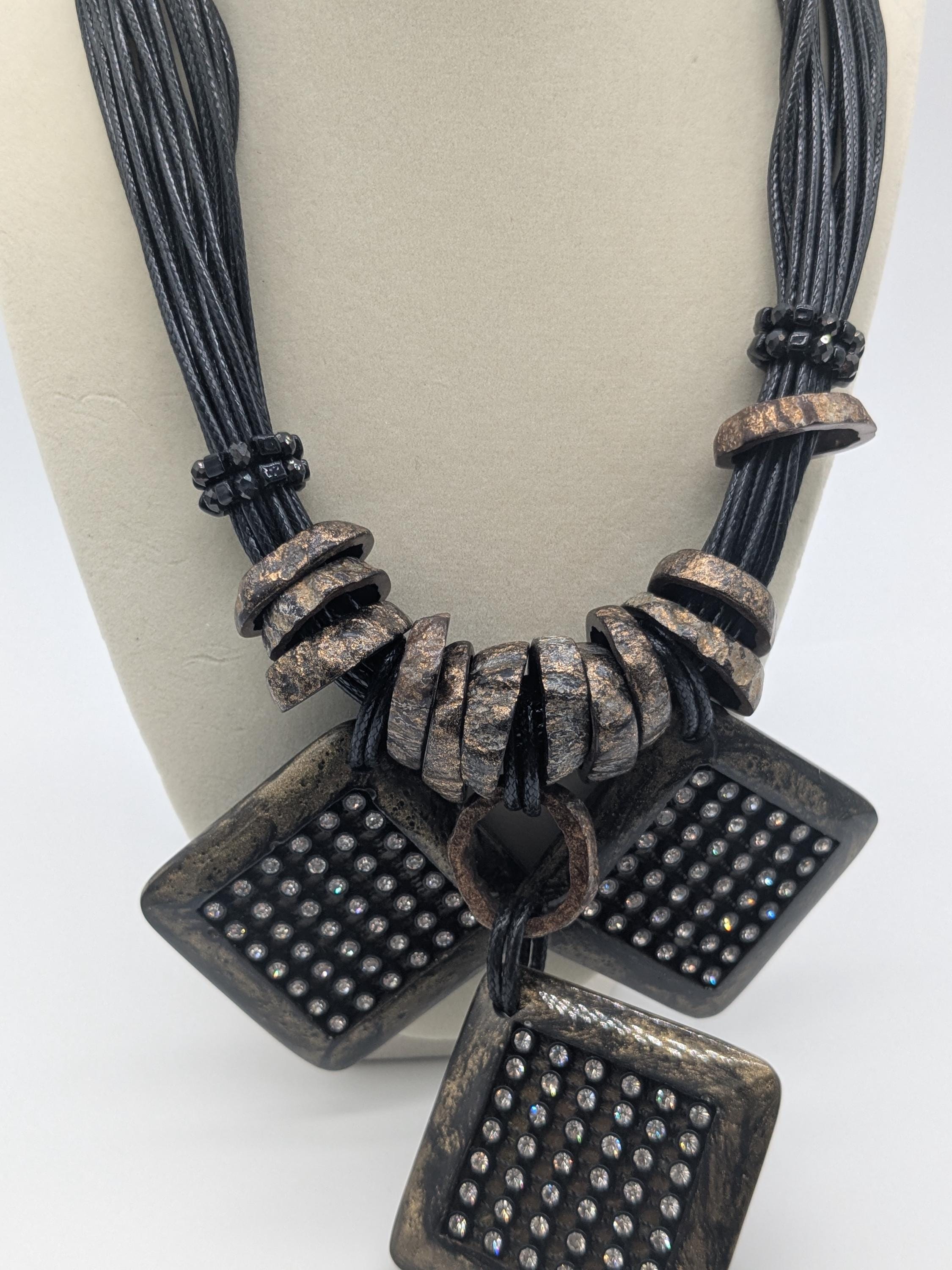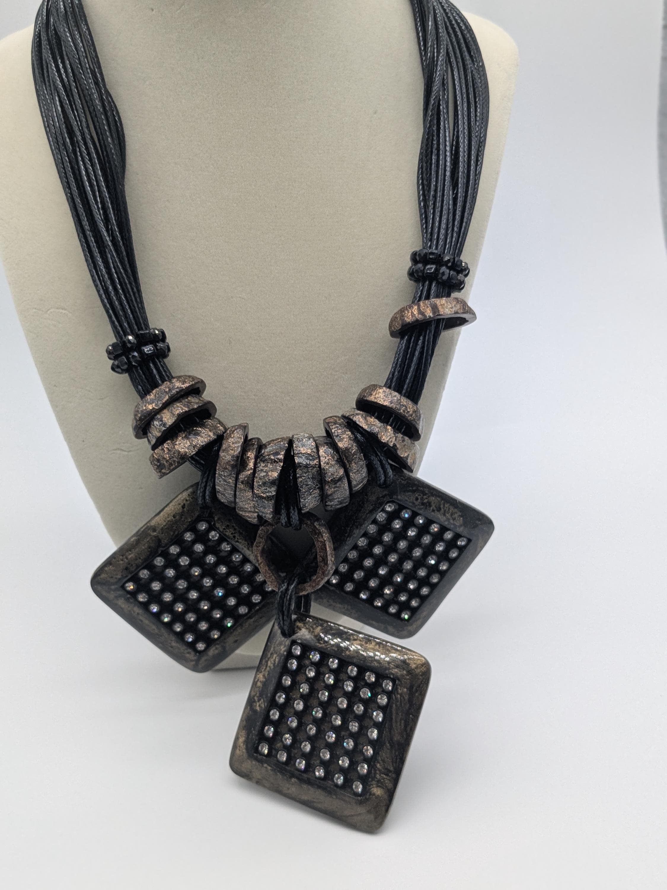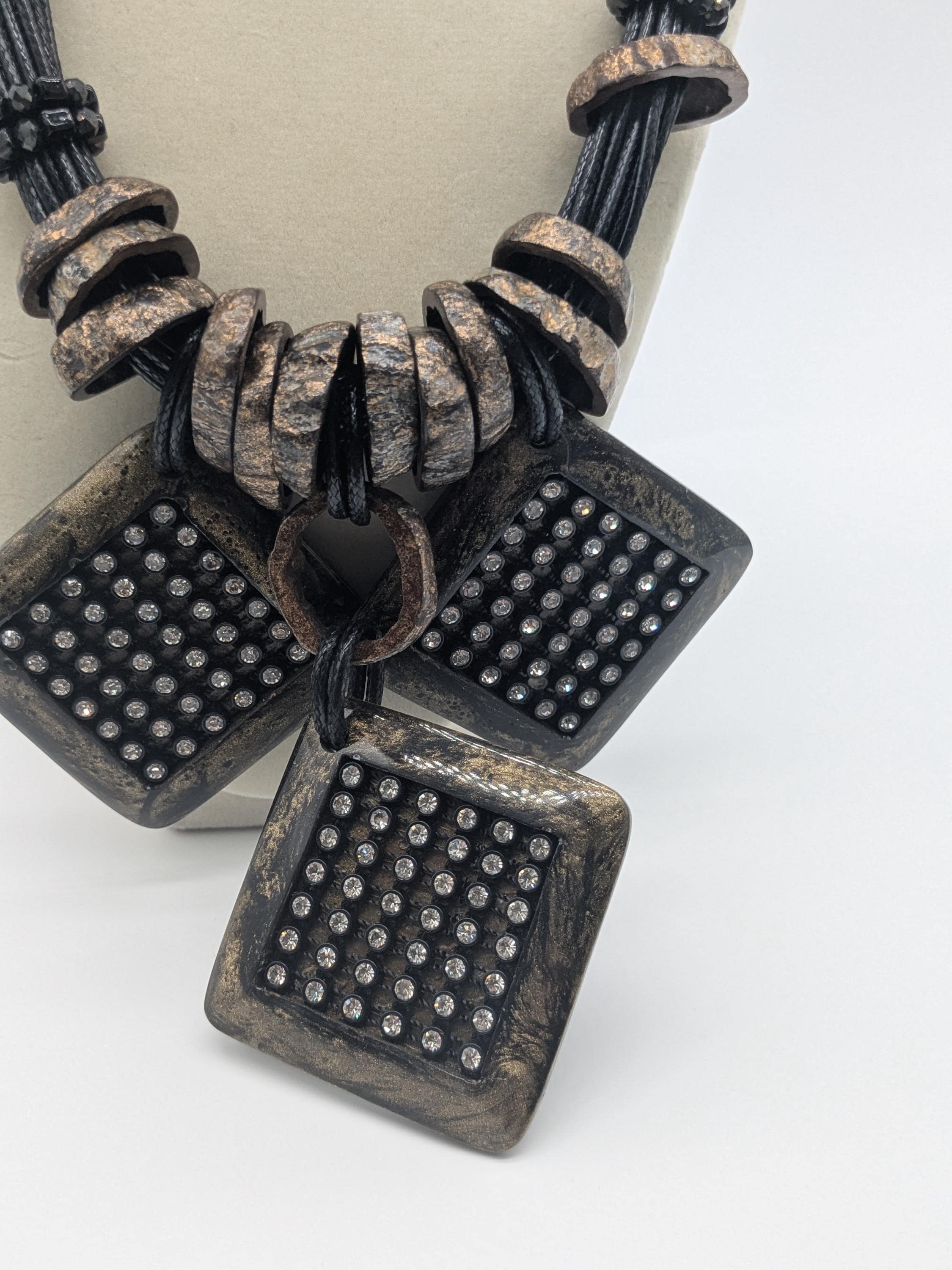 This bold and artistic statement necklace features large textured square pendants accented with metallic details on layered black cords. A perfect piece for adding modern edge and sophistication to your look.