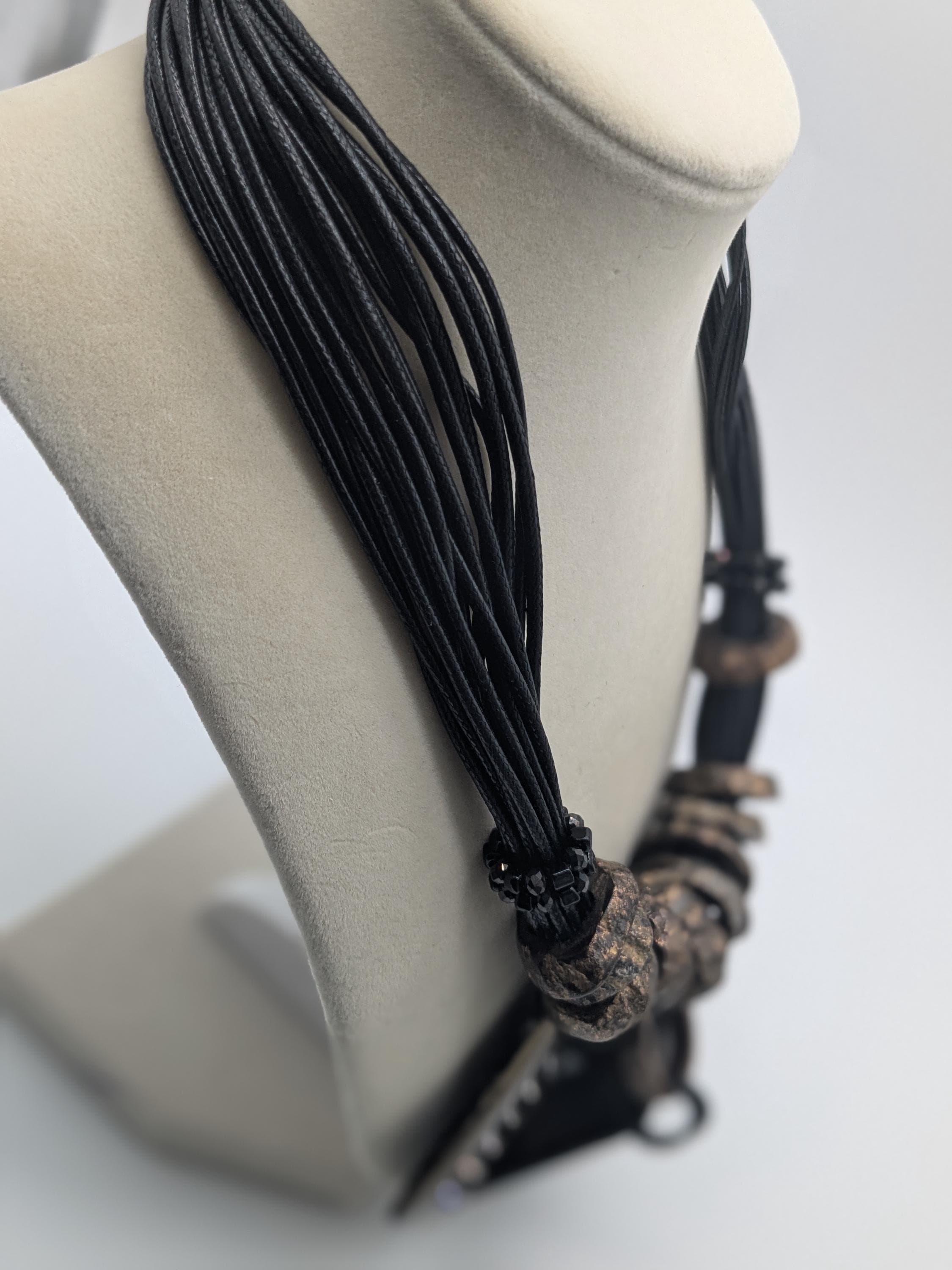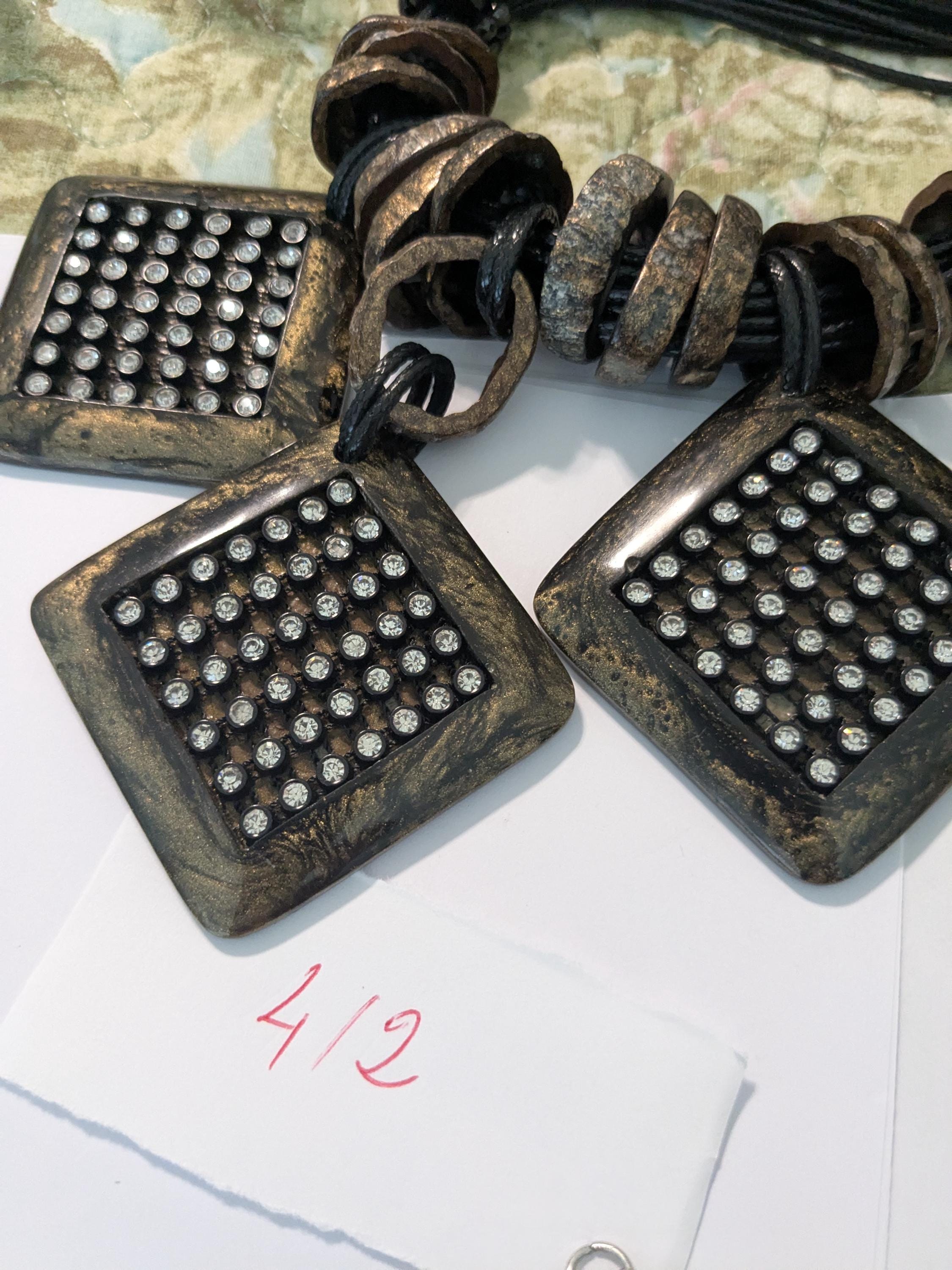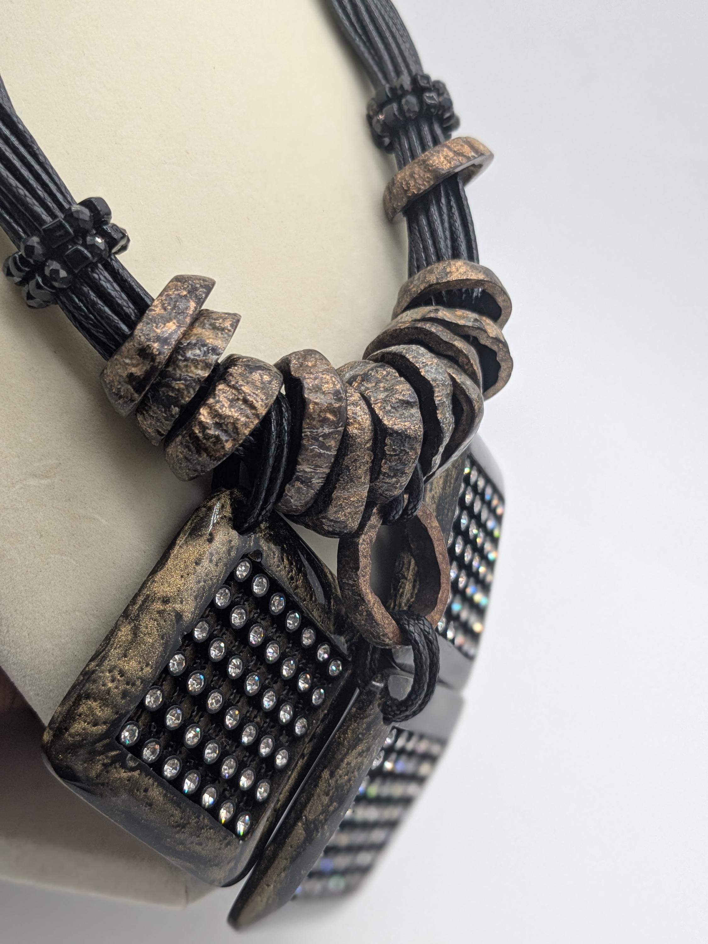 This bold and artistic statement necklace features large textured square pendants accented with metallic details on layered black cords. A perfect piece for adding modern edge and sophistication to your look.