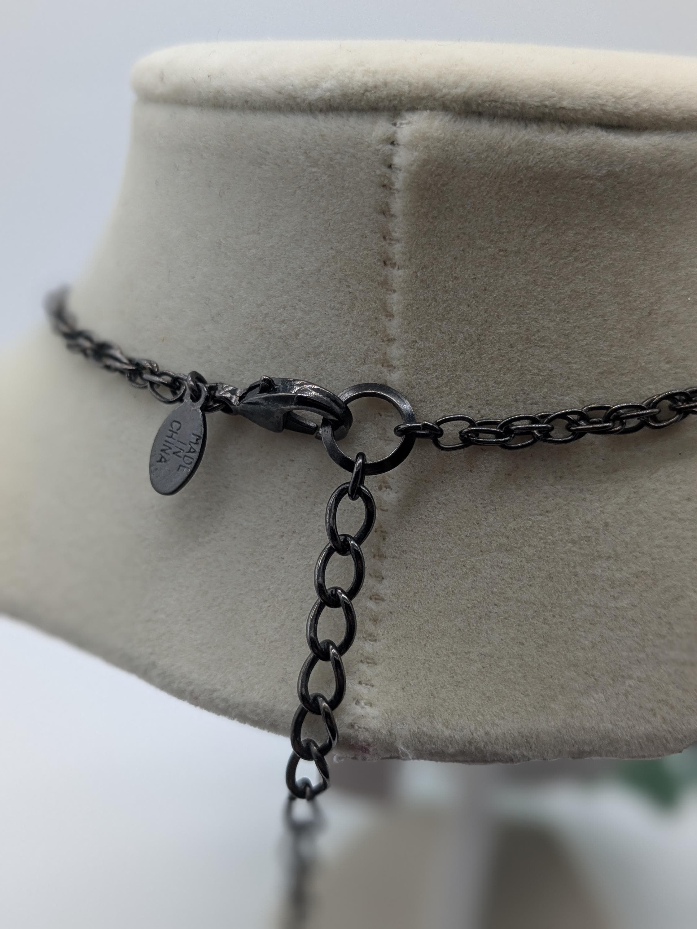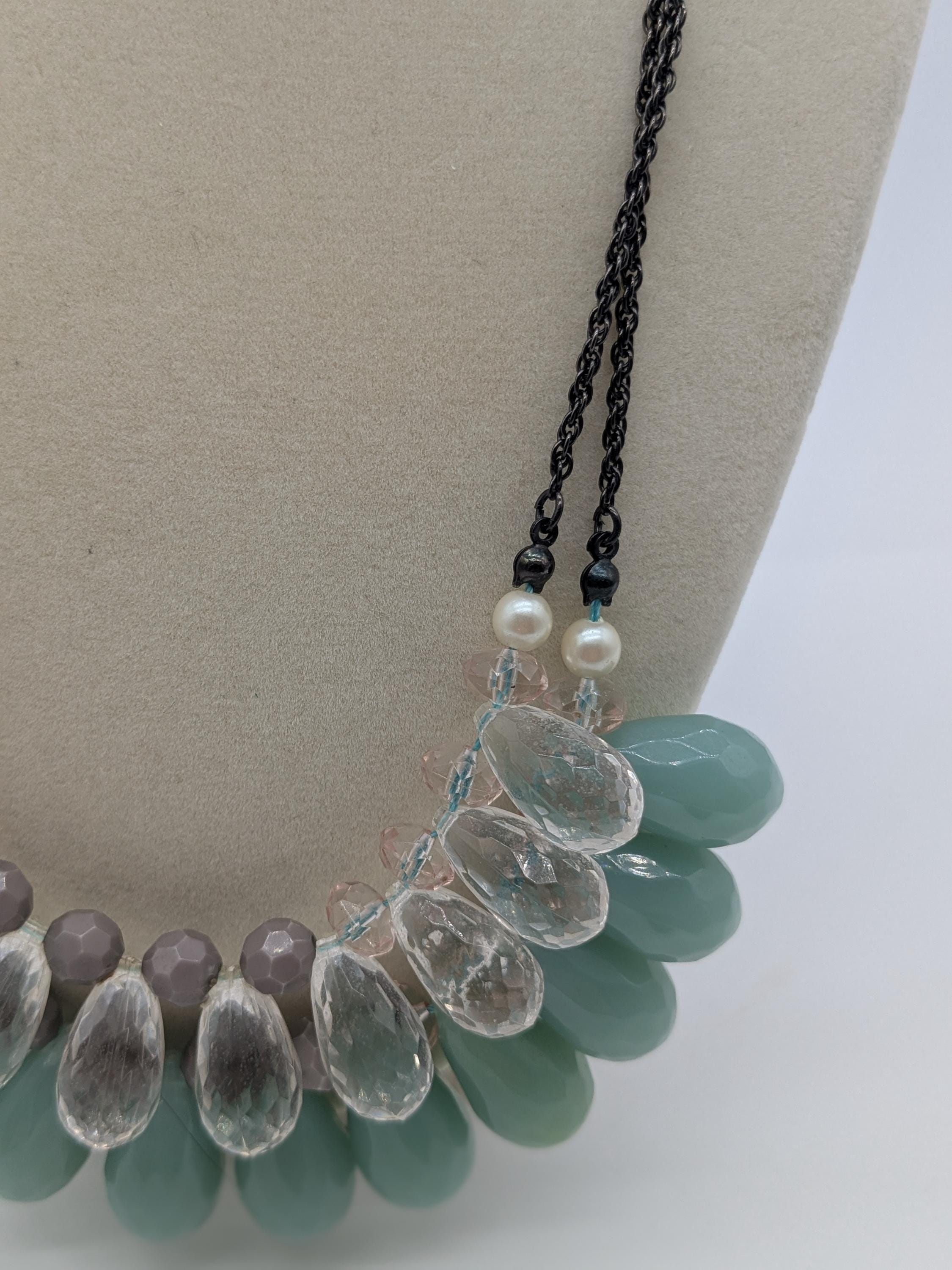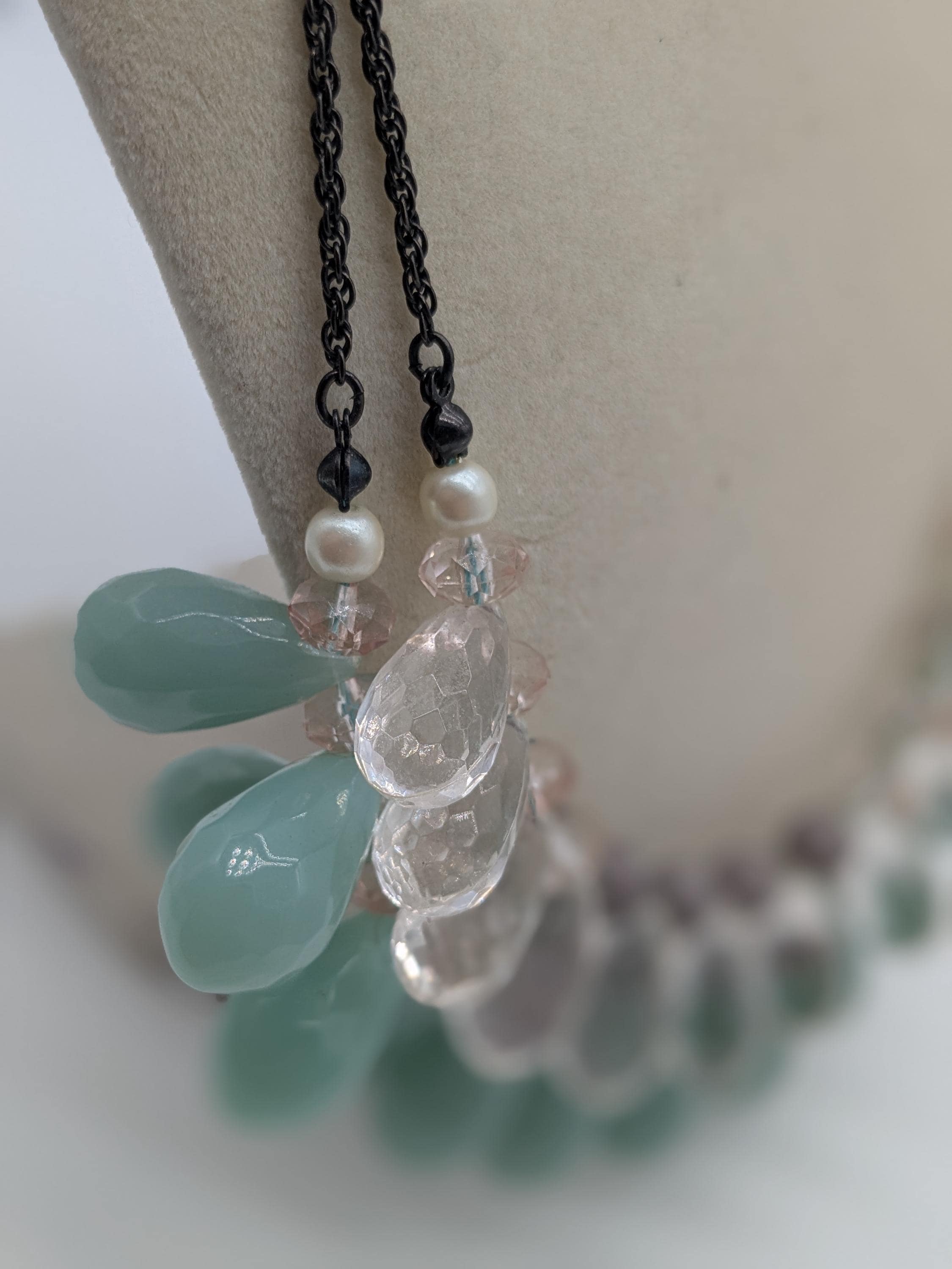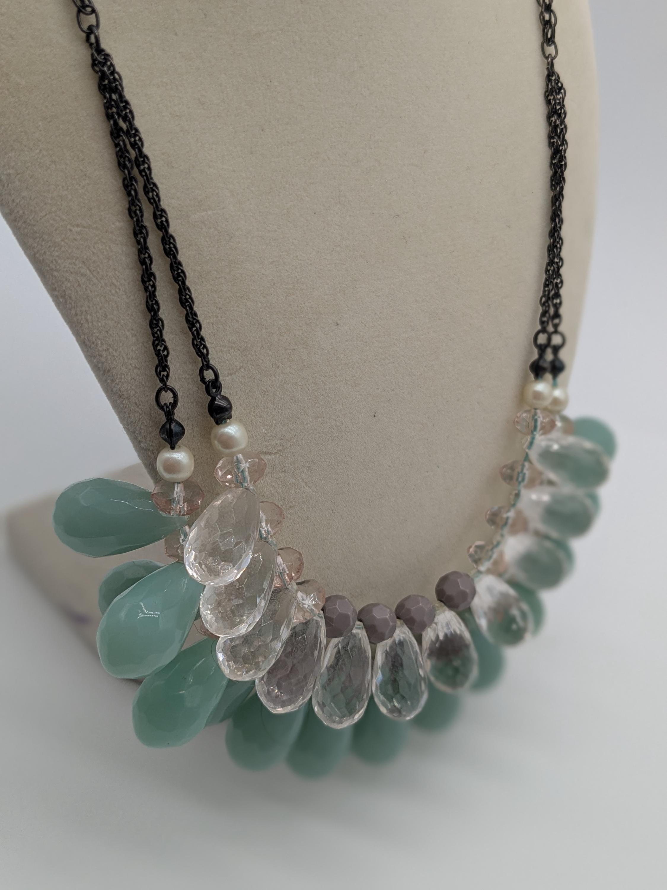 This stunning teardrop beaded necklace features alternating mint green, clear, and soft mauve beads on a black chain for a modern, elegant look. Perfect for special occasions or adding a touch of sophistication to everyday style.