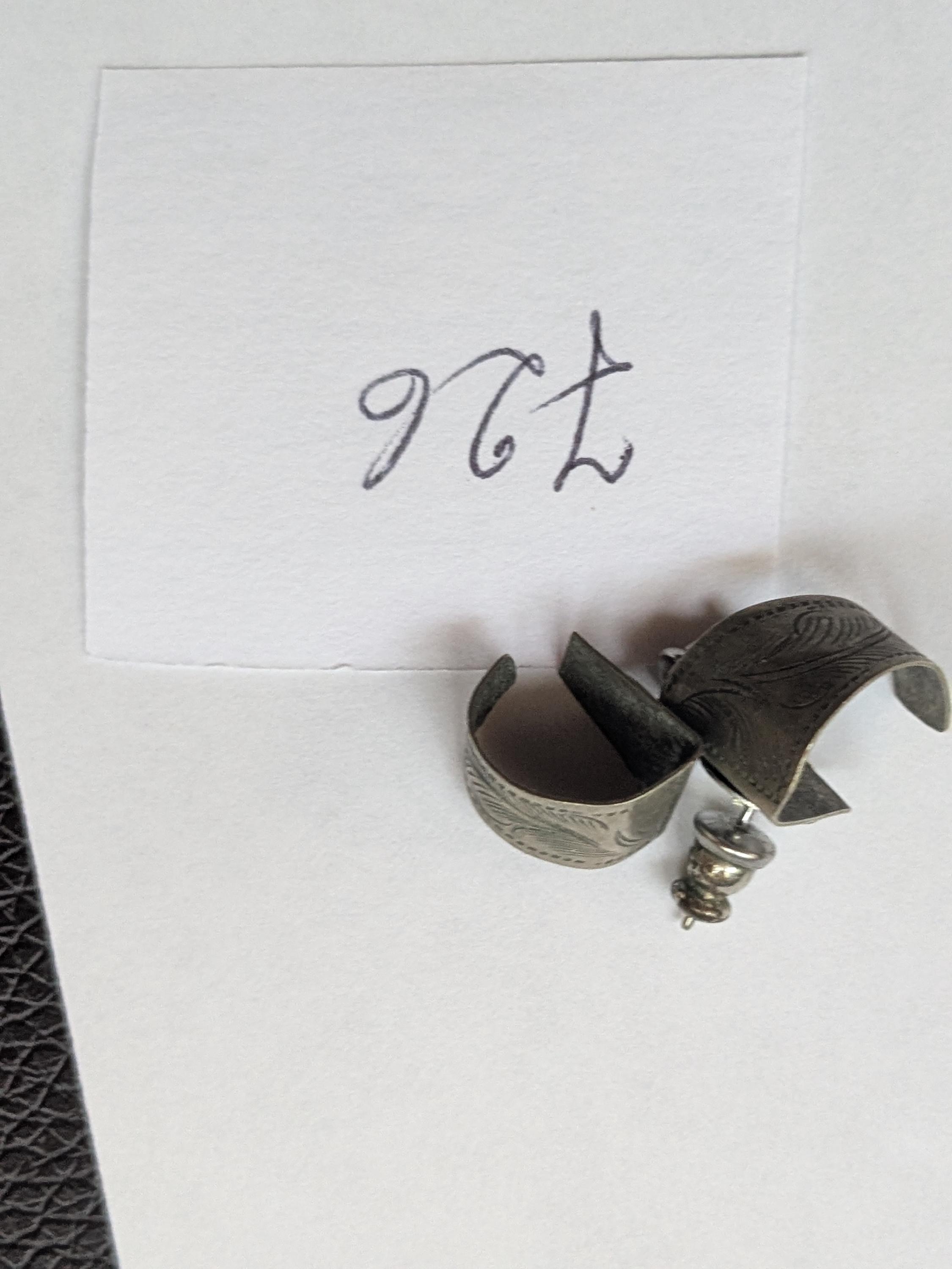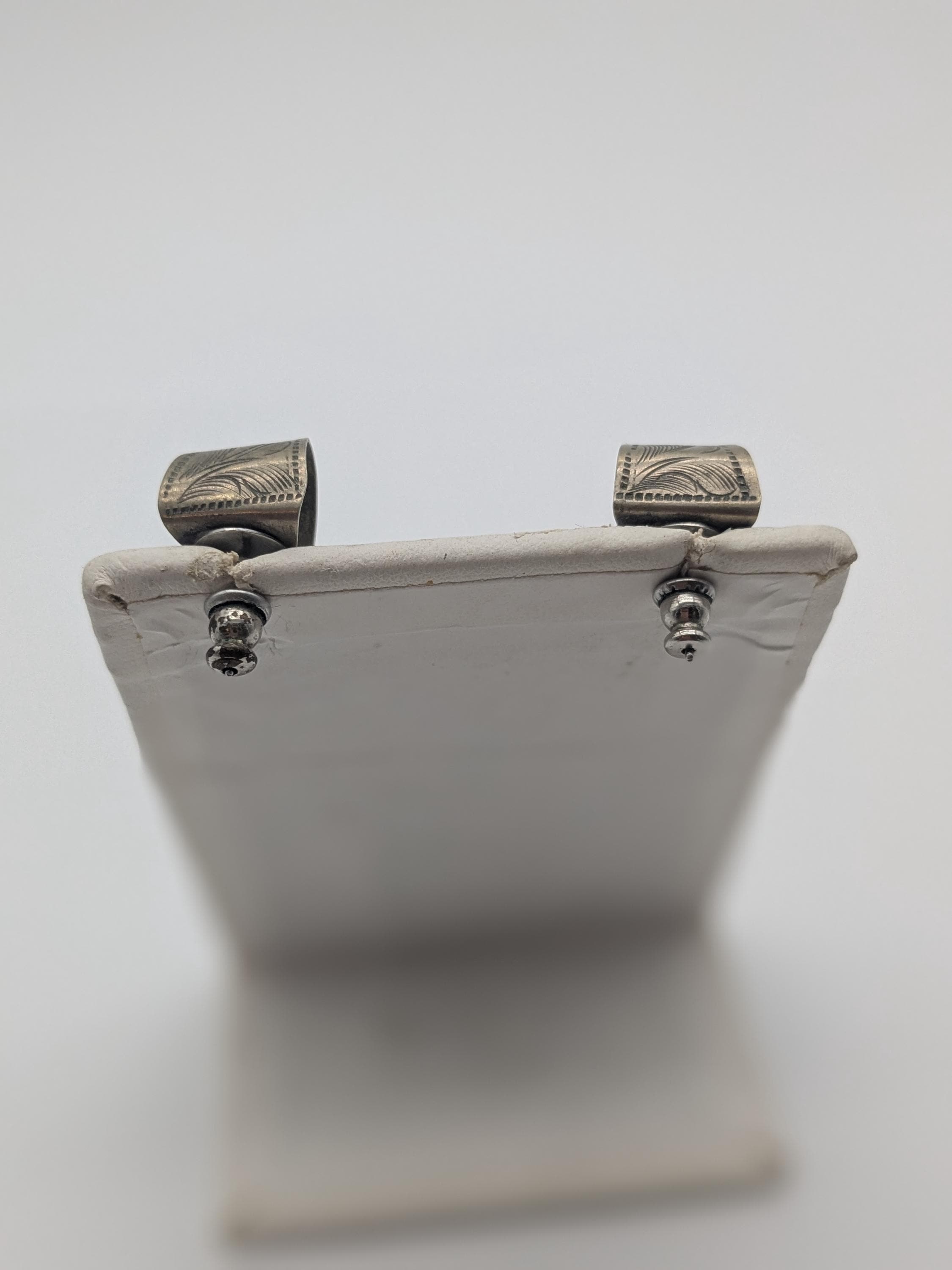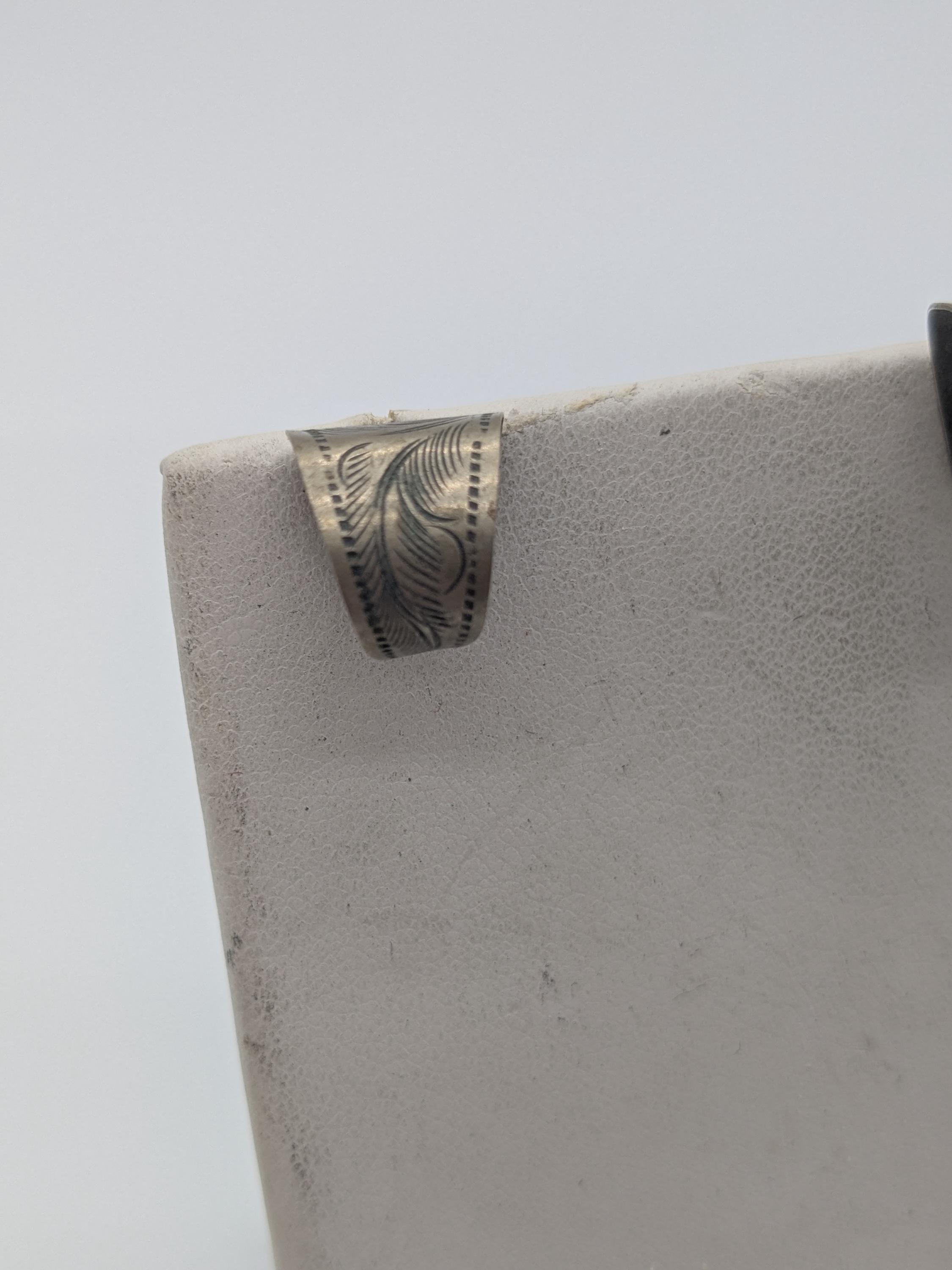 These vintage sterling tone hoop earrings feature intricate hand-stamped Native American-style motifs with subtle feather detailing. A beautiful fusion of heritage and elegance.