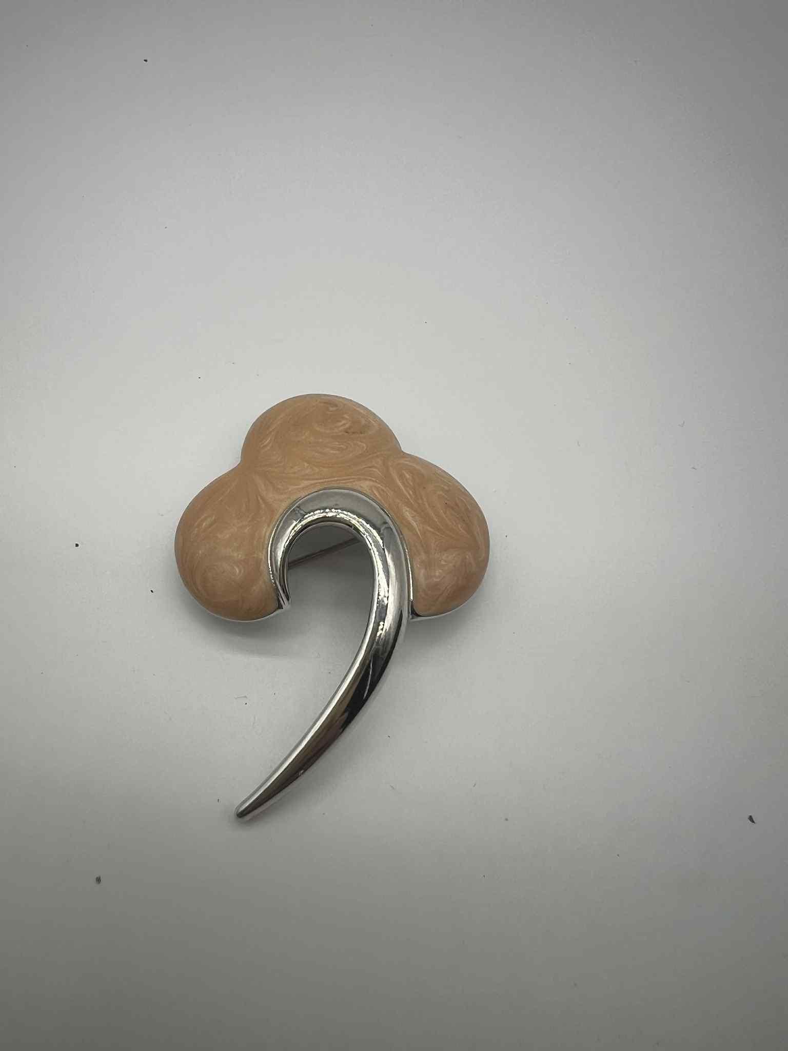 This modern abstract brooch features a soft peach resin clover-like shape paired with a sleek curved metal accent. Its artistic contemporary design makes it a standout accessory for jackets, scarves, blazers, or handbags. Lightweight, stylish, and perfect for lovers of unique statement jewelry and modern art pieces.