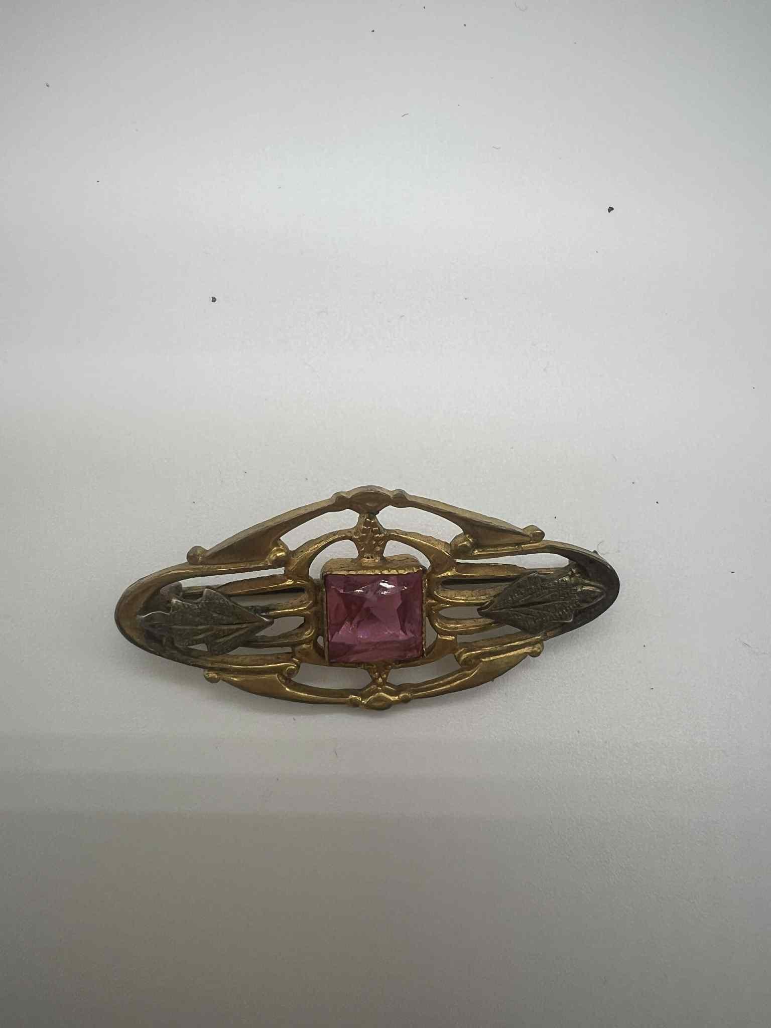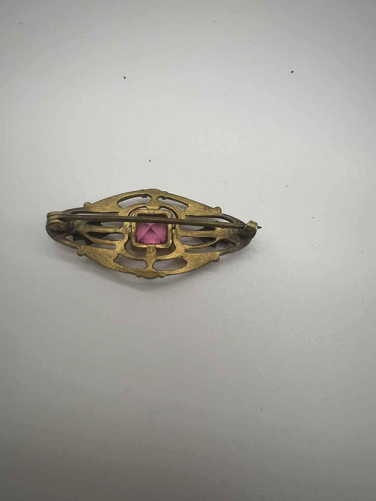 This beautiful Art Nouveau–style brooch features an ornate filigree frame with a soft antique finish and a pink glass centerpiece. Its lightweight design and vintage charm make it perfect for adding a romantic touch to jackets, scarves, hats, or your jewelry display. A lovely collectible piece for lovers of old-world, decorative costume jewelry.