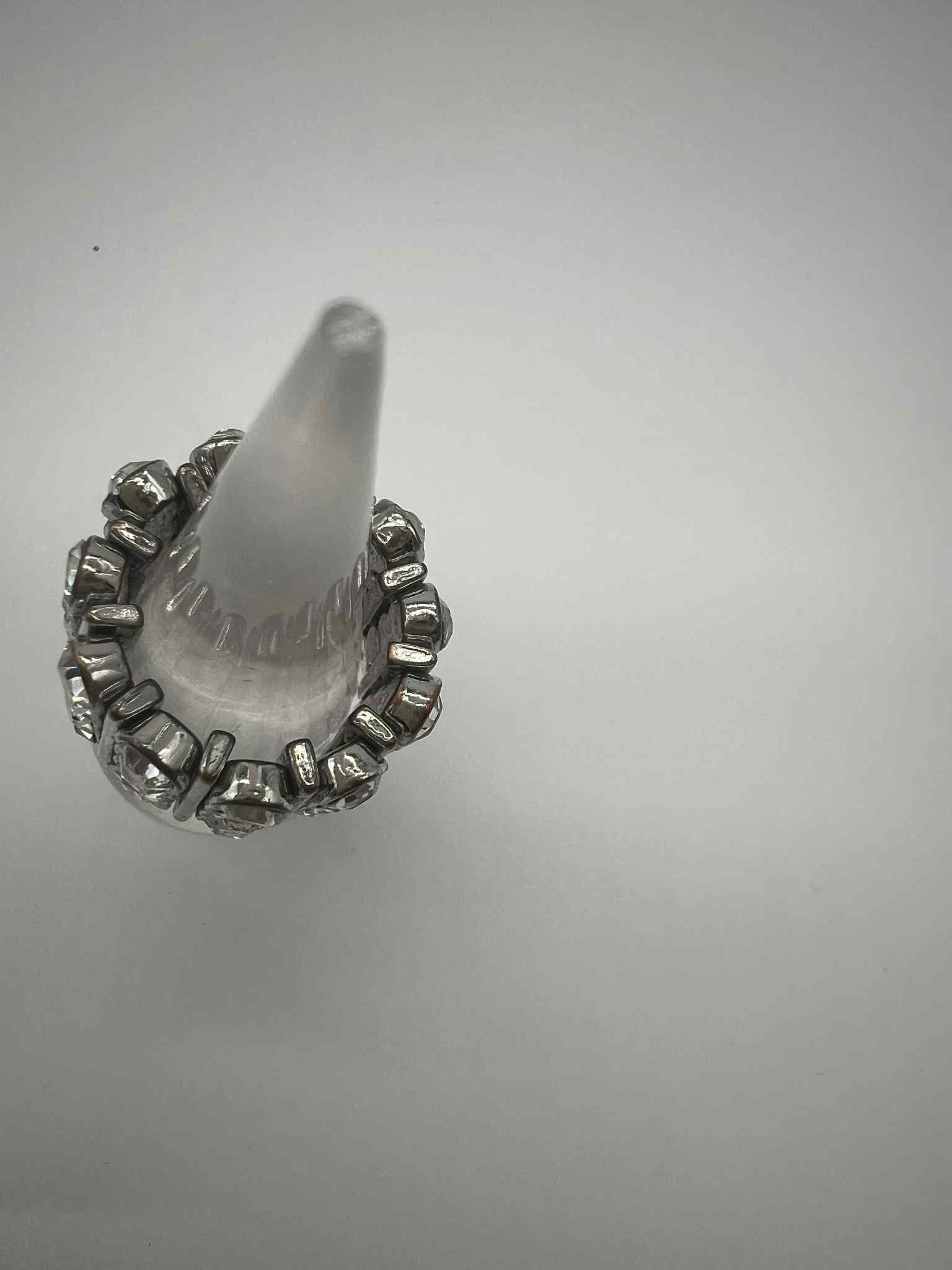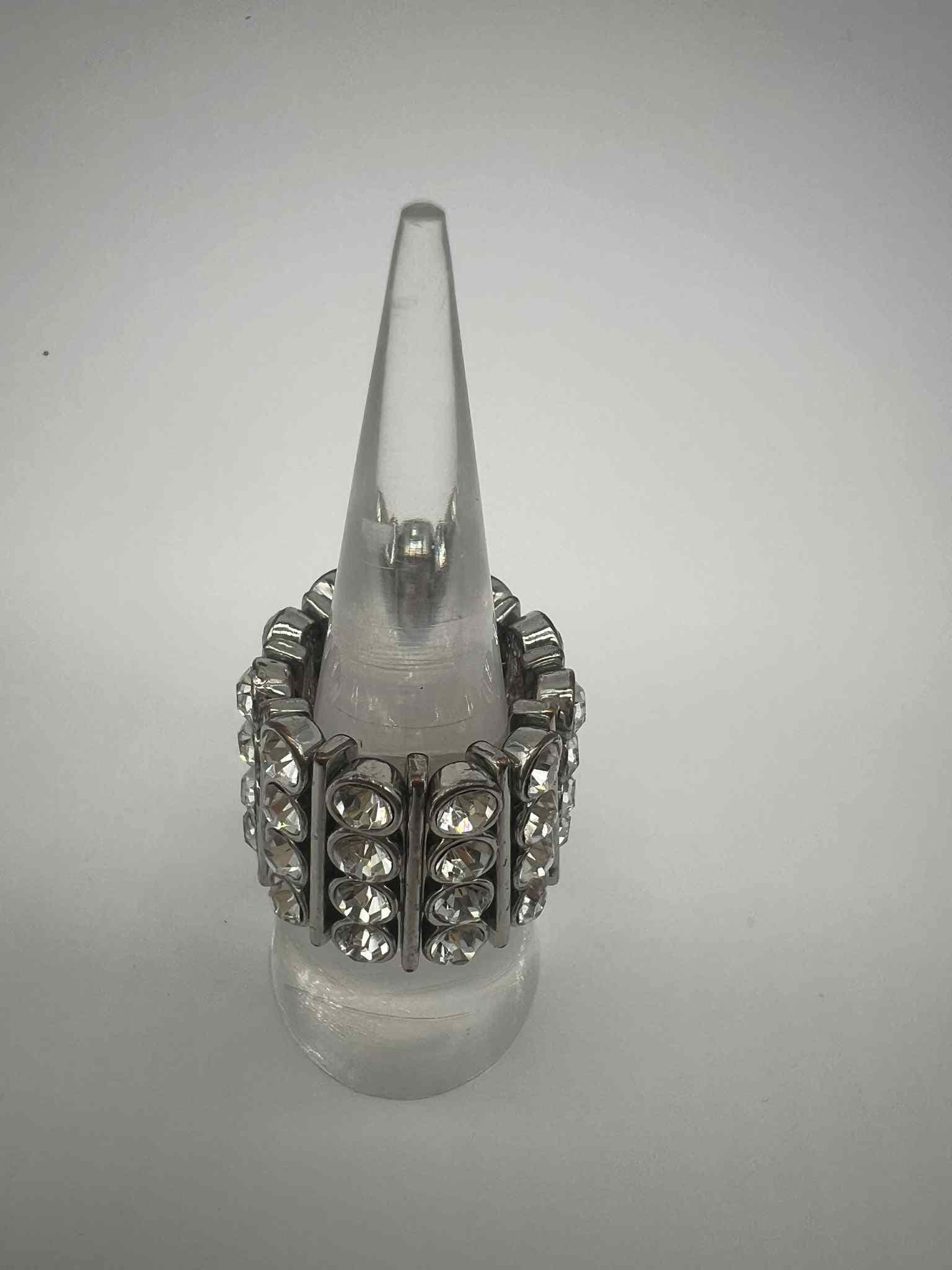 This bold chunky rhinestone stretch ring features multiple rows of clear sparkly stones set in a wide, eye-catching band. Its flexible stretch design ensures a comfortable fit while adding instant glamour to any outfit. A perfect statement piece for evening wear, parties, or anyone who loves bold costume jewelry.
